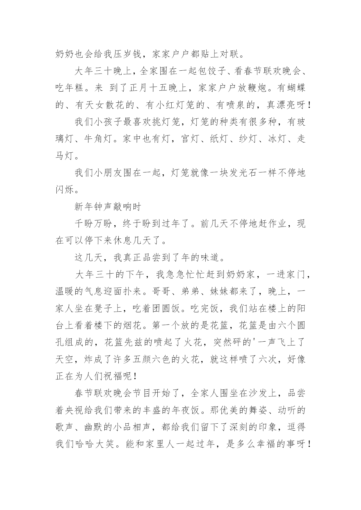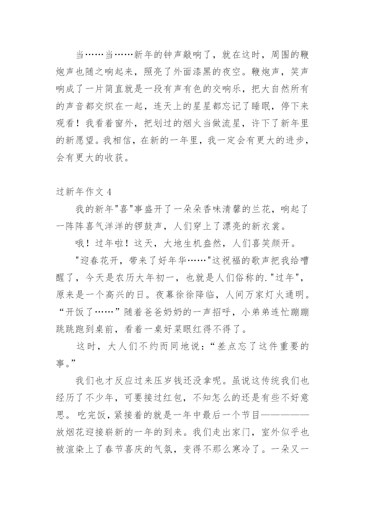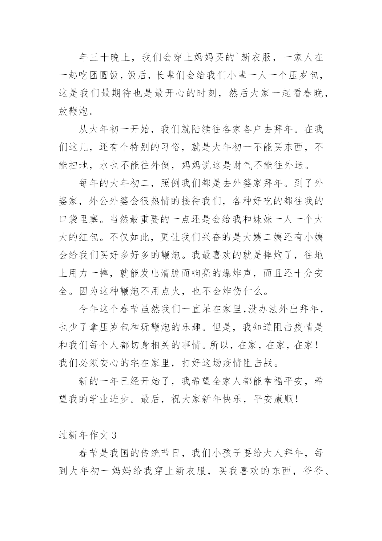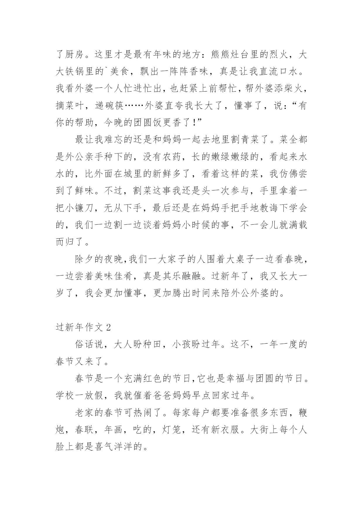 过新年作文 (实用)过新年作文在平时的学习、工作或生活中,大家对作文都再熟悉不过了吧,借助作文可以宣泄心中的情感,调节自己的心情。那么你有了解过作文吗?以下是小编为大家收集的过新年作文,仅供参考,大家一起来看看吧。过新年作文1马上临近春节了,我们一家和往常一样还是决定和外公外婆一起跨年,整理了一些物品就出发了。经过1个小时的车程,我们到达目的地。只见外公正在院子外的大门上张罗挂灯笼,贴对联,我立马上前做一些力所能及的事:帮忙扶着梯子、递胶水、递对联……不一会儿,对联、灯笼都搞定了,我托着下巴仔细读了读这幅联,上联:“平安如意步步高”下联:“人和家顺年年好”横批“万事如意”,简简单单的一副联子,代表了我们全家人的愿望。一到晚上,红红的两个灯笼,闪闪发光,像两个红色的大南瓜,映衬着这幅对联,喜庆极了。经过院子走到客厅里,看见了彩带和各种颜色的气球,还有各种小风车,美不胜收。我想这些应该都是特意为我装饰的吧。还没来得及慢慢欣赏这里的美景,就被一阵阵香气带到了厨房。这里才是最有年味的地方:熊熊灶台里的烈火,大大铁锅里的`美食,飘出一阵阵香味,真是让我直流口水。我看外婆一个人忙进忙出,也赶紧上前帮忙,帮外婆添柴火,摘菜叶,递碗筷……外婆直夸我长大了,懂事了,说:“有你的帮助,今晚的团圆饭更香了!”最让我难忘的还是和妈妈一起去地里割青菜了。菜全都是外公亲手种下的,没有农药,长的嫩绿嫩绿的,看起来水水的,比外面在城里的新鲜多了,看着这样的菜,我仿佛尝到了鲜味。不过,割菜这事我还是头一次参与,手里拿着一把小镰刀,无从下手,最后还是在妈妈手把手地教诲下学会的,我们一边割一边谈着妈妈小时候的事,不一会儿就满载而归了。除夕的夜晚,我们一大家子的人围着大桌子一边看春晚,一边尝着美味佳肴,真是其乐融融。过新年了,我又长大一岁了,我会更加懂事,更加腾出时间来陪外公外婆的。过新年作文2俗话说,大人盼种田,小孩盼过年。这不,一年一度的春节又来了。春节是一个充满红色的节日,它也是幸福与团圆的节日。学校一放假,我就催着爸爸妈妈早点回家过年。老家的春节可热闹了。每家每户都要准备很多东西,鞭炮,春联,年画,吃的,灯笼,还有新衣服。大街上每个人脸上都是喜气洋洋的。年三十晚上,我们会穿上妈妈买的`新衣服,一家人在一起吃团圆饭,饭后,长辈们会给我们小辈一人一个压岁包,这是我们最期待也是最开心的时刻,然后大家一起看春晚,放鞭炮。从大年初一开始,我们就陆续往各家各户去拜年。在我们这儿,还有个特别的习俗,就是大年初一不能买东西,不能扫地,水也不能往外倒,妈妈说这是财气不能往外送。每年的大年初二,照例我们都是去外婆家拜年。到了外婆家,外公外婆会很热情的接待我们,各种好吃的都往我的口袋里塞。当然最重要的一点还是会给我和妹妹一人一个大大的红包。不仅如此,更让我们兴奋的是大姨二姨还有小姨会给我们买好多好多的鞭炮。我最喜欢的就是摔炮了,往地上用力一摔,就能发出清脆而响亮的爆炸声,而且还十分安全。因为这种鞭炮不用点火,也不会炸伤什么。今年这个春节虽然我们一直呆在家里,没办法外出拜年,也少了拿压岁包和玩鞭炮的乐趣。但是,我知道阻击疫情是和我们每个人都切身相关的事情。所以,在家,在家,在家!我们必须安心的宅在家里,打好这场疫情阻击战。新的一年已经开始了,我希望全家人都能幸福平安,希望我的学业进步。最后,祝大家新年快乐,平安康顺!过新年作文3春节是我国的传统节日,我们小孩子要给大人拜年,每到大年初一妈妈给我穿上新衣服,买我喜欢的东西,爷爷、奶奶也会给我压岁钱,家家户户都贴上对联。大年三十晚上,全家围在一起包饺子、看春节联欢晚会、吃年糕。来到了正月十五晚上,家家户户放鞭炮。有蝴蝶的、有天女散花的、有小红灯笼的、有喷泉的,真漂亮呀!我们小孩子最喜欢挑灯笼,灯笼的种类有很多种,有玻璃灯、牛角灯。家中也有灯,宫灯、纸灯、纱灯、冰灯、走马灯。我们小朋友围在一起,灯笼就像一块发光石一样不停地闪烁。新年钟声敲响时千盼万盼,终于盼到过年了。前几天不停地赶作业,现在可以停下来休息几天了。这几天,我真正品尝到了年的味道。大年三十的下午,我急急忙忙赶到奶奶家,一进家门,温暖的气息迎面扑来。哥哥、弟弟、妹妹都来了,晚上,一家人坐在凳子上,吃着团圆饭。吃完饭,我们站在楼上的阳台上看着楼下的烟花。第一个放的是花篮,花篮是由六个圆孔组成的,花篮先兹的喷起了火花,突然砰的'一声飞上了天空,炸成了许多五颜六色的火花,就这样喷了六次,好像正在为人们祝福呢!春节联欢晚会节目开始了,全家人围坐在沙发上,品尝着央视给我们带来的丰盛的年夜饭。那优美的舞姿、动听的歌声、幽默的小品相声,都给我们留下了深刻的印象,逗得我们哈哈大笑。能和家里人一起过年,是多么幸福的事呀!当……当……新年的钟声敲响了,就在这时,周围的鞭炮声也随之响起来,照亮了外