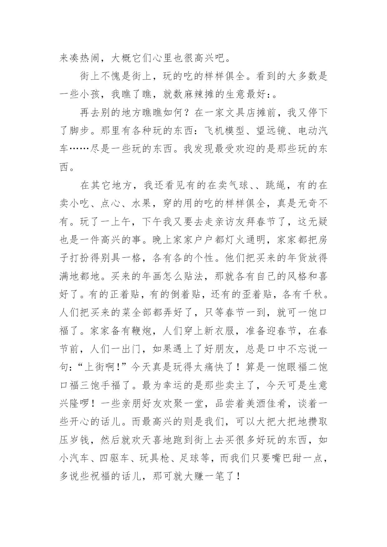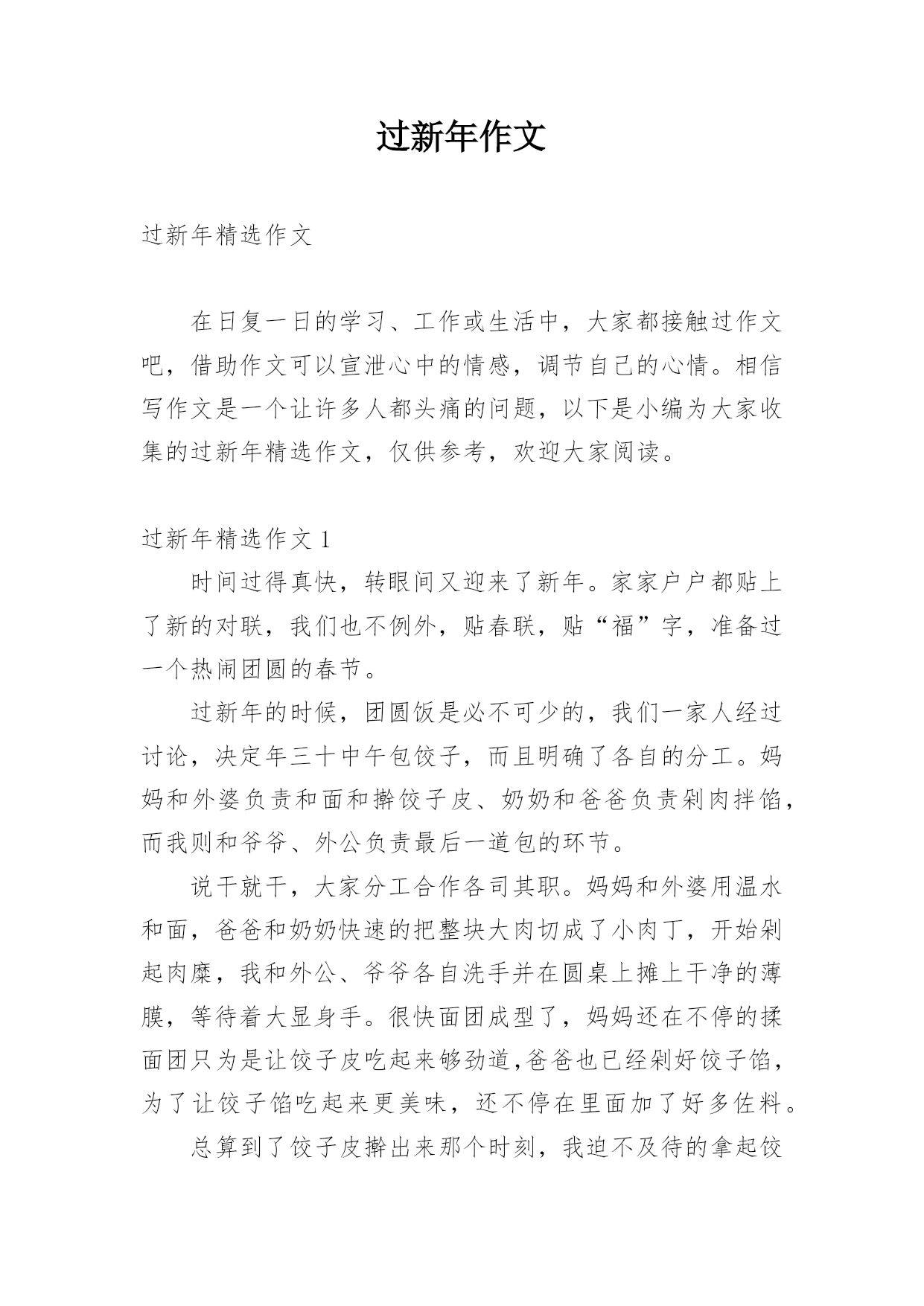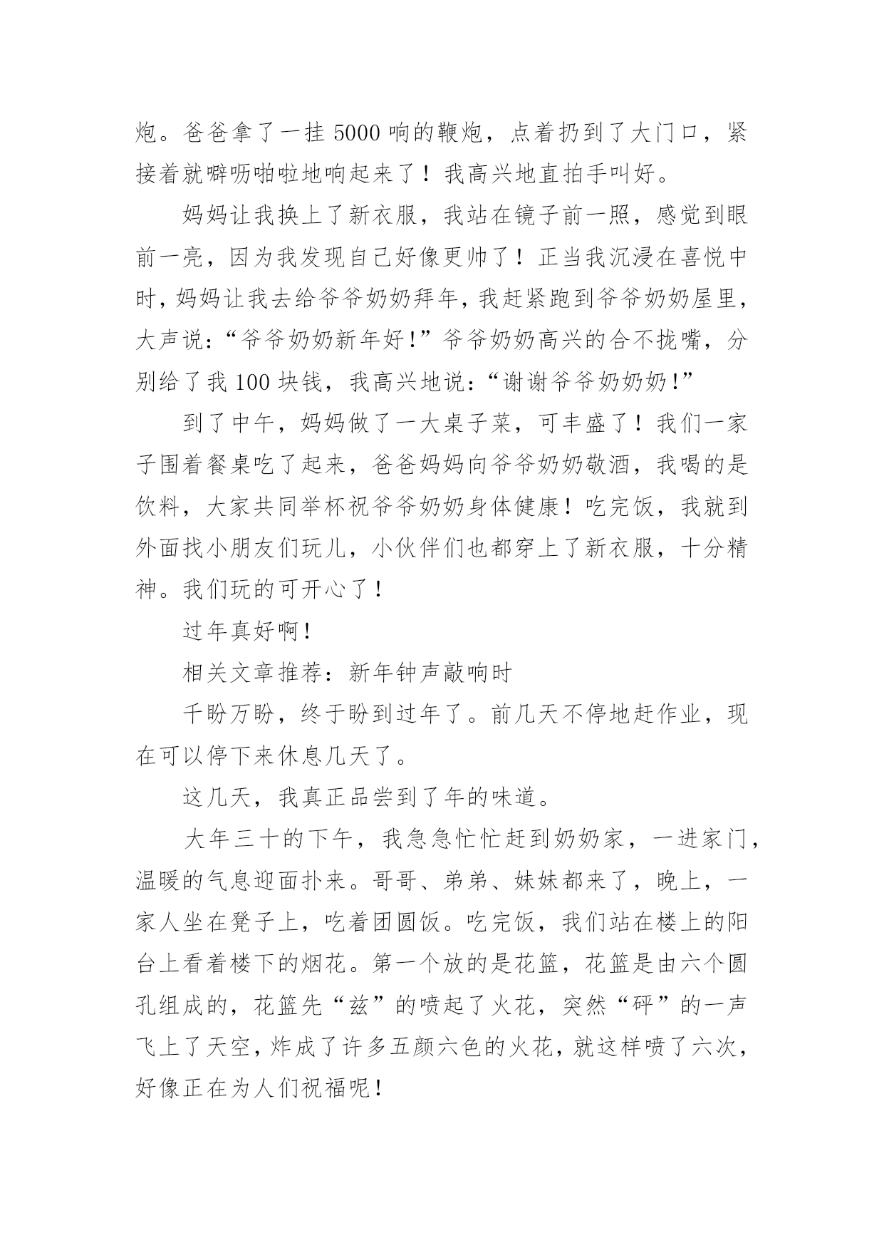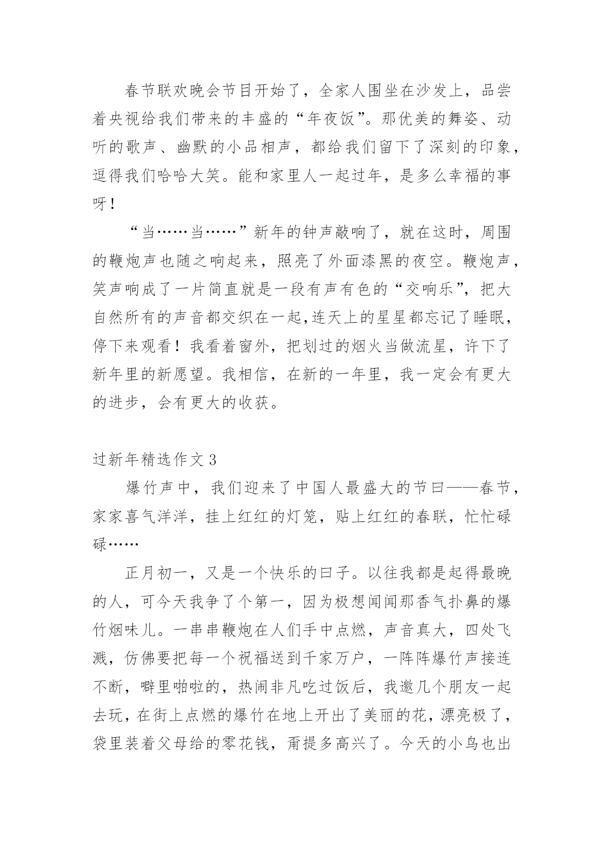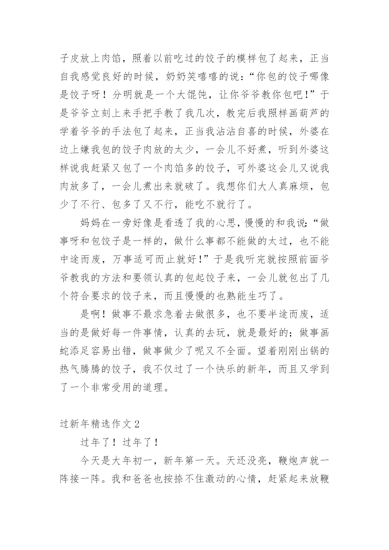 过新年作文 过新年精选作文在日复一日的学习、工作或生活中,大家都接触过作文吧,借助作文可以宣泄心中的情感,调节自己的心情。相信写作文是一个让许多人都头痛的问题,以下是小编为大家收集的过新年精选作文,仅供参考,欢迎大家阅读。过新年精选作文1时间过得真快,转眼间又迎来了新年。家家户户都贴上了新的对联,我们也不例外,贴春联,贴“福”字,准备过一个热闹团圆的春节。过新年的时候,团圆饭是必不可少的,我们一家人经过讨论,决定年三十中午包饺子,而且明确了各自的分工。妈妈和外婆负责和面和擀饺子皮、奶奶和爸爸负责剁肉拌馅,而我则和爷爷、外公负责最后一道包的环节。说干就干,大家分工合作各司其职。妈妈和外婆用温水和面,爸爸和奶奶快速的把整块大肉切成了小肉丁,开始剁起肉糜,我和外公、爷爷各自洗手并在圆桌上摊上干净的薄膜,等待着大显身手。很快面团成型了,妈妈还在不停的揉面团只为是让饺子皮吃起来够劲道,爸爸也已经剁好饺子馅,为了让饺子馅吃起来更美味,还不停在里面加了好多佐料。总算到了饺子皮擀出来那个时刻,我迫不及待的拿起饺子皮放上肉馅,照着以前吃过的饺子的模样包了起来,正当自我感觉良好的时候,奶奶笑嘻嘻的说:“你包的饺子哪像是饺子呀!分明就是一个大馄饨,让你爷爷教你包吧!”于是爷爷立刻上来手把手教了我几次,教完后我照样画葫芦的学着爷爷的手法包了起来,正当我沾沾自喜的时候,外婆在边上嫌我包的饺子肉放的太少,一会儿不好煮,听到外婆这样说我赶紧又包了一个肉馅多的饺子,可外婆这会儿又说我肉放多了,一会儿煮出来就破了。我想你们大人真麻烦,包少了不行、包多了又不行,能吃不就行了。妈妈在一旁好像是看透了我的心思,慢慢的和我说:“做事呀和包饺子是一样的,做什么事都不能做的太过,也不能中途而废,万事适可而止就好!”于是我听完就按照前面爷爷教我的方法和要领认真的包起饺子来,一会儿就包出了几个符合要求的饺子来,而且慢慢的也熟能生巧了。是啊!做事不最求急着去做很多,也不要半途而废,适当的是做好每一件事情,认真的去玩,就是最好的;做事画蛇添足容易出错,做事做少了呢又不全面。望着刚刚出锅的热气腾腾的饺子,我不仅过了一个快乐的新年,而且又学到了一个非常受用的道理。过新年精选作文2过年了!过年了!今天是大年初一,新年第一天。天还没亮,鞭炮声就一阵接一阵。我和爸爸也按捺不住激动的心情,赶紧起来放鞭炮。爸爸拿了一挂5000响的鞭炮,点着扔到了大门口,紧接着就噼呖啪啦地响起来了!我高兴地直拍手叫好。妈妈让我换上了新衣服,我站在镜子前一照,感觉到眼前一亮,因为我发现自己好像更帅了!正当我沉浸在喜悦中时,妈妈让我去给爷爷奶奶拜年,我赶紧跑到爷爷奶奶屋里,大声说:“爷爷奶奶新年好!”爷爷奶奶高兴的合不拢嘴,分别给了我100块钱,我高兴地说:“谢谢爷爷奶奶奶!”到了中午,妈妈做了一大桌子菜,可丰盛了!我们一家子围着餐桌吃了起来,爸爸妈妈向爷爷奶奶敬酒,我喝的是饮料,大家共同举杯祝爷爷奶奶身体健康!吃完饭,我就到外面找小朋友们玩儿,小伙伴们也都穿上了新衣服,十分精神。我们玩的可开心了!过年真好啊!相关文章推荐:新年钟声敲响时千盼万盼,终于盼到过年了。前几天不停地赶作业,现在可以停下来休息几天了。这几天,我真正品尝到了年的味道。大年三十的下午,我急急忙忙赶到奶奶家,一进家门,温暖的气息迎面扑来。哥哥、弟弟、妹妹都来了,晚上,一家人坐在凳子上,吃着团圆饭。吃完饭,我们站在楼上的阳台上看着楼下的烟花。第一个放的是花篮,花篮是由六个圆孔组成的,花篮先“兹”的喷起了火花,突然“砰”的一声飞上了天空,炸成了许多五颜六色的火花,就这样喷了六次,好像正在为人们祝福呢!春节联欢晚会节目开始了,全家人围坐在沙发上,品尝着央视给我们带来的丰盛的“年夜饭”。那优美的舞姿、动听的歌声、幽默的小品相声,都给我们留下了深刻的印象,逗得我们哈哈大笑。能和家里人一起过年,是多么幸福的事呀!“当……当……”新年的钟声敲响了,就在这时,周围的鞭炮声也随之响起来,照亮了外面漆黑的夜空。鞭炮声,笑声响成了一片简直就是一段有声有色的“交响乐”,把大自然所有的声音都交织在一起,连天上的星星都忘记了睡眠,停下来观看!我看着窗外,把划过的烟火当做流星,许下了新年里的新愿望。我相信,在新的一年里,我一定会有更大的进步,会有更大的收获。过新年精选作文3爆竹声中,我们迎来了中国人最盛大的节曰——春节,家家喜气洋洋,挂上红红的灯笼,贴上红红的春联,忙忙碌碌……正月初一,又是一个快乐的曰子。以往我都是起得最晚的人,可今天我争了个第一,因为极想闻闻那香气扑鼻的爆竹烟味儿。一串串鞭炮在人们手中点燃,声音真大,四处飞溅,仿佛要把每一个祝福送到千家万户,一阵阵爆竹声接连不断,噼里啪啦的,热闹非凡吃过饭后,我邀几个朋友一起去玩,在街上点燃的爆竹在地上开出了美丽的花,漂