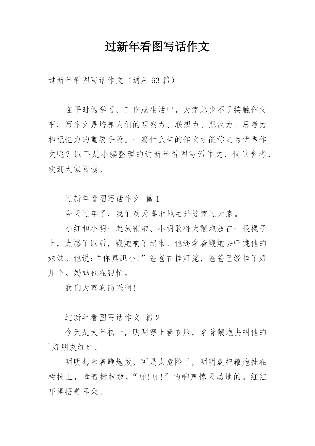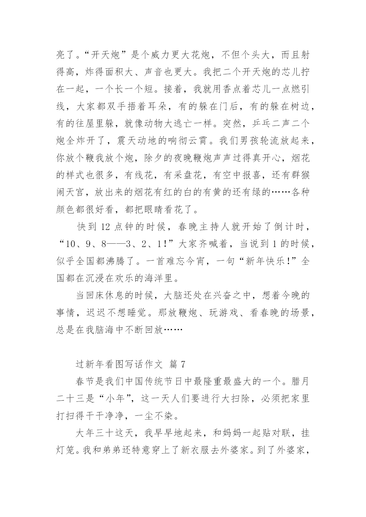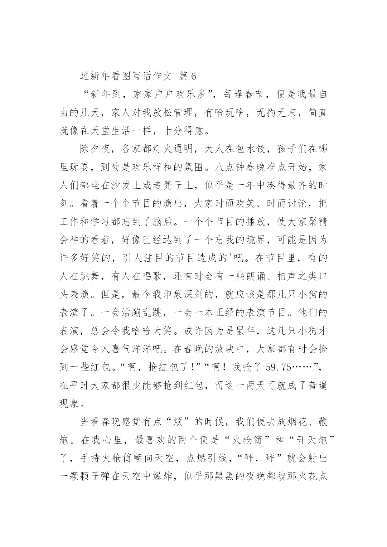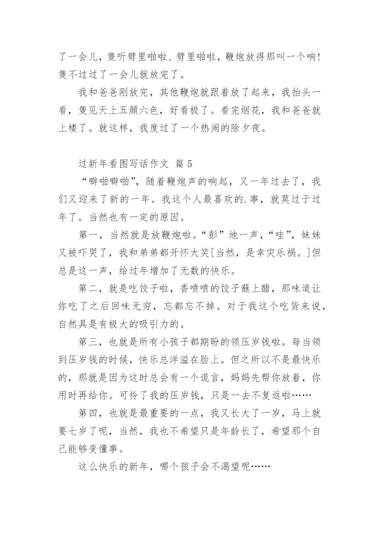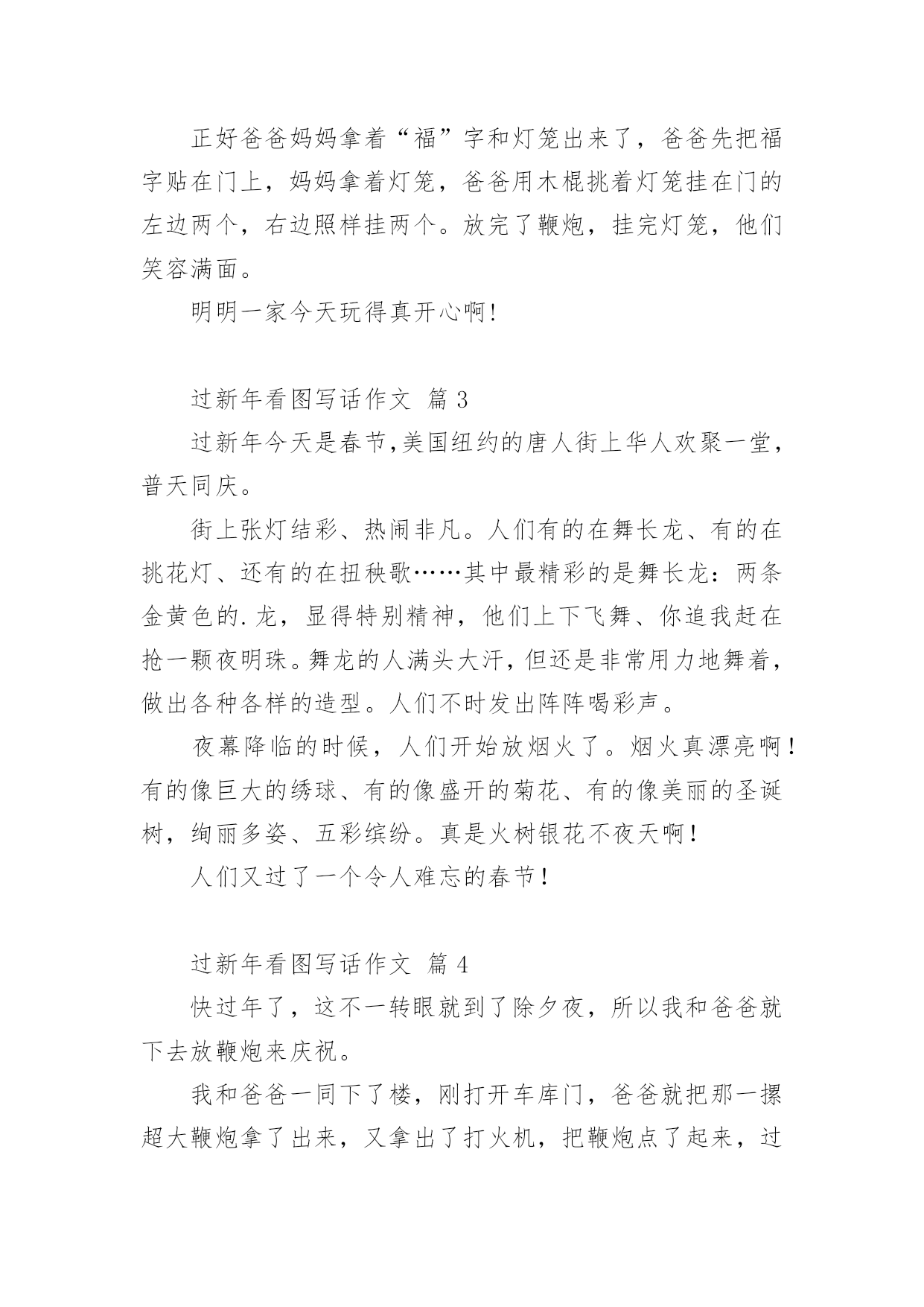 过新年看图写话作文 过新年看图写话作文(通用63篇)在平时的学习、工作或生活中,大家总少不了接触作文吧,写作文是培养人们的观察力、联想力、想象力、思考力和记忆力的重要手段。一篇什么样的作文才能称之为优秀作文呢?以下是小编整理的过新年看图写话作文,仅供参考,欢迎大家阅读。过新年看图写话作文篇1今天过年了,我们欢天喜地地去外婆家过大家。小红和小明一起放鞭炮。小明敢将大鞭炮放在一根棍子上,点燃了以后,鞭炮响了起来。他还拿着鞭炮去吓唬他的妹妹。他说:“你真胆小!”爸爸在挂灯笼,爸爸已经挂了好几个。妈妈也在帮忙。我们大家真高兴啊!过新年看图写话作文篇2今天是大年初一,明明穿上新衣服,拿着鞭炮去叫他的`好朋友红红。明明想拿着鞭炮放,可是太危险了,明明就把鞭炮挂在树枝上,拿着树枝放,“啪!啪!”的响声惊天动地的。红红吓得捂着耳朵。正好爸爸妈妈拿着“福”字和灯笼出来了,爸爸先把福字贴在门上,妈妈拿着灯笼,爸爸用木棍挑着灯笼挂在门的左边两个,右边照样挂两个。放完了鞭炮,挂完灯笼,他们笑容满面。明明一家今天玩得真开心啊!过新年看图写话作文篇3过新年今天是春节,美国纽约的唐人街上华人欢聚一堂,普天同庆。街上张灯结彩、热闹非凡。人们有的在舞长龙、有的在挑花灯、还有的在扭秧歌……其中最精彩的是舞长龙:两条金黄色的.龙,显得特别精神,他们上下飞舞、你追我赶在抢一颗夜明珠。舞龙的人满头大汗,但还是非常用力地舞着,做出各种各样的造型。人们不时发出阵阵喝彩声。夜幕降临的时候,人们开始放烟火了。烟火真漂亮啊!有的像巨大的绣球、有的像盛开的菊花、有的像美丽的圣诞树,绚丽多姿、五彩缤纷。真是火树银花不夜天啊!人们又过了一个令人难忘的春节!过新年看图写话作文篇4快过年了,这不一转眼就到了除夕夜,所以我和爸爸就下去放鞭炮来庆祝。我和爸爸一同下了楼,刚打开车库门,爸爸就把那一摞超大鞭炮拿了出来,又拿出了打火机,把鞭炮点了起来,过了一会儿,隻听劈里啪啦、劈里啪啦,鞭炮放得那叫一个响!隻不过过了一会儿就放完了。我和爸爸刚放完,其他鞭炮就跟着放了起来,我抬头一看,隻见天上五顏六色,好看极了。看完烟花,我和爸爸就上楼了。就这样,我度过了一个热闹的除夕夜。过新年看图写话作文篇5“噼啪噼啪”,随着鞭炮声的响起,又一年过去了,我们又迎来了新的一年。我这个人最喜欢的.事,就莫过于过年了。当然也有一定的原因。第一,当然就是放鞭炮啦。“彭”地一声,“哇”,妹妹又被吓哭了,我和弟弟都开怀大笑[当然,是幸灾乐祸。]但总是这一声,给过年增加了无数的快乐。第二,就是吃饺子啦,香喷喷的饺子蘸上醋,那味道让你吃了之后回味无穷,忘都忘不掉。对于我这个吃货来说,自然具是有极大的吸引力的。第三,也就是所有小孩子都期盼的领压岁钱啦。每当领到压岁钱的时候,快乐总洋溢在脸上。但之所以不是最快乐的,那就是因为这时总会有一个谎言,妈妈先帮你放着,你用时再给你。可怜了我的压岁钱,只是一去不复返啦……第四,也就是最重要的一点,我又长大了一岁,马上就要七岁了呢,当然,我也不希望只是年龄长了,希望那个自己能够变懂事。这么快乐的新年,哪个孩子会不渴望呢……过新年看图写话作文篇6“新年到,家家户户欢乐多”,每逢春节,便是我最自由的几天,家人对我放松管理,有啥玩啥,无拘无束,简直就像在天堂生活一样,十分得意。除夕夜,各家都灯火通明,大人在包水饺,孩子们在哪里玩耍,到处是欢乐祥和的氛围。八点钟春晚准点开始,家人们都坐在沙发上或者凳子上,似乎是一年中凑得最齐的时刻。看着一个个节目的演出,大家时而欢笑、时而讨论,把工作和学习都忘到了脑后。一个个节目的播放,使大家聚精会神的看着,好像已经达到了一个忘我的境界,可能是因为许多好笑的,引人注目的节目造成的'吧。在节目里,有的人在跳舞,有人在唱歌,还有时会有一些朗诵、相声之类口头表演。但是,最令我印象深刻的,就应该是那几只小狗的表演了。一会活蹦乱跳,一会一本正经的表演节目。他们的表演,总会令我哈哈大笑。或许因为是鼠年,这几只小狗才会感觉令人喜气洋洋吧。在春晚的放映中,大家都有时会抢到一些红包。“啊,抢红包了!”“啊!我抢了59.75……”,在平时大家都很少能够抢到红包,而这一两天可就成了普遍现象。当看春晚感觉有点“烦”的时候,我们便去放烟花、鞭炮。在我心里,最喜欢的两个便是“火枪筒”和“开天炮”了,手持火枪筒朝向天空,点燃引线,“砰,砰”就会射出一颗颗子弹在天空中爆炸,似乎那黑黑的夜晚都被那火花点亮了。“开天炮”是个威力更大花炮,不但个头大,而且射得高,炸得面积大、声音也更大。我把二个开天炮的芯儿拧在一起,一个长一个短。接着,我就用香点着芯儿一点燃引线,大家都双手捂着耳朵,有的躲在门后,有的躲在树边,有的往屋里躲,就像动物大逃亡一样。突然,乒乓二声二个炮全炸开了,震天动地的响彻云霄。我们男孩轮流
