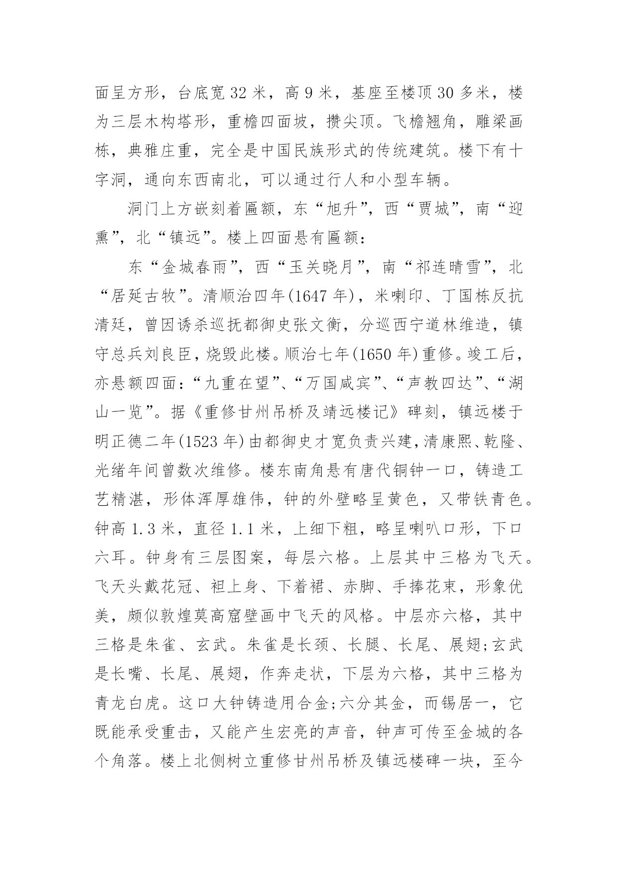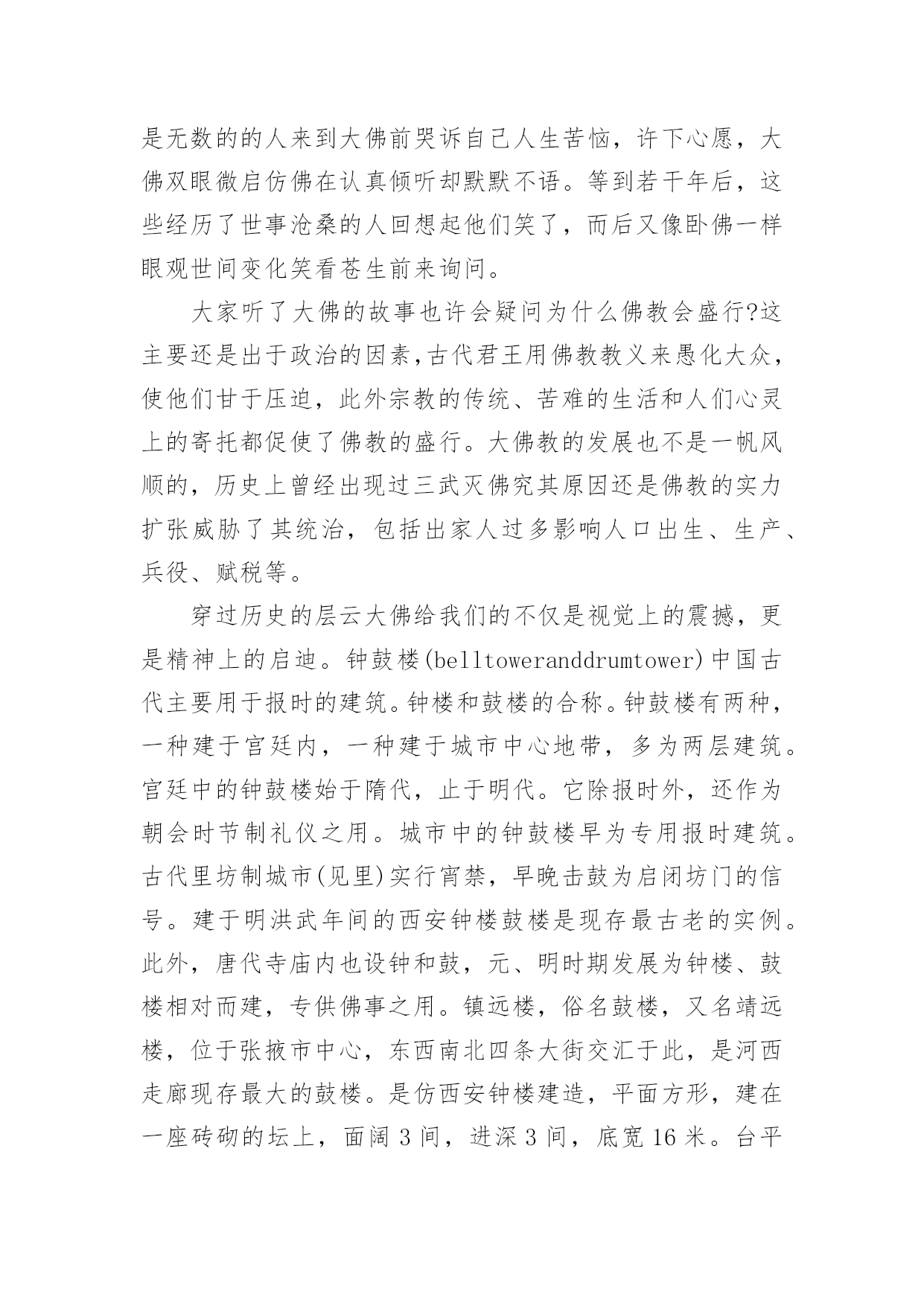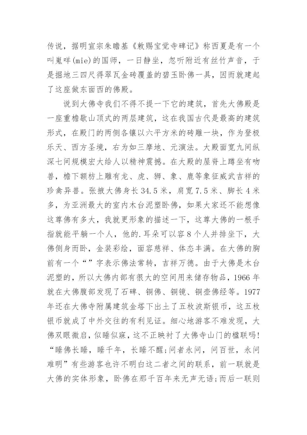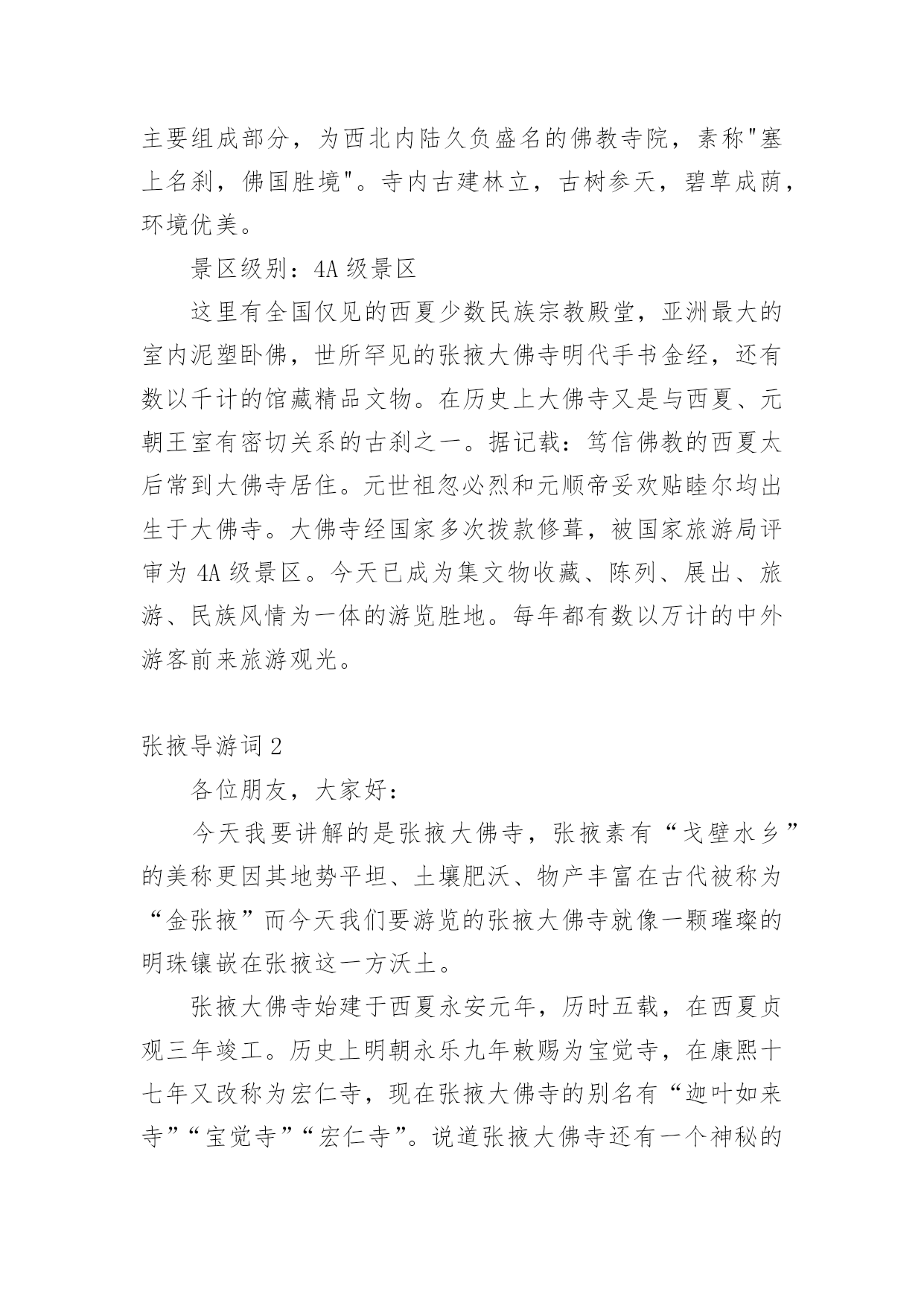 张掖导游词 张掖导游词作为一名优秀的导游,往往需要进行导游词编写工作,导游词具有形象、生动、具有感染力的特点。那么一遍条理清晰的导游词应该怎么写呢?下面是小编收集整理的张掖导游词,欢迎阅读与收藏。张掖导游词1张掖大佛寺始建于西夏崇宗永安元年,就是公元1098年,踞现在已有900多年了。它的名称几度更改,曾称作“迦叶如来寺”、“宝觉寺”、“弘仁寺”等,因寺内塑有著名的室内大卧佛,所以老百姓叫它“卧佛寺”、或“大佛寺”。大佛寺始建于西夏永安元年(1098年),寺内安放有国内最大的室内卧佛,也就是佛祖释迦牟尼的涅磐像。他安睡在大殿正中高1.2米的佛坛之上,佛身长34.5米,肩宽7.5米,耳朵约4米,脚长5.2米。大佛的一根中指就能平躺一个人,耳朵上能容八个张掖大佛寺人并排而坐,可见塑像何等的庞大了。大佛寺景区位于甘肃省张掖城西南隅,是丝绸之路上的一处重要名胜古迹群,它又是历史文化名城金张掖的标志性建筑。景区对外开放的景点有建于西夏的'大佛寺、隋代的万寿木塔、明代的弥陀千佛塔、钟鼓楼以及名扬西北的清代山西会馆。其中,大佛寺(甘州区博物馆所在地)是该景区的主要组成部分,为西北内陆久负盛名的佛教寺院,素称"塞上名刹,佛国胜境"。寺内古建林立,古树参天,碧草成荫,环境优美。景区级别:4A级景区这里有全国仅见的西夏少数民族宗教殿堂,亚洲最大的室内泥塑卧佛,世所罕见的张掖大佛寺明代手书金经,还有数以千计的馆藏精品文物。在历史上大佛寺又是与西夏、元朝王室有密切关系的古刹之一。据记载:笃信佛教的西夏太后常到大佛寺居住。元世祖忽必烈和元顺帝妥欢贴睦尔均出生于大佛寺。大佛寺经国家多次拨款修葺,被国家旅游局评审为4A级景区。今天已成为集文物收藏、陈列、展出、旅游、民族风情为一体的游览胜地。每年都有数以万计的中外游客前来旅游观光。张掖导游词2各位朋友,大家好:今天我要讲解的是张掖大佛寺,张掖素有“戈壁水乡”的美称更因其地势平坦、土壤肥沃、物产丰富在古代被称为“金张掖”而今天我们要游览的张掖大佛寺就像一颗璀璨的明珠镶嵌在张掖这一方沃土。张掖大佛寺始建于西夏永安元年,历时五载,在西夏贞观三年竣工。历史上明朝永乐九年敕赐为宝觉寺,在康熙十七年又改称为宏仁寺,现在张掖大佛寺的别名有“迦叶如来寺”“宝觉寺”“宏仁寺”。说道张掖大佛寺还有一个神秘的传说,据明宣宗朱瞻基《敕赐宝觉寺碑记》称西夏是有一个叫嵬咩(mie)的国师,一日静坐,忽听附近有丝竹声音,于是掘地三四尺得翠瓦金砖覆盖的碧玉卧佛一具,因而就建起了这座做东面西的佛殿。说到大佛寺我们不得不提一下它的建筑,首先大佛殿是一座重檐歇山顶式的两层建筑,这在我国古代是最高的建筑形式,在殿门的两侧各镶以六平方米的砖雕一块,作为登极乐天、西方圣境,右为如三摩地、元演法。大殿面宽九间纵深七间规模宏大给人以精神震撼。在大殿的屋脊上蹲坐有吻兽,檐下额枋上雕有龙、虎、狮、象、鹿等象征威武吉祥的珍禽异兽。张掖大佛身长34.5米,肩宽7.5米、脚长4米多,为亚洲最大的室内木台泥塑卧佛,如果大家还不能想像这尊佛有多大,我就更形象的描述一下,这尊大佛的一根手指就能平躺一个人,他的.耳朵可以容8个人并排坐下,大佛侧身而卧,金装彩绘,面容慈祥、体态丰满。在大佛的胸前有一个“”字表示佛法常转,吉祥万德。由于大佛是木台泥塑的,所以大佛内部有很大的空间用来储存物品,1966年就在大佛腹部发现了石碑、铜佛、铜镜、铜壶佛经等。1977年还在大佛寺附属建筑金塔下出土了五枚波斯银币,这五枚银币就成了中外交往的有利见证。细心地游客不难发现,大佛双眼微启,似睡似寐,这不正映衬了大佛寺山门的楹联吗!“睡佛长睡,睡千年,长睡不醒;问者永问,问百世,永问难明”有些游客也许不明白这二者之间的联系,前一联就是大佛的实体形象,卧佛在那千百年来无声无语;而后一联则是无数的的人来到大佛前哭诉自己人生苦恼,许下心愿,大佛双眼微启仿佛在认真倾听却默默不语。等到若干年后,这些经历了世事沧桑的人回想起他们笑了,而后又像卧佛一样眼观世间变化笑看苍生前来询问。大家听了大佛的故事也许会疑问为什么佛教会盛行?这主要还是出于政治的因素,古代君王用佛教教义来愚化大众,使他们甘于压迫,此外宗教的传统、苦难的生活和人们心灵上的寄托都促使了佛教的盛行。大佛教的发展也不是一帆风顺的,历史上曾经出现过三武灭佛究其原因还是佛教的实力扩张威胁了其统治,包括出家人过多影响人口出生、生产、兵役、赋税等。穿过历史的层云大佛给我们的不仅是视觉上的震撼,更是精神上的启迪。钟鼓楼(belltoweranddrumtower)中国古代主要用于报时的建筑。钟楼和鼓楼的合称。钟鼓楼有两种,一种建于宫廷内,一种建于城市中心地带,多为两层建筑。宫廷中的钟鼓楼始于隋代,止于明代。它除报时外,还作为朝会时节制礼仪之用。城市中的钟鼓楼早