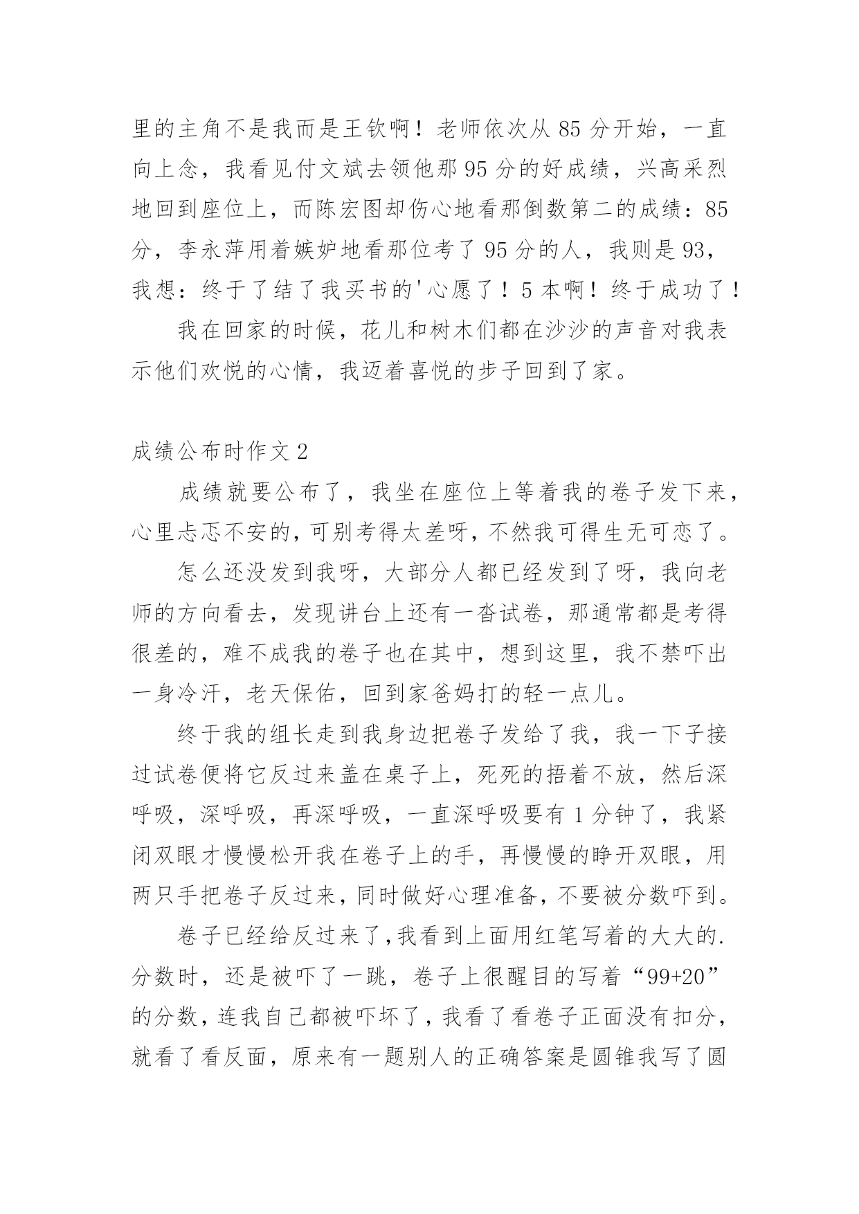 成绩公布时作文 成绩公布时作文在我们平凡的日常里,许多人都写过作文吧,作文是经过人的思想考虑和语言组织,通过文字来表达一个主题意义的记叙方法。那要怎么写好作文呢?以下是小编整理的成绩公布时作文,仅供参考,欢迎大家阅读。成绩公布时作文1老师说道:刘博文不及格59.5分!我失望地过去后,在拿到试卷的那一刹那间,快起床去学校领成绩了!一声温和的声音把我喊了起来,我这才醒了起来,才发觉这是一个梦。我大步流星地走到学校,进入教室,坐下长舒了一口气,等待着老师的到来。老师来到后,把课本往桌子上一扔,双手撑在讲桌上,耸着肩,伸出脖子严肃地问:同学们,这次怎么考的?我和同学们都慌了,老师一般不会动怒啊!那肯定考得不好吧!老师一下就变了脸色,真好似唱戏的变脸哩!同学们,这次考试都不错,有一大堆考A的,甚至连B、C都没有,但是·老师脸色乍变,却有一位表现不大好啊!我们的目光都不约而同的望向王钦,这位考试不及格黄金会员身上,因为只要是正常人都可以推算出来是他准没错!之后,老师说道:王钦不及格59。5分!看到这些,我才恍然大悟,原来,梦里的主角不是我而是王钦啊!老师依次从85分开始,一直向上念,我看见付文斌去领他那95分的好成绩,兴高采烈地回到座位上,而陈宏图却伤心地看那倒数第二的成绩:85分,李永萍用着嫉妒地看那位考了95分的人,我则是93,我想:终于了结了我买书的'心愿了!5本啊!终于成功了!我在回家的时候,花儿和树木们都在沙沙的声音对我表示他们欢悦的心情,我迈着喜悦的步子回到了家。成绩公布时作文2成绩就要公布了,我坐在座位上等着我的卷子发下来,心里忐忑不安的,可别考得太差呀,不然我可得生无可恋了。怎么还没发到我呀,大部分人都已经发到了呀,我向老师的方向看去,发现讲台上还有一沓试卷,那通常都是考得很差的,难不成我的卷子也在其中,想到这里,我不禁吓出一身冷汗,老天保佑,回到家爸妈打的轻一点儿。终于我的组长走到我身边把卷子发给了我,我一下子接过试卷便将它反过来盖在桌子上,死死的捂着不放,然后深呼吸,深呼吸,再深呼吸,一直深呼吸要有1分钟了,我紧闭双眼才慢慢松开我在卷子上的手,再慢慢的睁开双眼,用两只手把卷子反过来,同时做好心理准备,不要被分数吓到。卷子已经给反过来了,我看到上面用红笔写着的大大的.分数时,还是被吓了一跳,卷子上很醒目的写着“99+20”的分数,连我自己都被吓坏了,我看了看卷子正面没有扣分,就看了看反面,原来有一题别人的正确答案是圆锥我写了圆锥形扣了一分,唉,好冤啊!我再也不担心回家被打了。