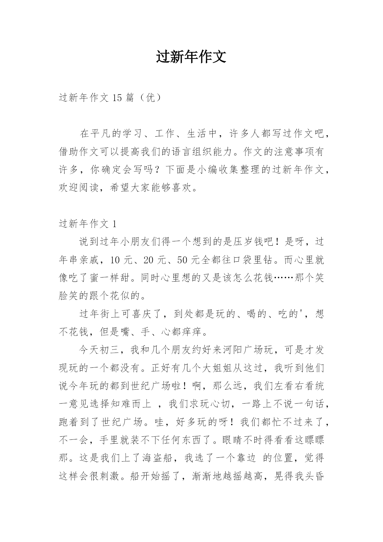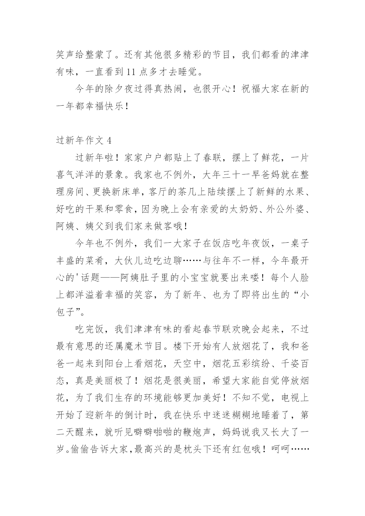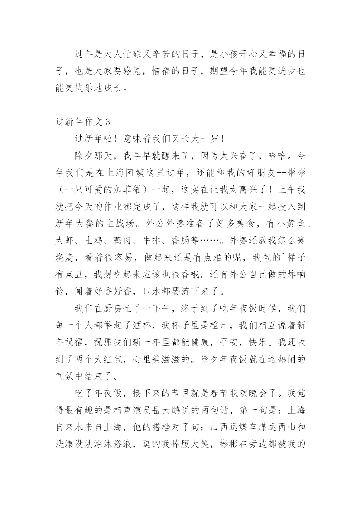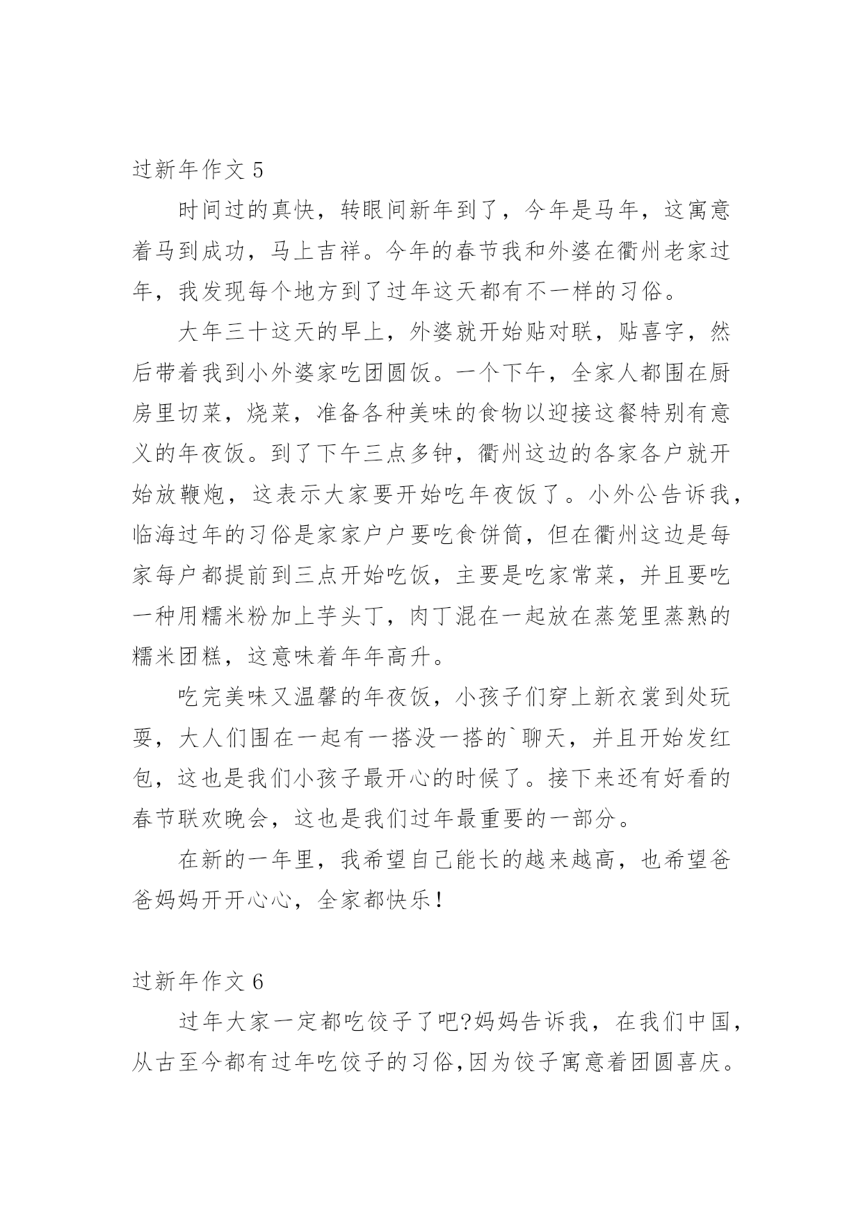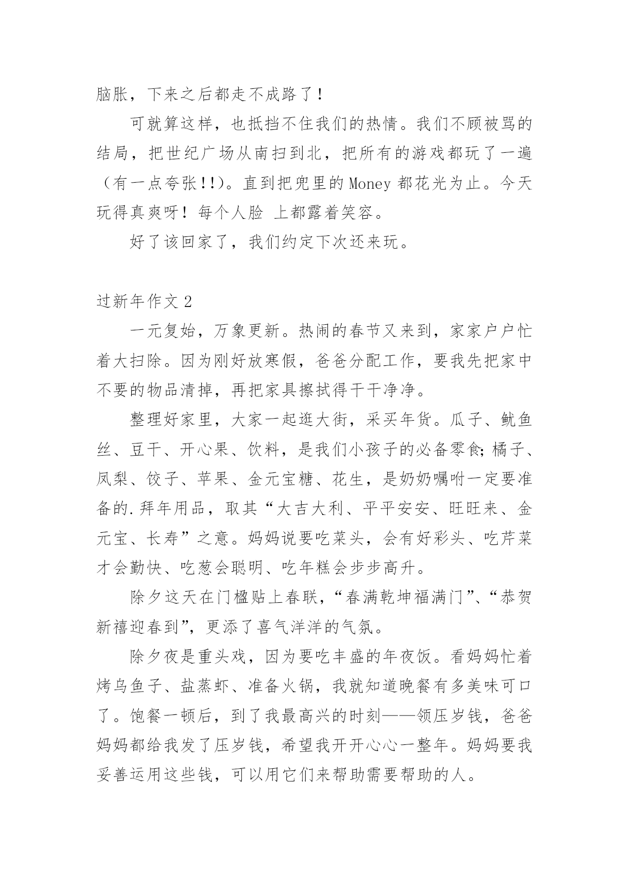过新年作文 过新年作文15篇(优)在平凡的学习、工作、生活中,许多人都写过作文吧,借助作文可以提高我们的语言组织能力。作文的注意事项有许多,你确定会写吗?下面是小编收集整理的过新年作文,欢迎阅读,希望大家能够喜欢。过新年作文1说到过年小朋友们得一个想到的是压岁钱吧!是呀,过年串亲戚,10元、20元、50元全都往口袋里钻。而心里就像吃了蜜一样甜。同时心里想的又是该怎么花钱……那个笑脸笑的跟个花似的。过年街上可喜庆了,到处都是玩的、喝的、吃的',想不花钱,但是嘴、手、心都痒痒。今天初三,我和几个朋友约好来河阳广场玩,可是才发现玩的一个都没有。正好有几个大姐姐从这过,我听到他们说今年玩的都到世纪广场啦!啊,那么远,我们左看右看统一意见选择知难而上,我们求玩心切,一路上不说一句话,跑着到了世纪广场。哇,好多玩的呀!我们都忙不过来了,不一会,手里就装不下任何东西了。眼睛不时得看看这瞟瞟那。这是我们上了海盗船,我选了一个靠边的位置,觉得这样会很刺激。船开始摇了,渐渐地越摇越高,晃得我头昏脑胀,下来之后都走不成路了!可就算这样,也抵挡不住我们的热情。我们不顾被骂的结局,把世纪广场从南扫到北,把所有的游戏都玩了一遍(有一点夸张!!)。直到把兜里的Money都花光为止。今天玩得真爽呀!每个人脸上都露着笑容。好了该回家了,我们约定下次还来玩。过新年作文2一元复始,万象更新。热闹的春节又来到,家家户户忙着大扫除。因为刚好放寒假,爸爸分配工作,要我先把家中不要的物品清掉,再把家具擦拭得干干净净。整理好家里,大家一起逛大街,采买年货。瓜子、鱿鱼丝、豆干、开心果、饮料,是我们小孩子的必备零食;橘子、凤梨、饺子、苹果、金元宝糖、花生,是奶奶嘱咐一定要准备的.拜年用品,取其“大吉大利、平平安安、旺旺来、金元宝、长寿”之意。妈妈说要吃菜头,会有好彩头、吃芹菜才会勤快、吃葱会聪明、吃年糕会步步高升。除夕这天在门楹贴上春联,“春满乾坤福满门”、“恭贺新禧迎春到”,更添了喜气洋洋的气氛。除夕夜是重头戏,因为要吃丰盛的年夜饭。看妈妈忙着烤乌鱼子、盐蒸虾、准备火锅,我就知道晚餐有多美味可口了。饱餐一顿后,到了我最高兴的时刻——领压岁钱,爸爸妈妈都给我发了压岁钱,希望我开开心心一整年。妈妈要我妥善运用这些钱,可以用它们来帮助需要帮助的人。过年是大人忙碌又辛苦的日子,是小孩开心又幸福的日子,也是大家要感恩,惜福的日子,期望今年我能更进步也能更快乐地成长。过新年作文3过新年啦!意味着我们又长大一岁!除夕那天,我早早就醒来了,因为太兴奋了,哈哈。今年我们是在上海阿姨这里过年,还能和我的好朋友--彬彬(一只可爱的加菲猫)一起,这实在让我太高兴了!上午我就把今天的作业都完成了,这样我就可以和大家一起投入到新年大餐的主战场。外公外婆准备了好多美食,有小黄鱼、大虾、土鸡、鸭肉、牛排、香肠等……。外婆还教我怎么裹烧麦,看着很容易,做起来还是有点难的呢,我包的`样子有点丑,我想吃起来应该也很香哦。还有外公自己做的炸响铃,闻着好香好香,口水都要流下来了。我们在厨房忙了一下午,终于到了吃年夜饭时候,我们每一个人都举起了酒杯,我杯子里是橙汁,我们相互说着新年祝福,祝愿我们新一年里都能健康,平安,快乐。我还收到了两个大红包,心里美滋滋的。除夕年夜饭就在这热闹的气氛中结束了。吃了年夜饭,接下来的节目就是春节联欢晚会了。我觉得最有趣的是相声演员岳云鹏说的两句话,第一句是:上海自来水来自上海,他的搭档对了句:山西运煤车煤运西山和洗澡没法涂沐浴液,逗的我捧腹大笑,彬彬在旁边都被我的笑声给整蒙了。还有其他很多精彩的节目,我们都看的津津有味,一直看到11点多才去睡觉。今年的除夕夜过得真热闹,也很开心!祝福大家在新的一年都幸福快乐!过新年作文4过新年啦!家家户户都贴上了春联,摆上了鲜花,一片喜气洋洋的景象。我家也不例外,大年三十一早爸妈就在整理房间、更换新床单,客厅的茶几上陆续摆上了新鲜的水果、好吃的干果和零食,因为晚上会有亲爱的太奶奶、外公外婆、阿姨、姨父到我们家来做客哦!今年也不例外,我们一大家子在饭店吃年夜饭,一桌子丰盛的菜肴,大伙儿边吃边聊……与往年不一样,今年最开心的'话题——阿姨肚子里的小宝宝就要出来喽!每个人脸上都洋溢着幸福的笑容,为了新年、也为了即将出生的“小包子”。吃完饭,我们津津有味的看起春节联欢晚会起来,不过最有意思的还属魔术节目。楼下开始有人放烟花了,我和爸爸一起来到阳台上看烟花,天空中,烟花五彩缤纷、千姿百态,真是美丽极了!烟花是很美丽,希望大家能自觉停放烟花,为了我们生存的环境能够更加美好!不知不觉,电视上开始了迎新年的倒计时,我在快乐中迷迷糊糊地睡着了,第二天醒来,就听见噼噼啪啪的鞭炮声,妈妈说我又长大了一岁。偷偷告诉大家,最高兴的是枕头下还有红包哦!呵呵……过新年作文5时间过的