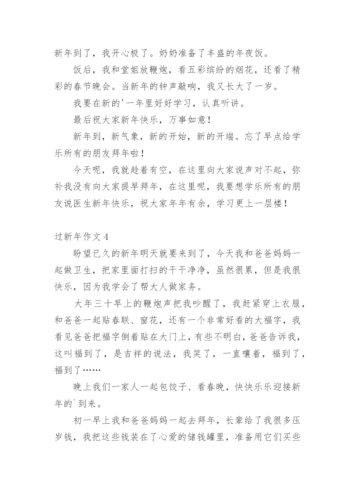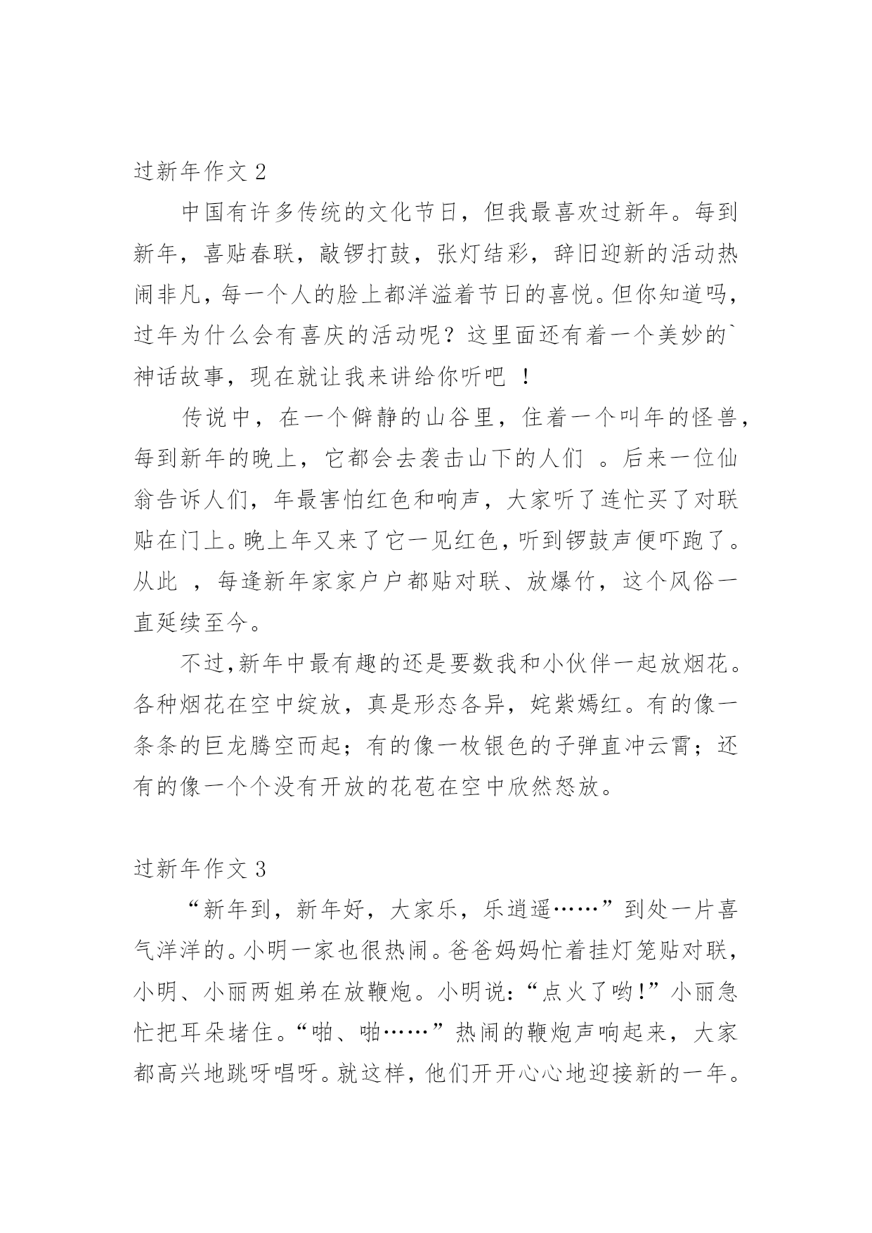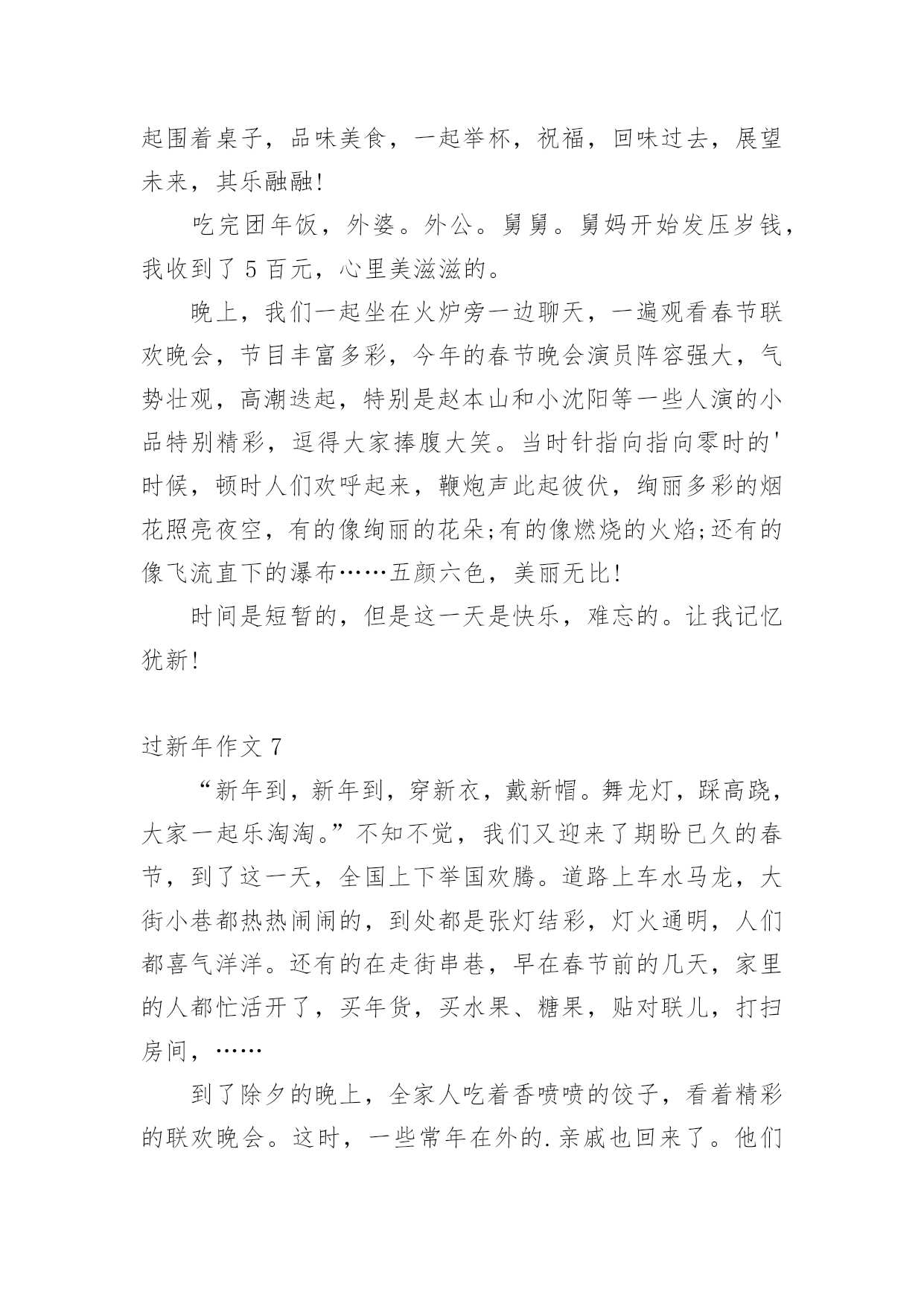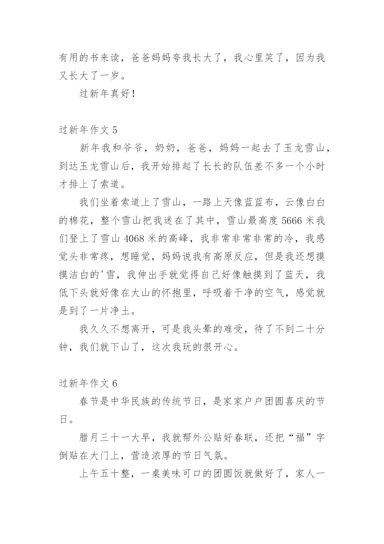 过新年作文 过新年作文【精选15篇】在平日的学习、工作和生活里,大家都有写作文的经历,对作文很是熟悉吧,作文是由文字组成,经过人的思想考虑,通过语言组织来表达一个主题意义的文体。你写作文时总是无从下笔?下面是小编整理的过新年作文,仅供参考,希望能够帮助到大家。过新年作文1噼里啪啦!噼里啪啦!大家开始放烟花了!我们一家听见了,赶快把衣服换好,烟花拿上,就在姥姥家旁边的广场上放烟花了。姐姐有点儿害怕大的烟花,可是,外面到处都是大的烟花。幸亏,我们没有拿大的'烟花,只带了小摔炮,不然姐姐就要回家啦!我们正准备玩小摔炮。姐姐让我先甩一个,示范给她看看,然后她再摔,一个个摔炮,顽皮地跳下来,有趣极了!渐渐地,我们这种方式玩腻了,开始四个、六个、八个……广场上的鞭炮噼里啪啦,响声不绝,我们的尖叫声此起彼伏。多么有趣的鞭炮,多么可爱的家人,带给了我快乐。我喜爱放鞭炮!过新年作文2中国有许多传统的文化节日,但我最喜欢过新年。每到新年,喜贴春联,敲锣打鼓,张灯结彩,辞旧迎新的活动热闹非凡,每一个人的脸上都洋溢着节日的喜悦。但你知道吗,过年为什么会有喜庆的活动呢?这里面还有着一个美妙的`神话故事,现在就让我来讲给你听吧!传说中,在一个僻静的山谷里,住着一个叫年的怪兽,每到新年的晚上,它都会去袭击山下的人们。后来一位仙翁告诉人们,年最害怕红色和响声,大家听了连忙买了对联贴在门上。晚上年又来了它一见红色,听到锣鼓声便吓跑了。从此,每逢新年家家户户都贴对联、放爆竹,这个风俗一直延续至今。不过,新年中最有趣的还是要数我和小伙伴一起放烟花。各种烟花在空中绽放,真是形态各异,姹紫嫣红。有的像一条条的巨龙腾空而起;有的像一枚银色的子弹直冲云霄;还有的像一个个没有开放的花苞在空中欣然怒放。过新年作文3“新年到,新年好,大家乐,乐逍遥……”到处一片喜气洋洋的。小明一家也很热闹。爸爸妈妈忙着挂灯笼贴对联,小明、小丽两姐弟在放鞭炮。小明说:“点火了哟!”小丽急忙把耳朵堵住。“啪、啪……”热闹的鞭炮声响起来,大家都高兴地跳呀唱呀。就这样,他们开开心心地迎接新的一年。新年到了,我开心极了。奶奶准备了丰盛的年夜饭。饭后,我和堂姐放鞭炮,看五彩缤纷的烟花,还看了精彩的春节晚会。当新年的钟声敲响,我又长大了一岁。我要在新的'一年里好好学习,认真听讲。最后祝大家新年快乐,万事如意!新年到,新气象,新的开始,新的开端。忘了早点给学乐所有的朋友拜年啦!今天呢,我就趁着有空,在这里向大家说声对不起,弥补我没有向大家提早拜年,在这里呢,我要想学乐所有的朋友说医生新年快乐,祝大家年年有余,学习更上一层楼!过新年作文4盼望已久的新年明天就要来到了,今天我和爸爸妈妈一起做卫生,把家里面打扫的干干净净,虽然很累,但是我很快乐,因为我学会了帮大人做家务。大年三十早上的鞭炮声把我吵醒了,我赶紧穿上衣服,和爸爸一起贴春联、窗花,还有一个非常好看的大福字,我看见爸爸把福字倒着贴在大门上,有些不明白,爸爸告诉我,这叫福到了,是吉祥的说法,我笑了,一直嚷着,福到了,福到了……晚上我们一家人一起包饺子、看春晚,快快乐乐迎接新年的`到来。初一早上我和爸爸妈妈一起去拜年,长辈给了我很多压岁钱,我把这些钱装在了心爱的储钱罐里,准备用它们买些有用的书来读,爸爸妈妈夸我长大了,我心里笑了,因为我又长大了一岁。过新年真好!过新年作文5新年我和爷爷,奶奶,爸爸,妈妈一起去了玉龙雪山,到达玉龙雪山后,我开始排起了长长的队伍差不多一个小时才排上了索道。我们坐着索道上了雪山,一路上天像蓝蓝布,云像白白的棉花,整个雪山把我迷在了其中,雪山最高度5666米我们登上了雪山4068米的高峰,我非常非常非常的冷,我感觉头非常疼,想睡觉,妈妈说我有高原反应,但是我还想摸摸洁白的'雪,我伸出手就觉得自己好像触摸到了蓝天,我低下头就好像在大山的怀抱里,呼吸着干净的空气,感觉就是到了一片净土。我久久不想离开,可是我头晕的难受,待了不到二十分钟,我们就下山了,这次我玩的很开心。过新年作文6春节是中华民族的传统节日,是家家户户团圆喜庆的节日。腊月三十一大早,我就帮外公贴好春联,还把“福”字倒贴在大门上,营造浓厚的节日气氛。上午五十整,一桌美味可口的团圆饭就做好了,家人一起围着桌子,品味美食,一起举杯,祝福,回味过去,展望未来,其乐融融!吃完团年饭,外婆。外公。舅舅。舅妈开始发压岁钱,我收到了5百元,心里美滋滋的。晚上,我们一起坐在火炉旁一边聊天,一遍观看春节联欢晚会,节目丰富多彩,今年的春节晚会演员阵容强大,气势壮观,高潮迭起,特别是赵本山和小沈阳等一些人演的小品特别精彩,逗得大家捧腹大笑。当时针指向指向零时的'时候,顿时人们欢呼起来,鞭炮声此起彼伏,绚丽多彩的烟花照亮夜空,有的像绚丽的花朵;有的像燃烧的火焰;还有的像飞流直下的瀑布……五颜六色,美