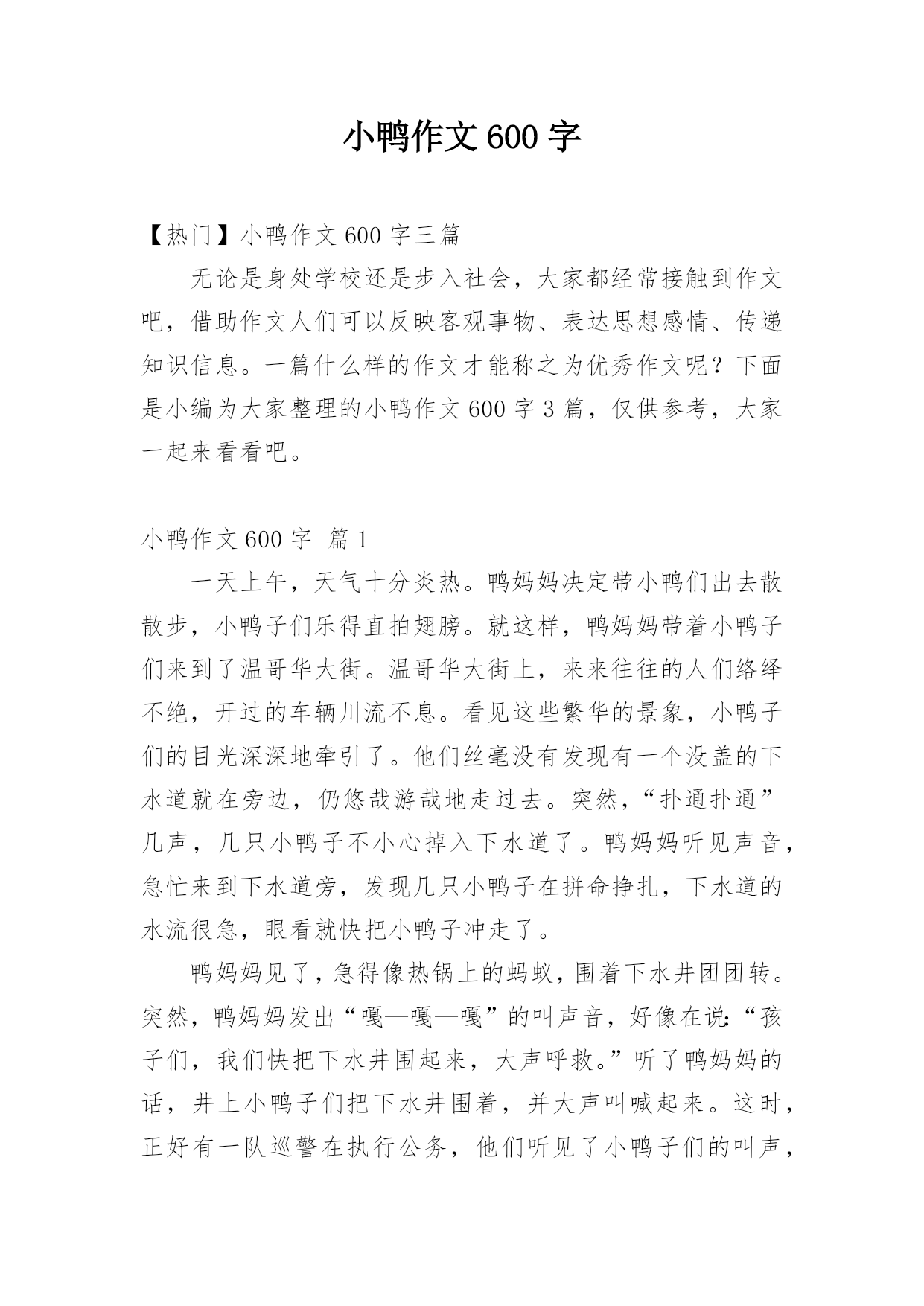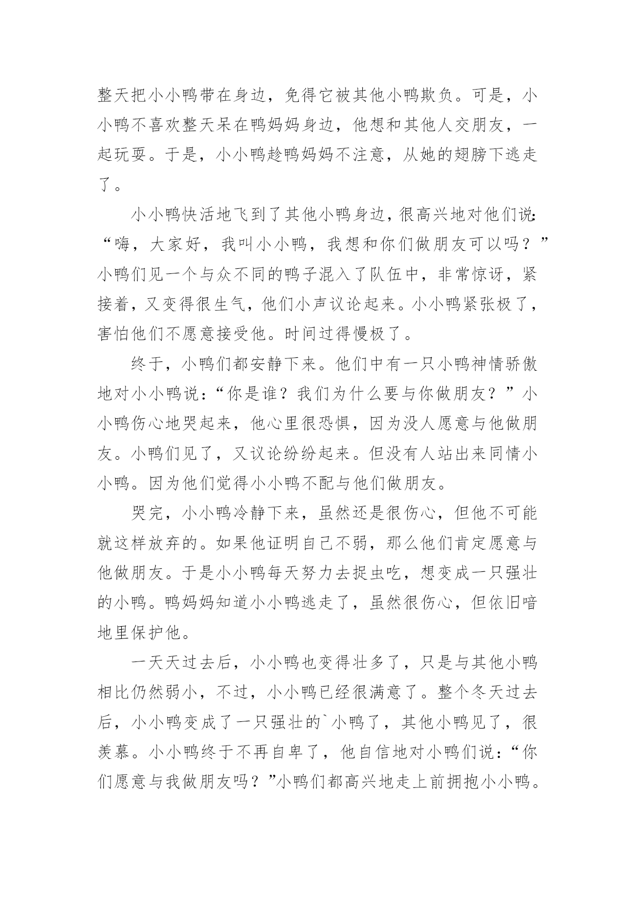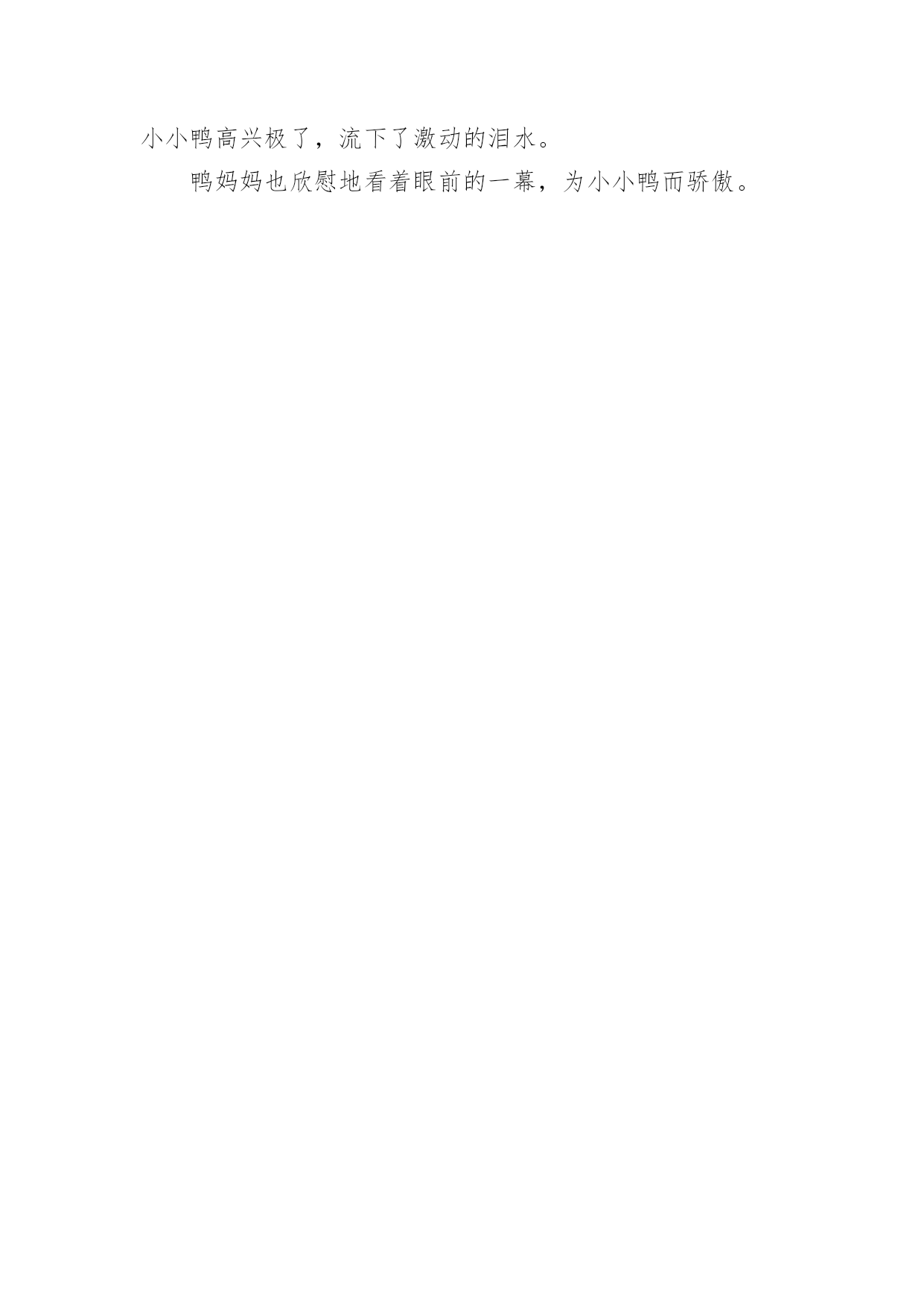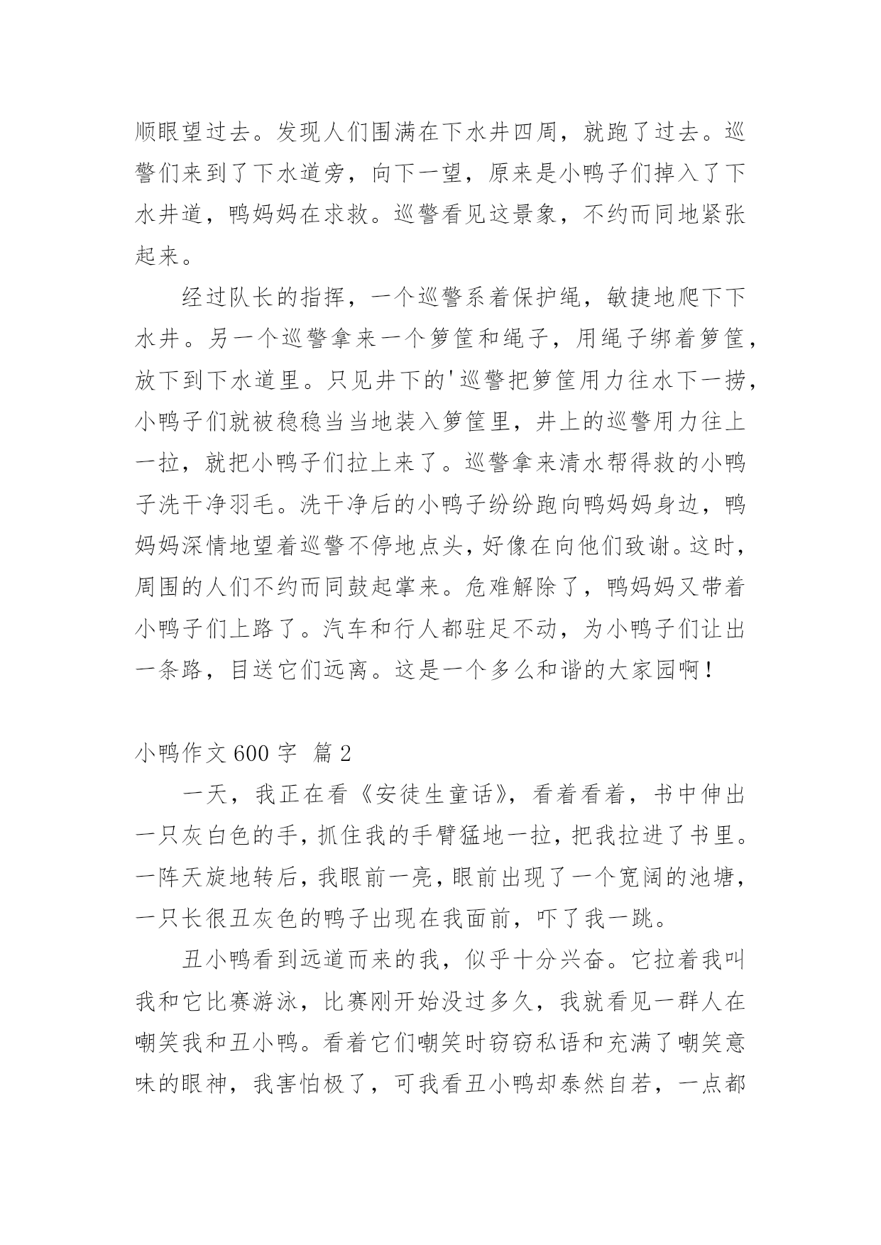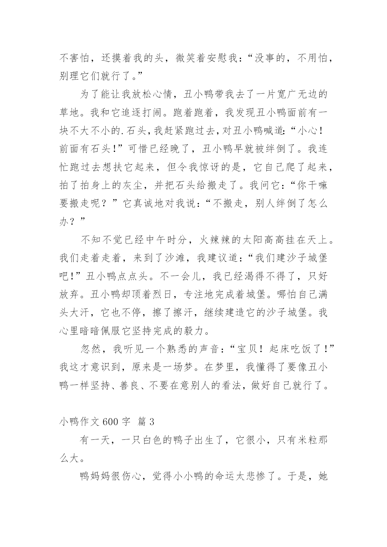 小鸭作文600字 【热门】小鸭作文600字三篇无论是身处学校还是步入社会,大家都经常接触到作文吧,借助作文人们可以反映客观事物、表达思想感情、传递知识信息。一篇什么样的作文才能称之为优秀作文呢?下面是小编为大家整理的小鸭作文600字3篇,仅供参考,大家一起来看看吧。小鸭作文600字篇1一天上午,天气十分炎热。鸭妈妈决定带小鸭们出去散散步,小鸭子们乐得直拍翅膀。就这样,鸭妈妈带着小鸭子们来到了温哥华大街。温哥华大街上,来来往往的人们络绎不绝,开过的车辆川流不息。看见这些繁华的景象,小鸭子们的目光深深地牵引了。他们丝毫没有发现有一个没盖的下水道就在旁边,仍悠哉游哉地走过去。突然,“扑通扑通”几声,几只小鸭子不小心掉入下水道了。鸭妈妈听见声音,急忙来到下水道旁,发现几只小鸭子在拼命挣扎,下水道的水流很急,眼看就快把小鸭子冲走了。鸭妈妈见了,急得像热锅上的蚂蚁,围着下水井团团转。突然,鸭妈妈发出“嘎—嘎—嘎”的叫声音,好像在说:“孩子们,我们快把下水井围起来,大声呼救。”听了鸭妈妈的话,井上小鸭子们把下水井围着,并大声叫喊起来。这时,正好有一队巡警在执行公务,他们听见了小鸭子们的叫声,顺眼望过去。发现人们围满在下水井四周,就跑了过去。巡警们来到了下水道旁,向下一望,原来是小鸭子们掉入了下水井道,鸭妈妈在求救。巡警看见这景象,不约而同地紧张起来。经过队长的指挥,一个巡警系着保护绳,敏捷地爬下下水井。另一个巡警拿来一个箩筐和绳子,用绳子绑着箩筐,放下到下水道里。只见井下的'巡警把箩筐用力往水下一捞,小鸭子们就被稳稳当当地装入箩筐里,井上的巡警用力往上一拉,就把小鸭子们拉上来了。巡警拿来清水帮得救的小鸭子洗干净羽毛。洗干净后的小鸭子纷纷跑向鸭妈妈身边,鸭妈妈深情地望着巡警不停地点头,好像在向他们致谢。这时,周围的人们不约而同鼓起掌来。危难解除了,鸭妈妈又带着小鸭子们上路了。汽车和行人都驻足不动,为小鸭子们让出一条路,目送它们远离。这是一个多么和谐的大家园啊!小鸭作文600字篇2一天,我正在看《安徒生童话》,看着看着,书中伸出一只灰白色的手,抓住我的手臂猛地一拉,把我拉进了书里。一阵天旋地转后,我眼前一亮,眼前出现了一个宽阔的池塘,一只长很丑灰色的鸭子出现在我面前,吓了我一跳。丑小鸭看到远道而来的我,似乎十分兴奋。它拉着我叫我和它比赛游泳,比赛刚开始没过多久,我就看见一群人在嘲笑我和丑小鸭。看着它们嘲笑时窃窃私语和充满了嘲笑意味的眼神,我害怕极了,可我看丑小鸭却泰然自若,一点都不害怕,还摸着我的头,微笑着安慰我:“没事的,不用怕,别理它们就行了。”为了能让我放松心情,丑小鸭带我去了一片宽广无边的草地。我和它追逐打闹。跑着跑着,我发现丑小鸭面前有一块不大不小的.石头,我赶紧跑过去,对丑小鸭喊道:“小心!前面有石头!”可惜已经晚了,丑小鸭早就被绊倒了。我连忙跑过去想扶它起来,但令我惊讶的是,它自己爬了起来,拍了拍身上的灰尘,并把石头给搬走了。我问它:“你干嘛要搬走呢?”它真诚地对我说:“不搬走,别人绊倒了怎么办?”不知不觉已经中午时分,火辣辣的太阳高高挂在天上。我们走着走着,来到了沙滩,我建议道:“我们建沙子城堡吧!”丑小鸭点点头。不一会儿,我已经渴得不得了,只好放弃。丑小鸭却顶着烈日,专注地完成着城堡。哪怕自己满头大汗,它也不停,擦了擦汗,继续建造它的沙子城堡。我心里暗暗佩服它坚持完成的毅力。忽然,我听见一个熟悉的声音:“宝贝!起床吃饭了!”我这才意识到,原来是一场梦。在梦里,我懂得了要像丑小鸭一样坚持、善良、不要在意别人的看法,做好自己就行了。小鸭作文600字篇3有一天,一只白色的鸭子出生了,它很小,只有米粒那么大。鸭妈妈很伤心,觉得小小鸭的命运太悲惨了。于是,她整天把小小鸭带在身边,免得它被其他小鸭欺负。可是,小小鸭不喜欢整天呆在鸭妈妈身边,他想和其他人交朋友,一起玩耍。于是,小小鸭趁鸭妈妈不注意,从她的翅膀下逃走了。小小鸭快活地飞到了其他小鸭身边,很高兴地对他们说:“嗨,大家好,我叫小小鸭,我想和你们做朋友可以吗?”小鸭们见一个与众不同的鸭子混入了队伍中,非常惊讶,紧接着,又变得很生气,他们小声议论起来。小小鸭紧张极了,害怕他们不愿意接受他。时间过得慢极了。终于,小鸭们都安静下来。他们中有一只小鸭神情骄傲地对小小鸭说:“你是谁?我们为什么要与你做朋友?”小小鸭伤心地哭起来,他心里很恐惧,因为没人愿意与他做朋友。小鸭们见了,又议论纷纷起来。但没有人站出来同情小小鸭。因为他们觉得小小鸭不配与他们做朋友。哭完,小小鸭冷静下来,虽然还是很伤心,但他不可能就这样放弃的。如果他证明自己不弱,那么他们肯定愿意与他做朋友。于是小小鸭每天努力去捉虫吃,想变成一只强壮的小鸭。鸭妈妈知道小小鸭逃走了,虽然很伤心,但依旧喑地里保护他。一天天过去后,小小鸭也变得