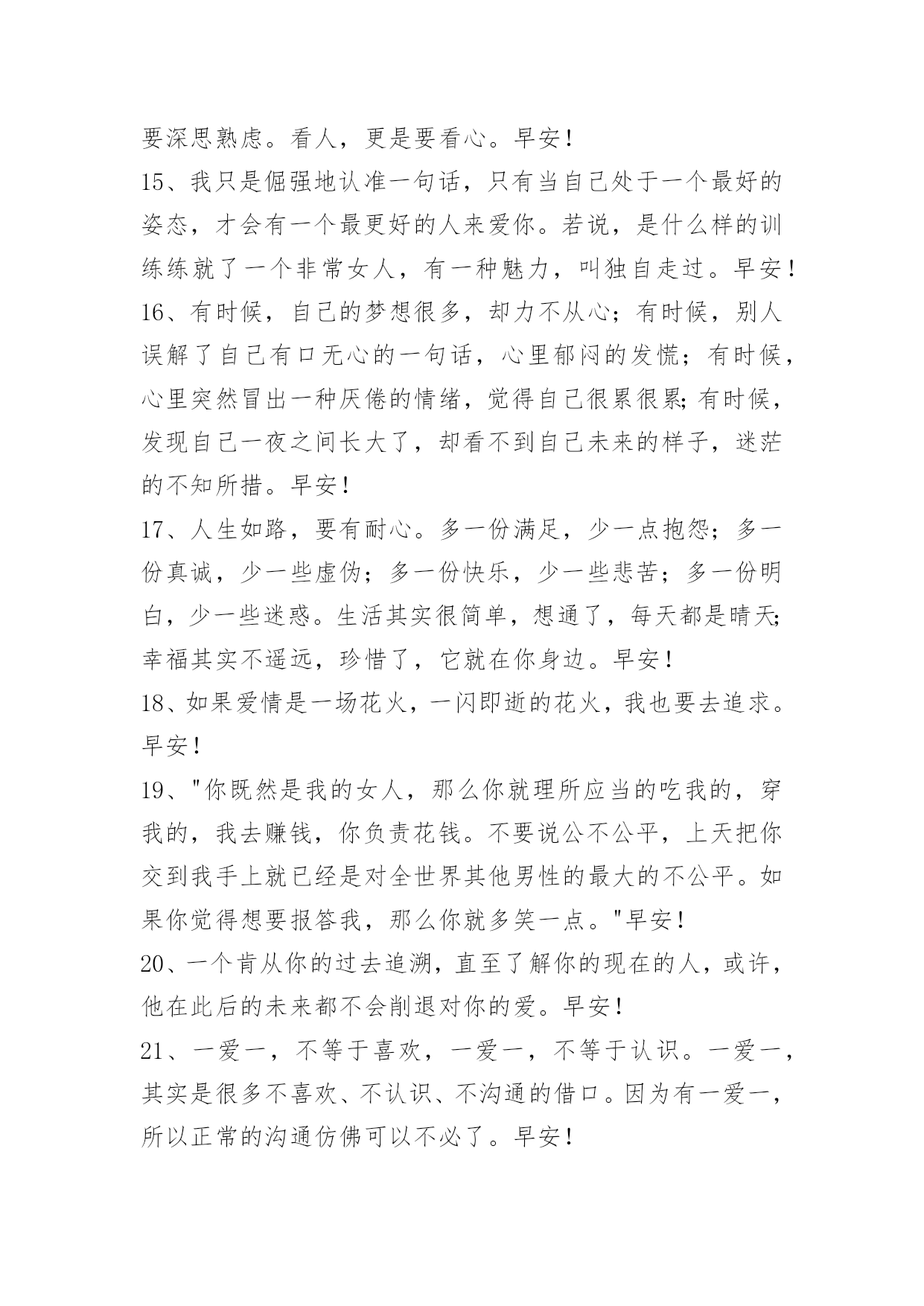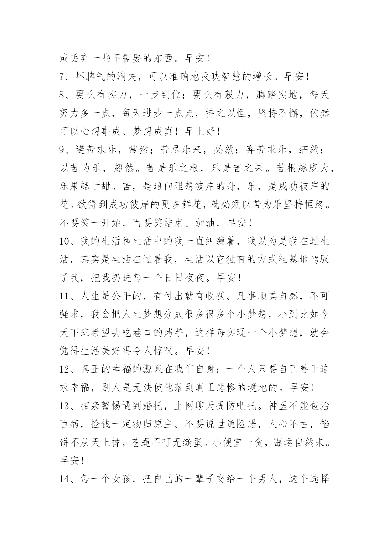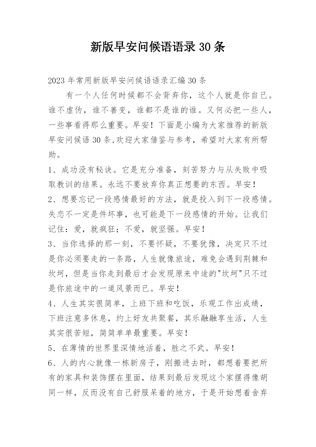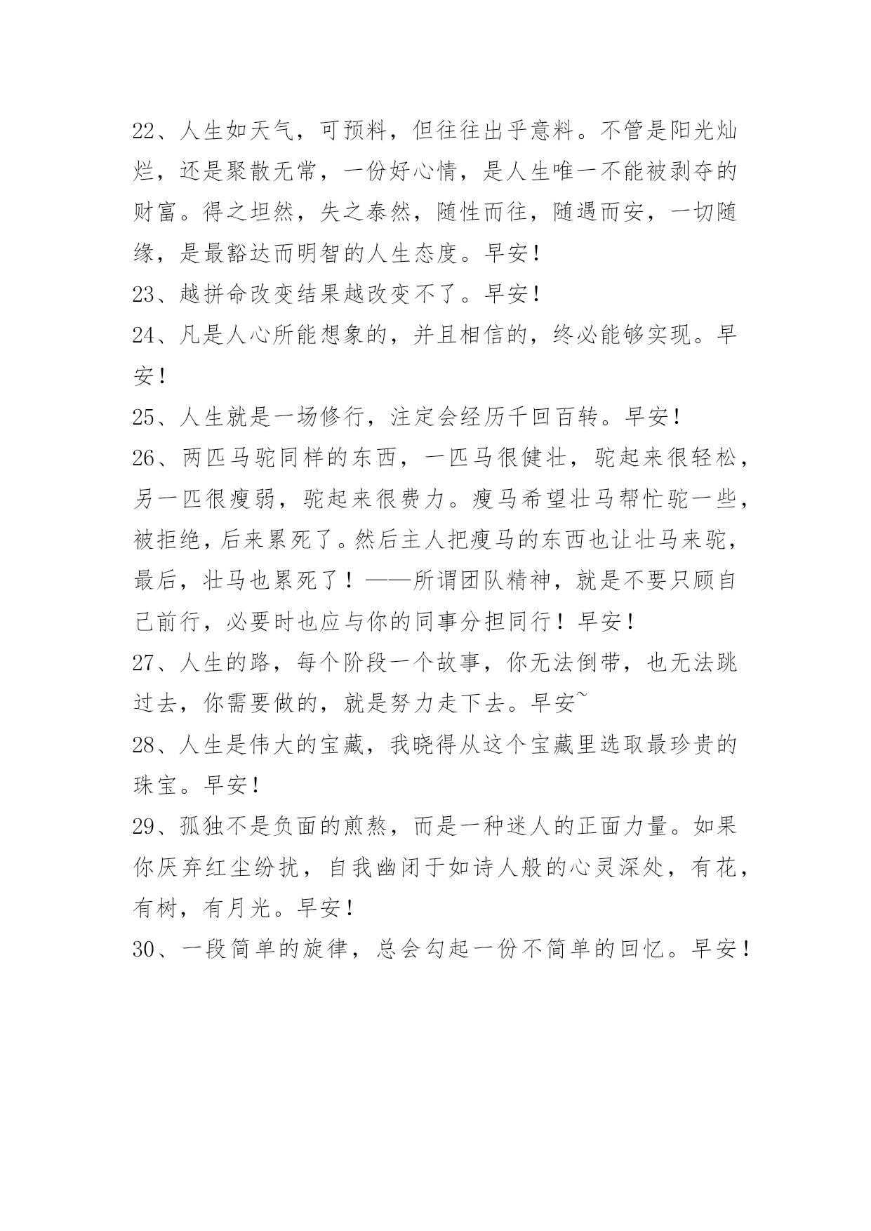 新版早安问候语语录30条 2023年常用新版早安问候语语录汇编30条有一个人任何时候都不会背弃你,这个人就是你自己。谁不虚伪,谁不善变,谁都不是谁的谁。又何必把一些人,一些事看得那么重要。早安!下面是小编为大家推荐的新版早安问候语30条,欢迎大家借鉴与参考,希望对大家有所帮助。1、成功没有秘诀。它是充分准备,刻苦努力与从失败中吸取教训的结果。永远不要放弃你真正想要的东西。早安!2、想要忘记一段感情最好的方法,就是投入到下一段感情。失恋不一定是件坏事,也可能是下一段感情的开始。让我们记住:爱,就疯狂;不爱,就坚强。早安!3、当你选择的那一刻,不要怀疑,不要犹豫,决定只不过是你必须要走的一条路,人生就像旅途,难免会遇到荆棘和坎坷,但是当你走到最后才会发现原来中途的"坎坷"只不过是你旅途中的一道风景而已。早安!4、人生其实很简单,上班下班和吃饭,乐观工作出成绩,下班注意多休息,约上好友共聚餐,其乐融融享生活,人生其实很苦短,简简单单最重要。早安!5、在薄情的世界里深情地活着,胜之不武。早安!6、人的内心就像一栋新房子,刚搬进去时,都想着要把所有的家具和装饰摆在里面,结果到最后发现这个家摆得像胡同一样,反而没有自己舒服呆着的地方,于是开始想着舍弃或丢弃一些不需要的东西。早安!7、坏脾气的消失,可以准确地反映智慧的增长。早安!8、要么有实力,一步到位;要么有毅力,脚踏实地,每天努力多一点,每天进步一点点,持之以恒,坚持不懈,依然可以心想事成、梦想成真!早上好!9、避苦求乐,常然;苦尽乐来,必然;弃苦求乐,茫然;以苦为乐,超然。苦是乐之根,乐是苦之果。苦根越庞大,乐果越甘甜。苦,是通向理想彼岸的舟,乐,是成功彼岸的花。欲得到成功彼岸的更多鲜花,就必须以苦为乐坚持恒终。不要笑一开始,而要笑结束。加油,早安!10、我的生活和生活中的我一直纠缠着,我以为是我在过生活,其实是生活在过着我,生活以它独有的方式粗暴地驾驭了我,把我扔进每一个日日夜夜。早安!11、人生是公平的,有付出就有收获。凡事顺其自然,不可强求,我会把人生梦想分成很多很多个小梦想,小到比如今天下班希望去吃巷口的烤芋,这样每实现一个小梦想,就会觉得生活美好得令人惊叹。早安!12、真正的幸福的源泉在我们自身;一个人只要自己善于追求幸福,别人是无法使他落到真正悲惨的境地的。早安!13、相亲警惕遇到婚托,上网聊天提防吧托。神医不能包治百病,捡钱一定物归原主。不要说世道险恶,人心不古,馅饼不从天上掉,苍蝇不叮无缝蛋。小便宜一贪,霉运自然来。早安!14、每一个女孩,把自己的一辈子交给一个男人,这个选择要深思熟虑。看人,更是要看心。早安!15、我只是倔强地认准一句话,只有当自己处于一个最好的姿态,才会有一个最更好的人来爱你。若说,是什么样的训练练就了一个非常女人,有一种魅力,叫独自走过。早安!16、有时候,自己的梦想很多,却力不从心;有时候,别人误解了自己有口无心的一句话,心里郁闷的发慌;有时候,心里突然冒出一种厌倦的情绪,觉得自己很累很累;有时候,发现自己一夜之间长大了,却看不到自己未来的样子,迷茫的不知所措。早安!17、人生如路,要有耐心。多一份满足,少一点抱怨;多一份真诚,少一些虚伪;多一份快乐,少一些悲苦;多一份明白,少一些迷惑。生活其实很简单,想通了,每天都是晴天;幸福其实不遥远,珍惜了,它就在你身边。早安!18、如果爱情是一场花火,一闪即逝的花火,我也要去追求。早安!19、"你既然是我的女人,那么你就理所应当的吃我的,穿我的,我去赚钱,你负责花钱。不要说公不公平,上天把你交到我手上就已经是对全世界其他男性的最大的不公平。如果你觉得想要报答我,那么你就多笑一点。"早安!20、一个肯从你的过去追溯,直至了解你的现在的人,或许,他在此后的未来都不会削退对你的爱。早安!21、一爱一,不等于喜欢,一爱一,不等于认识。一爱一,其实是很多不喜欢、不认识、不沟通的借口。因为有一爱一,所以正常的沟通仿佛可以不必了。早安!22、人生如天气,可预料,但往往出乎意料。不管是阳光灿烂,还是聚散无常,一份好心情,是人生唯一不能被剥夺的财富。得之坦然,失之泰然,随性而往,随遇而安,一切随缘,是最豁达而明智的人生态度。早安!23、越拼命改变结果越改变不了。早安!24、凡是人心所能想象的,并且相信的,终必能够实现。早安!25、人生就是一场修行,注定会经历千回百转。早安!26、两匹马驼同样的东西,一匹马很健壮,驼起来很轻松,另一匹很瘦弱,驼起来很费力。瘦马希望壮马帮忙驼一些,被拒绝,后来累死了。然后主人把瘦马的东西也让壮马来驼,最后,壮马也累死了!——所谓团队精神,就是不要只顾自己前行,必要时也应与你的同事分担同行!早安!27、人生的路,每个阶段一个故事,你无法倒带,也无法跳过去,你需要做的,就是努力走下去。早安~2