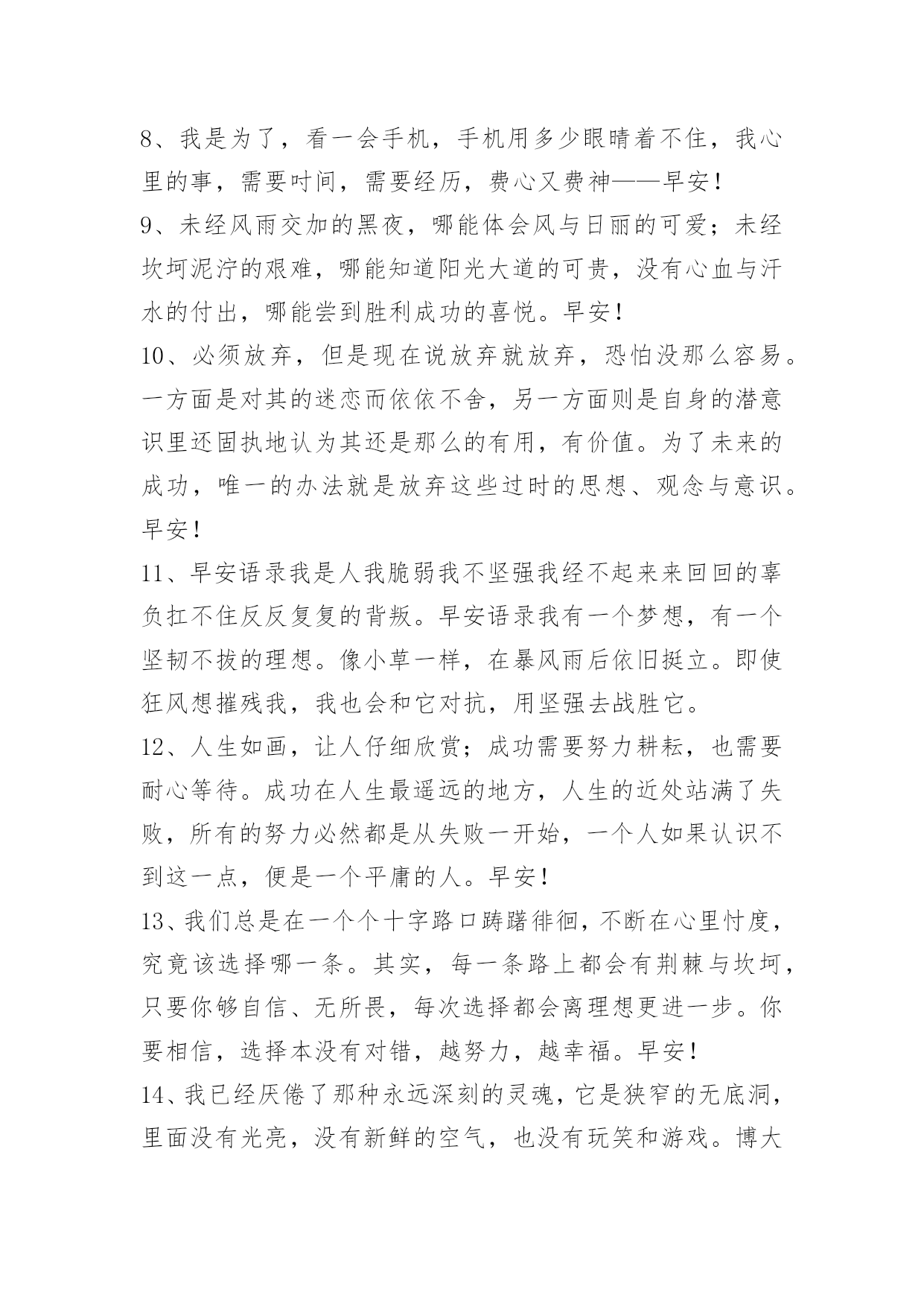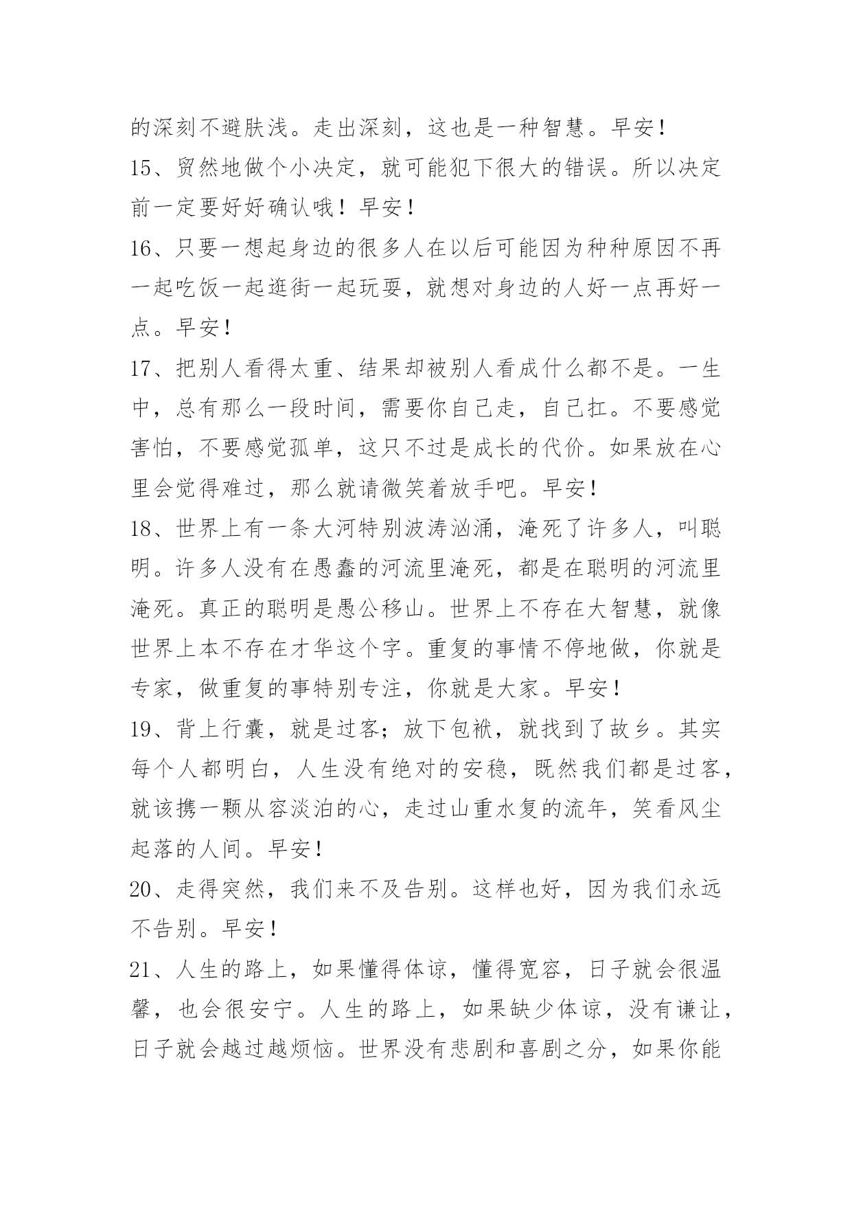 新版早安问候语语录 2023年常用新版早安问候语语录33句不要因为努力的变成别人喜欢的样子,却到头来连自己都忘了真实的自己。早安!以下是小编帮大家整理的新版早安问候语33句,欢迎大家阅读。1、露珠,沿着蒲公英和三叶草的梦境滚落,溅起一片片透明的阳光。在一种金黄般的喧哗声中,孵出一个不再潮湿的黎明。早安!2、低调做人,不是指低声下气,奴颜婢膝,而是指要始终把自己当成普通一分子,使自身融入到大众中去,融人到社会中去,不追名逐利,不自命不凡,为人处世不张扬。早安!3、人生,需要我们有足够的勇气,来面对自己的生活,来面对周边的人与物,只有你能够直面这一切时,你才会发现,什么是勇敢。早安。4、信仰像阳光,摸不着,却必不可缺。早安!5、爱是天堂,恨是地狱。早安!6、有一种爱叫做喜悦,因为相爱在一起简单而幸福;有一种爱叫做甜蜜,因为爱是酝酿甜蜜的花朵;有一种爱叫做微笑,因为爱像成熟了,挂在枝头上的开心果;有一种爱做叫坦白,因为爱的存在,每个人的心里都能够明白。早安!7、你从不欠别人一段恋爱,也不欠任何人一个孩子,你只欠自己一个幸福的模样。早安~8、我是为了,看一会手机,手机用多少眼晴着不住,我心里的事,需要吋间,需要经历,费心又费神——早安!9、未经风雨交加的黑夜,哪能体会风与日丽的可爱;未经坎坷泥泞的艰难,哪能知道阳光大道的可贵,没有心血与汗水的付出,哪能尝到胜利成功的喜悦。早安!10、必须放弃,但是现在说放弃就放弃,恐怕没那么容易。一方面是对其的迷恋而依依不舍,另一方面则是自身的潜意识里还固执地认为其还是那么的有用,有价值。为了未来的成功,唯一的办法就是放弃这些过时的思想、观念与意识。早安!11、早安语录我是人我脆弱我不坚强我经不起来来回回的辜负扛不住反反复复的背叛。早安语录我有一个梦想,有一个坚韧不拔的理想。像小草一样,在暴风雨后依旧挺立。即使狂风想摧残我,我也会和它对抗,用坚强去战胜它。12、人生如画,让人仔细欣赏;成功需要努力耕耘,也需要耐心等待。成功在人生最遥远的地方,人生的近处站满了失败,所有的努力必然都是从失败一开始,一个人如果认识不到这一点,便是一个平庸的人。早安!13、我们总是在一个个十字路口踌躇徘徊,不断在心里忖度,究竟该选择哪一条。其实,每一条路上都会有荆棘与坎坷,只要你够自信、无所畏,每次选择都会离理想更进一步。你要相信,选择本没有对错,越努力,越幸福。早安!14、我已经厌倦了那种永远深刻的灵魂,它是狭窄的无底洞,里面没有光亮,没有新鲜的空气,也没有玩笑和游戏。博大的深刻不避肤浅。走出深刻,这也是一种智慧。早安!15、贸然地做个小决定,就可能犯下很大的错误。所以决定前一定要好好确认哦!早安!16、只要一想起身边的很多人在以后可能因为种种原因不再一起吃饭一起逛街一起玩耍,就想对身边的人好一点再好一点。早安!17、把别人看得太重、结果却被别人看成什么都不是。一生中,总有那么一段时间,需要你自己走,自己扛。不要感觉害怕,不要感觉孤单,这只不过是成长的代价。如果放在心里会觉得难过,那么就请微笑着放手吧。早安!18、世界上有一条大河特别波涛汹涌,淹死了许多人,叫聪明。许多人没有在愚蠢的河流里淹死,都是在聪明的河流里淹死。真正的聪明是愚公移山。世界上不存在大智慧,就像世界上本不存在才华这个字。重复的事情不停地做,你就是专家,做重复的事特别专注,你就是大家。早安!19、背上行囊,就是过客;放下包袱,就找到了故乡。其实每个人都明白,人生没有绝对的安稳,既然我们都是过客,就该携一颗从容淡泊的心,走过山重水复的流年,笑看风尘起落的人间。早安!20、走得突然,我们来不及告别。这样也好,因为我们永远不告别。早安!21、人生的路上,如果懂得体谅,懂得宽容,日子就会很温馨,也会很安宁。人生的路上,如果缺少体谅,没有谦让,日子就会越过越烦恼。世界没有悲剧和喜剧之分,如果你能从悲剧中走出来,那就是喜剧,如果你沉缅于喜剧之中,那它就是悲剧。早安!22、人生就像一本书,愚蠢的人很快就翻完了聪明的人会慢慢的仔细阅读因为他们知道这本书只能看一次。早安!23、把心思集中在如何把自身变得更优秀的角度上,把眼光放长一点,你强大了,一切自然会改变。亲们,早上好~~~24、人生没有彩排,每一天都不会重来。时间在走,我们在变,唯一可以走的更远更宽的路,就是成为比昨天更好的自己,用自己的努力去惊艳时光!早安!25、音乐,开心时入耳、伤心时入心。真正的感情根本不需要追的。两个人的默契慢慢将两颗心的距离缩短,在无意识中渐渐靠近彼此。早安26、站在不同的高度,看着不同的风景。风景的好与坏,取决于你的心情。你的心情好,风景自然好;你的心情坏,风景自然坏。早安!27、留一点空间给你的主管—当主管的也需要安全感。早安!28、每当你想要指责别人的时候,要切记,这世上并非所有人都拥