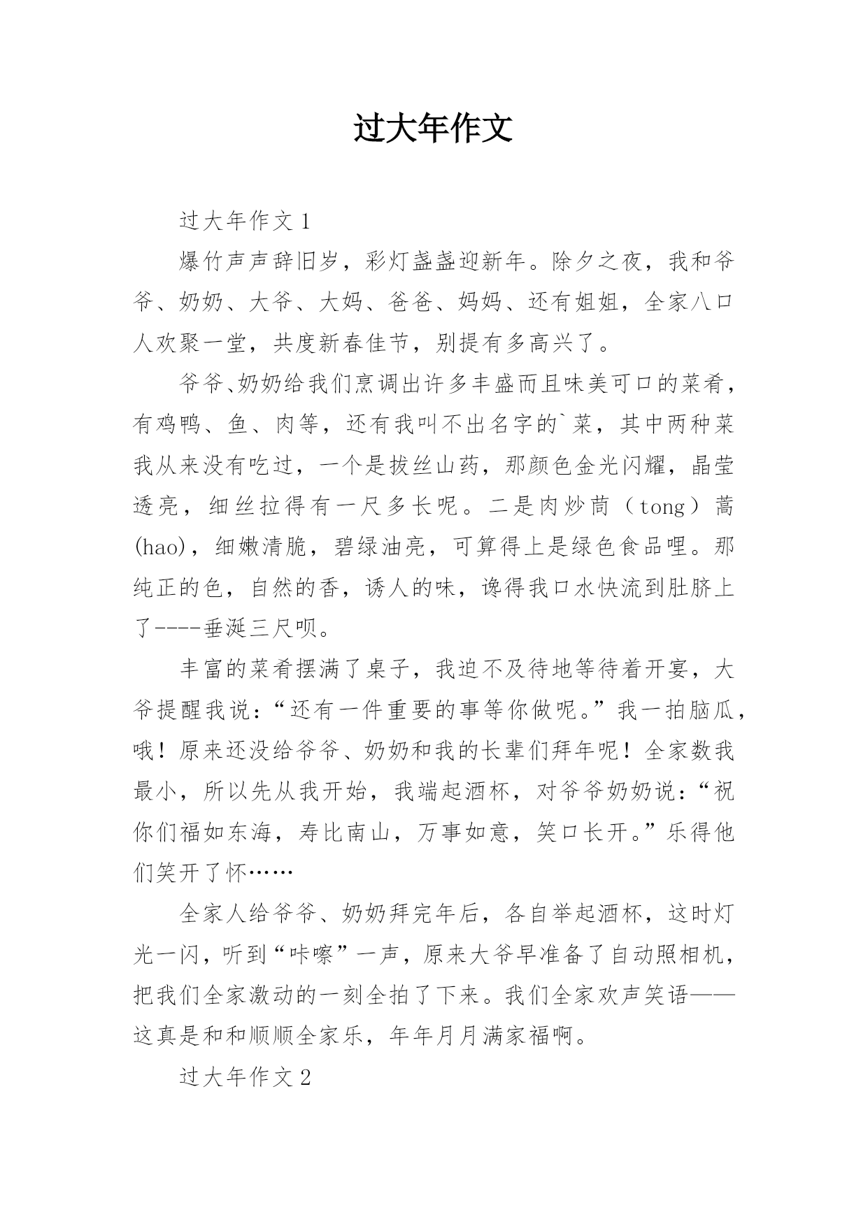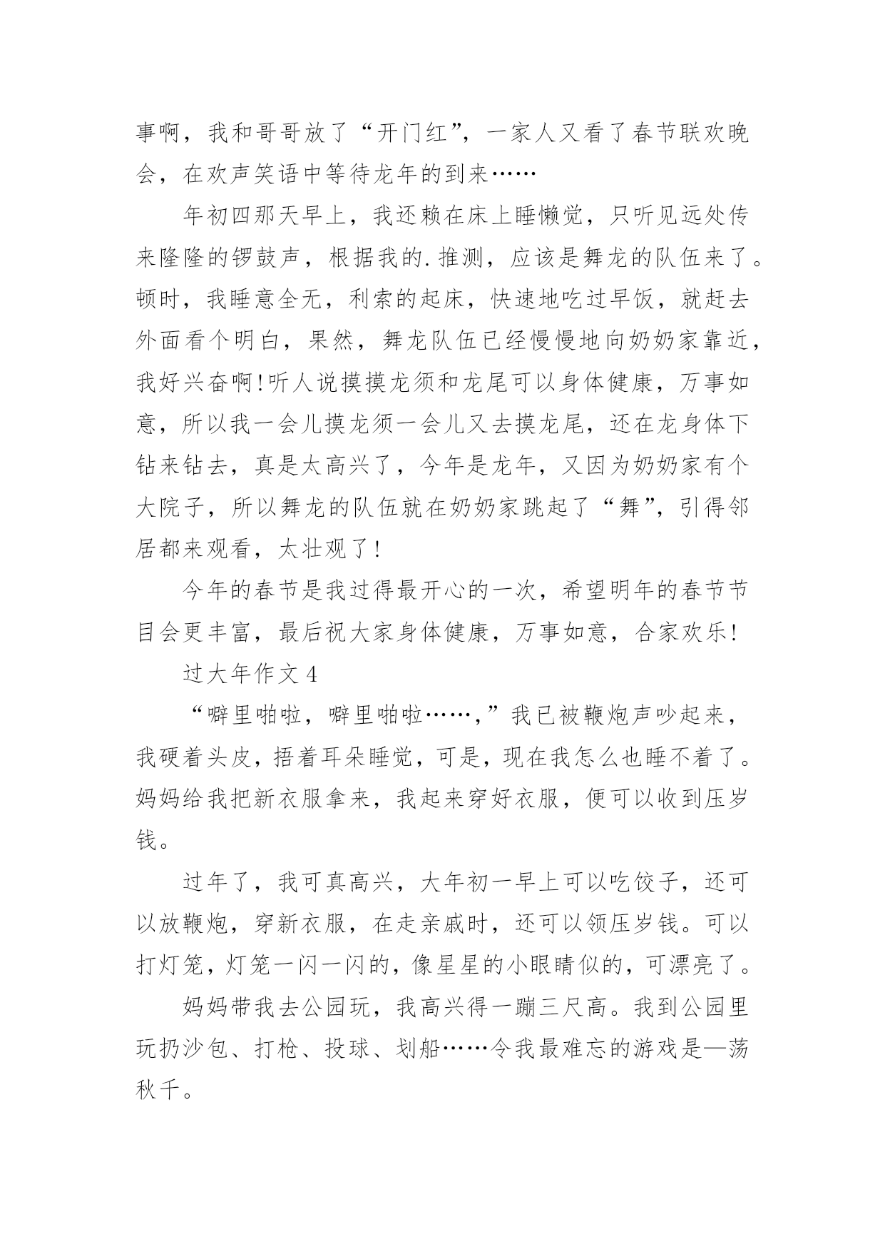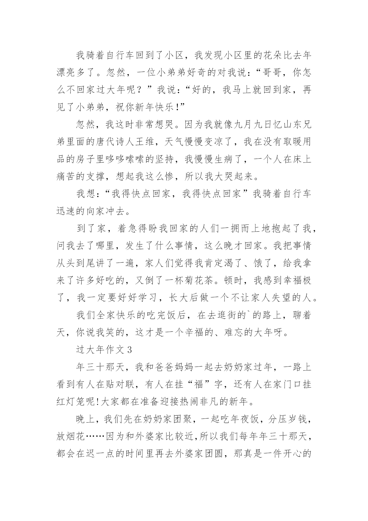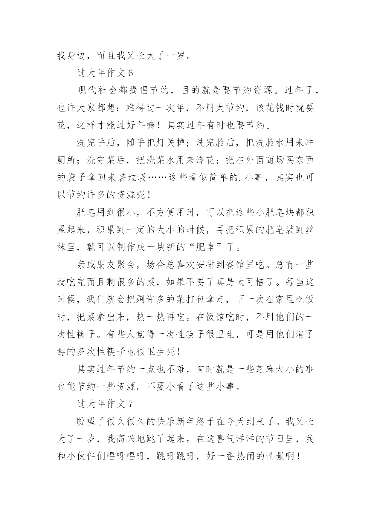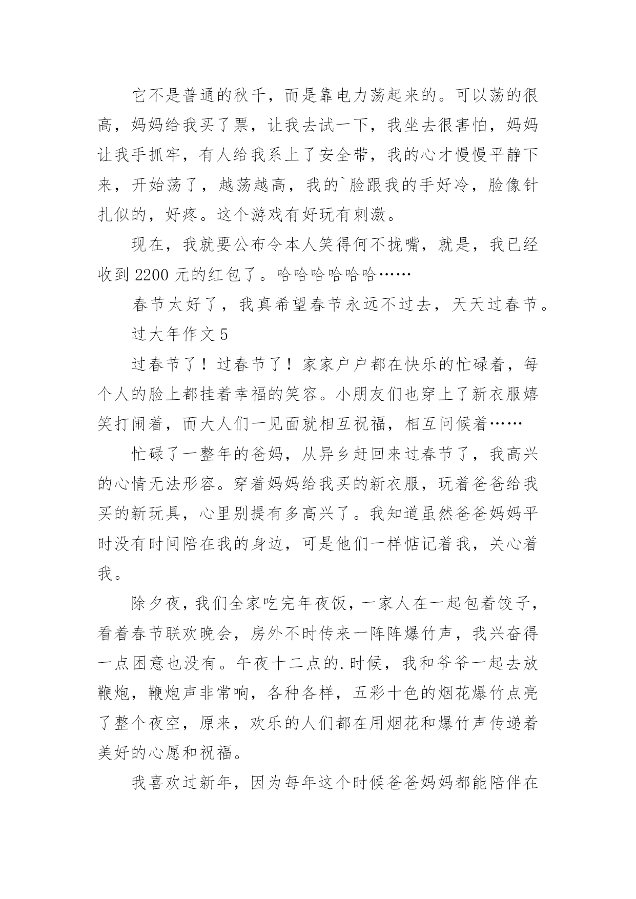 过大年作文 过大年作文1爆竹声声辞旧岁,彩灯盏盏迎新年。除夕之夜,我和爷爷、奶奶、大爷、大妈、爸爸、妈妈、还有姐姐,全家八口人欢聚一堂,共度新春佳节,别提有多高兴了。爷爷、奶奶给我们烹调出许多丰盛而且味美可口的菜肴,有鸡鸭、鱼、肉等,还有我叫不出名字的`菜,其中两种菜我从来没有吃过,一个是拔丝山药,那颜色金光闪耀,晶莹透亮,细丝拉得有一尺多长呢。二是肉炒茼(tong)蒿(hao),细嫩清脆,碧绿油亮,可算得上是绿色食品哩。那纯正的色,自然的香,诱人的味,谗得我口水快流到肚脐上了----垂涎三尺呗。丰富的菜肴摆满了桌子,我迫不及待地等待着开宴,大爷提醒我说:“还有一件重要的事等你做呢。”我一拍脑瓜,哦!原来还没给爷爷、奶奶和我的长辈们拜年呢!全家数我最小,所以先从我开始,我端起酒杯,对爷爷奶奶说:“祝你们福如东海,寿比南山,万事如意,笑口长开。”乐得他们笑开了怀……全家人给爷爷、奶奶拜完年后,各自举起酒杯,这时灯光一闪,听到“咔嚓”一声,原来大爷早准备了自动照相机,把我们全家激动的一刻全拍了下来。我们全家欢声笑语——这真是和和顺顺全家乐,年年月月满家福啊。过大年作文2我骑着自行车回到了小区,我发现小区里的花朵比去年漂亮多了。忽然,一位小弟弟好奇的对我说:“哥哥,你怎么不回家过大年呢?”我说:“好的,我马上就回到家,再见了小弟弟,祝你新年快乐!”忽然,我这时非常想哭。因为我就像九月九日忆山东兄弟里面的唐代诗人王维,天气慢慢变凉了,我在没有取暖用品的房子里哆哆嗦嗦的坚持,我慢慢生病了,一个人在床上痛苦的支撑,想起我这么惨,所以我大哭起来。我想:“我得快点回家,我得快点回家”我骑着自行车迅速的向家冲去。到了家,着急得盼我回家的人们一拥而上地抱起了我,问我去了哪里,发生了什么事情,这么晚才回家。我把事情从头到尾讲了一遍,家人们觉得我肯定渴了、饿了,给我拿来了许多好吃的,又倒了一杯菊花茶。顿时,我感到幸福极了,我一定要好好学习,长大后做一个不让家人失望的人。我们全家快乐的吃完饭后,在去逛街的`的路上,聊着天,你说我笑的,这才是一个辛福的、难忘的大年呀。过大年作文3年三十那天,我和爸爸妈妈一起去奶奶家过年,一路上看到有人在贴对联,有人在挂“福”字,还有人在家门口挂红灯笼呢!大家都在准备迎接热闹非凡的新年。晚上,我们先在奶奶家团聚,一起吃年夜饭,分压岁钱,放烟花……因为和外婆家比较近,所以我们每年年三十那天,都会在迟一点的时间里再去外婆家团圆,那真是一件开心的事啊,我和哥哥放了“开门红”,一家人又看了春节联欢晚会,在欢声笑语中等待龙年的到来……年初四那天早上,我还赖在床上睡懒觉,只听见远处传来隆隆的锣鼓声,根据我的.推测,应该是舞龙的队伍来了。顿时,我睡意全无,利索的起床,快速地吃过早饭,就赶去外面看个明白,果然,舞龙队伍已经慢慢地向奶奶家靠近,我好兴奋啊!听人说摸摸龙须和龙尾可以身体健康,万事如意,所以我一会儿摸龙须一会儿又去摸龙尾,还在龙身体下钻来钻去,真是太高兴了,今年是龙年,又因为奶奶家有个大院子,所以舞龙的队伍就在奶奶家跳起了“舞”,引得邻居都来观看,太壮观了!今年的春节是我过得最开心的一次,希望明年的春节节目会更丰富,最后祝大家身体健康,万事如意,合家欢乐!过大年作文4“噼里啪啦,噼里啪啦……,”我已被鞭炮声吵起来,我硬着头皮,捂着耳朵睡觉,可是,现在我怎么也睡不着了。妈妈给我把新衣服拿来,我起来穿好衣服,便可以收到压岁钱。过年了,我可真高兴,大年初一早上可以吃饺子,还可以放鞭炮,穿新衣服,在走亲戚时,还可以领压岁钱。可以打灯笼,灯笼一闪一闪的,像星星的小眼睛似的,可漂亮了。妈妈带我去公园玩,我高兴得一蹦三尺高。我到公园里玩扔沙包、打枪、投球、划船……令我最难忘的游戏是—荡秋千。它不是普通的秋千,而是靠电力荡起来的。可以荡的很高,妈妈给我买了票,让我去试一下,我坐去很害怕,妈妈让我手抓牢,有人给我系上了安全带,我的心才慢慢平静下来,开始荡了,越荡越高,我的`脸跟我的手好冷,脸像针扎似的,好疼。这个游戏有好玩有刺激。现在,我就要公布令本人笑得何不拢嘴,就是,我已经收到2200元的红包了。哈哈哈哈哈哈……春节太好了,我真希望春节永远不过去,天天过春节。过大年作文5过春节了!过春节了!家家户户都在快乐的忙碌着,每个人的脸上都挂着幸福的笑容。小朋友们也穿上了新衣服嬉笑打闹着,而大人们一见面就相互祝福,相互问候着……忙碌了一整年的爸妈,从异乡赶回来过春节了,我高兴的心情无法形容。穿着妈妈给我买的新衣服,玩着爸爸给我买的新玩具,心里别提有多高兴了。我知道虽然爸爸妈妈平时没有时间陪在我的身边,可是他们一样惦记着我,关心着我。除夕夜,我们全家吃完年夜饭,一家人在一起包着饺子,看着春节联欢晚会,房外不时传来一阵阵爆竹声,我兴奋得一点困意也没有。午