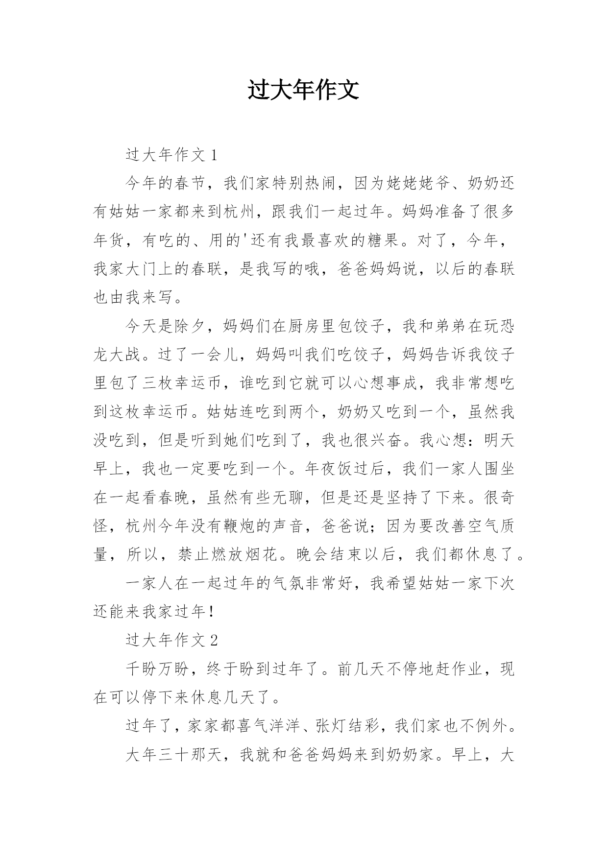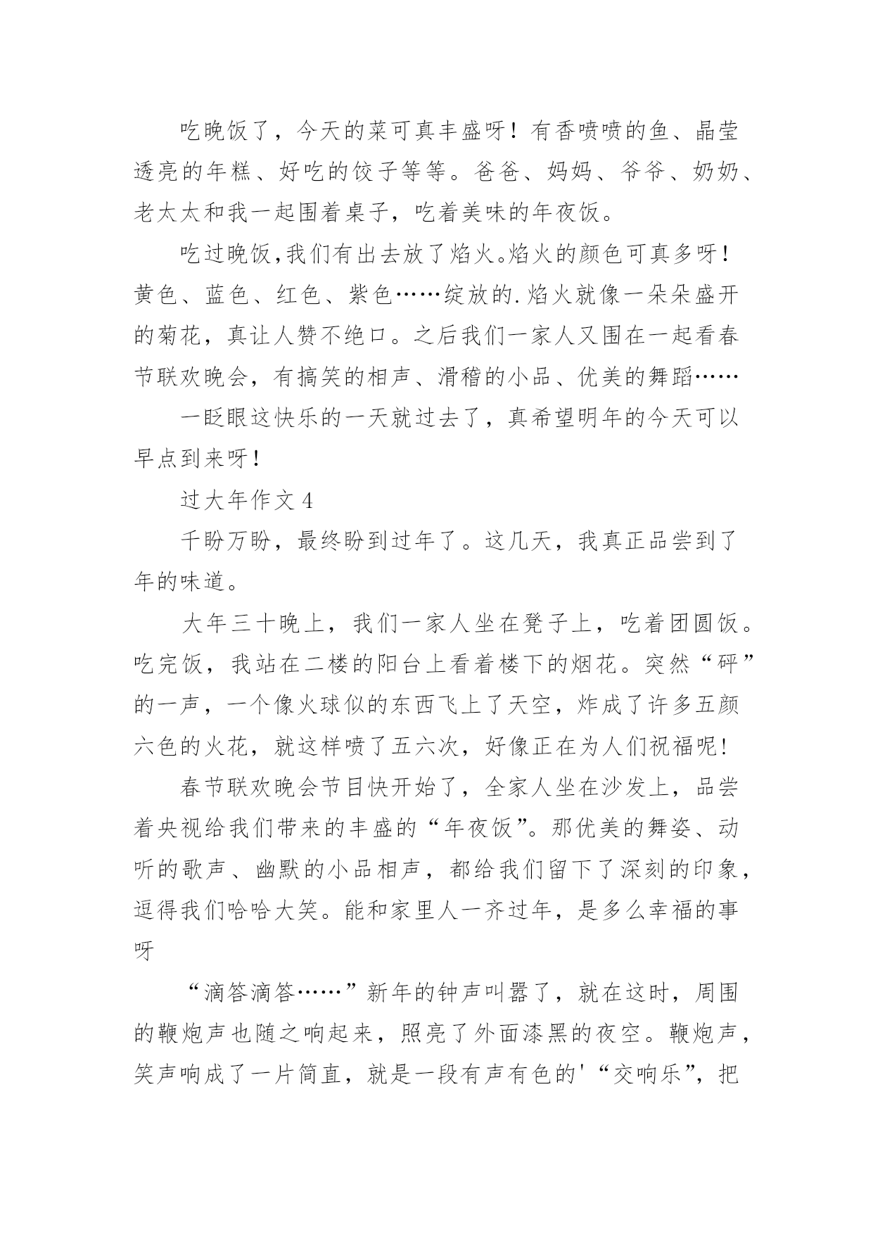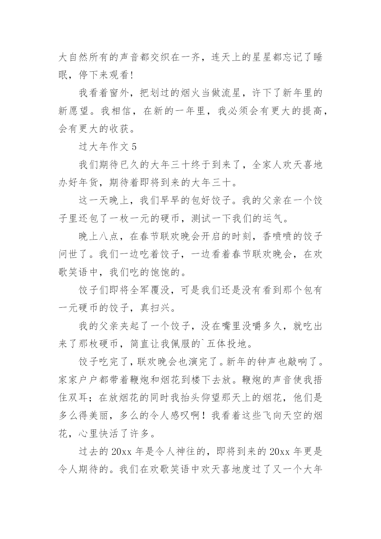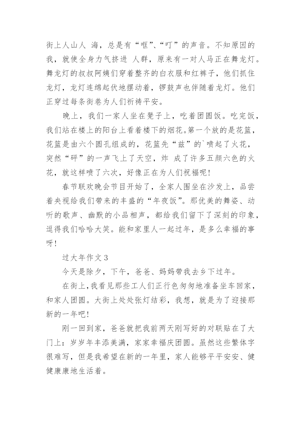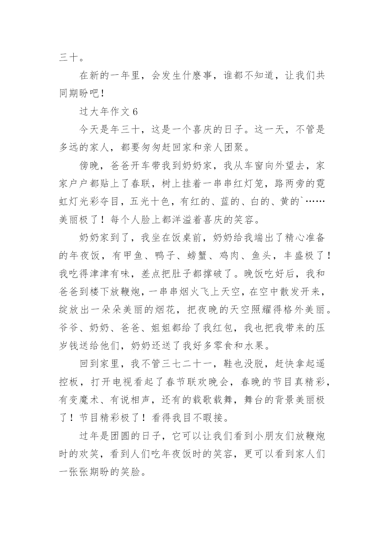 过大年作文 过大年作文1今年的春节,我们家特别热闹,因为姥姥姥爷、奶奶还有姑姑一家都来到杭州,跟我们一起过年。妈妈准备了很多年货,有吃的、用的'还有我最喜欢的糖果。对了,今年,我家大门上的春联,是我写的哦,爸爸妈妈说,以后的春联也由我来写。今天是除夕,妈妈们在厨房里包饺子,我和弟弟在玩恐龙大战。过了一会儿,妈妈叫我们吃饺子,妈妈告诉我饺子里包了三枚幸运币,谁吃到它就可以心想事成,我非常想吃到这枚幸运币。姑姑连吃到两个,奶奶又吃到一个,虽然我没吃到,但是听到她们吃到了,我也很兴奋。我心想:明天早上,我也一定要吃到一个。年夜饭过后,我们一家人围坐在一起看春晚,虽然有些无聊,但是还是坚持了下来。很奇怪,杭州今年没有鞭炮的声音,爸爸说;因为要改善空气质量,所以,禁止燃放烟花。晚会结束以后,我们都休息了。一家人在一起过年的气氛非常好,我希望姑姑一家下次还能来我家过年!过大年作文2千盼万盼,终于盼到过年了。前几天不停地赶作业,现在可以停下来休息几天了。过年了,家家都喜气洋洋、张灯结彩,我们家也不例外。大年三十那天,我就和爸爸妈妈来到奶奶家。早上,大街上人山人海,总是有“哐”、“叮”的声音。不知原因的我,就使全身力气挤进人群,原来有一对人马正在舞龙灯。舞龙灯的叔叔阿姨们穿着整齐的白衣服和红裤子,他们抓住龙灯,龙灯连绵起伏地摆动着,锣鼓声也伴随着龙灯。他们正穿过每条街巷为人们祈祷平安。晚上,我们一家人坐在凳子上,吃着团圆饭。吃完饭,我们站在楼上的阳台上看着楼下的烟花。第一个放的是花篮,花篮是由六个圆孔组成的,花篮先“兹”的`喷起了火花,突然“砰”的一声飞上了天空,炸成了许多五颜六色的火花,就这样喷了六次,好像正在为人们祝福呢!春节联欢晚会节目开始了,全家人围坐在沙发上,品尝着央视给我们带来的丰盛的“年夜饭”。那优美的舞姿、动听的歌声、幽默的小品相声,都给我们留下了深刻的印象,逗得我们哈哈大笑。能和家里人一起过年,是多么幸福的事呀!过大年作文3今天是除夕,下午,爸爸、妈妈带我去乡下过年。在街上,我看见那些工人们正行色匆匆地准备坐车回家,和家人团圆。大街上处处张灯结彩,我想,就是为了迎接那新的一年吧!刚一回到家,爸爸就把我前两天刚写好的对联贴在了大门上:岁岁年丰添美满,家家幸福庆团圆。虽然这些繁体字很难写,但是我希望在新的一年里,家人能够平平安安、健健康康地生活着。吃晚饭了,今天的菜可真丰盛呀!有香喷喷的鱼、晶莹透亮的年糕、好吃的饺子等等。爸爸、妈妈、爷爷、奶奶、老太太和我一起围着桌子,吃着美味的年夜饭。吃过晚饭,我们有出去放了焰火。焰火的颜色可真多呀!黄色、蓝色、红色、紫色……绽放的.焰火就像一朵朵盛开的菊花,真让人赞不绝口。之后我们一家人又围在一起看春节联欢晚会,有搞笑的相声、滑稽的小品、优美的舞蹈……一眨眼这快乐的一天就过去了,真希望明年的今天可以早点到来呀!过大年作文4千盼万盼,最终盼到过年了。这几天,我真正品尝到了年的味道。大年三十晚上,我们一家人坐在凳子上,吃着团圆饭。吃完饭,我站在二楼的阳台上看着楼下的烟花。突然“砰”的一声,一个像火球似的东西飞上了天空,炸成了许多五颜六色的火花,就这样喷了五六次,好像正在为人们祝福呢!春节联欢晚会节目快开始了,全家人坐在沙发上,品尝着央视给我们带来的丰盛的“年夜饭”。那优美的舞姿、动听的歌声、幽默的小品相声,都给我们留下了深刻的印象,逗得我们哈哈大笑。能和家里人一齐过年,是多么幸福的事呀“滴答滴答……”新年的钟声叫嚣了,就在这时,周围的鞭炮声也随之响起来,照亮了外面漆黑的夜空。鞭炮声,笑声响成了一片简直,就是一段有声有色的'“交响乐”,把大自然所有的声音都交织在一齐,连天上的星星都忘记了睡眠,停下来观看!我看着窗外,把划过的烟火当做流星,许下了新年里的新愿望。我相信,在新的一年里,我必须会有更大的提高,会有更大的收获。过大年作文5我们期待已久的大年三十终于到来了,全家人欢天喜地办好年货,期待着即将到来的大年三十。这一天晚上,我们早早的包好饺子。我的父亲在一个饺子里还包了一枚一元的硬币,测试一下我们的运气。晚上八点,在春节联欢晚会开启的时刻,香喷喷的饺子问世了。我们一边吃着饺子,一边看着春节联欢晚会,在欢歌笑语中,我们吃的饱饱的。饺子们即将全军覆没,可是我们还是没有看到那个包有一元硬币的饺子,真扫兴。我的父亲夹起了一个饺子,没在嘴里没嚼多久,就吃出来了那枚硬币,简直让我佩服的`五体投地。饺子吃完了,联欢晚会也演完了。新年的钟声也敲响了。家家户户都带着鞭炮和烟花到楼下去放。鞭炮的声音使我捂住双耳;在放烟花的同时我抬头仰望那天上的烟花,他们是多么得美丽,多么的令人感叹啊!我看着这些飞向天空的烟花,心里快活了许多。过去的20xx年是令人神往的,即将到来的20xx年更是令人期待的。我们在欢歌笑语中欢天喜地