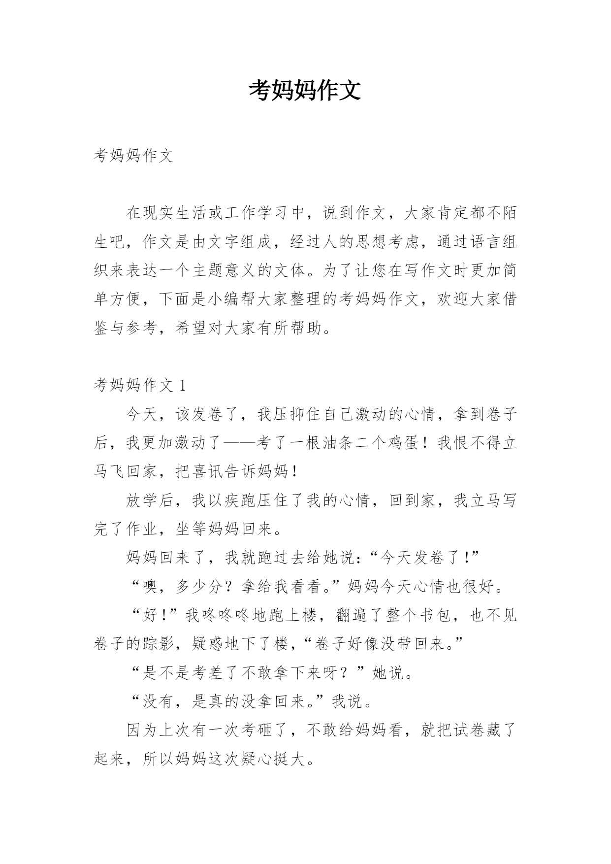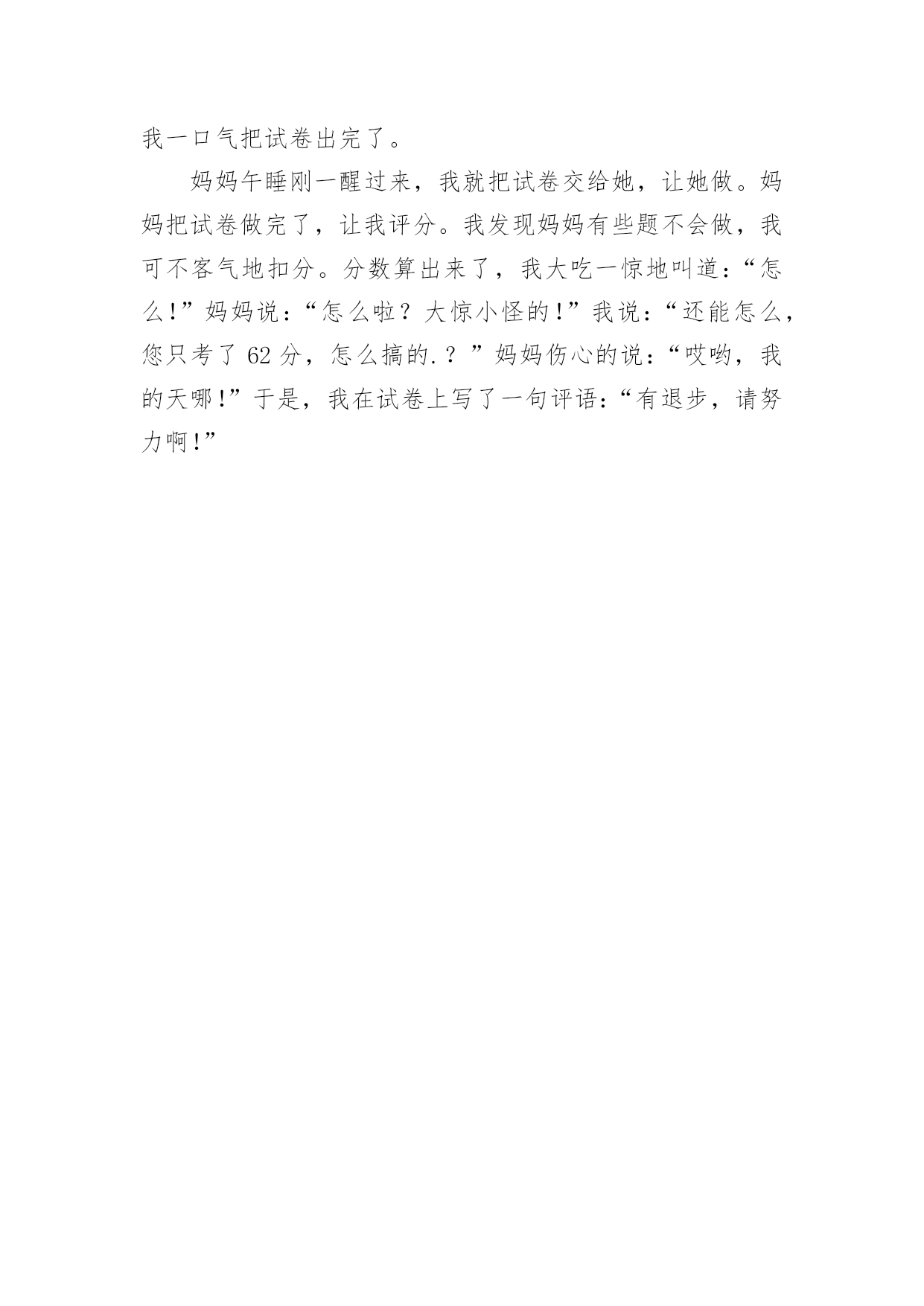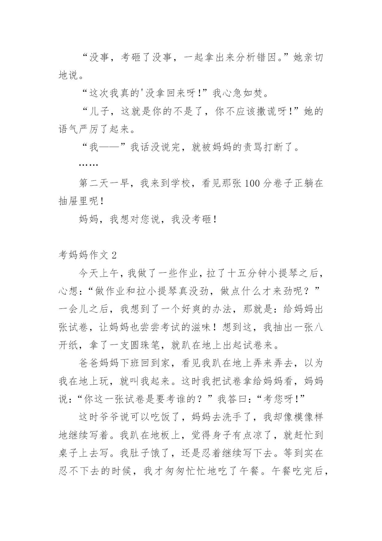 考妈妈作文 考妈妈作文在现实生活或工作学习中,说到作文,大家肯定都不陌生吧,作文是由文字组成,经过人的思想考虑,通过语言组织来表达一个主题意义的文体。为了让您在写作文时更加简单方便,下面是小编帮大家整理的考妈妈作文,欢迎大家借鉴与参考,希望对大家有所帮助。考妈妈作文1今天,该发卷了,我压抑住自己激动的心情,拿到卷子后,我更加激动了——考了一根油条二个鸡蛋!我恨不得立马飞回家,把喜讯告诉妈妈!放学后,我以疾跑压住了我的心情,回到家,我立马写完了作业,坐等妈妈回来。妈妈回来了,我就跑过去给她说:“今天发卷了!”“噢,多少分?拿给我看看。”妈妈今天心情也很好。“好!”我咚咚咚地跑上楼,翻遍了整个书包,也不见卷子的踪影,疑惑地下了楼,“卷子好像没带回来。”“是不是考差了不敢拿下来呀?”她说。“没有,是真的没拿回来。”我说。因为上次有一次考砸了,不敢给妈妈看,就把试卷藏了起来,所以妈妈这次疑心挺大。“没事,考砸了没事,一起拿出来分析错因。”她亲切地说。“这次我真的'没拿回来呀!”我心急如焚。“儿子,这就是你的不是了,你不应该撒谎呀!”她的语气严厉了起来。“我——”我话没说完,就被妈妈的责骂打断了。……第二天一早,我来到学校,看见那张100分卷子正躺在抽屉里呢!妈妈,我想对您说,我没考砸!考妈妈作文2今天上午,我做了一些作业,拉了十五分钟小提琴之后,心想:“做作业和拉小提琴真没劲,做点什么才来劲呢?”一会儿之后,我想到了一个好爽的办法,那就是:给妈妈出张试卷,让妈妈也尝尝考试的滋味!想到这,我抽出一张八开纸,拿了一支圆珠笔,就趴在地上出起试卷来。爸爸妈妈下班回到家,看见我趴在地上弄来弄去,以为我在地上玩,就叫我起来。这时我把试卷拿给妈妈看,妈妈说:“你这一张试卷是要考谁的?”我答曰:“考您呀!”这时爷爷说可以吃饭了,妈妈去洗手了,我却像模像样地继续写着。我趴在地板上,觉得身子有点凉了,就赶忙到桌子上去写。我肚子饿了,还是忍着继续写下去。等到实在忍不下去的时候,我才匆匆忙忙地吃了午餐。午餐吃完后,我一口气把试卷出完了。妈妈午睡刚一醒过来,我就把试卷交给她,让她做。妈妈把试卷做完了,让我评分。我发现妈妈有些题不会做,我可不客气地扣分。分数算出来了,我大吃一惊地叫道:“怎么!”妈妈说:“怎么啦?大惊小怪的!”我说:“还能怎么,您只考了62分,怎么搞的.?”妈妈伤心的说:“哎哟,我的天哪!”于是,我在试卷上写了一句评语:“有退步,请努力啊!”