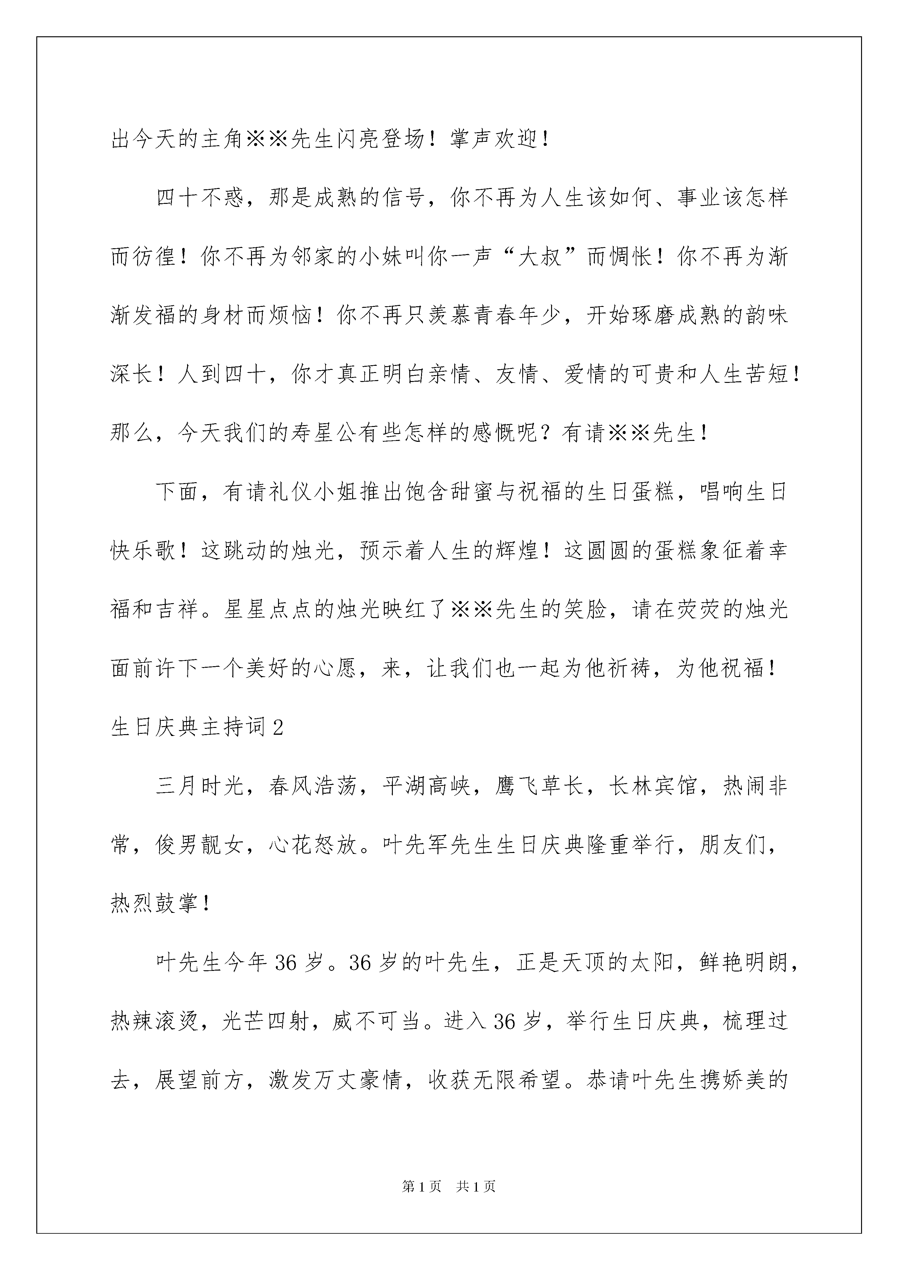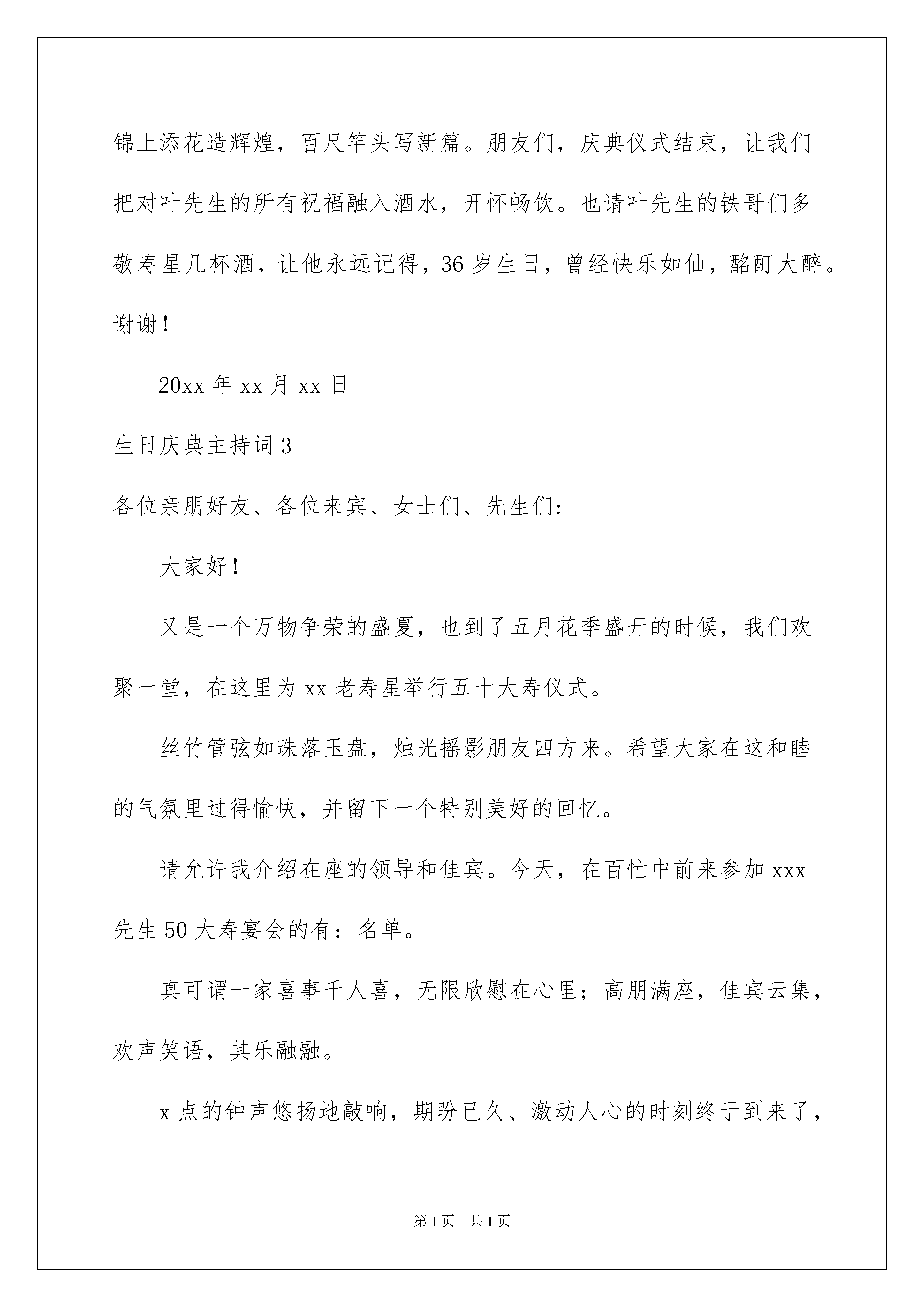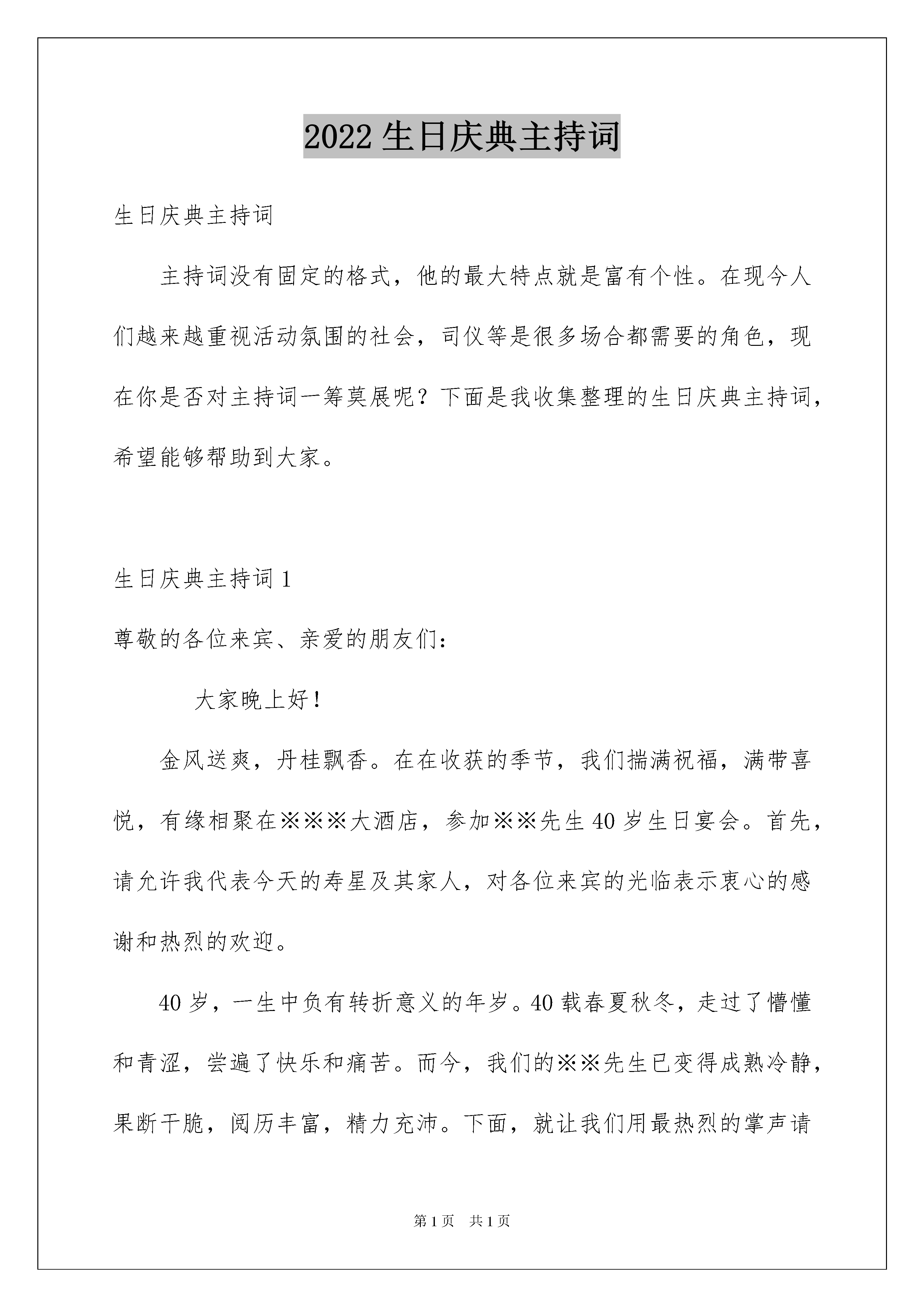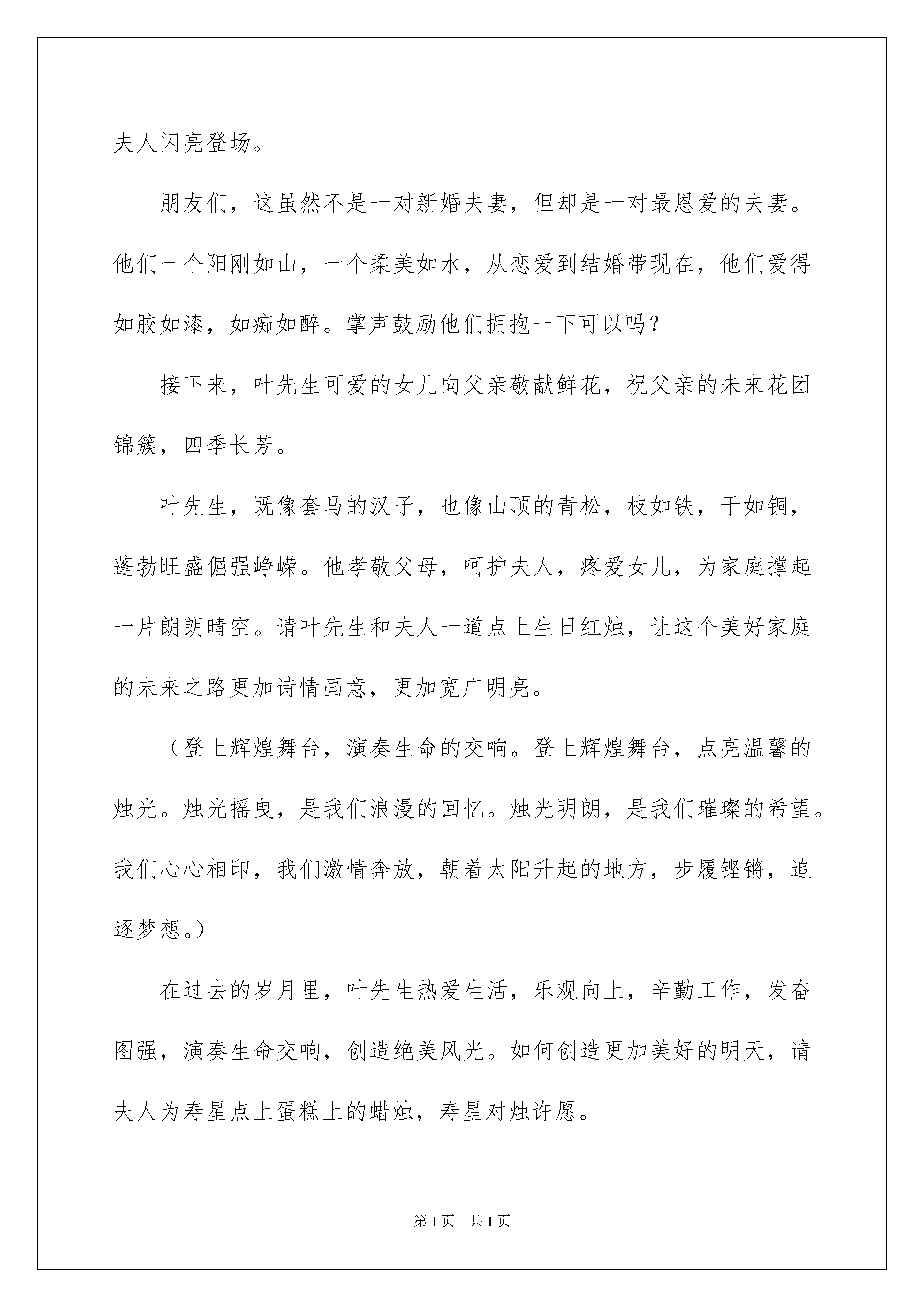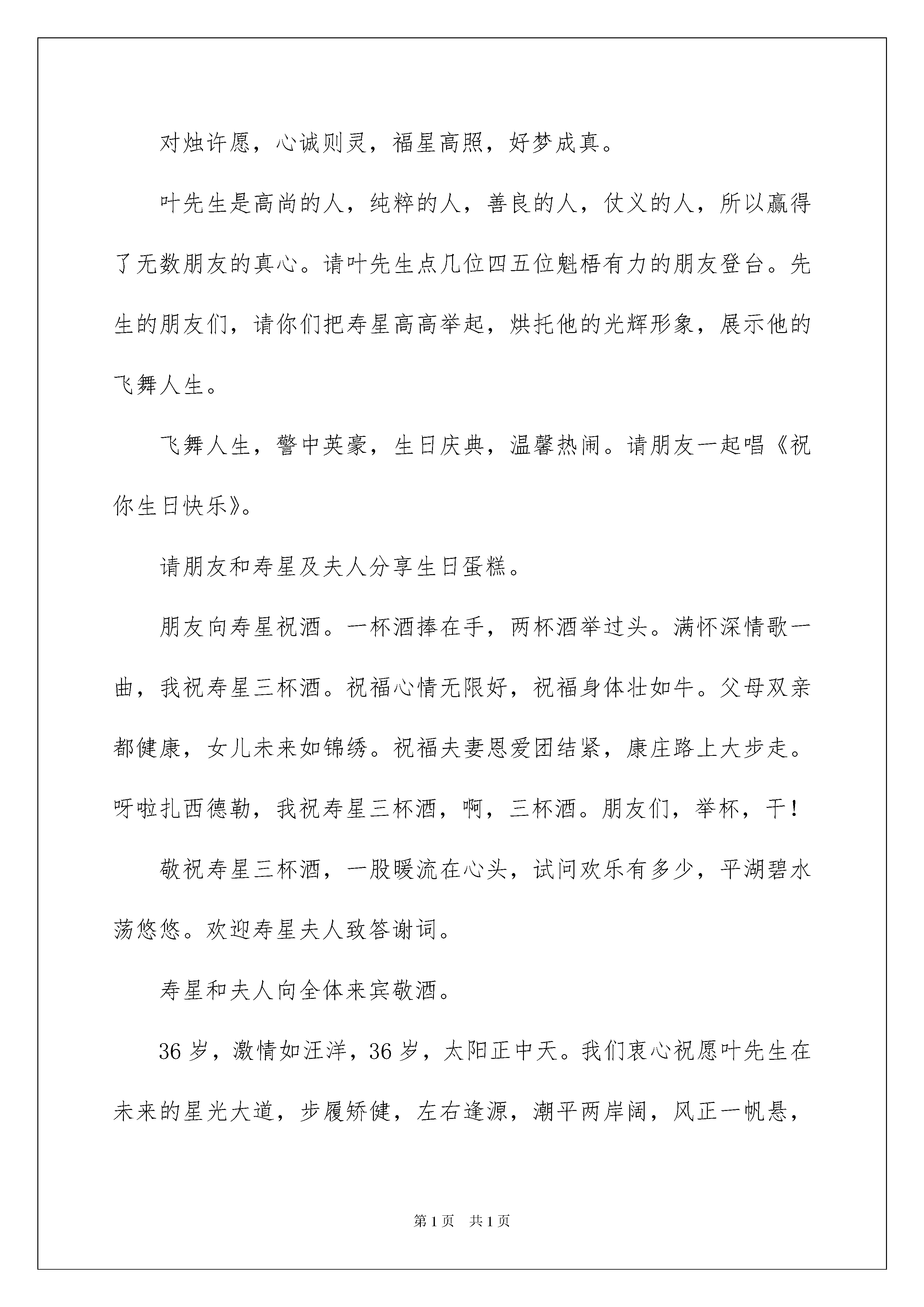 2022生日庆典主持词生日庆典主持词主持词没有固定的格式,他的最大特点就是富有个性。在现今人们越来越重视活动氛围的社会,司仪等是很多场合都需要的角色,现在你是否对主持词一筹莫展呢?下面是我收集整理的生日庆典主持词,希望能够帮助到大家。生日庆典主持词1尊敬的各位来宾、亲爱的朋友们:大家晚上好!金风送爽,丹桂飘香。在在收获的季节,我们揣满祝福,满带喜悦,有缘相聚在※※※大酒店,参加※※先生40岁生日宴会。首先,请允许我代表今天的寿星及其家人,对各位来宾的光临表示衷心的感谢和热烈的欢迎。40岁,一生中负有转折意义的年岁。40载春夏秋冬,走过了懵懂和青涩,尝遍了快乐和痛苦。而今,我们的※※先生已变得成熟冷静,果断干脆,阅历丰富,精力充沛。下面,就让我们用最热烈的掌声请出今天的主角※※先生闪亮登场!掌声欢迎!四十不惑,那是成熟的信号,你不再为人生该如何、事业该怎样而彷徨!你不再为邻家的小妹叫你一声“大叔”而惆怅!你不再为渐渐发福的身材而烦恼!你不再只羡慕青春年少,开始琢磨成熟的韵味深长!人到四十,你才真正明白亲情、友情、爱情的可贵和人生苦短!那么,今天我们的寿星公有些怎样的感慨呢?有请※※先生!下面,有请礼仪小姐推出饱含甜蜜与祝福的生日蛋糕,唱响生日快乐歌!这跳动的烛光,预示着人生的辉煌!这圆圆的蛋糕象征着幸福和吉祥。星星点点的烛光映红了※※先生的笑脸,请在荧荧的烛光面前许下一个美好的心愿,来,让我们也一起为他祈祷,为他祝福!生日庆典主持词2三月时光,春风浩荡,平湖高峡,鹰飞草长,长林宾馆,热闹非常,俊男靓女,心花怒放。叶先军先生生日庆典隆重举行,朋友们,热烈鼓掌!叶先生今年36岁。36岁的叶先生,正是天顶的太阳,鲜艳明朗,热辣滚烫,光芒四射,威不可当。进入36岁,举行生日庆典,梳理过去,展望前方,激发万丈豪情,收获无限希望。恭请叶先生携娇美的夫人闪亮登场。朋友们,这虽然不是一对新婚夫妻,但却是一对最恩爱的夫妻。他们一个阳刚如山,一个柔美如水,从恋爱到结婚带现在,他们爱得如胶如漆,如痴如醉。掌声鼓励他们拥抱一下可以吗?接下来,叶先生可爱的女儿向父亲敬献鲜花,祝父亲的未来花团锦簇,四季长芳。叶先生,既像套马的汉子,也像山顶的青松,枝如铁,干如铜,蓬勃旺盛倔强峥嵘。他孝敬父母,呵护夫人,疼爱女儿,为家庭撑起一片朗朗晴空。请叶先生和夫人一道点上生日红烛,让这个美好家庭的未来之路更加诗情画意,更加宽广明亮。(登上辉煌舞台,演奏生命的交响。登上辉煌舞台,点亮温馨的烛光。烛光摇曳,是我们浪漫的回忆。烛光明朗,是我们璀璨的希望。我们心心相印,我们激情奔放,朝着太阳升起的地方,步履铿锵,追逐梦想。)在过去的岁月里,叶先生热爱生活,乐观向上,辛勤工作,发奋图强,演奏生命交响,创造绝美风光。如何创造更加美好的明天,请夫人为寿星点上蛋糕上的蜡烛,寿星对烛许愿。对烛许愿,心诚则灵,福星高照,好梦成真。叶先生是高尚的人,纯粹的人,善良的人,仗义的人,所以赢得了无数朋友的真心。请叶先生点几位四五位魁梧有力的朋友登台。先生的朋友们,请你们把寿星高高举起,烘托他的光辉形象,展示他的飞舞人生。飞舞人生,警中英豪,生日庆典,温馨热闹。请朋友一起唱《祝你生日快乐》。请朋友和寿星及夫人分享生日蛋糕。朋友向寿星祝酒。一杯酒捧在手,两杯酒举过头。满怀深情歌一曲,我祝寿星三杯酒。祝福心情无限好,祝福身体壮如牛。父母双亲都健康,女儿未来如锦绣。祝福夫妻恩爱团结紧,康庄路上大步走。呀啦扎西德勒,我祝寿星三杯酒,啊,三杯酒。朋友们,举杯,干!敬祝寿星三杯酒,一股暖流在心头,试问欢乐有多少,平湖碧水荡悠悠。欢迎寿星夫人致答谢词。寿星和夫人向全体来宾敬酒。36岁,激情如汪洋,36岁,太阳正中天。我们衷心祝愿叶先生在未来的星光大道,步履矫健,左右逢源,潮平两岸阔,风正一帆悬,锦上添花造辉煌,百尺竿头写新篇。朋友们,庆典仪式结束,让我们把对叶先生的所有祝福融入酒水,开怀畅饮。也请叶先生的铁哥们多敬寿星几杯酒,让他永远记得,36岁生日,曾经快乐如仙,酩酊大醉。谢谢!20xx年xx月xx日生日庆典主持词3各位亲朋好友、各位来宾、女士们、先生们:大家好!又是一个万物争荣的盛夏,也到了五月花季盛开的时候,我们欢聚一堂,在这里为xx老寿星举行五十大寿仪式。丝竹管弦如珠落玉盘,烛光摇影朋友四方来。希望大家在这和睦的气氛里过得愉快,并留下一个特别美好的回忆。请允许我介绍在座的领导和佳宾。今天,在百忙中前来参加xxx先生50大寿宴会的有:名单。真可谓一家喜事千人喜,无限欣慰在心里;高朋满座,佳宾云集,欢声笑语,其乐融融。x点的钟声悠扬地敲响,期盼已久、激动