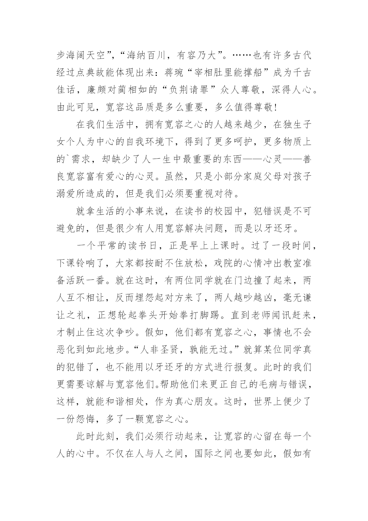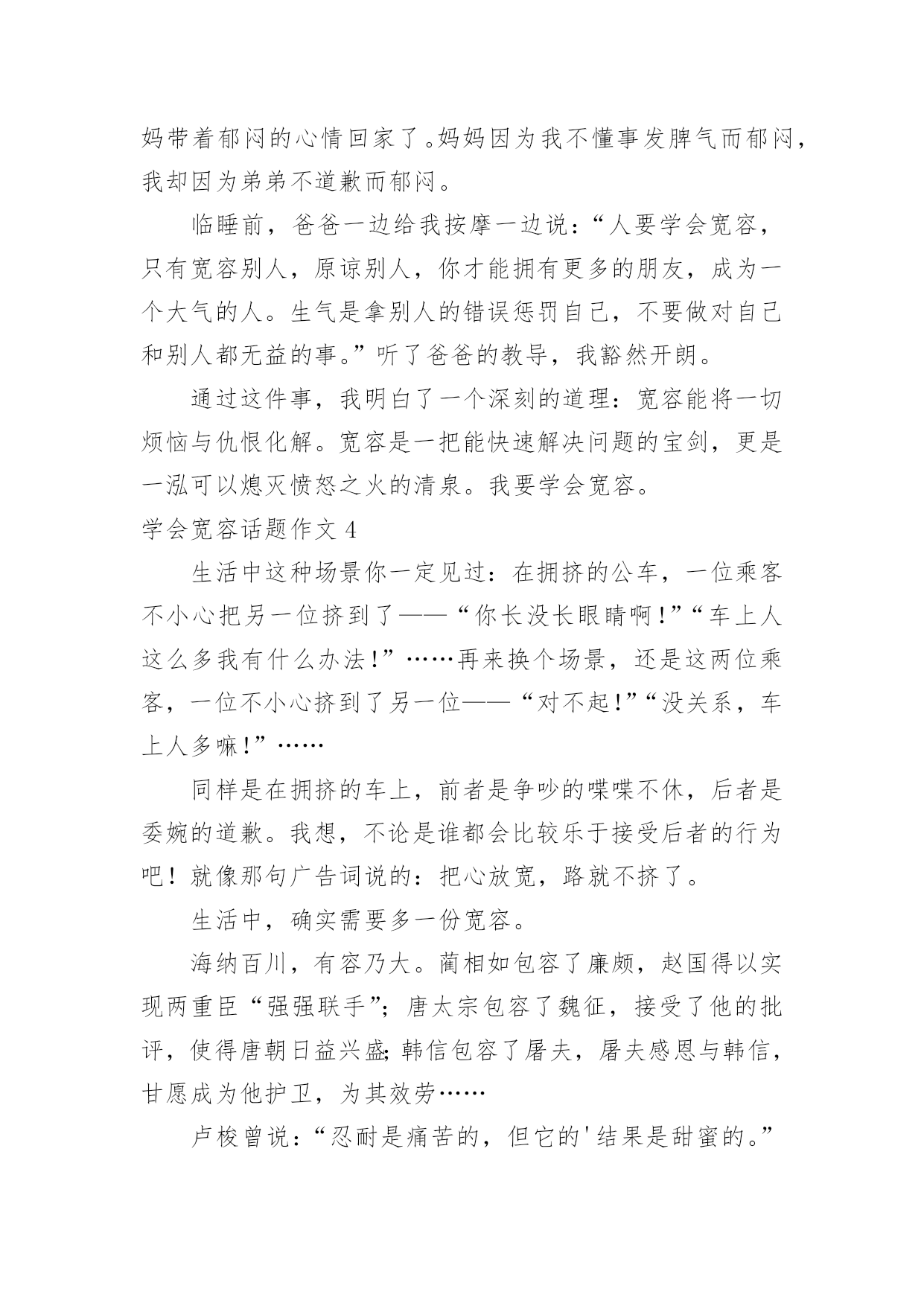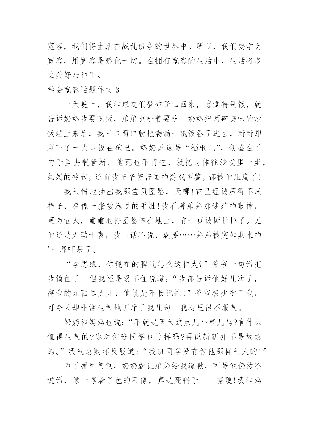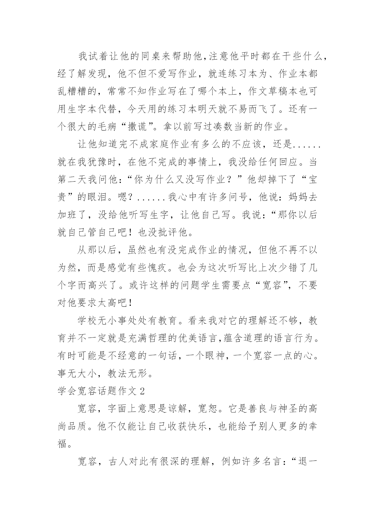学会宽容话题作文 学会宽容话题作文(集锦6篇)在学习、工作或生活中,大家都经常接触到作文吧,根据写作命题的特点,作文可以分为命题作文和非命题作文。怎么写作文才能避免踩雷呢?以下是小编整理的学会宽容话题作文,仅供参考,欢迎大家阅读。学会宽容话题作文1学校无小事,处处有教育。一个简单的道理,看似平凡的话,但却意味无穷。的确是这样,教师的一言一行都影响着学生,因此在教学中我处处留心,争取做好榜样的力量。可有一句话是这么说的:事与愿违。只考虑了自身的问题,却忽略了学生是不是愿意和你这个“榜样”*拢。我的.班级中有这样一个学生,他是个男生,脑袋聪明的很,脾气也怪的很。上课时他能积极发言,动脑思考,往往一些难理解的问题,他总最先明白。可却有着至命的弱点,不爱写作业,无论是家庭作业,还是课堂作业,一概不写。看的紧点或许能跟上,只要稍一疏忽他更要逃过“此劫”。为了让他改掉这个毛病,我采取了很多方法,软硬皆施,恩威并用,可还是不凑效。很苦恼,努力做到处处留心,想办法让这个问题学生变好,可却发现他不愿和你*拢,为什么呢?我试着让他的同桌来帮助他,注意他平时都在干些什么,经了解发现,他不但不爱写作业,就连练习本为、作业本都乱糟糟的,常常不知作业写在了哪个本上,作文草稿本也可用生字本代替,今天用的练习本明天就不易而飞了。还有一个很大的毛病“撒谎”。拿以前写过凑数当新的作业。让他知道完不成家庭作业有多么的不应该,还是......就在我犹豫时,在他不完成的事情上,我没给任何回应。当第二天我问他:“你为什么又没写作业?”他却掉下了“宝贵”的眼泪。嗯?......我心中有许多问号,他说:妈妈去加班了,没给他听写生字,让他自己写。我说:“那你以后就自己管自己吧!也没批评他。从那以后,虽然也有没完成作业的情况,但他不再不以为然,而是感觉有些愧疚。也会为这次听写比上次少错了几个字而高兴了。或许这样的问题学生需要点“宽容”,不要对他要求太高吧!学校无小事处处有教育。看来我对它的理解还不够,教育并不一定就是充满哲理的优美语言,蕴含道理的语言行为。有时可能是不经意的一句话,一个眼神,一个宽容一点的心。事无大小,教法无形。学会宽容话题作文2宽容,字面上意思是谅解,宽恕。它是善良与神圣的高尚品质。他不仅能让自己收获快乐,也能给予别人更多的幸福。宽容,古人对此有很深的理解,例如许多名言:“退一步海阔天空”,“海纳百川,有容乃大”。……也有许多古代经过点典故能体现出来:蒋琬“宰相肚里能撑船”成为千古佳话,廉颇对蔺相如的“负荆请罪”众人尊敬,深得人心。由此可见,宽容这品质是多么重要,多么值得尊敬!在我们生活中,拥有宽容之心的人越来越少,在独生子女个人为中心的自我环境下,得到了更多呵护,更多物质上的`需求,却缺少了人一生中最重要的东西——心灵——善良宽容富有爱心的心灵。虽然,只是小部分家庭父母对孩子溺爱所造成的,但是我们必须要重视对待。就拿生活的小事来说,在读书的校园中,犯错误是不可避免的,但是很少有人用宽容解决问题,而是以牙还牙。一个平常的读书日,正是早上上课时。过了一段时间,下课铃响了,大家都按耐不住放松,戏院的心情冲出教室准备活跃一番。就在这时,有两位同学就在门边撞了起来,两人互不相让,反而埋怨起对方来了,两人越吵越凶,毫无谦让之礼,正想轮起拳头开始拳打脚踢。直到老师闻讯赶来,才制止住这次争吵。假如,他们都有宽容之心,事情也不会恶化到如此地步。“人非圣贤,孰能无过。”就算某位同学真的犯错了,也不能用以牙还牙的方式进行报复。此时的我们更需要谅解与宽容他们。帮助他们来更正自己的毛病与错误,这样,就能和谐相处,作为真心朋友。这时,世界上便少了一份怨悔,多了一颗宽容之心。此时此刻,我们必须行动起来,让宽容的心留在每一个人的心中。不仅在人与人之间,国际之间也要如此,假如有宽容,我们将生活在战乱纷争的世界中。所以,我们要学会宽容,用宽容是感化一切。在拥有宽容的生活中,生活将多么美好与和平。学会宽容话题作文3一天晚上,我和球友们登砬子山回来,感觉特别饿,就告诉奶奶我要吃饭,弟弟也吵着要吃。奶奶把两碗美味的炒饭端上来后,我三口两口就把满满一碗饭吞了进去,新新却剩下了一大口饭在碗里。奶奶说这是“福根儿”,便盛在了勺子里去喂新新。他死也不肯吃,就把身体往沙发里一坐,妈妈的拎包,还有我辛辛苦苦画的游戏图鉴,都被他压扁了!我气愤地抽出我那宝贝图鉴,天哪!它已经被压得不成样子,极像一张被泡过的毛肚!我看着弟弟那迷茫的眼神,更为恼火,重重地将图鉴摔在地上,有一页被撕扯掉了。见他还是无动于衷,我二话不说,就要……弟弟被突如其来的'一幕吓呆了。“李思缘,你现在的脾气怎么这样大?”爷爷一句话把我镇住了。但我还是忍不住说道:“我都告诉他好几次了,离我的东西远点儿,他就是不长记性!”爷爷极少批评我,可今天却非常
