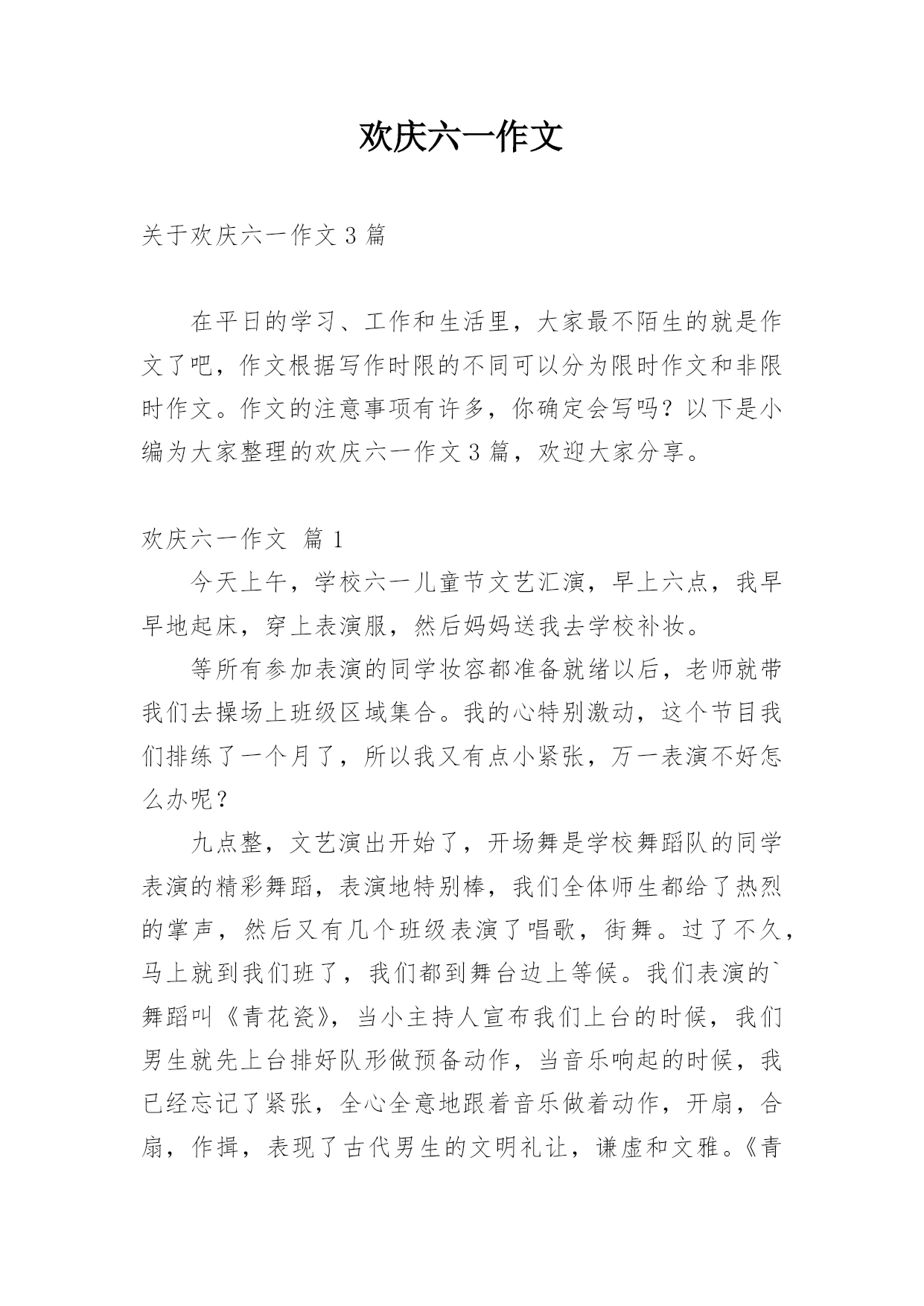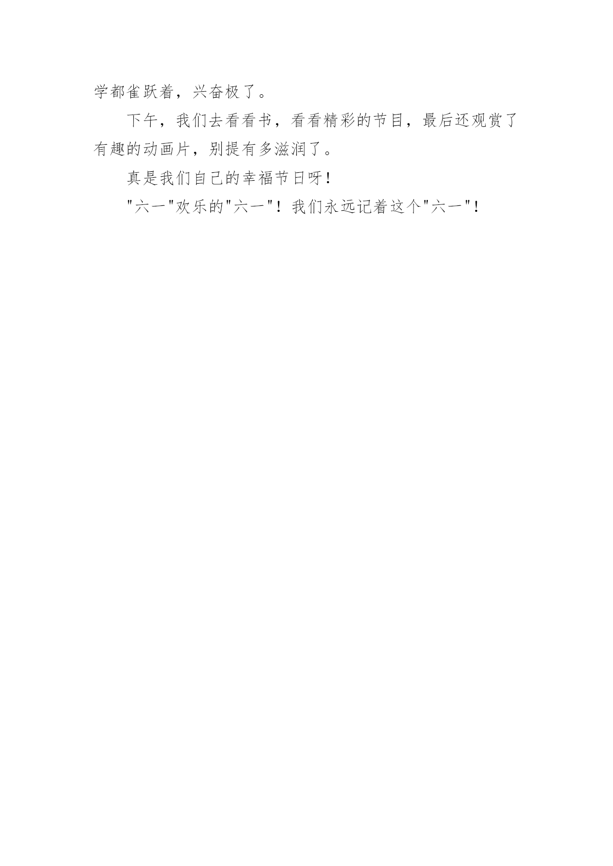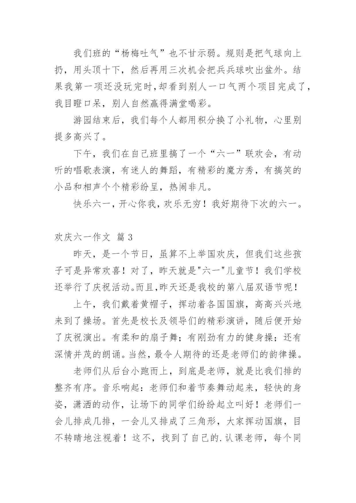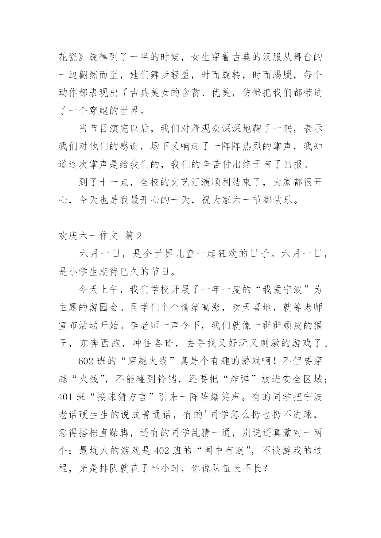 欢庆六一作文 关于欢庆六一作文3篇在平日的学习、工作和生活里,大家最不陌生的就是作文了吧,作文根据写作时限的不同可以分为限时作文和非限时作文。作文的注意事项有许多,你确定会写吗?以下是小编为大家整理的欢庆六一作文3篇,欢迎大家分享。欢庆六一作文篇1今天上午,学校六一儿童节文艺汇演,早上六点,我早早地起床,穿上表演服,然后妈妈送我去学校补妆。等所有参加表演的同学妆容都准备就绪以后,老师就带我们去操场上班级区域集合。我的心特别激动,这个节目我们排练了一个月了,所以我又有点小紧张,万一表演不好怎么办呢?九点整,文艺演出开始了,开场舞是学校舞蹈队的同学表演的精彩舞蹈,表演地特别棒,我们全体师生都给了热烈的掌声,然后又有几个班级表演了唱歌,街舞。过了不久,马上就到我们班了,我们都到舞台边上等候。我们表演的`舞蹈叫《青花瓷》,当小主持人宣布我们上台的时候,我们男生就先上台排好队形做预备动作,当音乐响起的时候,我已经忘记了紧张,全心全意地跟着音乐做着动作,开扇,合扇,作揖,表现了古代男生的文明礼让,谦虚和文雅。《青花瓷》旋律到了一半的时候,女生穿着古典的汉服从舞台的一边翩然而至,她们舞步轻盈,时而旋转,时而踢腿,每个动作都表现出了古典美女的含蓄、优美,仿佛把我们都带进了一个穿越的世界。当节目演完以后,我们对着观众深深地鞠了一躬,表示我们对他们的感谢,场下又响起了一阵阵热烈的掌声,我知道这次掌声是给我们的,我们的辛苦付出终于有了回报。到了十一点,全校的文艺汇演顺利结束了,大家都很开心,今天也是我最开心的一天,祝大家六一节都快乐。欢庆六一作文篇2六月一日,是全世界儿童一起狂欢的日子。六月一日,是小学生期待已久的节日。今天上午,我们学校开展了一年一度的“我爱宁波”为主题的游园会。同学们个个情绪高涨,欢天喜地,就等老师宣布活动开始。李老师一声令下,我们就像一群群顽皮的猴子,东奔西跑,冲往各班,去寻找又好玩又刺激的游戏了。602班的“穿越火线”真是个有趣的游戏啊!不但要穿越“火线”,不能碰到铃铛,还要把“炸弹”放进安全区域;401班“接球猜方言”引来一阵阵爆笑声。有的同学把宁波老话硬生生的说成普通话,有的'同学怎么扔也扔不进球,急得搭档直跺脚,还有的同学乱猜一通,别说还真蒙对一两个;最坑人的游戏是402班的“阁中有谜”,不谈游戏的过程,光是排队就花了半小时,你说队伍长不长?我们班的“杨梅吐气”也不甘示弱。规则是把气球向上扔,用头顶十下,然后再用三次机会把兵兵球吹出盆外。结果我第一项还没玩完时,却看到别人一口气两个项目完成了,我目瞪口呆,别人自然赢得满堂喝彩。游园结束后,我们每个人都用积分换了小礼物,心里别提多高兴了。下午,我们在自己班里搞了一个“六一”联欢会,有动听的唱歌表演,有迷人的舞蹈,有精彩的魔方秀,有搞笑的小品和相声个个精彩纷呈,热闹非凡。快乐六一,开心你我,欢乐无穷!我好期待下次的六一。欢庆六一作文篇3昨天,是一个节日,虽算不上举国欢庆,但我们这些孩子可是异常欢喜!对了,昨天就是"六一"儿童节!我们学校还举行了庆祝活动。而且,昨天还是我校的第八届双语节呢!上午,我们戴着黄帽子,挥动着各国国旗,高高兴兴地来到了操场。首先是校长及领导们的精彩演讲,随后便开始了庆祝演出。有柔和的扇子舞;有刚劲有力的健身操;还有深情并茂的朗诵。当然,最令人期待的还是老师们的韵律操。老师们从后台小跑而上,到底是老师,就是比我们排的整齐有序。音乐响起:老师们和着节奏舞动起来,轻快的身姿,潇洒的动作,让场下的同学们纷纷起立叫好!老师们一会儿排成几排,一会儿又排成了三角形,大家挥动国旗,目不转睛地注视着!这不,找到了自己的.认课老师,每个同学都雀跃着,兴奋极了。下午,我们去看看书,看看精彩的节目,最后还观赏了有趣的动画片,别提有多滋润了。真是我们自己的幸福节日呀!"六一"欢乐的"六一"!我们永远记着这个"六一"!