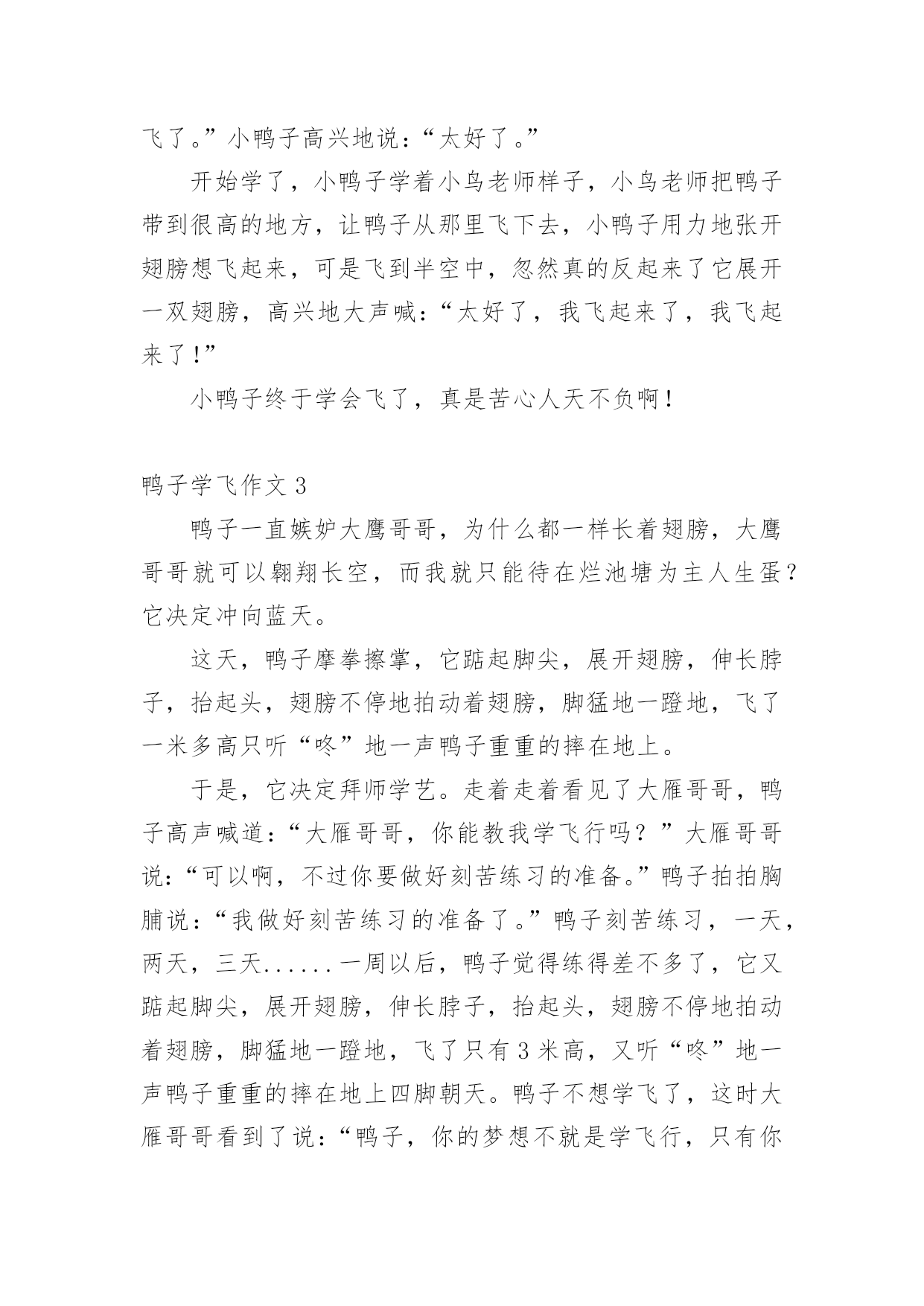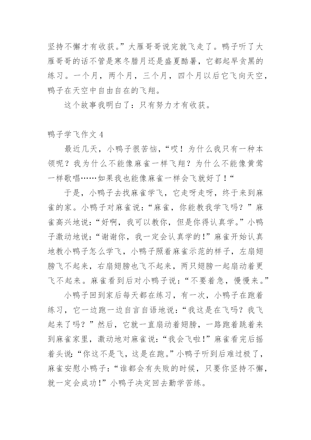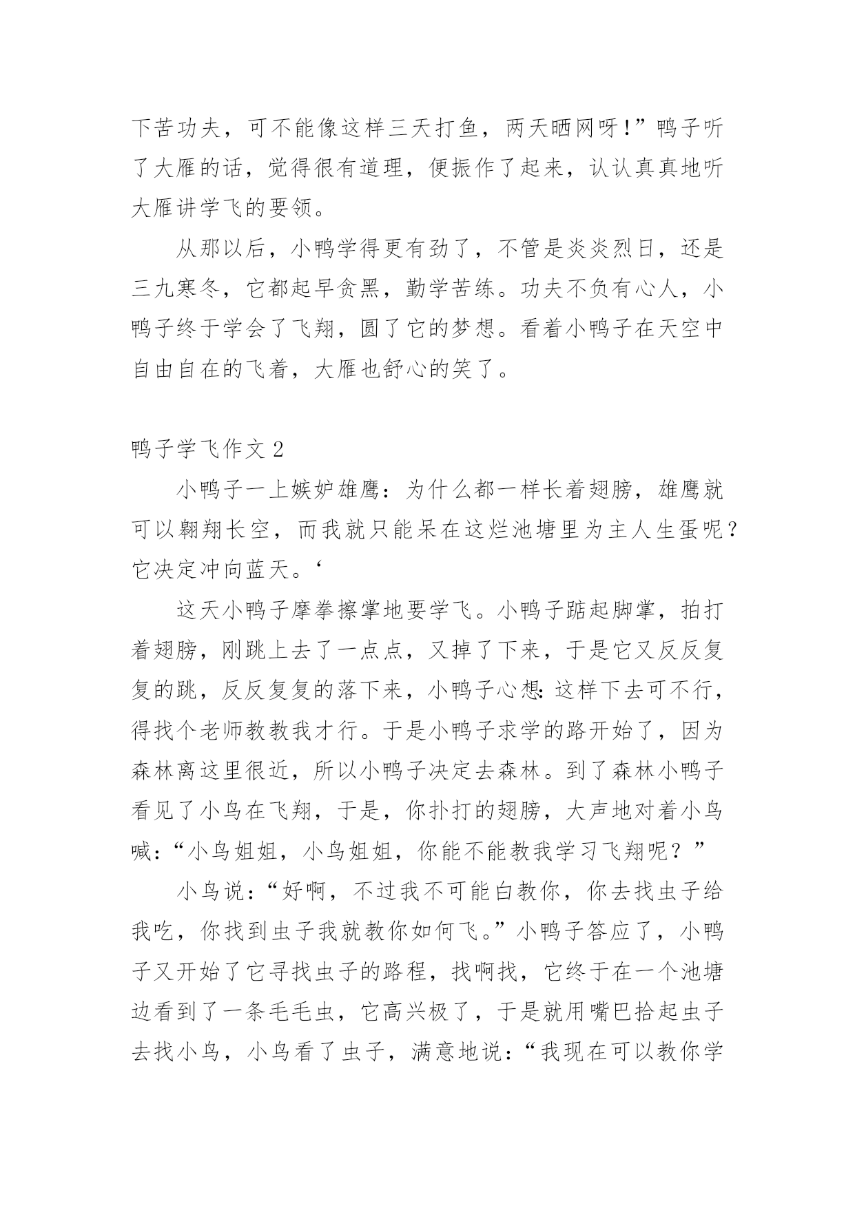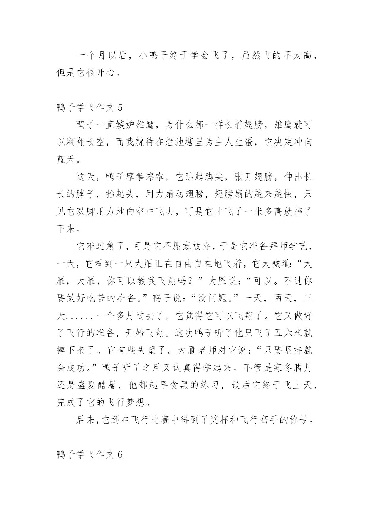 鸭子学飞作文 鸭子学飞作文(10篇)在平凡的学习、工作、生活中,大家都写过作文,肯定对各类作文都很熟悉吧,作文是由文字组成,经过人的思想考虑,通过语言组织来表达一个主题意义的文体。相信很多朋友都对写作文感到非常苦恼吧,下面是小编整理的鸭子学飞作文,希望对大家有所帮助。鸭子学飞作文1一只鸭子渴望在天空中翱翔,几乎天天想,夜夜想.终于有一天,鸭子有幸认识了飞翔冠军___大雁.它想:既然大雁是赫赫有名的飞翔冠军,那为何不让它教我学飞呢!于是它便暗暗拿定了注意,主动向大雁打招呼说:“大雁哥哥,你能教我学飞吗?”“当然可以了,但我提前告诉,学飞可是一件若差,必须要勤学苦练,而不能马马虎虎。”大雁说。“放心吧,会的。”从此,小鸭起早贪黑,整天累得满头大汗,筋疲力尽。一天,大雁让小鸭试试看能不能飞起来,没想到小鸭还飞不到一米高,并且重重地摔了个四脚朝天,小鸭捂着发疼的屁股号陶大哭起来。小鸭实在不想学了。这天,大雁教它学飞的要领,问它知道了没有,小鸭不耐烦的说:“知道了。”大雁听了语重心长的说:“小鸭子,学飞可不能半途而废,要下苦功夫,可不能像这样三天打鱼,两天晒网呀!”鸭子听了大雁的话,觉得很有道理,便振作了起来,认认真真地听大雁讲学飞的要领。从那以后,小鸭学得更有劲了,不管是炎炎烈日,还是三九寒冬,它都起早贪黑,勤学苦练。功夫不负有心人,小鸭子终于学会了飞翔,圆了它的梦想。看着小鸭子在天空中自由自在的飞着,大雁也舒心的笑了。鸭子学飞作文2小鸭子一上嫉妒雄鹰:为什么都一样长着翅膀,雄鹰就可以翱翔长空,而我就只能呆在这烂池塘里为主人生蛋呢?它决定冲向蓝天。‘这天小鸭子摩拳擦掌地要学飞。小鸭子踮起脚掌,拍打着翅膀,刚跳上去了一点点,又掉了下来,于是它又反反复复的跳,反反复复的落下来,小鸭子心想:这样下去可不行,得找个老师教教我才行。于是小鸭子求学的路开始了,因为森林离这里很近,所以小鸭子决定去森林。到了森林小鸭子看见了小鸟在飞翔,于是,你扑打的翅膀,大声地对着小鸟喊:“小鸟姐姐,小鸟姐姐,你能不能教我学习飞翔呢?”小鸟说:“好啊,不过我不可能白教你,你去找虫子给我吃,你找到虫子我就教你如何飞。”小鸭子答应了,小鸭子又开始了它寻找虫子的路程,找啊找,它终于在一个池塘边看到了一条毛毛虫,它高兴极了,于是就用嘴巴拾起虫子去找小鸟,小鸟看了虫子,满意地说:“我现在可以教你学飞了。”小鸭子高兴地说:“太好了。”开始学了,小鸭子学着小鸟老师样子,小鸟老师把鸭子带到很高的地方,让鸭子从那里飞下去,小鸭子用力地张开翅膀想飞起来,可是飞到半空中,忽然真的反起来了它展开一双翅膀,高兴地大声喊:“太好了,我飞起来了,我飞起来了!”小鸭子终于学会飞了,真是苦心人天不负啊!鸭子学飞作文3鸭子一直嫉妒大鹰哥哥,为什么都一样长着翅膀,大鹰哥哥就可以翱翔长空,而我就只能待在烂池塘为主人生蛋?它决定冲向蓝天。这天,鸭子摩拳擦掌,它踮起脚尖,展开翅膀,伸长脖子,抬起头,翅膀不停地拍动着翅膀,脚猛地一蹬地,飞了一米多高只听“咚”地一声鸭子重重的摔在地上。于是,它决定拜师学艺。走着走着看见了大雁哥哥,鸭子高声喊道:“大雁哥哥,你能教我学飞行吗?”大雁哥哥说:“可以啊,不过你要做好刻苦练习的准备。”鸭子拍拍胸脯说:“我做好刻苦练习的准备了。”鸭子刻苦练习,一天,两天,三天......一周以后,鸭子觉得练得差不多了,它又踮起脚尖,展开翅膀,伸长脖子,抬起头,翅膀不停地拍动着翅膀,脚猛地一蹬地,飞了只有3米高,又听“咚”地一声鸭子重重的摔在地上四脚朝天。鸭子不想学飞了,这时大雁哥哥看到了说:“鸭子,你的梦想不就是学飞行,只有你坚持不懈才有收获。”大雁哥哥说完就飞走了。鸭子听了大雁哥哥的话不管是寒冬腊月还是盛夏酷暑,它都起早贪黑的练习。一个月,两个月,三个月,四个月以后它飞向天空,鸭子在天空中自由自在的飞翔。这个故事我明白了:只有努力才有收获。鸭子学飞作文4最近几天,小鸭子很苦恼,“哎!为什么我只有一种本领呢?我为什么不能像麻雀一样飞翔?为什么不能像黄莺一样歌唱……如果我也能像麻雀一样会飞就好了!“于是,小鸭子去找麻雀学飞,它走呀走呀,终于来到麻雀的家。小鸭子对麻雀说:“麻雀,你能教我学飞吗?”麻雀高兴地说:“好啊,我可以教你,但是你得认真学。”小鸭子激动地说:“谢谢你,我一定会认真学的!”麻雀开始认真地教小鸭子怎么学飞,小鸭子照着麻雀示范的样子,左扇翅膀飞不起来,右扇翅膀也飞不起来,两只翅膀一起扇动着更飞不起来。麻雀看到后对小鸭子说:“不要着急,慢慢来。”小鸭子回到家后每天都在练习,有一次,小鸭子在跑着练习,它一边跑一边自言自语地说:“我这是在飞吗?我飞起来了吗?”然后,它就一直扇动着翅膀,一路跑着跳着来到麻雀家里,激动地对麻雀说:“我会飞啦!”麻雀看完后摇着头说:“你这不是飞,这是在跑