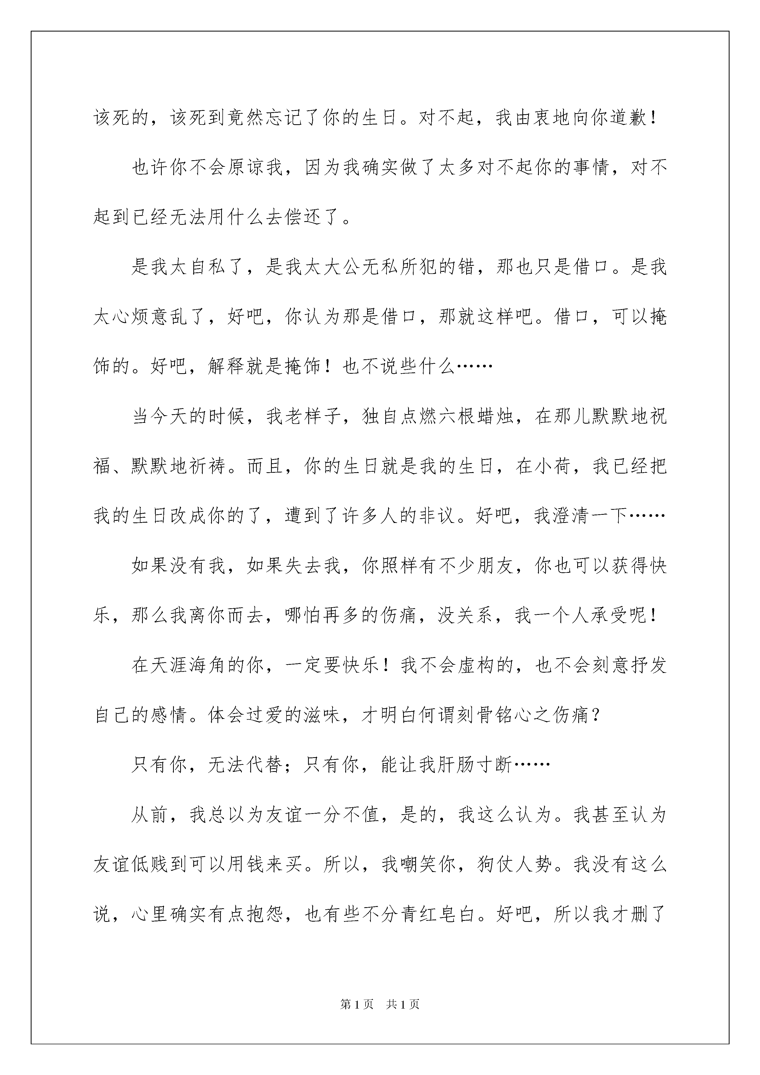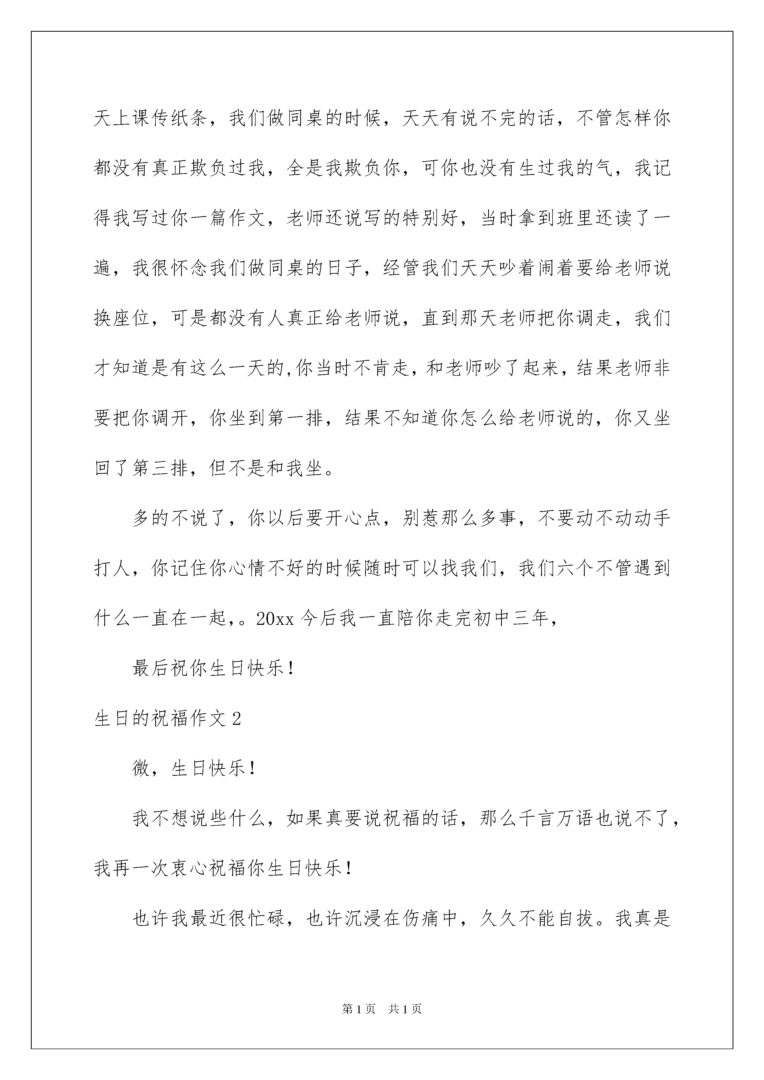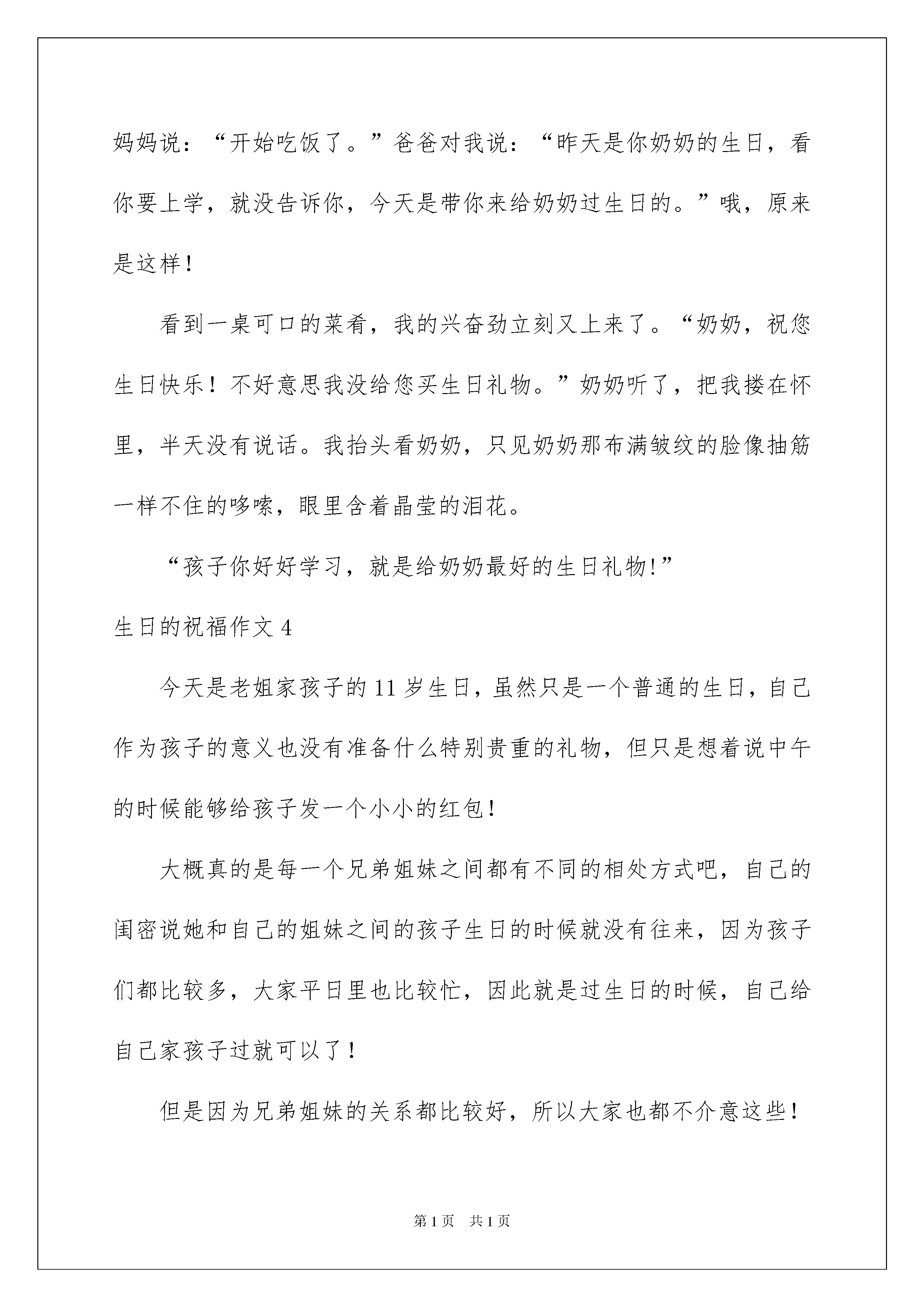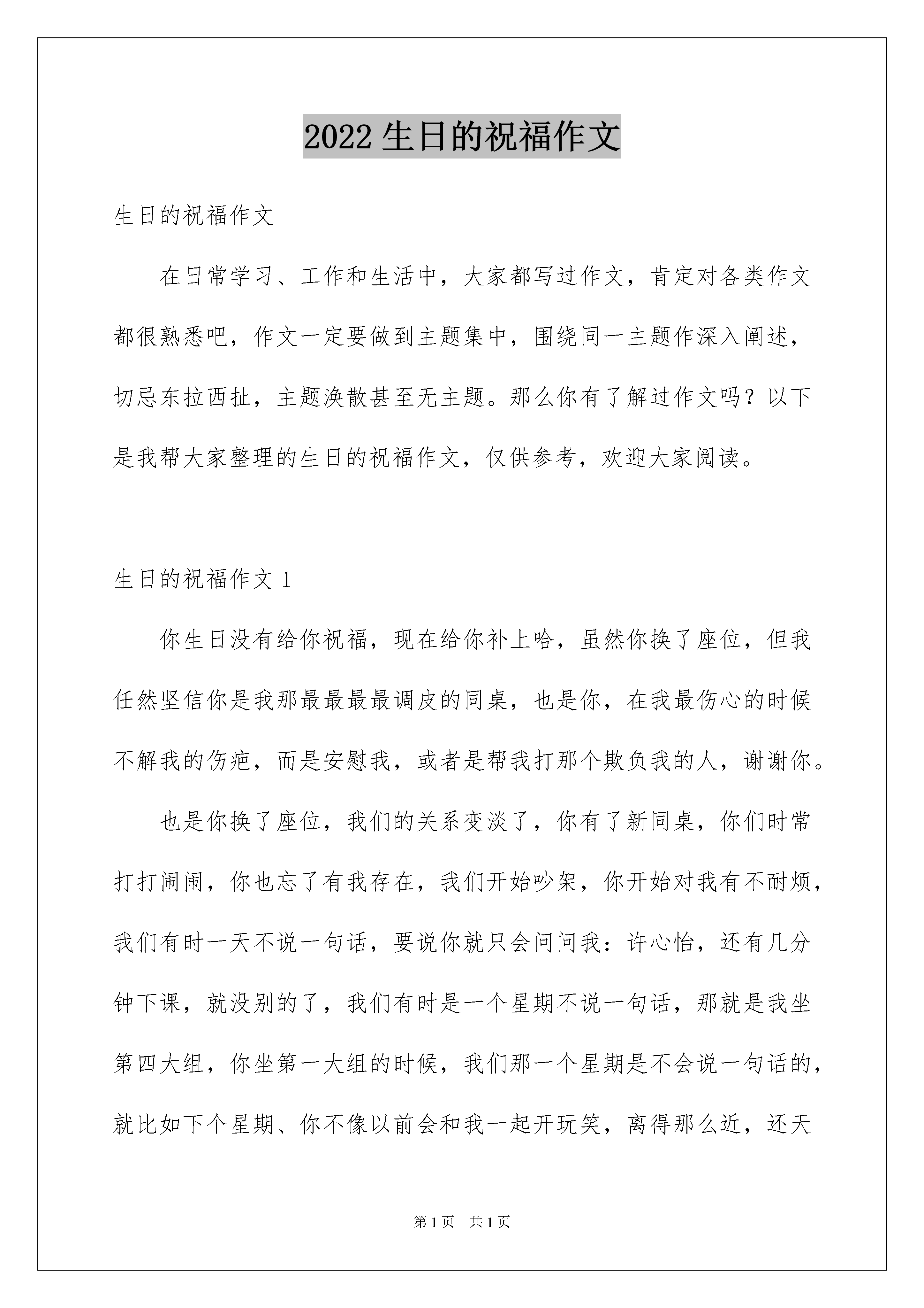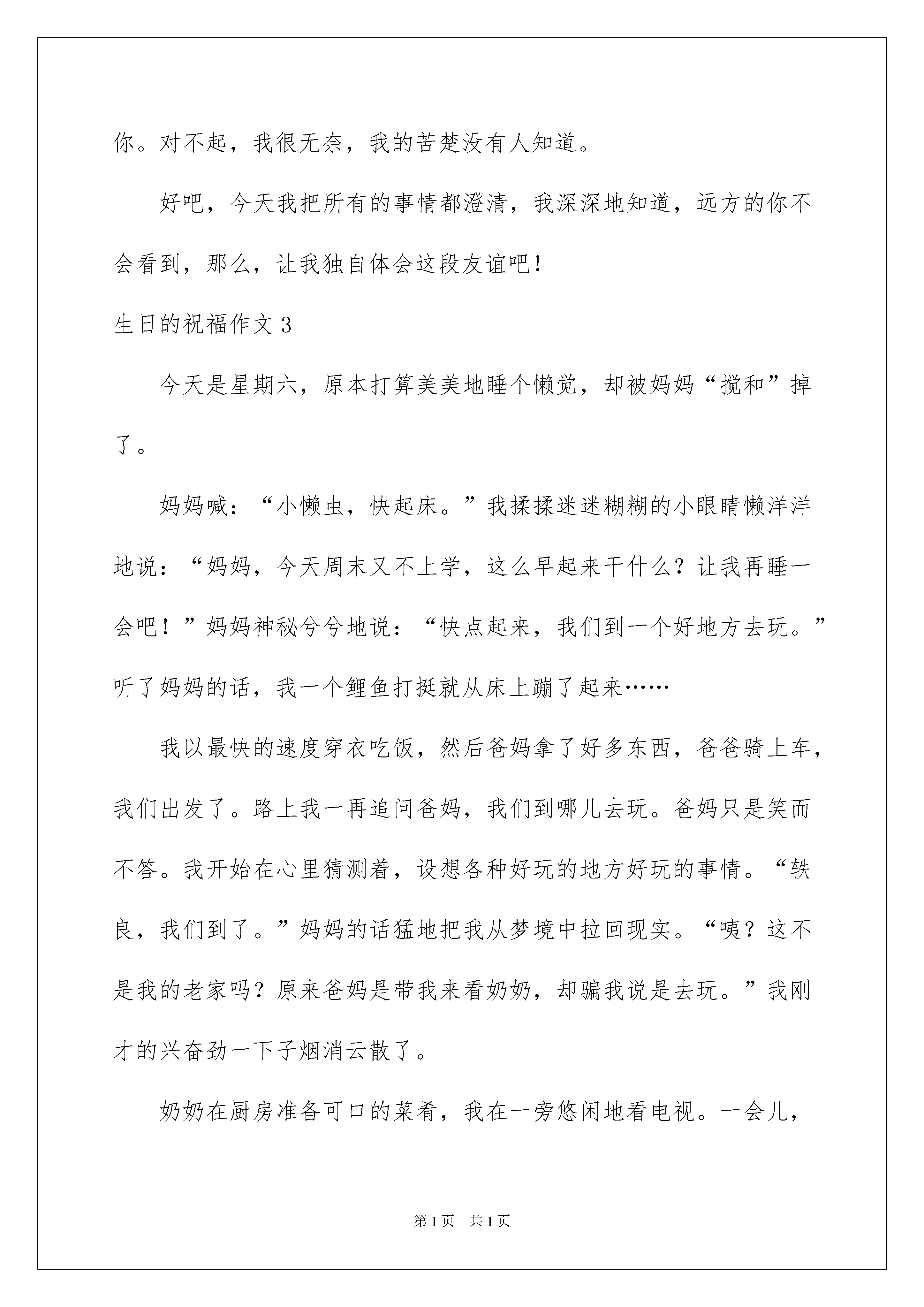 2022生日的祝福作文生日的祝福作文在日常学习、工作和生活中,大家都写过作文,肯定对各类作文都很熟悉吧,作文一定要做到主题集中,围绕同一主题作深入阐述,切忌东拉西扯,主题涣散甚至无主题。那么你有了解过作文吗?以下是我帮大家整理的生日的祝福作文,仅供参考,欢迎大家阅读。生日的祝福作文1你生日没有给你祝福,现在给你补上哈,虽然你换了座位,但我任然坚信你是我那最最最最调皮的同桌,也是你,在我最伤心的时候不解我的伤疤,而是安慰我,或者是帮我打那个欺负我的人,谢谢你。也是你换了座位,我们的关系变淡了,你有了新同桌,你们时常打打闹闹,你也忘了有我存在,我们开始吵架,你开始对我有不耐烦,我们有时一天不说一句话,要说你就只会问问我:许心怡,还有几分钟下课,就没别的了,我们有时是一个星期不说一句话,那就是我坐第四大组,你坐第一大组的时候,我们那一个星期是不会说一句话的,就比如下个星期、你不像以前会和我一起开玩笑,离得那么近,还天天上课传纸条,我们做同桌的时候,天天有说不完的话,不管怎样你都没有真正欺负过我,全是我欺负你,可你也没有生过我的气,我记得我写过你一篇作文,老师还说写的特别好,当时拿到班里还读了一遍,我很怀念我们做同桌的日子,经管我们天天吵着闹着要给老师说换座位,可是都没有人真正给老师说,直到那天老师把你调走,我们才知道是有这么一天的,你当时不肯走,和老师吵了起来,结果老师非要把你调开,你坐到第一排,结果不知道你怎么给老师说的,你又坐回了第三排,但不是和我坐。多的不说了,你以后要开心点,别惹那么多事,不要动不动动手打人,你记住你心情不好的时候随时可以找我们,我们六个不管遇到什么一直在一起,。20xx今后我一直陪你走完初中三年,最后祝你生日快乐!生日的祝福作文2微,生日快乐!我不想说些什么,如果真要说祝福的话,那么千言万语也说不了,我再一次衷心祝福你生日快乐!也许我最近很忙碌,也许沉浸在伤痛中,久久不能自拔。我真是该死的,该死到竟然忘记了你的生日。对不起,我由衷地向你道歉!也许你不会原谅我,因为我确实做了太多对不起你的事情,对不起到已经无法用什么去偿还了。是我太自私了,是我太大公无私所犯的错,那也只是借口。是我太心烦意乱了,好吧,你认为那是借口,那就这样吧。借口,可以掩饰的。好吧,解释就是掩饰!也不说些什么……当今天的时候,我老样子,独自点燃六根蜡烛,在那儿默默地祝福、默默地祈祷。而且,你的生日就是我的生日,在小荷,我已经把我的生日改成你的了,遭到了许多人的非议。好吧,我澄清一下……如果没有我,如果失去我,你照样有不少朋友,你也可以获得快乐,那么我离你而去,哪怕再多的伤痛,没关系,我一个人承受呢!在天涯海角的你,一定要快乐!我不会虚构的,也不会刻意抒发自己的感情。体会过爱的滋味,才明白何谓刻骨铭心之伤痛?只有你,无法代替;只有你,能让我肝肠寸断……从前,我总以为友谊一分不值,是的,我这么认为。我甚至认为友谊低贱到可以用钱来买。所以,我嘲笑你,狗仗人势。我没有这么说,心里确实有点抱怨,也有些不分青红皂白。好吧,所以我才删了你。对不起,我很无奈,我的苦楚没有人知道。好吧,今天我把所有的事情都澄清,我深深地知道,远方的你不会看到,那么,让我独自体会这段友谊吧!生日的祝福作文3今天是星期六,原本打算美美地睡个懒觉,却被妈妈“搅和”掉了。妈妈喊:“小懒虫,快起床。”我揉揉迷迷糊糊的小眼睛懒洋洋地说:“妈妈,今天周末又不上学,这么早起来干什么?让我再睡一会吧!”妈妈神秘兮兮地说:“快点起来,我们到一个好地方去玩。”听了妈妈的话,我一个鲤鱼打挺就从床上蹦了起来……我以最快的速度穿衣吃饭,然后爸妈拿了好多东西,爸爸骑上车,我们出发了。路上我一再追问爸妈,我们到哪儿去玩。爸妈只是笑而不答。我开始在心里猜测着,设想各种好玩的地方好玩的事情。“轶良,我们到了。”妈妈的话猛地把我从梦境中拉回现实。“咦?这不是我的老家吗?原来爸妈是带我来看奶奶,却骗我说是去玩。”我刚才的兴奋劲一下子烟消云散了。奶奶在厨房准备可口的菜肴,我在一旁悠闲地看电视。一会儿,妈妈说:“开始吃饭了。”爸爸对我说:“昨天是你奶奶的生日,看你要上学,就没告诉你,今天是带你来给奶奶过生日的。”哦,原来是这样!看到一桌可口的菜肴,我的兴奋劲立刻又上来了。“奶奶,祝您生日快乐!不好意思我没给您买生日礼物。”奶奶听了,把我搂在怀里,半天没有说话。我抬头看奶奶,只见奶奶那布满皱纹的脸像抽筋一样不住的哆嗦,眼里含着晶莹的泪花。“孩子你好好学习,就是给奶奶最好的生日礼物!”生日的祝福作文4今天是老姐家孩子的11岁生日,虽然只是一个普通的生日,自己作为孩子