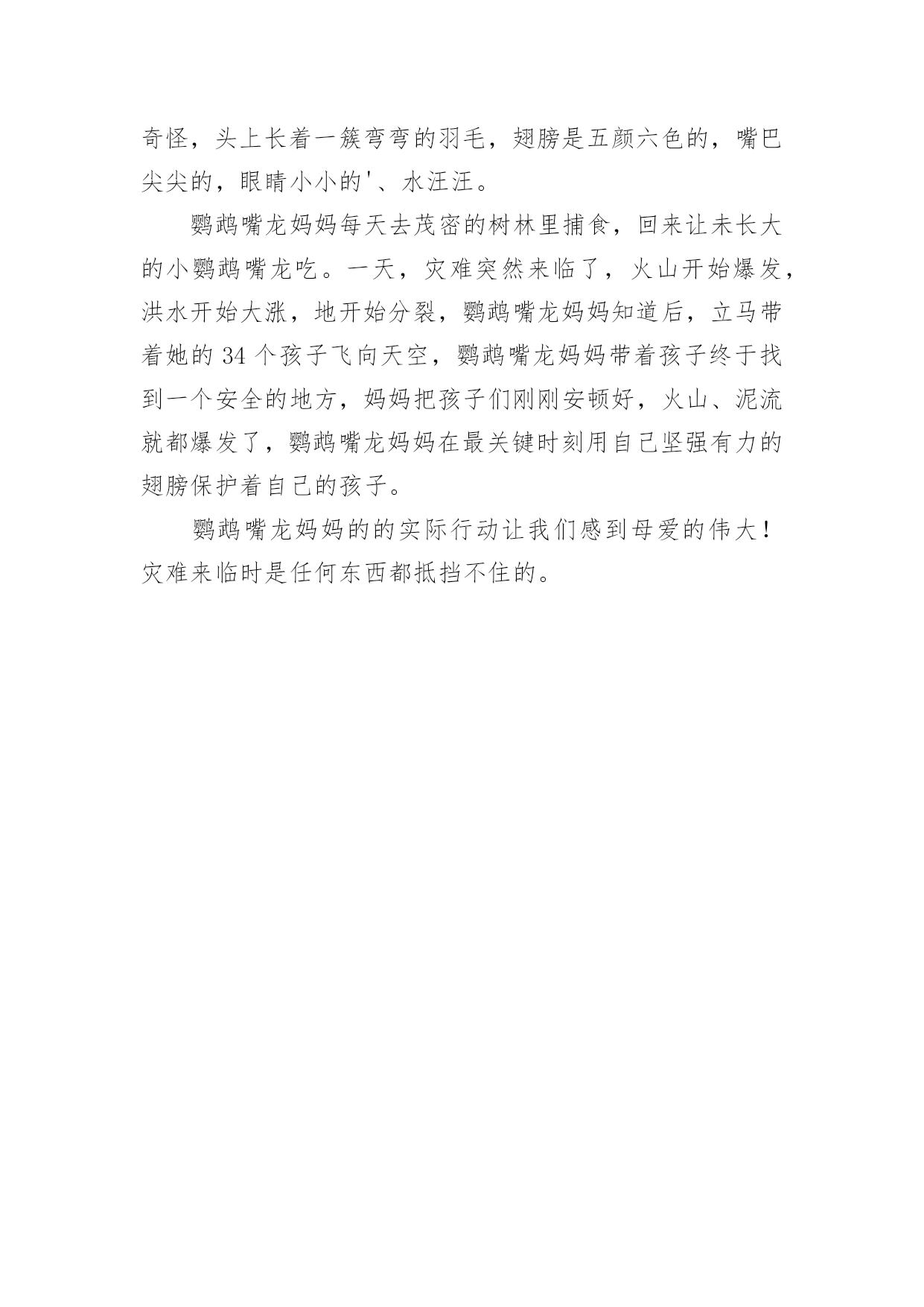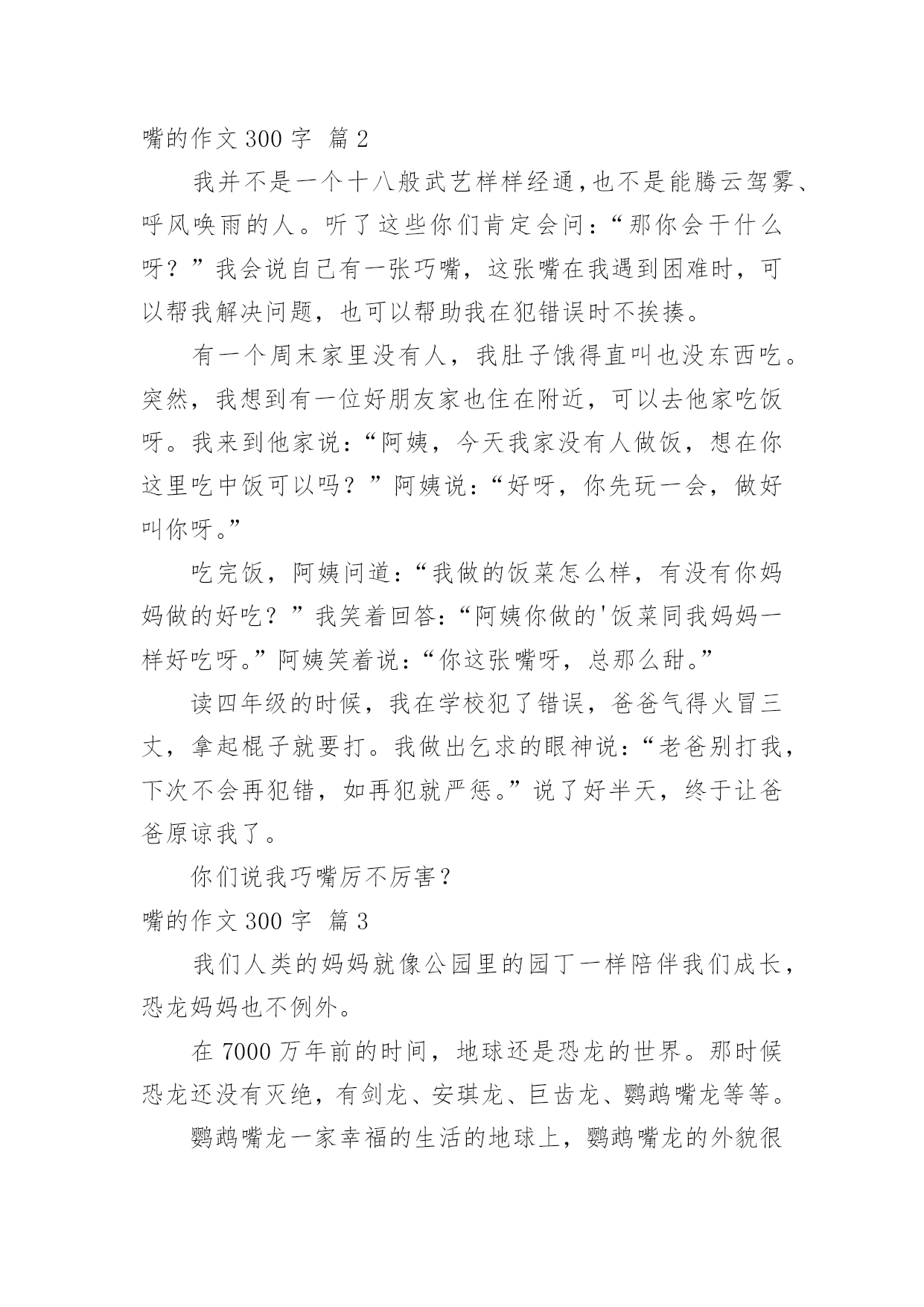 嘴的作文300字 嘴的作文300字[精选]在日常的学习、工作、生活中,大家都接触过作文吧,作文可分为小学作文、中学作文、大学作文(论文)。你写作文时总是无从下笔?下面是小编整理的嘴的作文300字3篇,欢迎阅读与收藏。嘴的作文300字篇1有一天夜晚,眼睛、鼻子、嘴巴、耳朵纷纷谈论它们之中谁是老大。眼睛说:“每次别人看见主人,明亮的眼睛都会竖起大拇指说:‘你有一双明亮的眼睛,真是幸福呀!’,你们还不叫我老大。”耳朵骄傲的说:”每当主人听到优美的音乐那是多么好呀!我才是老大呢!”嘴巴说:“老大的宝座我可不会让给你,主人每天吃的饭菜和天下美食,要是没有我,主人连一粒米也吃不到,而且没有我,主人也不能和别人说话了。”就在这时鼻子忍不住生气地说:“要不是我每天吸进氧气,吐出二氧化碳,主人早就上西天了,快认我老大吧!”大脑公公开口说话了:“你们都是主人重要的器官,缺了你们可不行啊!否则就会变成残疾人。”眼睛、鼻子、嘴巴、耳朵听了大脑公公的.话,个个都羞红了脸。从此以后,它们变得十分团结了。嘴的作文300字篇2我并不是一个十八般武艺样样经通,也不是能腾云驾雾、呼风唤雨的人。听了这些你们肯定会问:“那你会干什么呀?”我会说自己有一张巧嘴,这张嘴在我遇到困难时,可以帮我解决问题,也可以帮助我在犯错误时不挨揍。有一个周末家里没有人,我肚子饿得直叫也没东西吃。突然,我想到有一位好朋友家也住在附近,可以去他家吃饭呀。我来到他家说:“阿姨,今天我家没有人做饭,想在你这里吃中饭可以吗?”阿姨说:“好呀,你先玩一会,做好叫你呀。”吃完饭,阿姨问道:“我做的饭菜怎么样,有没有你妈妈做的好吃?”我笑着回答:“阿姨你做的'饭菜同我妈妈一样好吃呀。”阿姨笑着说:“你这张嘴呀,总那么甜。”读四年级的时候,我在学校犯了错误,爸爸气得火冒三丈,拿起棍子就要打。我做出乞求的眼神说:“老爸别打我,下次不会再犯错,如再犯就严惩。”说了好半天,终于让爸爸原谅我了。你们说我巧嘴厉不厉害?嘴的作文300字篇3我们人类的妈妈就像公园里的园丁一样陪伴我们成长,恐龙妈妈也不例外。在7000万年前的时间,地球还是恐龙的世界。那时候恐龙还没有灭绝,有剑龙、安琪龙、巨齿龙、鹦鹉嘴龙等等。鹦鹉嘴龙一家幸福的生活的地球上,鹦鹉嘴龙的外貌很奇怪,头上长着一簇弯弯的羽毛,翅膀是五颜六色的,嘴巴尖尖的,眼睛小小的'、水汪汪。鹦鹉嘴龙妈妈每天去茂密的树林里捕食,回来让未长大的小鹦鹉嘴龙吃。一天,灾难突然来临了,火山开始爆发,洪水开始大涨,地开始分裂,鹦鹉嘴龙妈妈知道后,立马带着她的34个孩子飞向天空,鹦鹉嘴龙妈妈带着孩子终于找到一个安全的地方,妈妈把孩子们刚刚安顿好,火山、泥流就都爆发了,鹦鹉嘴龙妈妈在最关键时刻用自己坚强有力的翅膀保护着自己的孩子。鹦鹉嘴龙妈妈的的实际行动让我们感到母爱的伟大!灾难来临时是任何东西都抵挡不住的。