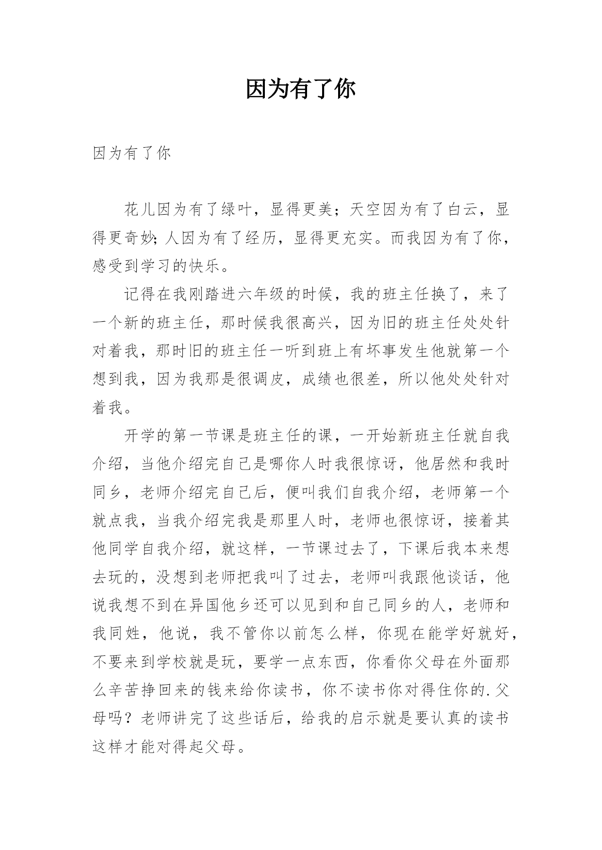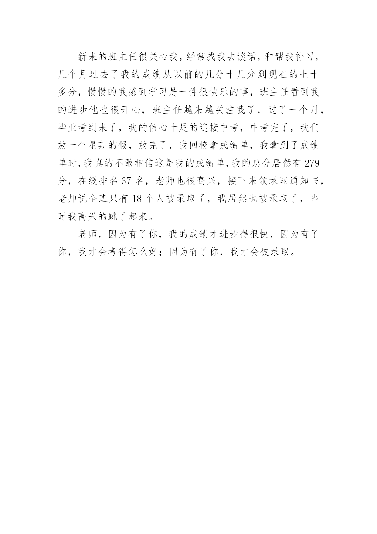 因为有了你 因为有了你花儿因为有了绿叶,显得更美;天空因为有了白云,显得更奇妙;人因为有了经历,显得更充实。而我因为有了你,感受到学习的快乐。记得在我刚踏进六年级的时候,我的班主任换了,来了一个新的班主任,那时候我很高兴,因为旧的班主任处处针对着我,那时旧的班主任一听到班上有坏事发生他就第一个想到我,因为我那是很调皮,成绩也很差,所以他处处针对着我。开学的第一节课是班主任的课,一开始新班主任就自我介绍,当他介绍完自己是哪你人时我很惊讶,他居然和我时同乡,老师介绍完自己后,便叫我们自我介绍,老师第一个就点我,当我介绍完我是那里人时,老师也很惊讶,接着其他同学自我介绍,就这样,一节课过去了,下课后我本来想去玩的,没想到老师把我叫了过去,老师叫我跟他谈话,他说我想不到在异国他乡还可以见到和自己同乡的人,老师和我同姓,他说,我不管你以前怎么样,你现在能学好就好,不要来到学校就是玩,要学一点东西,你看你父母在外面那么辛苦挣回来的钱来给你读书,你不读书你对得住你的.父母吗?老师讲完了这些话后,给我的启示就是要认真的读书这样才能对得起父母。新来的班主任很关心我,经常找我去谈话,和帮我补习,几个月过去了我的成绩从以前的几分十几分到现在的七十多分,慢慢的我感到学习是一件很快乐的事,班主任看到我的进步他也很开心,班主任越来越关注我了,过了一个月,毕业考到来了,我的信心十足的迎接中考,中考完了,我们放一个星期的假,放完了,我回校拿成绩单,我拿到了成绩单时,我真的不敢相信这是我的成绩单,我的总分居然有279分,在级排名67名,老师也很高兴,接下来领录取通知书,老师说全班只有18个人被录取了,我居然也被录取了,当时我高兴的跳了起来。老师,因为有了你,我的成绩才进步得很快,因为有了你,我才会考得怎么好;因为有了你,我才会被录取。