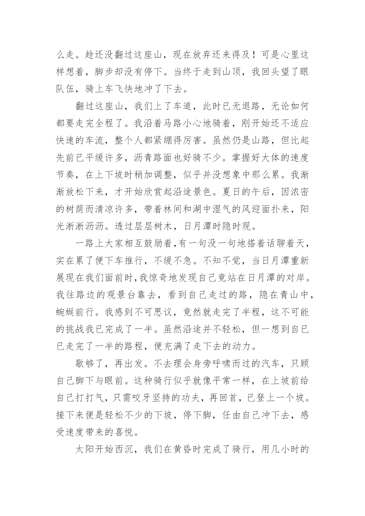 原来这么简单作文 (精)原来这么简单作文在平平淡淡的日常中,大家最不陌生的就是作文了吧,作文根据体裁的不同可以分为记叙文、说明文、应用文、议论文。那么问题来了,到底应如何写一篇优秀的作文呢?下面是小编帮大家整理的原来这么简单作文,仅供参考,大家一起来看看吧。领队问有没有人想和他一起骑车环日月潭,有那么一瞬间我心动了,但很快在心底里打消了这个念头。全程三十多公里,还是山路,要骑完全程对我来说真的太难了。尽管如此,我还是加入了骑行的行列,但是打算在上山之前折返。沿湖的景色是令人愉悦的,但想要环湖一周,就要翻座小山到外围的马路上去。到了山坡前,真正要做决定了,我忍不住想尝试这个挑战,却又觉得太困难。但是看到身边比我小的伙伴头也不回地冲上了山,我还是决定加入环湖的队列。这是第一个坡,马上就给了我一个下马威。坡陡得无法骑行,只能下车慢慢推行,一不小心自行车就拉着人直往后坠。一步一步地踏着,没多久我就累得直喘气。心中不断有个声音在说:第一座山就这么可怕,后面的路都不知道要怎么走。趁还没翻过这座山,现在放弃还来得及!可是心里这样想着,脚步却没有停下。当终于走到山顶,我回头望了眼队伍,骑上车飞快地冲了下去。翻过这座山,我们上了车道,此时已无退路,无论如何都要走完全程了。我沿着马路小心地骑着,刚开始还不适应快速的车流,整个人都紧绷得厉害。虽然仍是山路,但比起先前已平缓许多,沥青路面也好骑不少。掌握好大体的速度节奏,在上下坡时稍加调整,似乎并没想象中那么累。我渐渐放松下来,才开始欣赏起沿途景色。夏日的午后,因浓密的树荫而清凉许多,带着林间和湖中湿气的风迎面扑来,阳光淅淅沥沥。透过层层树木,日月潭时隐时现。一路上大家相互鼓励着,有一句没一句地搭着话聊着天,实在累了便下车推行,不缓不急。不知不觉,当日月潭重新展现在我们面前时,我惊奇地发现自己竟站在日月潭的对岸。我往路边的观景台靠去,看到自己走过的路,隐在青山中,蜿蜒前行。我感到不可思议,竟然就走完了半程,这不可能的挑战我已完成了一半。虽然沿途并不轻松,但一想到自已已走完了一半的路程,便充满了走下去的动力。歇够了,再出发。不去理会身旁呼啸而过的汽车,只顾自己脚下与眼前。这种骑行似乎就像平常一样,在上坡前给自己打打气,只需咬牙坚持的功夫,再回首,已登上一个坡。接下来便是轻松不少的下坡,停下脚,任由自己冲下去,感受速度带来的喜悦。太阳开始西沉,我们在黄昏时完成了骑行,用几小时的时间骑完了全程。回首望去,青山悠悠,日月潭笼上一层薄雾,在两岸灯光映照下波光闪动。原来骑完全程是这么简单!没想到我竟然做到了。回想起自己先前的没自信,发现有时就是差迈出那一步。跨过这道坎,就不要再回头了,想想自己经历过的困难,再看看前方,眼前的一切也是这么简单。
