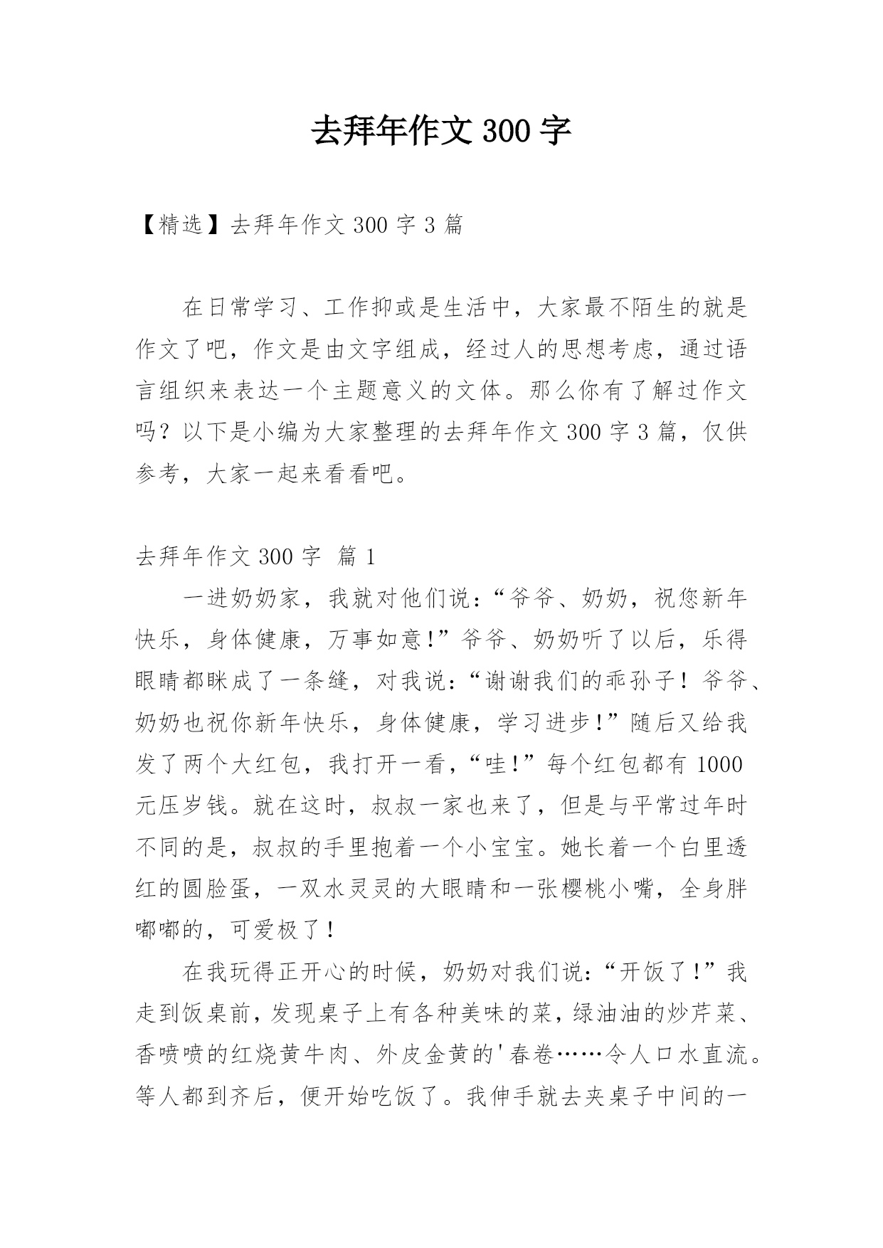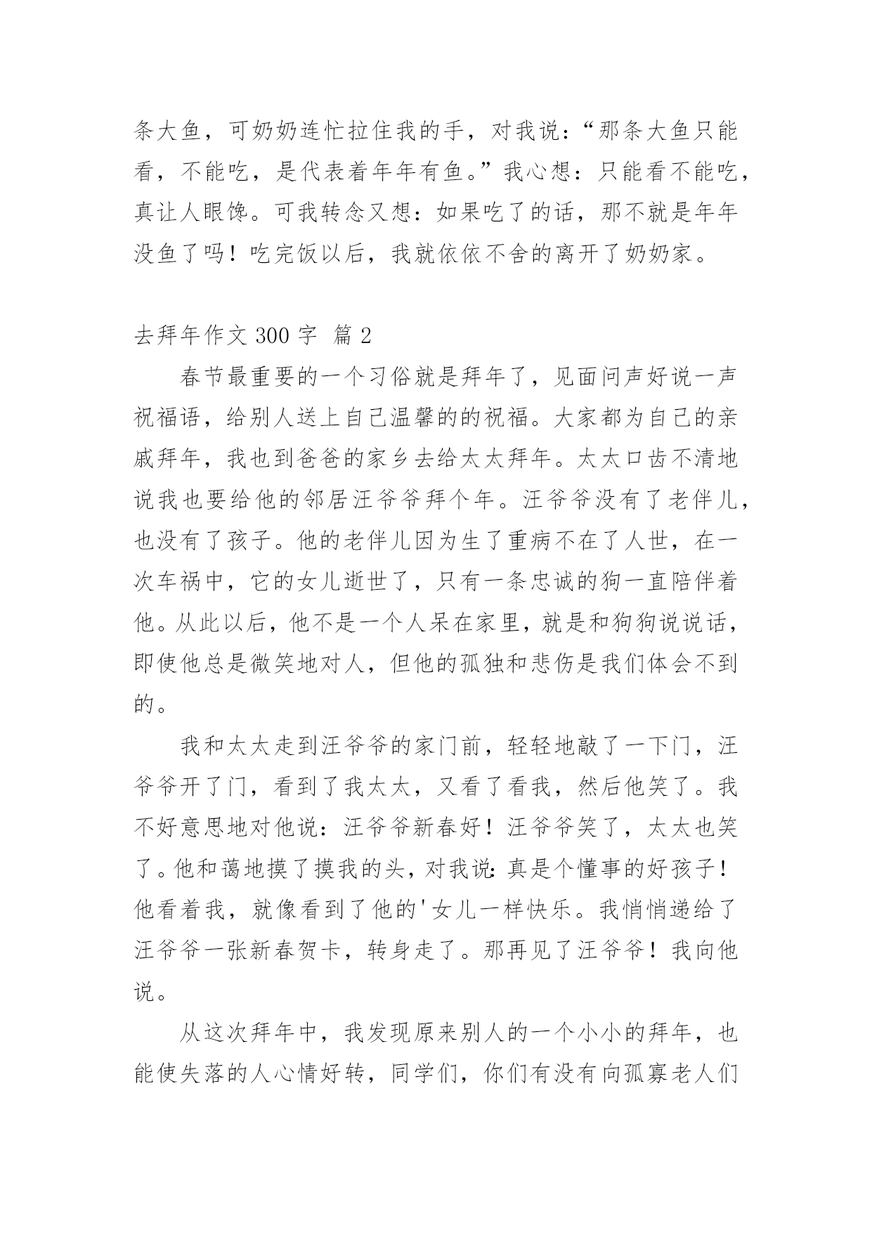 去拜年作文300字 【精选】去拜年作文300字3篇在日常学习、工作抑或是生活中,大家最不陌生的就是作文了吧,作文是由文字组成,经过人的思想考虑,通过语言组织来表达一个主题意义的文体。那么你有了解过作文吗?以下是小编为大家整理的去拜年作文300字3篇,仅供参考,大家一起来看看吧。去拜年作文300字篇1一进奶奶家,我就对他们说:“爷爷、奶奶,祝您新年快乐,身体健康,万事如意!”爷爷、奶奶听了以后,乐得眼睛都眯成了一条缝,对我说:“谢谢我们的乖孙子!爷爷、奶奶也祝你新年快乐,身体健康,学习进步!”随后又给我发了两个大红包,我打开一看,“哇!”每个红包都有1000元压岁钱。就在这时,叔叔一家也来了,但是与平常过年时不同的是,叔叔的手里抱着一个小宝宝。她长着一个白里透红的圆脸蛋,一双水灵灵的大眼睛和一张樱桃小嘴,全身胖嘟嘟的,可爱极了!在我玩得正开心的时候,奶奶对我们说:“开饭了!”我走到饭桌前,发现桌子上有各种美味的菜,绿油油的炒芹菜、香喷喷的红烧黄牛肉、外皮金黄的'春卷……令人口水直流。等人都到齐后,便开始吃饭了。我伸手就去夹桌子中间的一条大鱼,可奶奶连忙拉住我的手,对我说:“那条大鱼只能看,不能吃,是代表着年年有鱼。”我心想:只能看不能吃,真让人眼馋。可我转念又想:如果吃了的话,那不就是年年没鱼了吗!吃完饭以后,我就依依不舍的离开了奶奶家。去拜年作文300字篇2春节最重要的一个习俗就是拜年了,见面问声好说一声祝福语,给别人送上自己温馨的的祝福。大家都为自己的亲戚拜年,我也到爸爸的家乡去给太太拜年。太太口齿不清地说我也要给他的邻居汪爷爷拜个年。汪爷爷没有了老伴儿,也没有了孩子。他的老伴儿因为生了重病不在了人世,在一次车祸中,它的女儿逝世了,只有一条忠诚的狗一直陪伴着他。从此以后,他不是一个人呆在家里,就是和狗狗说说话,即使他总是微笑地对人,但他的孤独和悲伤是我们体会不到的。我和太太走到汪爷爷的家门前,轻轻地敲了一下门,汪爷爷开了门,看到了我太太,又看了看我,然后他笑了。我不好意思地对他说:汪爷爷新春好!汪爷爷笑了,太太也笑了。他和蔼地摸了摸我的头,对我说:真是个懂事的好孩子!他看着我,就像看到了他的'女儿一样快乐。我悄悄递给了汪爷爷一张新春贺卡,转身走了。那再见了汪爷爷!我向他说。从这次拜年中,我发现原来别人的一个小小的拜年,也能使失落的人心情好转,同学们,你们有没有向孤寡老人们拜拜年呢?赶快行动吧!去拜年作文300字篇3今天早上,我和妈妈、爸爸去姥姥家拜年,我们坐了三趟车来到了姥姥家,路上,雾很大,什么都看不见,每辆车都开着黄灯,我问妈妈:“为什么每辆车都开着黄灯呀?”妈妈说:“因为雾太大,后面的车看不到前面的'车,害怕撞车了,所以开着黄灯。”不一会儿,我们就到了姥姥家,到了姥姥家,姥姥就把菜都摆上来了,我们吃饱了,我和爸爸出去玩了一会儿,玩了一会儿,我就累了,于是,我就和妈妈一起睡觉,睡了一会儿,就醒了,我刚一醒,就听见宝宝弟弟的声音,我赶紧起来,去迎接,我一出门,看见宝宝弟弟在放炮,于是,我也去放炮了,姥姥见宝宝弟弟来了,就把鞭炮拿出来放了,放完鞭炮,我们就吃饭了,姥爷说:“谁先吃完就给谁一个惊喜。”拜年我们俩都吃得很快,于是,姥爷就给我们买了两盒炮,一盒是擦炮,一盒是摔炮,我们先放了擦炮,擦炮的声音很响,妈妈都很害怕,放完了,我们摔了几盒摔炮,摔完了这几盒,我们还想摔,姥爷说:“那几盒不要摔了,留给佳佳。”我们见没啥玩的,就开始拿打火机烧纸片,纸片也烧完了,这下可真没啥玩了,就回家了,在回家的路上,妈妈给我妈了一个愤怒小鸟的灯笼,它还会吹泡泡呢!我今天真开心呀!