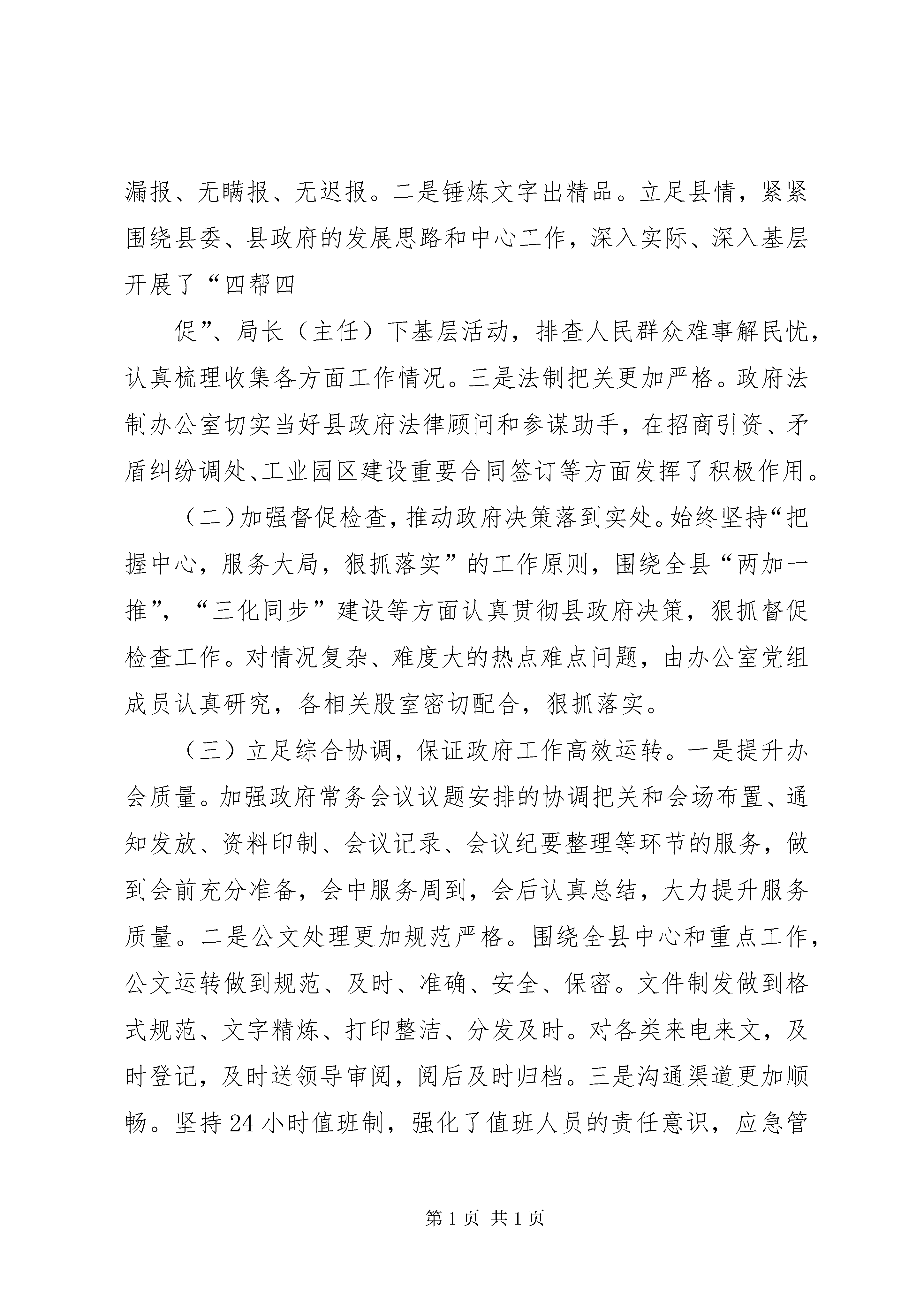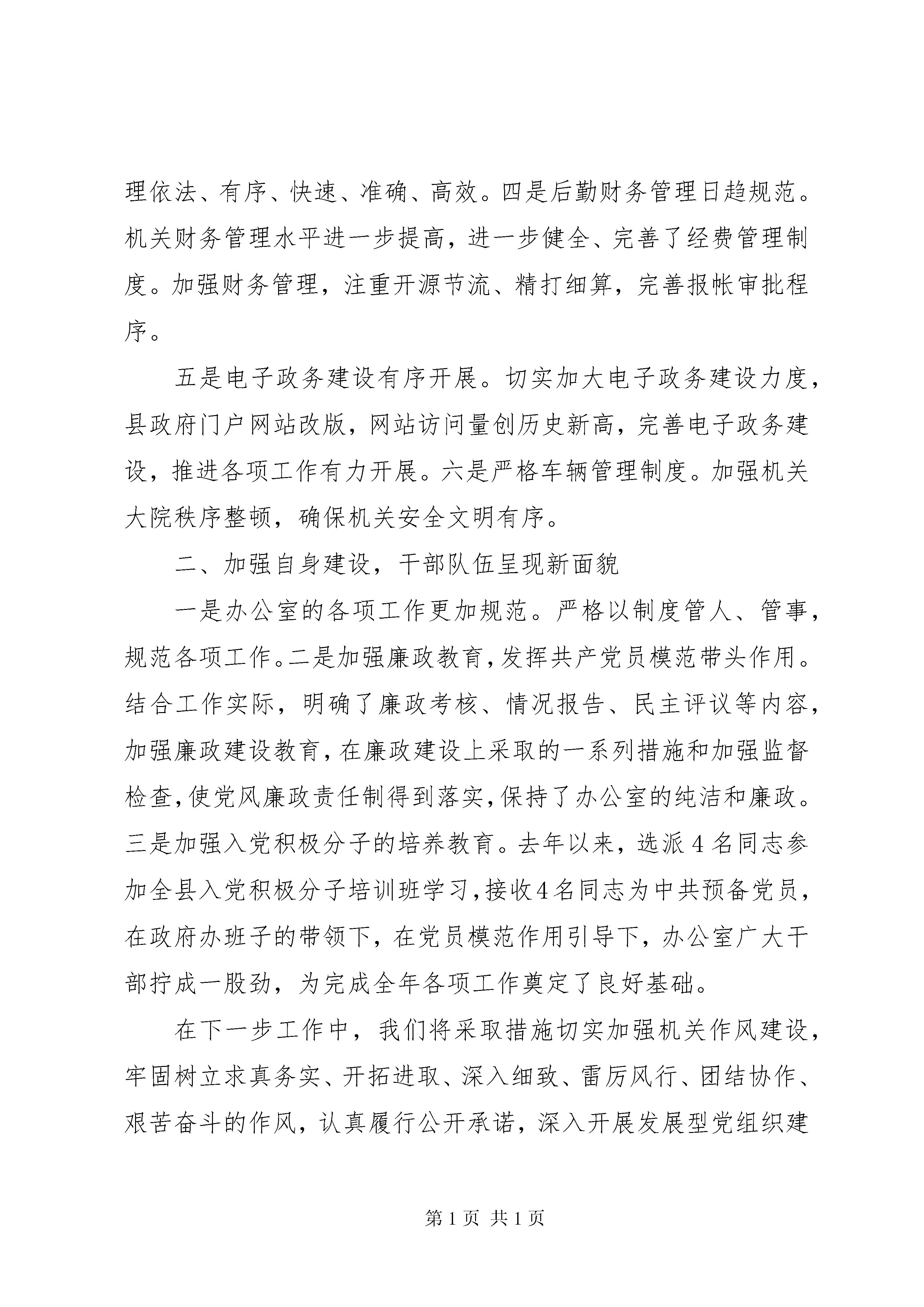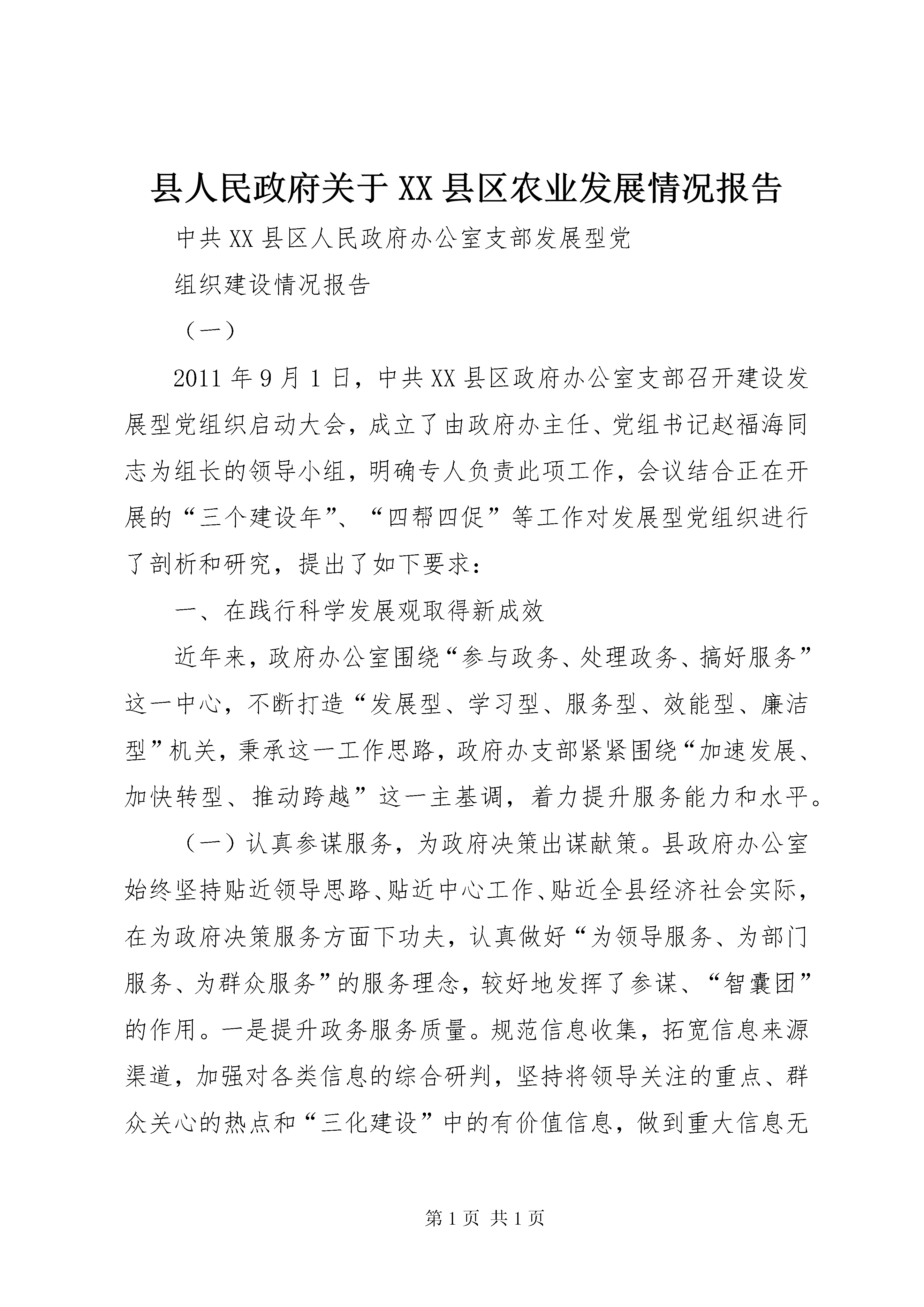 县人民政府关于XX县区农业发展情况报告中共XX县区人民政府办公室支部发展型党组织建设情况报告(一)2011年9月1日,中共XX县区政府办公室支部召开建设发展型党组织启动大会,成立了由政府办主任、党组书记赵福海同志为组长的领导小组,明确专人负责此项工作,会议结合正在开展的“三个建设年”、“四帮四促”等工作对发展型党组织进行了剖析和研究,提出了如下要求:一、在践行科学发展观取得新成效近年来,政府办公室围绕“参与政务、处理政务、搞好服务”这一中心,不断打造“发展型、学习型、服务型、效能型、廉洁型”机关,秉承这一工作思路,政府办支部紧紧围绕“加速发展、加快转型、推动跨越”这一主基调,着力提升服务能力和水平。(一)认真参谋服务,为政府决策出谋献策。县政府办公室始终坚持贴近领导思路、贴近中心工作、贴近全县经济社会实际,在为政府决策服务方面下功夫,认真做好“为领导服务、为部门服务、为群众服务”的服务理念,较好地发挥了参谋、“智囊团”的作用。一是提升政务服务质量。规范信息收集,拓宽信息来源渠道,加强对各类信息的综合研判,坚持将领导关注的重点、群众关心的热点和“三化建设”中的有价值信息,做到重大信息无漏报、无瞒报、无迟报。二是锤炼文字出精品。立足县情,紧紧围绕县委、县政府的发展思路和中心工作,深入实际、深入基层开展了“四帮四促”、局长(主任)下基层活动,排查人民群众难事解民忧,认真梳理收集各方面工作情况。三是法制把关更加严格。政府法制办公室切实当好县政府法律顾问和参谋助手,在招商引资、矛盾纠纷调处、工业园区建设重要合同签订等方面发挥了积极作用。(二)加强督促检查,推动政府决策落到实处。始终坚持“把握中心,服务大局,狠抓落实”的工作原则,围绕全县“两加一推”,“三化同步”建设等方面认真贯彻县政府决策,狠抓督促检查工作。对情况复杂、难度大的热点难点问题,由办公室党组成员认真研究,各相关股室密切配合,狠抓落实。(三)立足综合协调,保证政府工作高效运转。一是提升办会质量。加强政府常务会议议题安排的协调把关和会场布置、通知发放、资料印制、会议记录、会议纪要整理等环节的服务,做到会前充分准备,会中服务周到,会后认真总结,大力提升服务质量。二是公文处理更加规范严格。围绕全县中心和重点工作,公文运转做到规范、及时、准确、安全、保密。文件制发做到格式规范、文字精炼、打印整洁、分发及时。对各类来电来文,及时登记,及时送领导审阅,阅后及时归档。三是沟通渠道更加顺畅。坚持24小时值班制,强化了值班人员的责任意识,应急管理依法、有序、快速、准确、高效。四是后勤财务管理日趋规范。机关财务管理水平进一步提高,进一步健全、完善了经费管理制度。加强财务管理,注重开源节流、精打细算,完善报帐审批程序。五是电子政务建设有序开展。切实加大电子政务建设力度,县政府门户网站改版,网站访问量创历史新高,完善电子政务建设,推进各项工作有力开展。六是严格车辆管理制度。加强机关大院秩序整顿,确保机关安全文明有序。二、加强自身建设,干部队伍呈现新面貌一是办公室的各项工作更加规范。严格以制度管人、管事,规范各项工作。二是加强廉政教育,发挥共产党员模范带头作用。结合工作实际,明确了廉政考核、情况报告、民主评议等内容,加强廉政建设教育,在廉政建设上采取的一系列措施和加强监督检查,使党风廉政责任制得到落实,保持了办公室的纯洁和廉政。三是加强入党积极分子的培养教育。去年以来,选派4名同志参加全县入党积极分子培训班学习,接收4名同志为中共预备党员,在政府办班子的带领下,在党员模范作用引导下,办公室广大干部拧成一股劲,为完成全年各项工作奠定了良好基础。在下一步工作中,我们将采取措施切实加强机关作风建设,牢固树立求真务实、开拓进取、深入细致、雷厉风行、团结协作、艰苦奋斗的作风,认真履行公开承诺,深入开展发展型党组织建设活动,使机关作风得到切实转变,服务发展、服务基层的意识和能力得到切实提高,为金沙经济社会科学发展、和谐发展、率先发展做出新的更大的贡献。