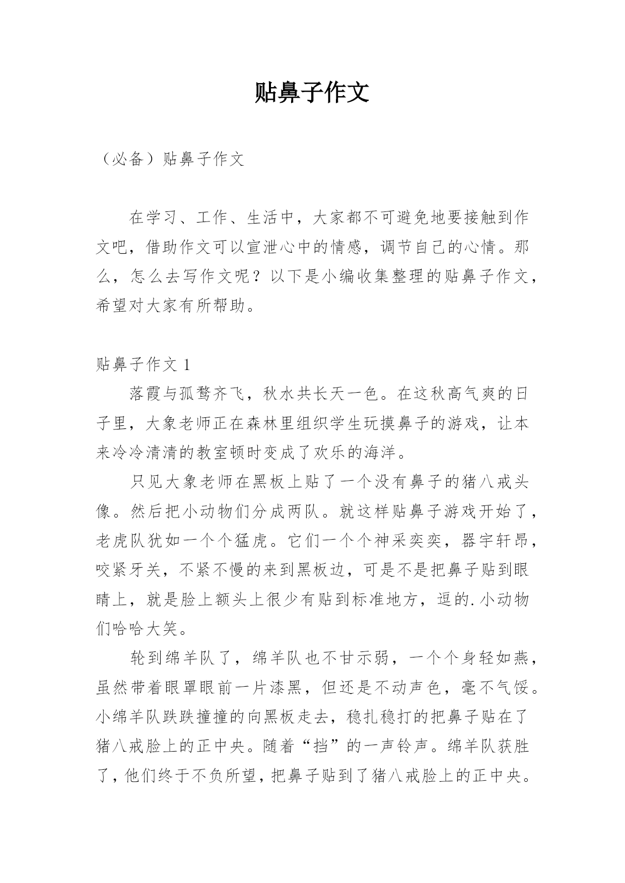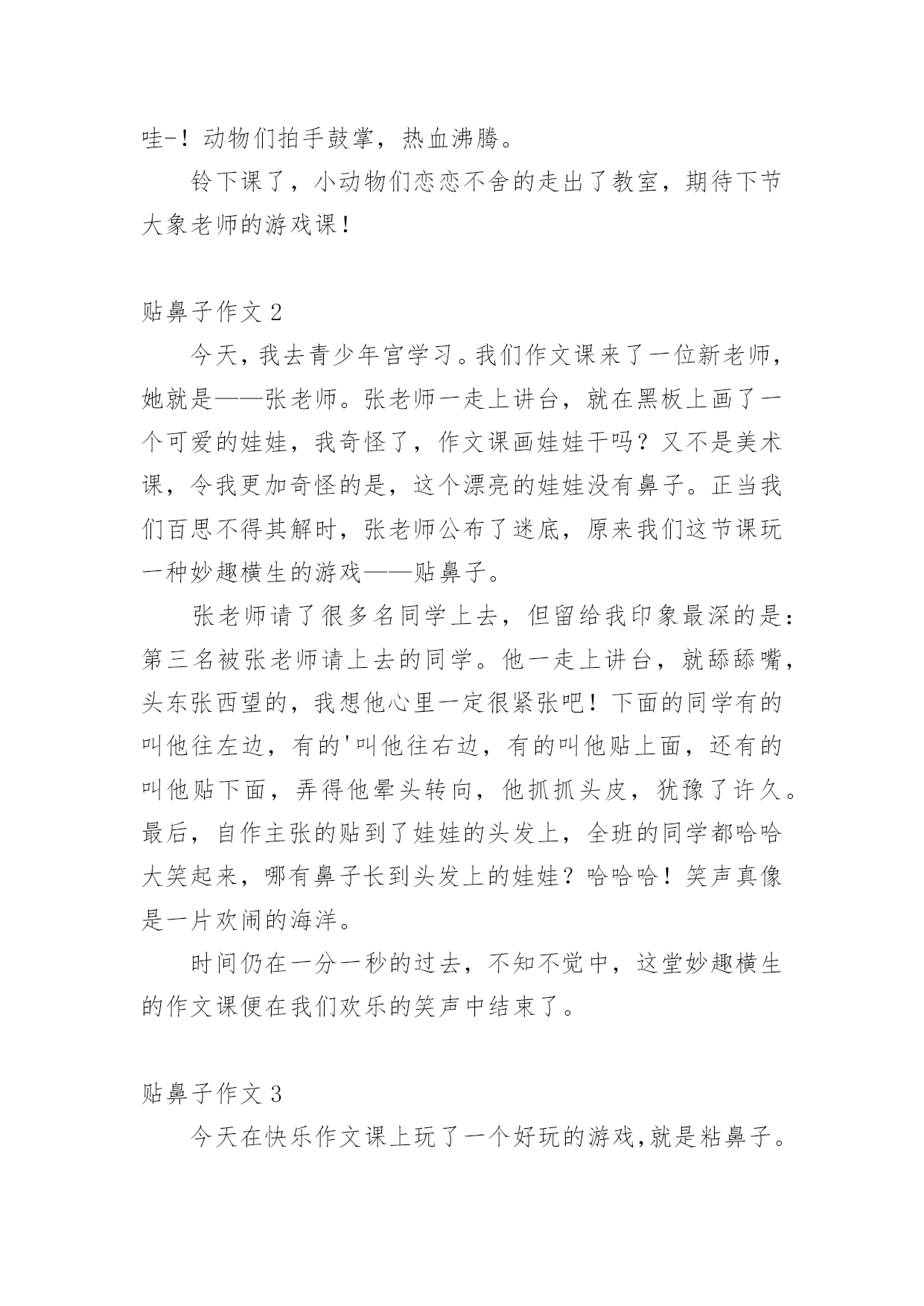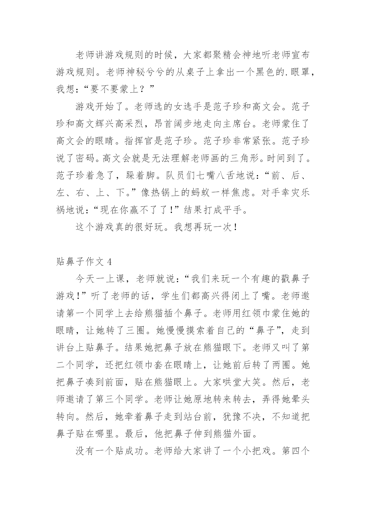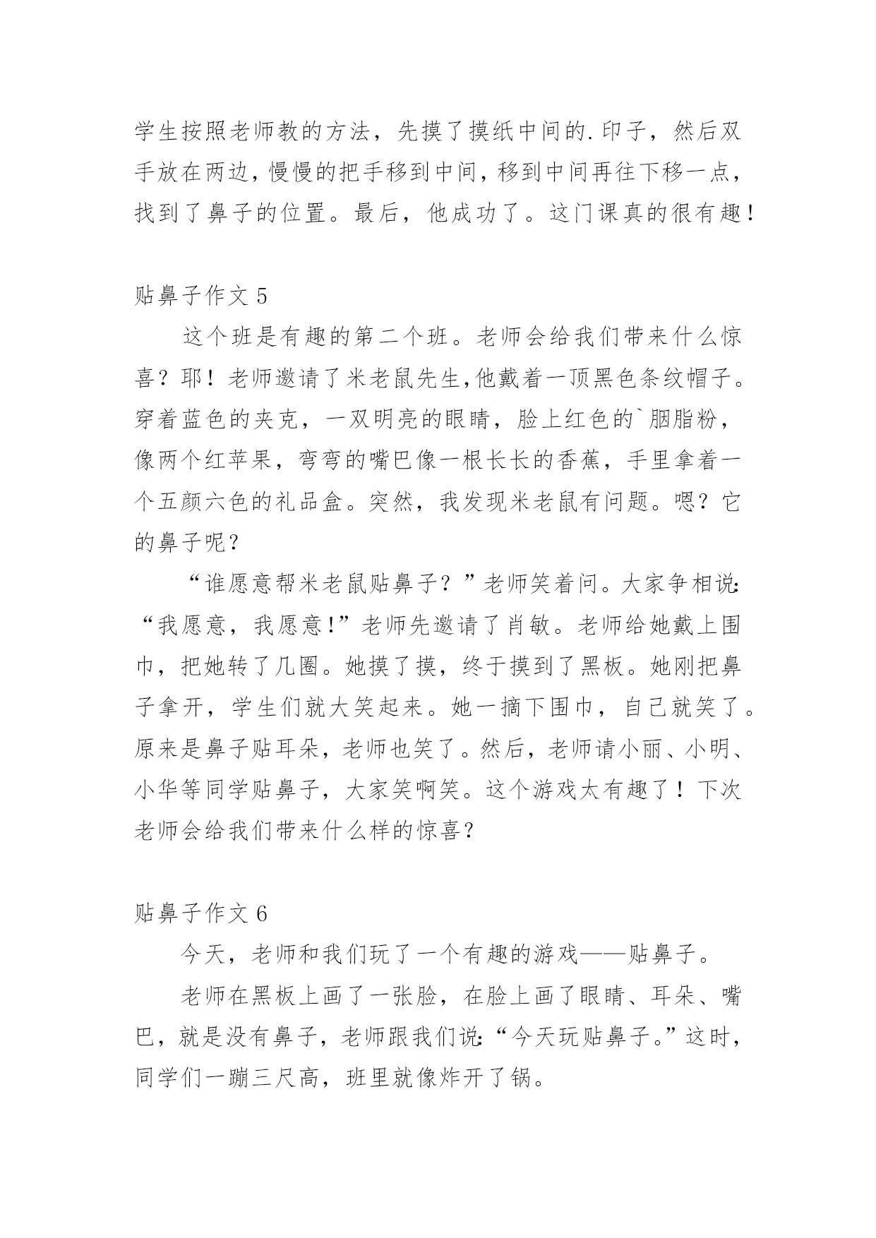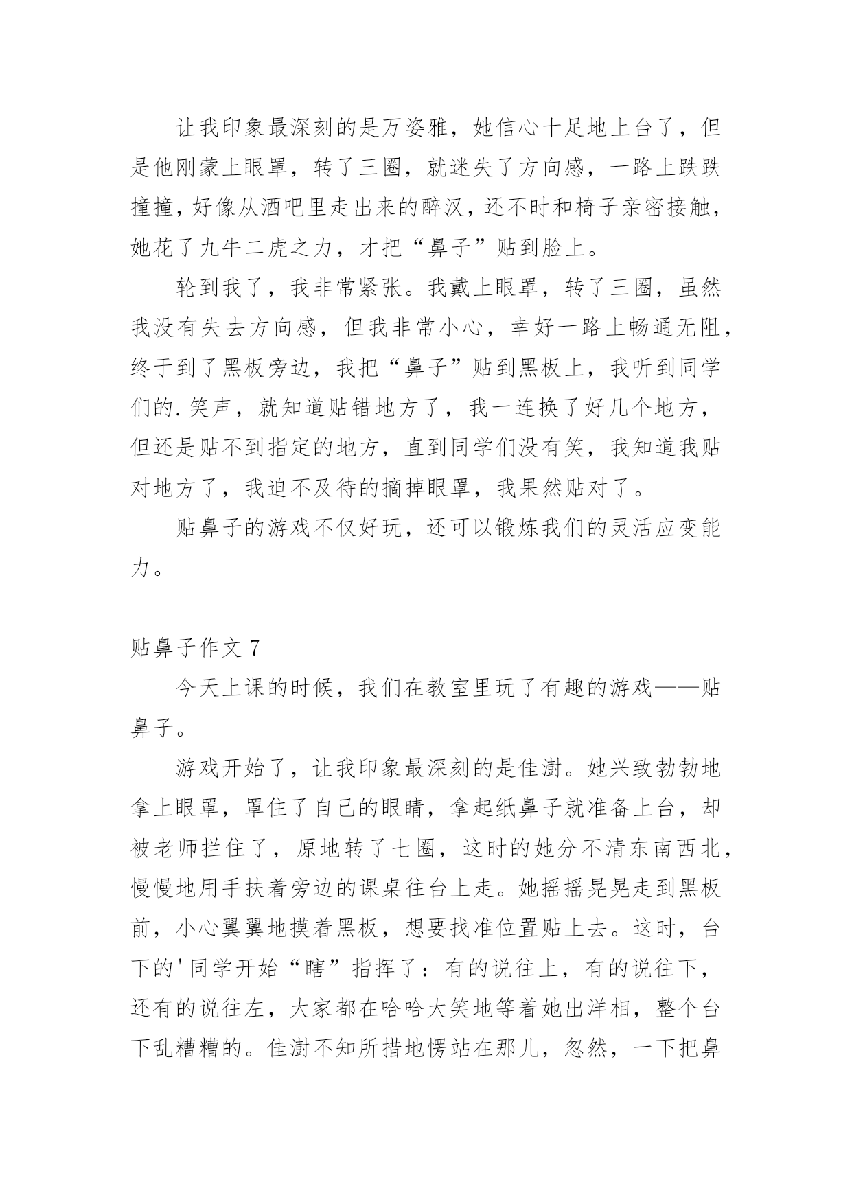 贴鼻子作文 (必备)贴鼻子作文在学习、工作、生活中,大家都不可避免地要接触到作文吧,借助作文可以宣泄心中的情感,调节自己的心情。那么,怎么去写作文呢?以下是小编收集整理的贴鼻子作文,希望对大家有所帮助。贴鼻子作文1落霞与孤鹜齐飞,秋水共长天一色。在这秋高气爽的日子里,大象老师正在森林里组织学生玩摸鼻子的游戏,让本来冷冷清清的教室顿时变成了欢乐的海洋。只见大象老师在黑板上贴了一个没有鼻子的猪八戒头像。然后把小动物们分成两队。就这样贴鼻子游戏开始了,老虎队犹如一个个猛虎。它们一个个神采奕奕,器宇轩昂,咬紧牙关,不紧不慢的来到黑板边,可是不是把鼻子贴到眼睛上,就是脸上额头上很少有贴到标准地方,逗的.小动物们哈哈大笑。轮到绵羊队了,绵羊队也不甘示弱,一个个身轻如燕,虽然带着眼罩眼前一片漆黑,但还是不动声色,毫不气馁。小绵羊队跌跌撞撞的向黑板走去,稳扎稳打的把鼻子贴在了猪八戒脸上的正中央。随着“挡”的一声铃声。绵羊队获胜了,他们终于不负所望,把鼻子贴到了猪八戒脸上的正中央。哇-!动物们拍手鼓掌,热血沸腾。铃下课了,小动物们恋恋不舍的走出了教室,期待下节大象老师的游戏课!贴鼻子作文2今天,我去青少年宫学习。我们作文课来了一位新老师,她就是——张老师。张老师一走上讲台,就在黑板上画了一个可爱的娃娃,我奇怪了,作文课画娃娃干吗?又不是美术课,令我更加奇怪的是,这个漂亮的娃娃没有鼻子。正当我们百思不得其解时,张老师公布了迷底,原来我们这节课玩一种妙趣横生的游戏——贴鼻子。张老师请了很多名同学上去,但留给我印象最深的是:第三名被张老师请上去的同学。他一走上讲台,就舔舔嘴,头东张西望的,我想他心里一定很紧张吧!下面的同学有的叫他往左边,有的'叫他往右边,有的叫他贴上面,还有的叫他贴下面,弄得他晕头转向,他抓抓头皮,犹豫了许久。最后,自作主张的贴到了娃娃的头发上,全班的同学都哈哈大笑起来,哪有鼻子长到头发上的娃娃?哈哈哈!笑声真像是一片欢闹的海洋。时间仍在一分一秒的过去,不知不觉中,这堂妙趣横生的作文课便在我们欢乐的笑声中结束了。贴鼻子作文3今天在快乐作文课上玩了一个好玩的游戏,就是粘鼻子。老师讲游戏规则的时候,大家都聚精会神地听老师宣布游戏规则。老师神秘兮兮的从桌子上拿出一个黑色的.眼罩,我想:“要不要蒙上?”游戏开始了。老师选的女选手是范子珍和高文会。范子珍和高文辉兴高采烈,昂首阔步地走向主席台。老师蒙住了高文会的眼睛。指挥官是范子珍。范子珍非常紧张。范子珍说了密码。高文会就是无法理解老师画的三角形。时间到了。范子珍着急了,跺着脚。队员们七嘴八舌地说:“前、后、左、右、上、下。”像热锅上的蚂蚁一样焦虑。对手幸灾乐祸地说:“现在你赢不了了!”结果打成平手。这个游戏真的很好玩。我想再玩一次!贴鼻子作文4今天一上课,老师就说:“我们来玩一个有趣的戳鼻子游戏!”听了老师的话,学生们都高兴得闭上了嘴。老师邀请第一个同学上去给熊猫插个鼻子。老师用红领巾蒙住她的眼睛,让她转了三圈。她慢慢摸索着自己的“鼻子”,走到讲台上贴鼻子。结果她把鼻子放在熊猫眼下。老师又叫了第二个同学,还把红领巾套在眼睛上,让她前后转了两圈。她把鼻子凑到前面,贴在熊猫眼上。大家哄堂大笑。然后,老师邀请了第三个同学。老师让她原地转来转去,弄得她晕头转向。然后,她牵着鼻子走到站台前,犹豫不决,不知道把鼻子贴在哪里。最后,他把鼻子伸到熊猫外面。没有一个贴成功。老师给大家讲了一个小把戏。第四个学生按照老师教的方法,先摸了摸纸中间的.印子,然后双手放在两边,慢慢的把手移到中间,移到中间再往下移一点,找到了鼻子的位置。最后,他成功了。这门课真的很有趣!贴鼻子作文5这个班是有趣的第二个班。老师会给我们带来什么惊喜?耶!老师邀请了米老鼠先生,他戴着一顶黑色条纹帽子。穿着蓝色的夹克,一双明亮的眼睛,脸上红色的`胭脂粉,像两个红苹果,弯弯的嘴巴像一根长长的香蕉,手里拿着一个五颜六色的礼品盒。突然,我发现米老鼠有问题。嗯?它的鼻子呢?“谁愿意帮米老鼠贴鼻子?”老师笑着问。大家争相说:“我愿意,我愿意!”老师先邀请了肖敏。老师给她戴上围巾,把她转了几圈。她摸了摸,终于摸到了黑板。她刚把鼻子拿开,学生们就大笑起来。她一摘下围巾,自己就笑了。原来是鼻子贴耳朵,老师也笑了。然后,老师请小丽、小明、小华等同学贴鼻子,大家笑啊笑。这个游戏太有趣了!下次老师会给我们带来什么样的惊喜?贴鼻子作文6今天,老师和我们玩了一个有趣的游戏——贴鼻子。老师在黑板上画了一张脸,在脸上画了眼睛、耳朵、嘴巴,就是没有鼻子,老师跟我们说:“今天玩贴鼻子。”这时,同学们一蹦三尺高,班里就像炸开了锅。让我印象最深刻的是万姿雅,她信心十足地上台了,但是他刚蒙上眼罩,转了三圈,就迷失了方向感,一路上跌跌撞撞,好像从酒吧里走出来的醉汉,还不时和椅子亲密