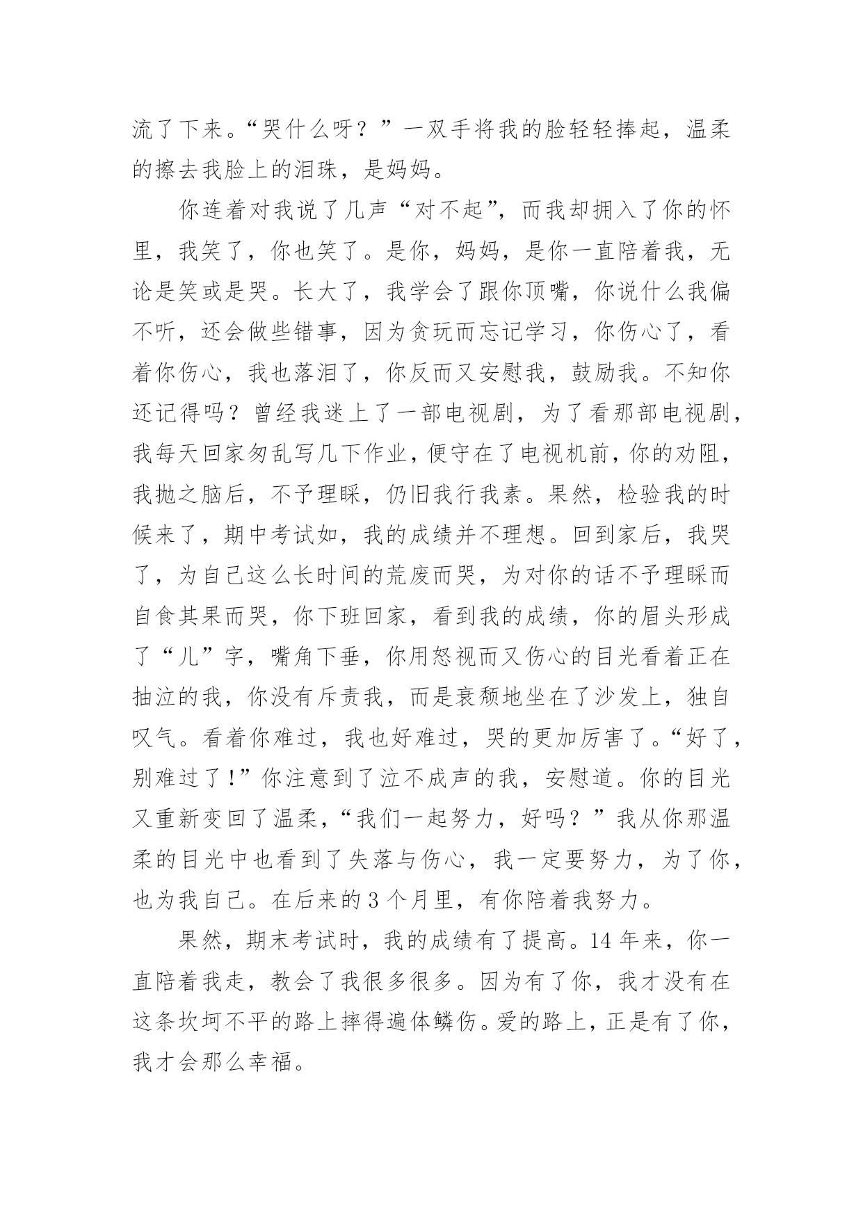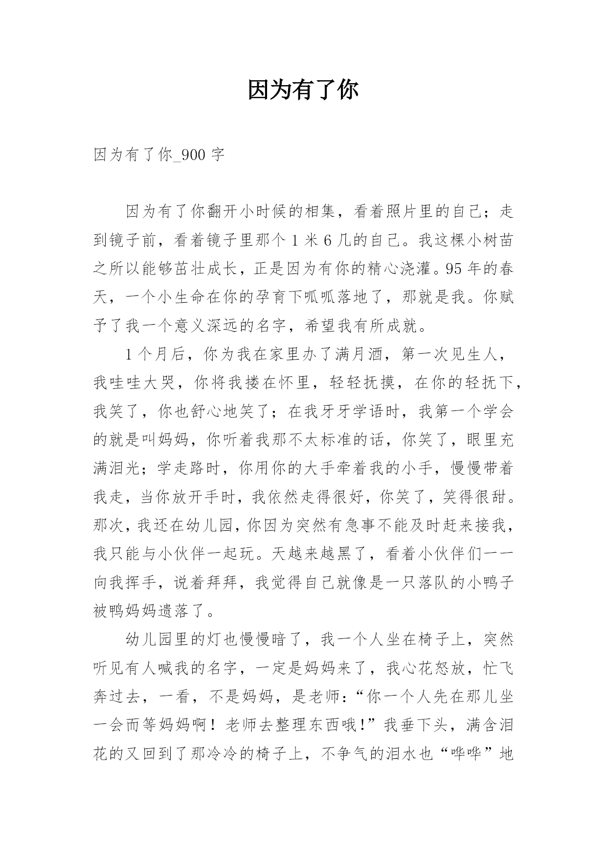 因为有了你 因为有了你_900字因为有了你翻开小时候的相集,看着照片里的自己;走到镜子前,看着镜子里那个1米6几的自己。我这棵小树苗之所以能够茁壮成长,正是因为有你的精心浇灌。95年的春天,一个小生命在你的孕育下呱呱落地了,那就是我。你赋予了我一个意义深远的名字,希望我有所成就。1个月后,你为我在家里办了满月酒,第一次见生人,我哇哇大哭,你将我搂在怀里,轻轻抚摸,在你的轻抚下,我笑了,你也舒心地笑了;在我牙牙学语时,我第一个学会的就是叫妈妈,你听着我那不太标准的话,你笑了,眼里充满泪光;学走路时,你用你的大手牵着我的小手,慢慢带着我走,当你放开手时,我依然走得很好,你笑了,笑得很甜。那次,我还在幼儿园,你因为突然有急事不能及时赶来接我,我只能与小伙伴一起玩。天越来越黑了,看着小伙伴们一一向我挥手,说着拜拜,我觉得自己就像是一只落队的小鸭子被鸭妈妈遗落了。幼儿园里的灯也慢慢暗了,我一个人坐在椅子上,突然听见有人喊我的名字,一定是妈妈来了,我心花怒放,忙飞奔过去,一看,不是妈妈,是老师:“你一个人先在那儿坐一会而等妈妈啊!老师去整理东西哦!”我垂下头,满含泪花的又回到了那冷冷的椅子上,不争气的泪水也“哗哗”地流了下来。“哭什么呀?”一双手将我的脸轻轻捧起,温柔的擦去我脸上的泪珠,是妈妈。你连着对我说了几声“对不起”,而我却拥入了你的怀里,我笑了,你也笑了。是你,妈妈,是你一直陪着我,无论是笑或是哭。长大了,我学会了跟你顶嘴,你说什么我偏不听,还会做些错事,因为贪玩而忘记学习,你伤心了,看着你伤心,我也落泪了,你反而又安慰我,鼓励我。不知你还记得吗?曾经我迷上了一部电视剧,为了看那部电视剧,我每天回家匆乱写几下作业,便守在了电视机前,你的劝阻,我抛之脑后,不予理睬,仍旧我行我素。果然,检验我的时候来了,期中考试如,我的成绩并不理想。回到家后,我哭了,为自己这么长时间的荒废而哭,为对你的话不予理睬而自食其果而哭,你下班回家,看到我的成绩,你的眉头形成了“儿”字,嘴角下垂,你用怒视而又伤心的目光看着正在抽泣的我,你没有斥责我,而是衰颓地坐在了沙发上,独自叹气。看着你难过,我也好难过,哭的更加厉害了。“好了,别难过了!”你注意到了泣不成声的我,安慰道。你的目光又重新变回了温柔,“我们一起努力,好吗?”我从你那温柔的目光中也看到了失落与伤心,我一定要努力,为了你,也为我自己。在后来的3个月里,有你陪着我努力。果然,期末考试时,我的成绩有了提高。14年来,你一直陪着我走,教会了我很多很多。因为有了你,我才没有在这条坎坷不平的路上摔得遍体鳞伤。爱的路上,正是有了你,我才会那么幸福。