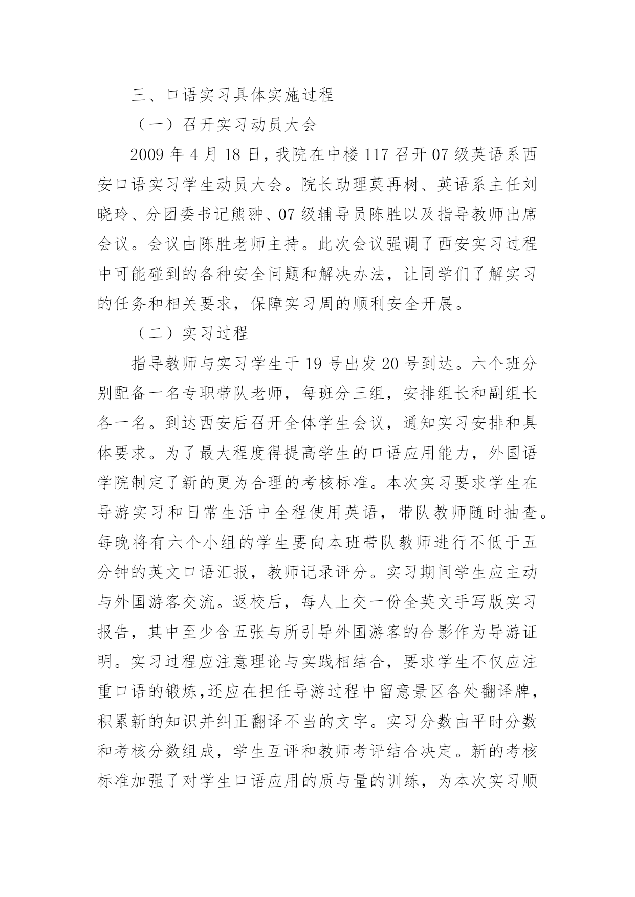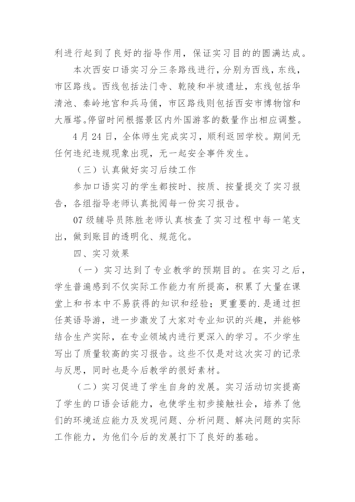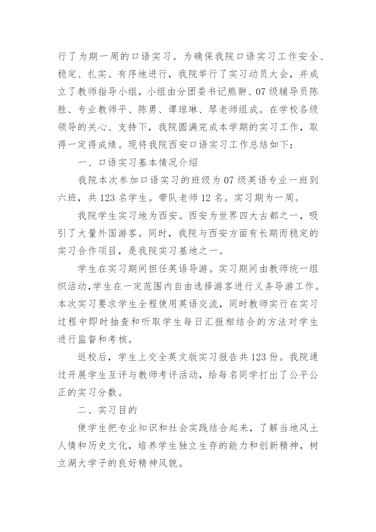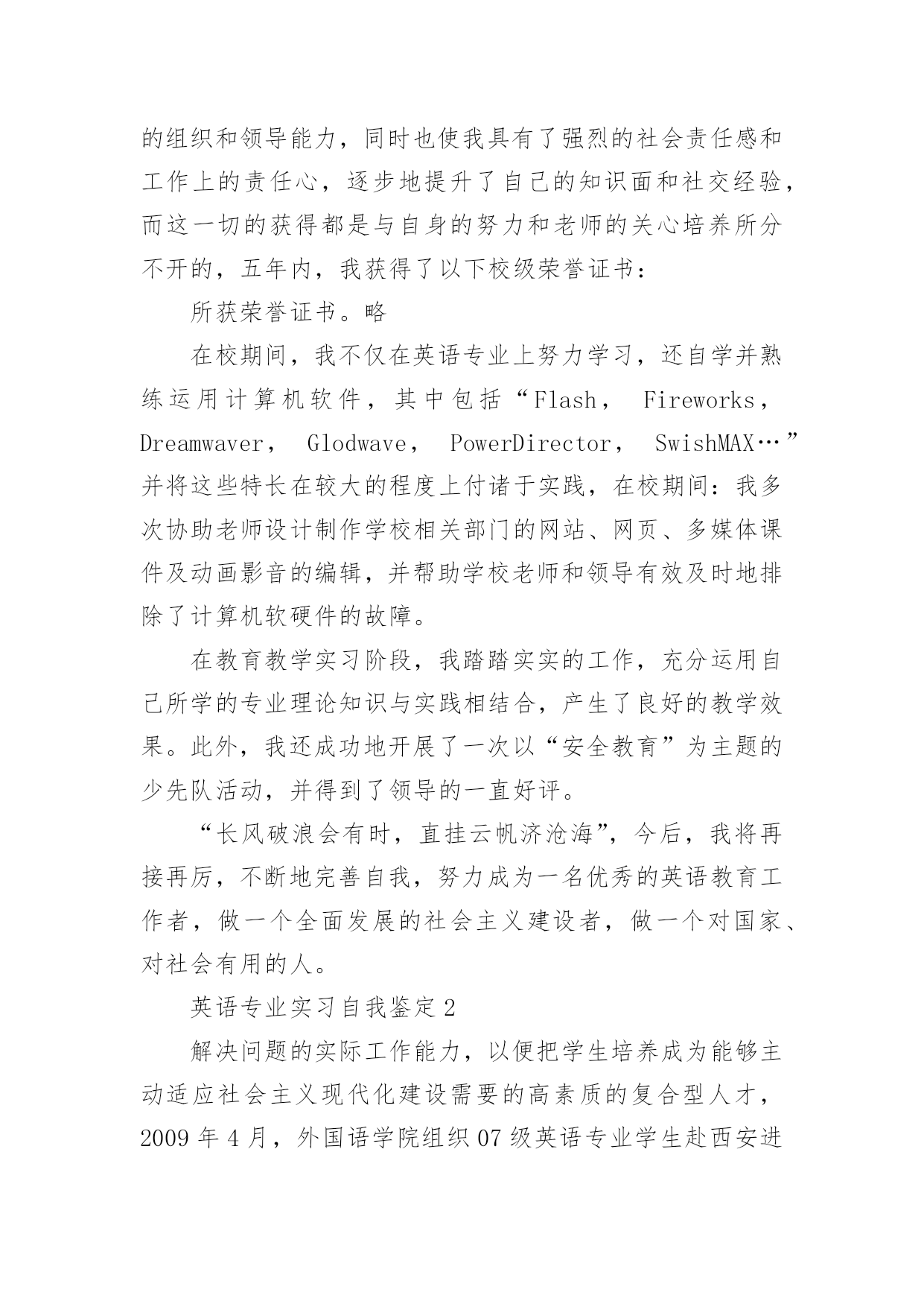 英语专业实习自我鉴定 英语专业实习自我鉴定1光阴似箭,一晃五年已悄然而过,在xxxx五年的学习和生活中,我一直坚持明礼诚信、爱国守法、坚持实事求是的思想和作风,勇于追求真理,具有强烈的爱国主义情感和高度的社会责任感。在日常的生活和学习中,我能够做到团结同学、乐于助人,可以说:过去的五年,是我逐渐开始从稚嫩走向成熟的五年,五年里,使我经历了各种甘甜和酸楚、欢笑和泪水,在一次又一次的经历中,我慢慢地成长着……寒窗数载,在xxxx“崇文崇雅”校风的指导下,在那独特的'人文气息的熏陶中,我刻苦努力、自强不息,一直保持着强烈的求知欲和学习意识,一方面加强专业知识的系统学习,以提高自己的专业技能,另一方面我也注重个人多方面的能力培养、丰富阅历、开阔视野、锻炼自我,为适应当今纷繁多变、充满挑战与机遇的社会做好充分的准备。在过去的五年,我通过自己的努力,获得了以下的专业证书:所获专业证书略在学校,我努力学习各种知识技能,并积极参加并组织班级学校的各学生团体、及课外活动,以此来锻炼自己、拓宽了视野、陶冶了情操,以下是我五年在学校里担任的职务:所任职务。略以上所有的工作和学习经历在很大的程度上培养了我的组织和领导能力,同时也使我具有了强烈的社会责任感和工作上的责任心,逐步地提升了自己的知识面和社交经验,而这一切的获得都是与自身的努力和老师的关心培养所分不开的,五年内,我获得了以下校级荣誉证书:所获荣誉证书。略在校期间,我不仅在英语专业上努力学习,还自学并熟练运用计算机软件,其中包括“Flash,Fireworks,Dreamwaver,Glodwave,PowerDirector,SwishMAX…”并将这些特长在较大的程度上付诸于实践,在校期间:我多次协助老师设计制作学校相关部门的网站、网页、多媒体课件及动画影音的编辑,并帮助学校老师和领导有效及时地排除了计算机软硬件的故障。在教育教学实习阶段,我踏踏实实的工作,充分运用自己所学的专业理论知识与实践相结合,产生了良好的教学效果。此外,我还成功地开展了一次以“安全教育”为主题的少先队活动,并得到了领导的一直好评。“长风破浪会有时,直挂云帆济沧海”,今后,我将再接再厉,不断地完善自我,努力成为一名优秀的英语教育工作者,做一个全面发展的社会主义建设者,做一个对国家、对社会有用的人。英语专业实习自我鉴定2解决问题的实际工作能力,以便把学生培养成为能够主动适应社会主义现代化建设需要的高素质的复合型人才,2009年4月,外国语学院组织07级英语专业学生赴西安进行了为期一周的口语实习。为确保我院口语实习工作安全、稳定、扎实、有序地进行,我院举行了实习动员大会,并成立了教师指导小组,小组由分团委书记熊翀、07级辅导员陈胜、专业教师平、陈勇、谭琼琳、琴老师组成。在学校各级领导的关心、支持下,我院圆满完成本学期的实习工作,取得一定得成绩。现将我院西安口语实习工作总结如下:一、口语实习基本情况介绍我院本次参加口语实习的班级为07级英语专业一班到六班,共123名学生。带队老师12名。实习期为一周。我院学生实习地为西安。西安为世界四大古都之一,吸引了大量外国游客。同时,我院与西安方面有长期而稳定的实习合作项目,是我院实习基地之一。学生在实习期间担任英语导游。实习期间由教师统一组织活动,学生在一定范围内自由选择游客进行义务导游工作。本次实习要求学生全程使用英语交流,同时教师实行在实习过程中即时抽查和听取学生每日汇报相结合的方法对学生进行监督和考核。返校后,学生上交全英文版实习报告共123份。我院通过开展学生互评与教师考评活动,给每名同学打出了公平公正的实习分数。二、实习目的使学生把专业知识和社会实践结合起来,了解当地风土人情和历史文化,培养学生独立生存的能力和创新精神,树立湖大学子的良好精神风貌。三、口语实习具体实施过程(一)召开实习动员大会2009年4月18日,我院在中楼117召开07级英语系西安口语实习学生动员大会。院长助理莫再树、英语系主任刘晓玲、分团委书记熊翀、07级辅导员陈胜以及指导教师出席会议。会议由陈胜老师主持。此次会议强调了西安实习过程中可能碰到的各种安全问题和解决办法,让同学们了解实习的任务和相关要求,保障实习周的顺利安全开展。(二)实习过程指导教师与实习学生于19号出发20号到达。六个班分别配备一名专职带队老师,每班分三组,安排组长和副组长各一名。到达西安后召开全体学生会议,通知实习安排和具体要求。为了最大程度得提高学生的口语应用能力,外国语学院制定了新的更为合理的考核标准。本次实习要求学生在导游实习和日常生活中全程使用英语,带队教师随时抽查。每晚将有六个小组的学生要向本班带队教师进行不低于五分钟的英文口语汇报,教师记录评分。实习期间学生应主动与外国游客交流。返校后,每人上交一份全英文手写版实习报告,