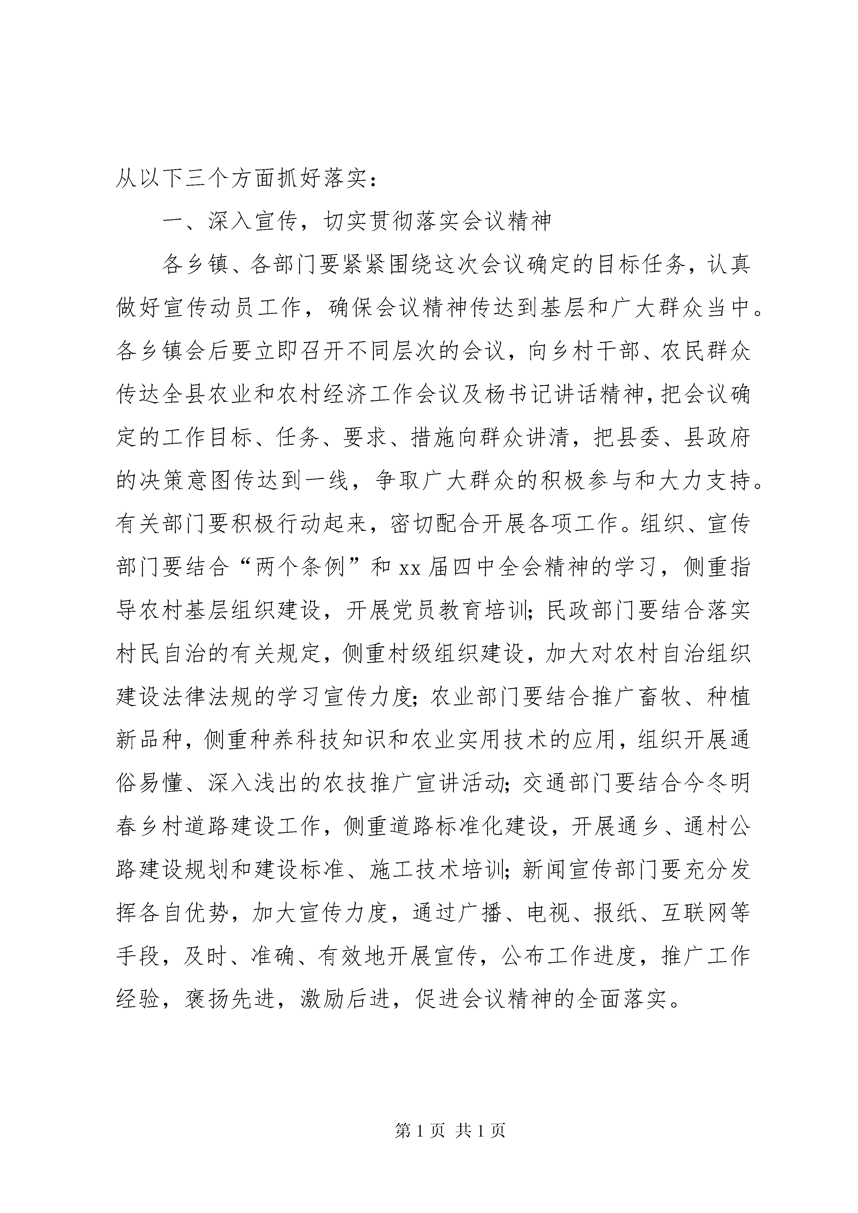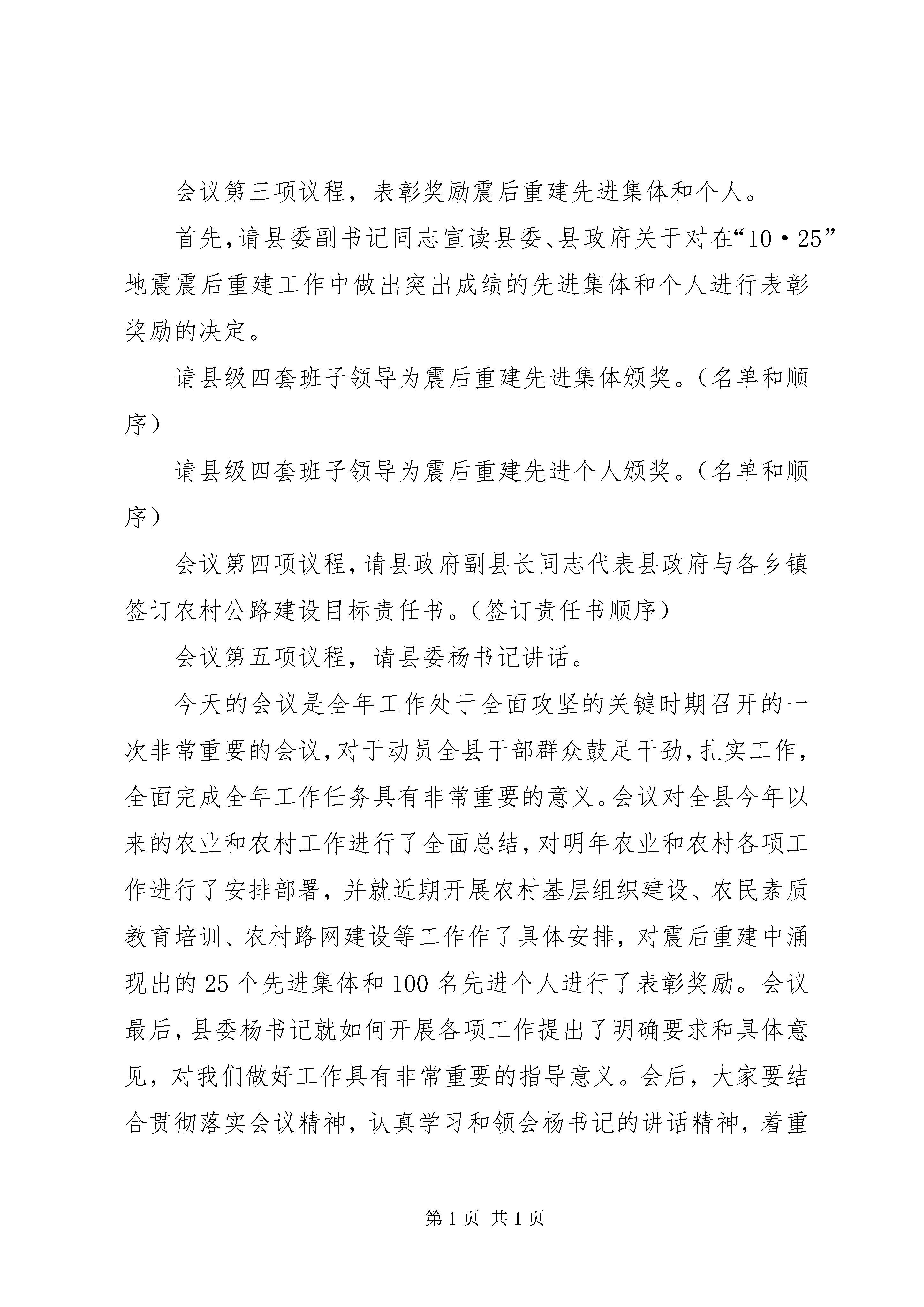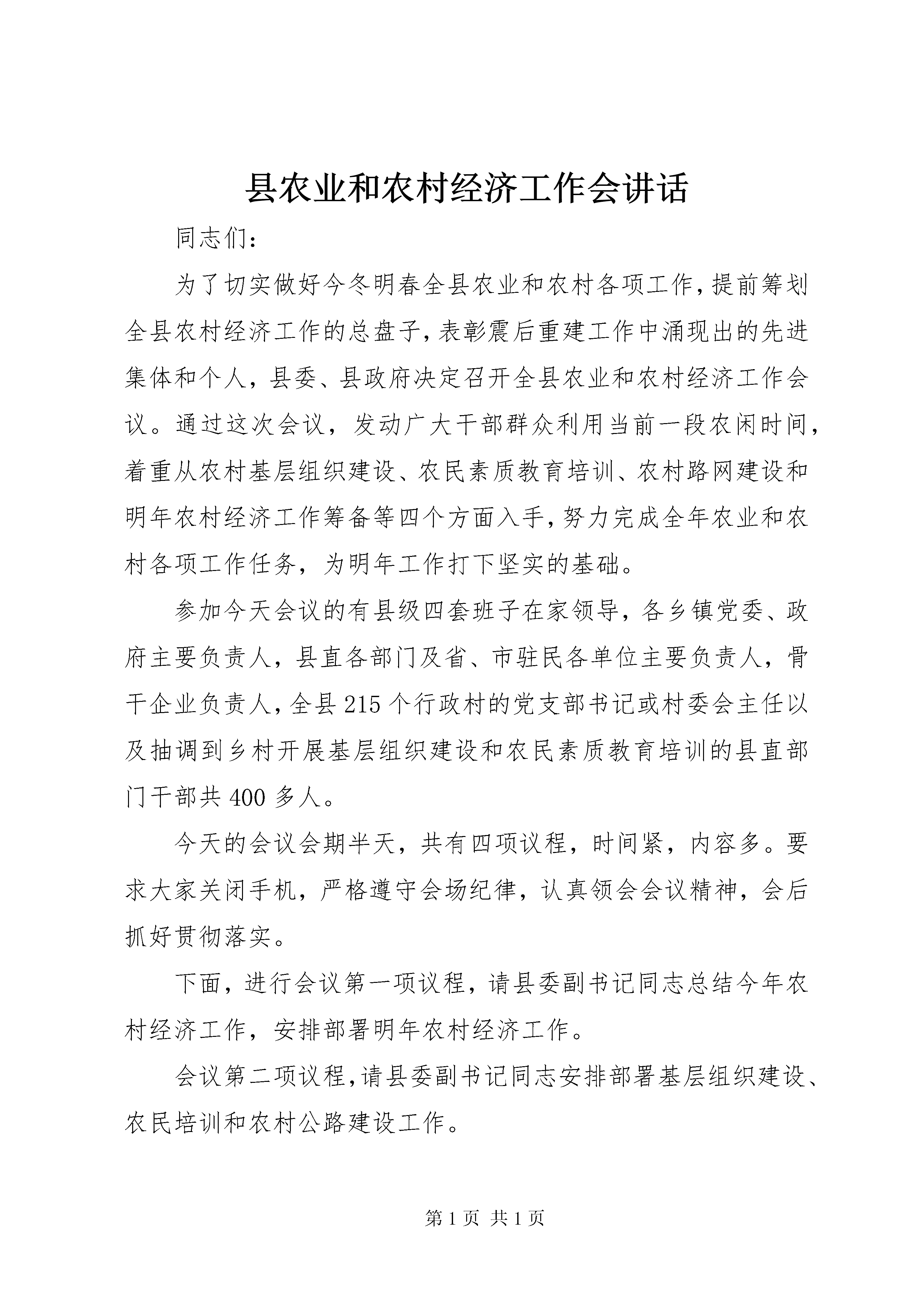 县农业和农村经济工作会讲话同志们:为了切实做好今冬明春全县农业和农村各项工作,提前筹划全县农村经济工作的总盘子,表彰震后重建工作中涌现出的先进集体和个人,县委、县政府决定召开全县农业和农村经济工作会议。通过这次会议,发动广大干部群众利用当前一段农闲时间,着重从农村基层组织建设、农民素质教育培训、农村路网建设和明年农村经济工作筹备等四个方面入手,努力完成全年农业和农村各项工作任务,为明年工作打下坚实的基础。参加今天会议的有县级四套班子在家领导,各乡镇党委、政府主要负责人,县直各部门及省、市驻民各单位主要负责人,骨干企业负责人,全县215个行政村的党支部书记或村委会主任以及抽调到乡村开展基层组织建设和农民素质教育培训的县直部门干部共400多人。今天的会议会期半天,共有四项议程,时间紧,内容多。要求大家关闭手机,严格遵守会场纪律,认真领会会议精神,会后抓好贯彻落实。下面,进行会议第一项议程,请县委副书记同志总结今年农村经济工作,安排部署明年农村经济工作。会议第二项议程,请县委副书记同志安排部署基层组织建设、农民培训和农村公路建设工作。会议第三项议程,表彰奖励震后重建先进集体和个人。首先,请县委副书记同志宣读县委、县政府关于对在“10·25”地震震后重建工作中做出突出成绩的先进集体和个人进行表彰奖励的决定。请县级四套班子领导为震后重建先进集体颁奖。(名单和顺序)请县级四套班子领导为震后重建先进个人颁奖。(名单和顺序)会议第四项议程,请县政府副县长同志代表县政府与各乡镇签订农村公路建设目标责任书。(签订责任书顺序)会议第五项议程,请县委杨书记讲话。今天的会议是全年工作处于全面攻坚的关键时期召开的一次非常重要的会议,对于动员全县干部群众鼓足干劲,扎实工作,全面完成全年工作任务具有非常重要的意义。会议对全县今年以来的农业和农村工作进行了全面总结,对明年农业和农村各项工作进行了安排部署,并就近期开展农村基层组织建设、农民素质教育培训、农村路网建设等工作作了具体安排,对震后重建中涌现出的25个先进集体和100名先进个人进行了表彰奖励。会议最后,县委杨书记就如何开展各项工作提出了明确要求和具体意见,对我们做好工作具有非常重要的指导意义。会后,大家要结合贯彻落实会议精神,认真学习和领会杨书记的讲话精神,着重从以下三个方面抓好落实:一、深入宣传,切实贯彻落实会议精神各乡镇、各部门要紧紧围绕这次会议确定的目标任务,认真做好宣传动员工作,确保会议精神传达到基层和广大群众当中。各乡镇会后要立即召开不同层次的会议,向乡村干部、农民群众传达全县农业和农村经济工作会议及杨书记讲话精神,把会议确定的工作目标、任务、要求、措施向群众讲清,把县委、县政府的决策意图传达到一线,争取广大群众的积极参与和大力支持。有关部门要积极行动起来,密切配合开展各项工作。组织、宣传部门要结合“两个条例”和xx届四中全会精神的学习,侧重指导农村基层组织建设,开展党员教育培训;民政部门要结合落实村民自治的有关规定,侧重村级组织建设,加大对农村自治组织建设法律法规的学习宣传力度;农业部门要结合推广畜牧、种植新品种,侧重种养科技知识和农业实用技术的应用,组织开展通俗易懂、深入浅出的农技推广宣讲活动;交通部门要结合今冬明春乡村道路建设工作,侧重道路标准化建设,开展通乡、通村公路建设规划和建设标准、施工技术培训;新闻宣传部门要充分发挥各自优势,加大宣传力度,通过广播、电视、报纸、互联网等手段,及时、准确、有效地开展宣传,公布工作进度,推广工作经验,褒扬先进,激励后进,促进会议精神的全面落实。