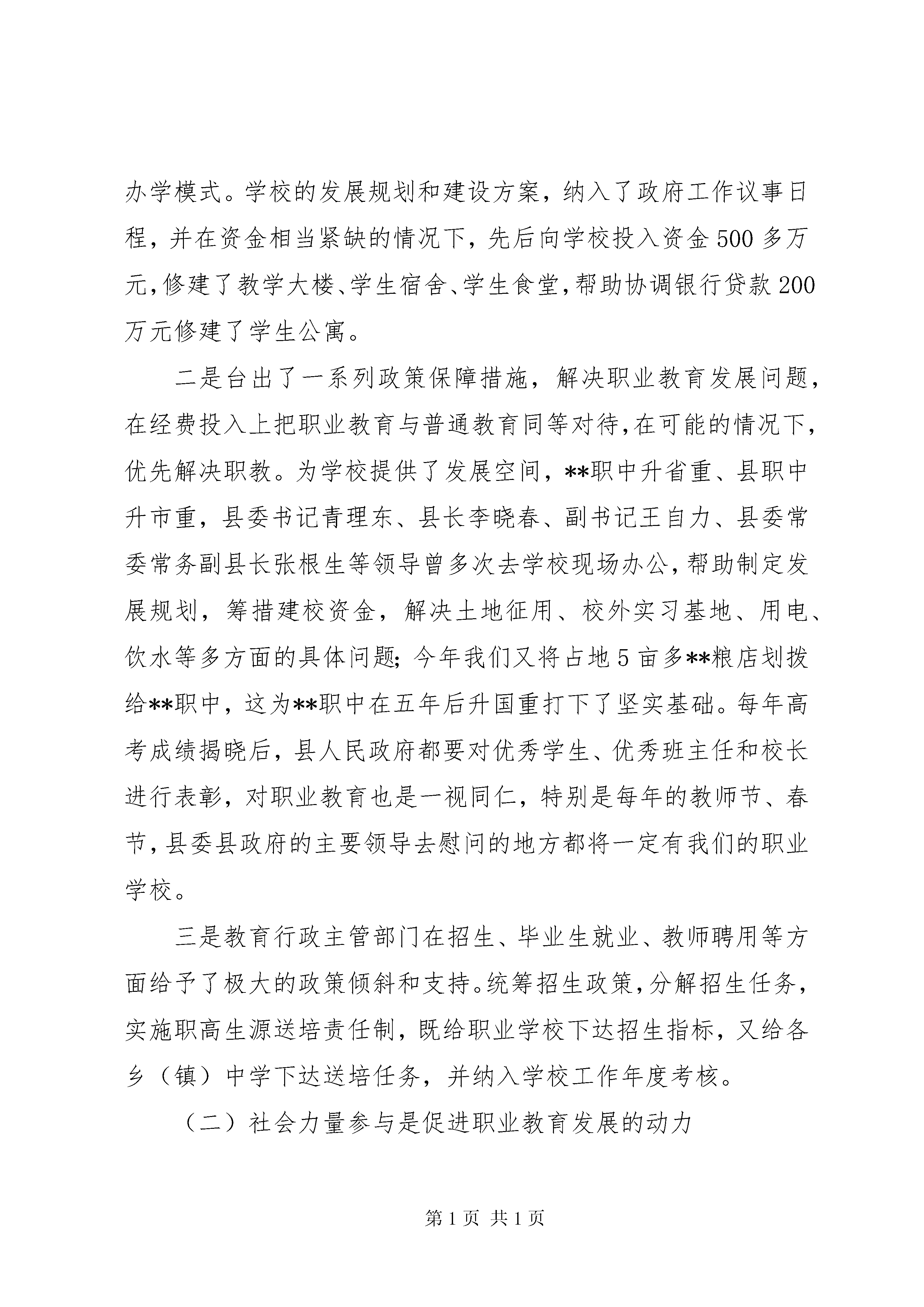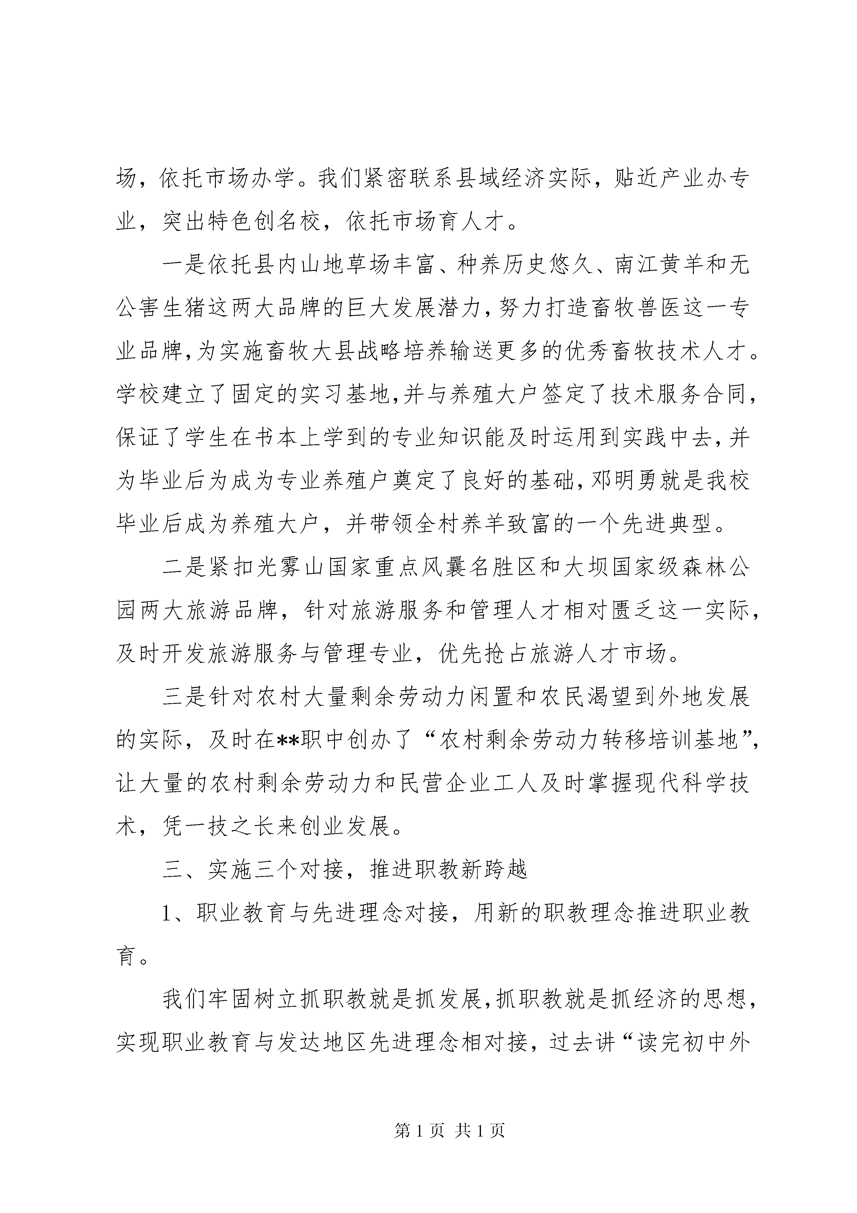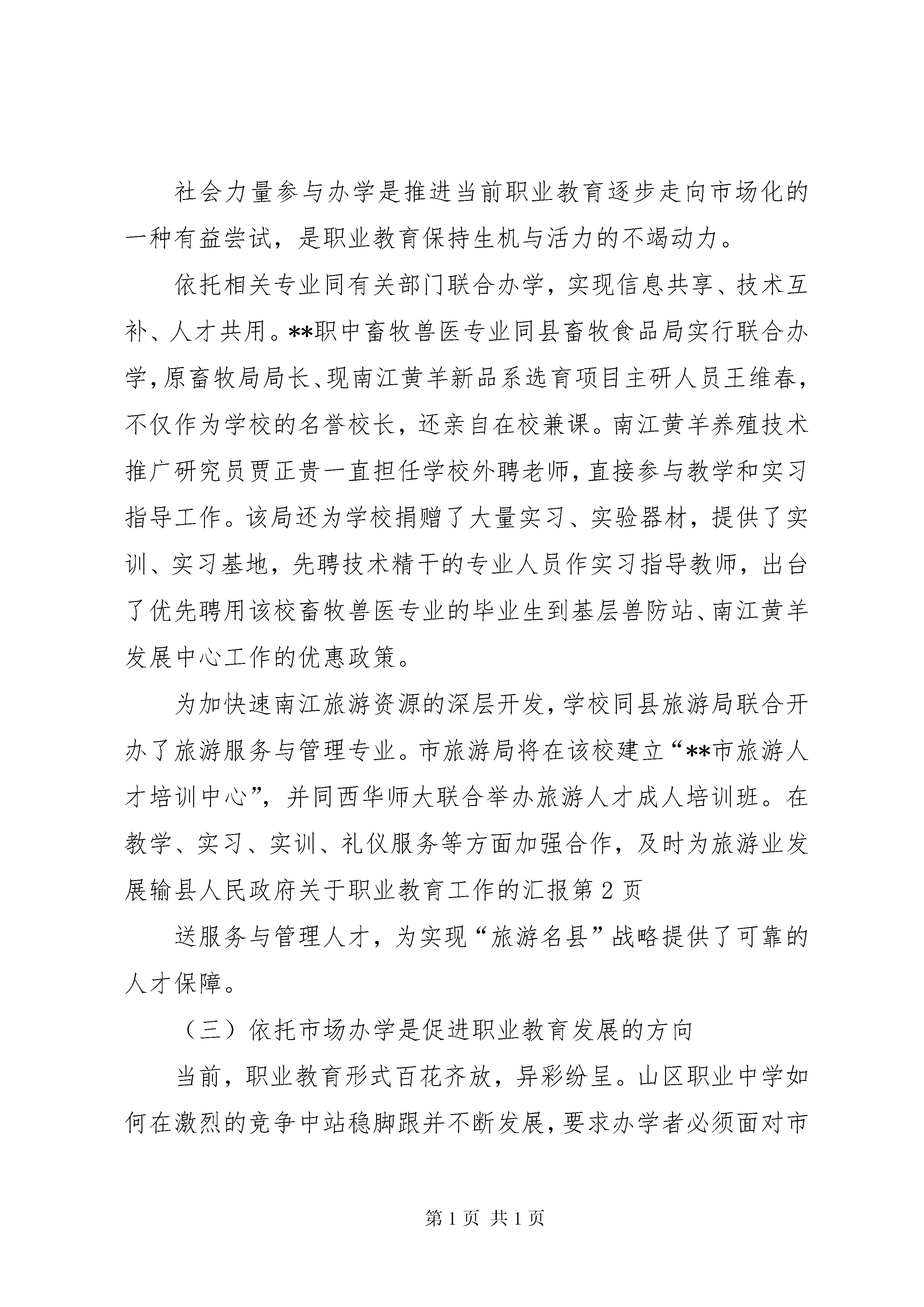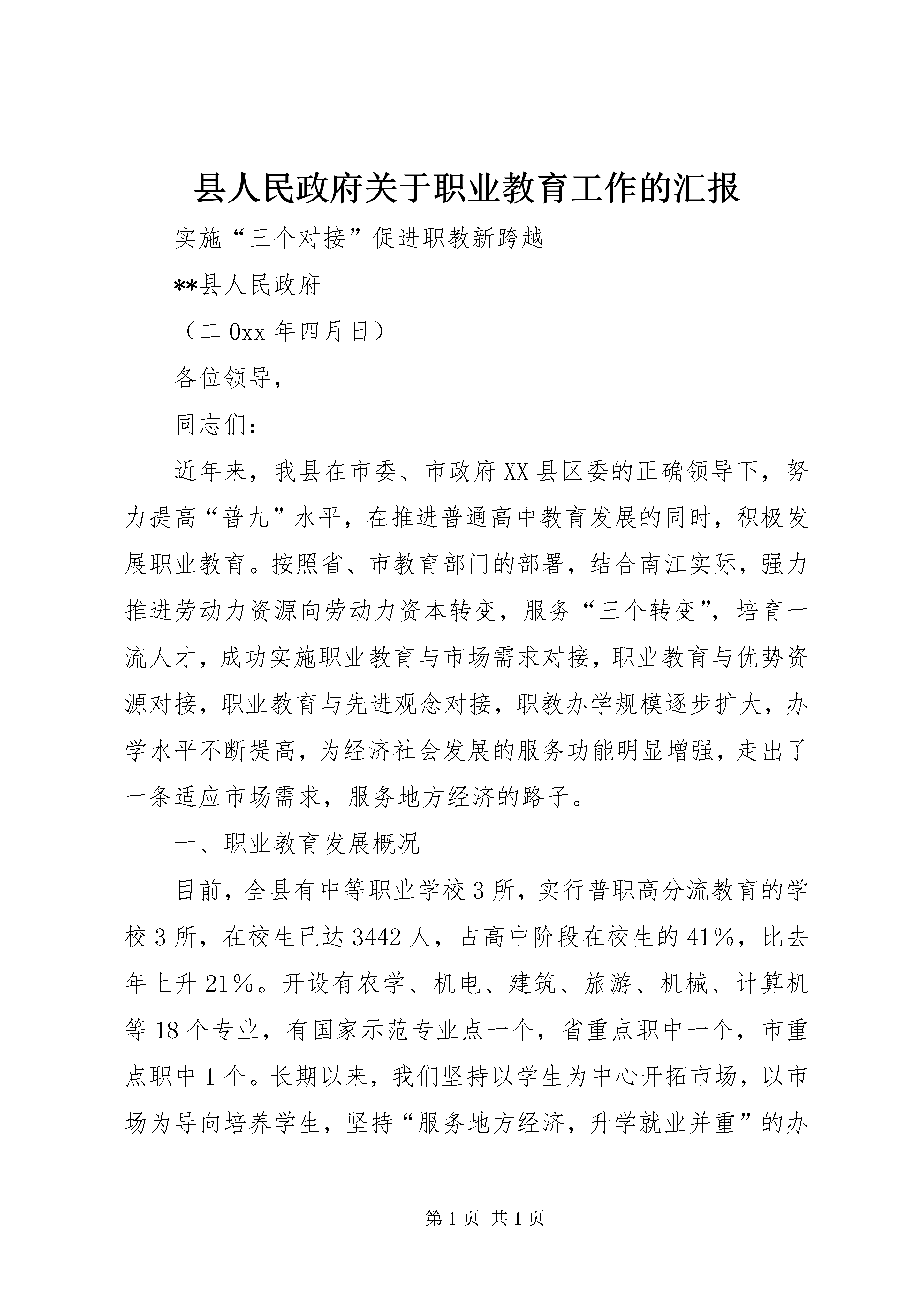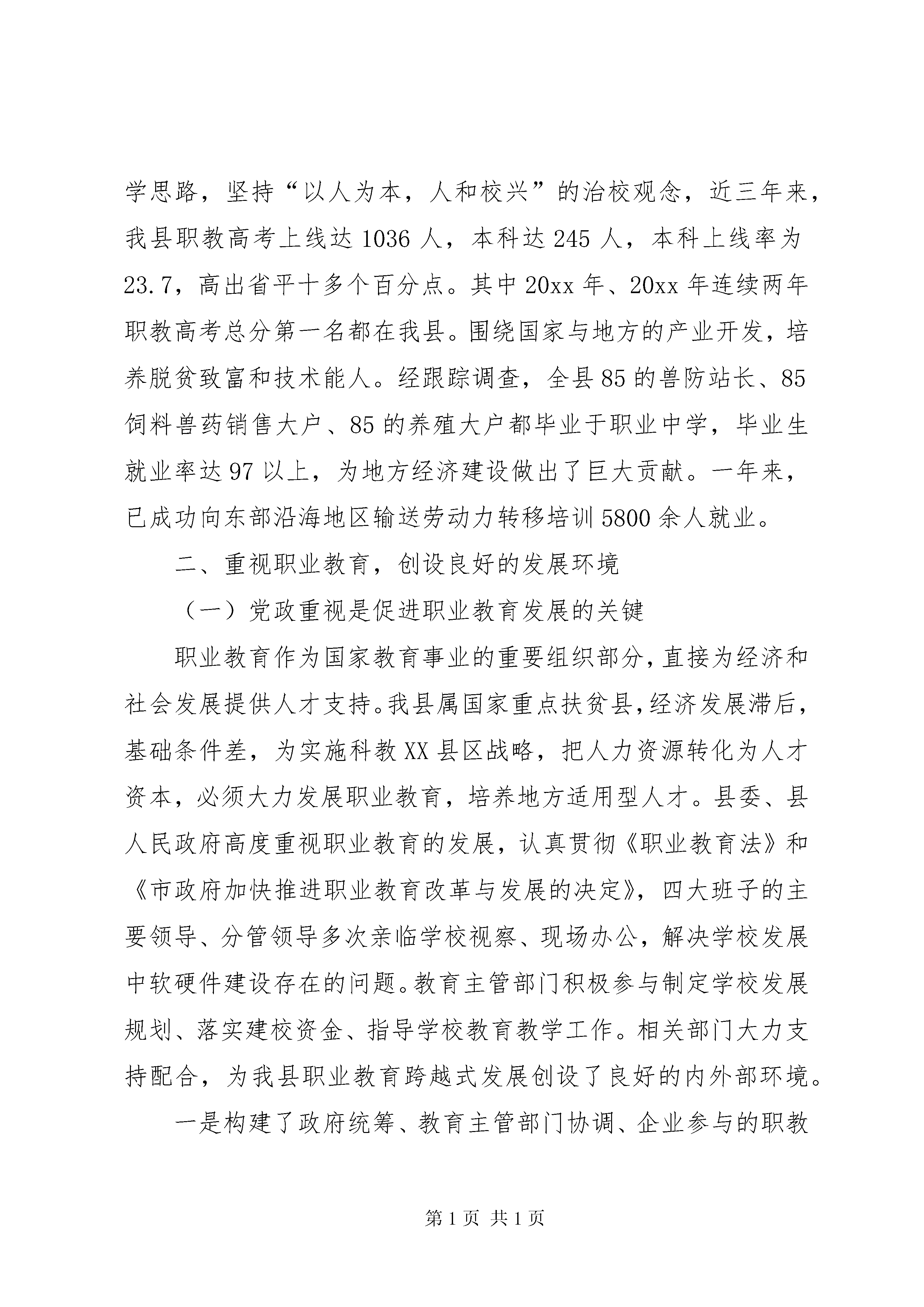 县人民政府关于职业教育工作的汇报实施“三个对接”促进职教新跨越**县人民政府(二0xx年四月日)各位领导,同志们:近年来,我县在市委、市政府XX县区委的正确领导下,努力提高“普九”水平,在推进普通高中教育发展的同时,积极发展职业教育。按照省、市教育部门的部署,结合南江实际,强力推进劳动力资源向劳动力资本转变,服务“三个转变”,培育一流人才,成功实施职业教育与市场需求对接,职业教育与优势资源对接,职业教育与先进观念对接,职教办学规模逐步扩大,办学水平不断提高,为经济社会发展的服务功能明显增强,走出了一条适应市场需求,服务地方经济的路子。一、职业教育发展概况目前,全县有中等职业学校3所,实行普职高分流教育的学校3所,在校生已达3442人,占高中阶段在校生的41%,比去年上升21%。开设有农学、机电、建筑、旅游、机械、计算机等18个专业,有国家示范专业点一个,省重点职中一个,市重点职中1个。长期以来,我们坚持以学生为中心开拓市场,以市场为导向培养学生,坚持“服务地方经济,升学就业并重”的办学思路,坚持“以人为本,人和校兴”的治校观念,近三年来,我县职教高考上线达1036人,本科达245人,本科上线率为23.7,高出省平十多个百分点。其中20xx年、20xx年连续两年职教高考总分第一名都在我县。围绕国家与地方的产业开发,培养脱贫致富和技术能人。经跟踪调查,全县85的兽防站长、85饲料兽药销售大户、85的养殖大户都毕业于职业中学,毕业生就业率达97以上,为地方经济建设做出了巨大贡献。一年来,已成功向东部沿海地区输送劳动力转移培训5800余人就业。二、重视职业教育,创设良好的发展环境(一)党政重视是促进职业教育发展的关键职业教育作为国家教育事业的重要组织部分,直接为经济和社会发展提供人才支持。我县属国家重点扶贫县,经济发展滞后,基础条件差,为实施科教XX县区战略,把人力资源转化为人才资本,必须大力发展职业教育,培养地方适用型人才。县委、县人民政府高度重视职业教育的发展,认真贯彻《职业教育法》和《市政府加快推进职业教育改革与发展的决定》,四大班子的主要领导、分管领导多次亲临学校视察、现场办公,解决学校发展中软硬件建设存在的问题。教育主管部门积极参与制定学校发展规划、落实建校资金、指导学校教育教学工作。相关部门大力支持配合,为我县职业教育跨越式发展创设了良好的内外部环境。一是构建了政府统筹、教育主管部门协调、企业参与的职教办学模式。学校的发展规划和建设方案,纳入了政府工作议事日程,并在资金相当紧缺的情况下,先后向学校投入资金500多万元,修建了教学大楼、学生宿舍、学生食堂,帮助协调银行贷款200万元修建了学生公寓。二是台出了一系列政策保障措施,解决职业教育发展问题,在经费投入上把职业教育与普通教育同等对待,在可能的情况下,优先解决职教。为学校提供了发展空间,**职中升省重、县职中升市重,县委书记青理东、县长李晓春、副书记王自力、县委常委常务副县长张根生等领导曾多次去学校现场办公,帮助制定发展规划,筹措建校资金,解决土地征用、校外实习基地、用电、饮水等多方面的具体问题;今年我们又将占地5亩多**粮店划拨给**职中,这为**职中在五年后升国重打下了坚实基础。每年高考成绩揭晓后,县人民政府都要对优秀学生、优秀班主任和校长进行表彰,对职业教育也是一视同仁,特别是每年的教师节、春节,县委县政府的主要领导去慰问的地方都将一定有我们的职业学校。三是教育行政主管部门在招生、毕业生就业、教师聘用等方面给予了极大的政策倾斜和支持。统筹招生政策,分解招生任务,实施职高生源送培责任制,既给职业学校下达招生指标,又给各乡(镇)中学下达送培任务,并纳入学校工作年度考核。(二)社会力量参与是促进职业教育发展的动力社会力量参与办学是推进当前职业教育逐步走向市场化的一种有益尝试,是职业教育保持生机与活力的不竭动力。依托相关专业同有关部门联合办学,实现信息共享、技术互补、人才共用。**职中畜牧兽医专业同县畜牧食品局实行联合办学,原畜牧局局长、现南江黄羊新品系选育项目主研人员王维春,不仅作为学校的名誉校长,还亲自在校兼课。南江黄羊养殖技术推广研究员贾正贵一直担任学校外聘老师,直接参与教学和实习指导工作。该局还为学校捐赠了大量实习、实验器材,提供了实训、实习基地,先聘技术精干的专业人员作实习指导教师,出台了优先聘用该校畜牧兽医专业的毕业生到基层兽防站、南江黄羊发展中心工作的优惠政策。为加快速南江旅游资源的深层开发,学校同县旅游局联合开办了旅游服务与管理专业。市旅游局将在该校建立“**市旅游人才培训中心”,并同西华师大联合举办旅游人才成人培训班。在教学、实习、实训、礼仪服务等方面加强合作,及时为旅游业发展输县人民政府关于职业教育工作的汇报送服务与管理人
