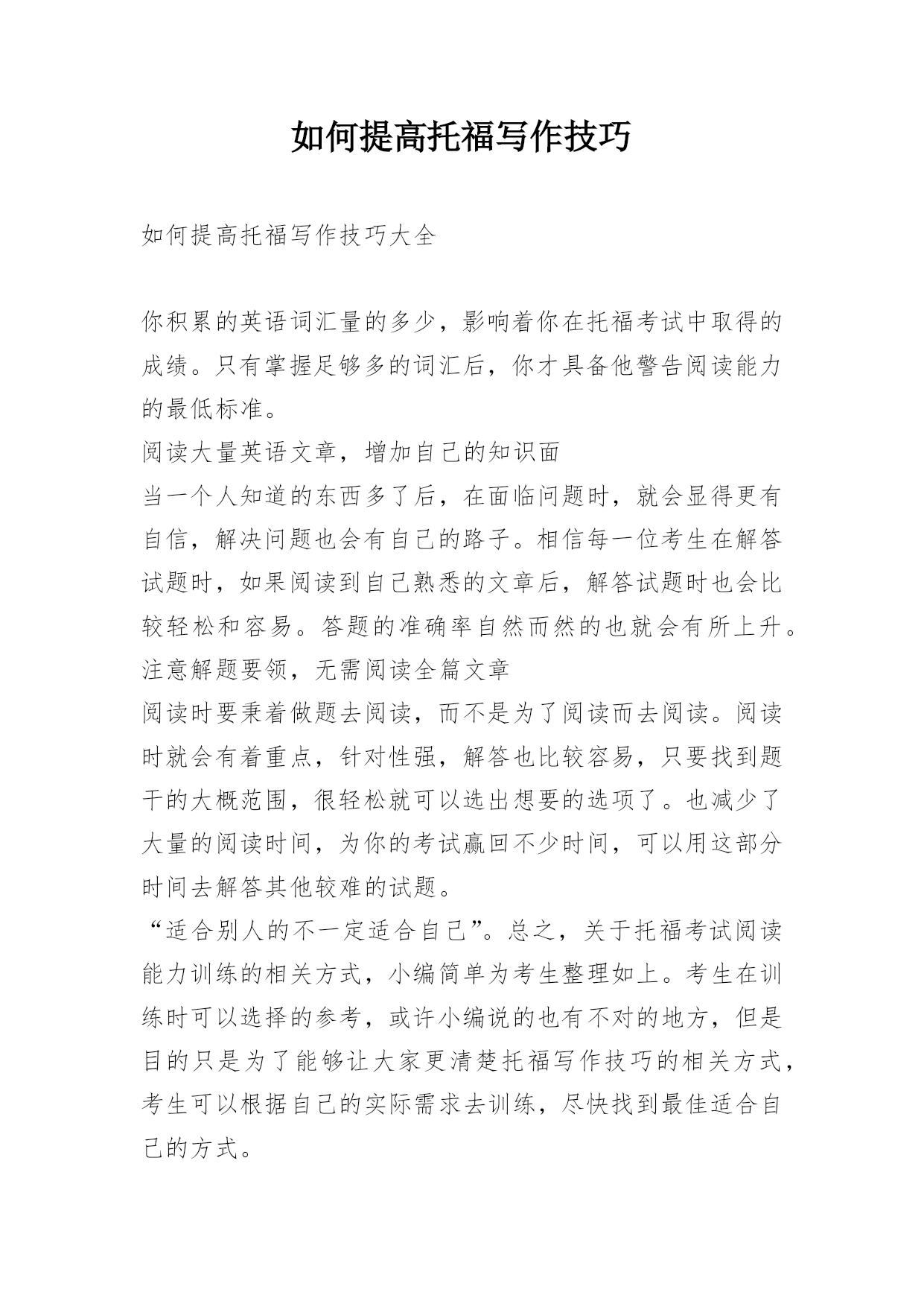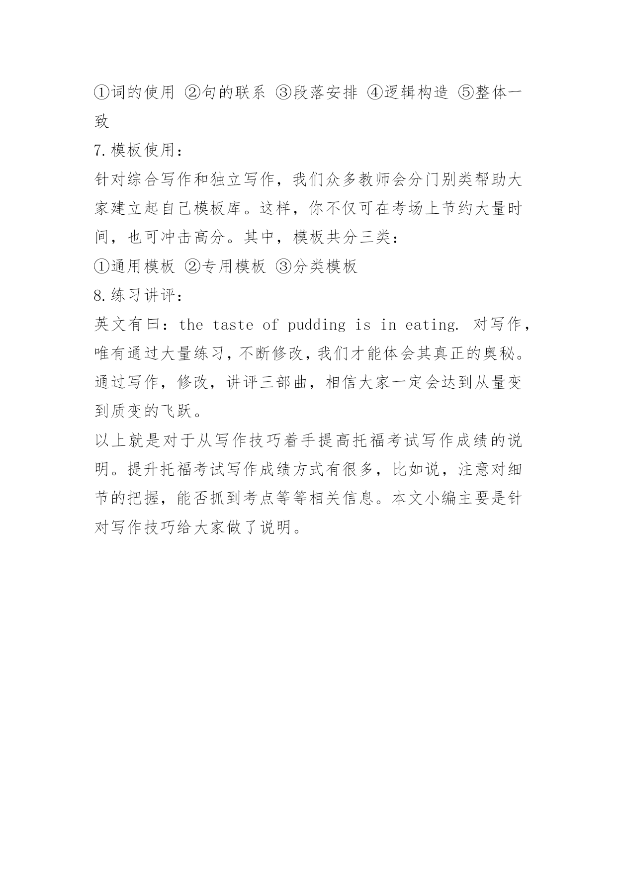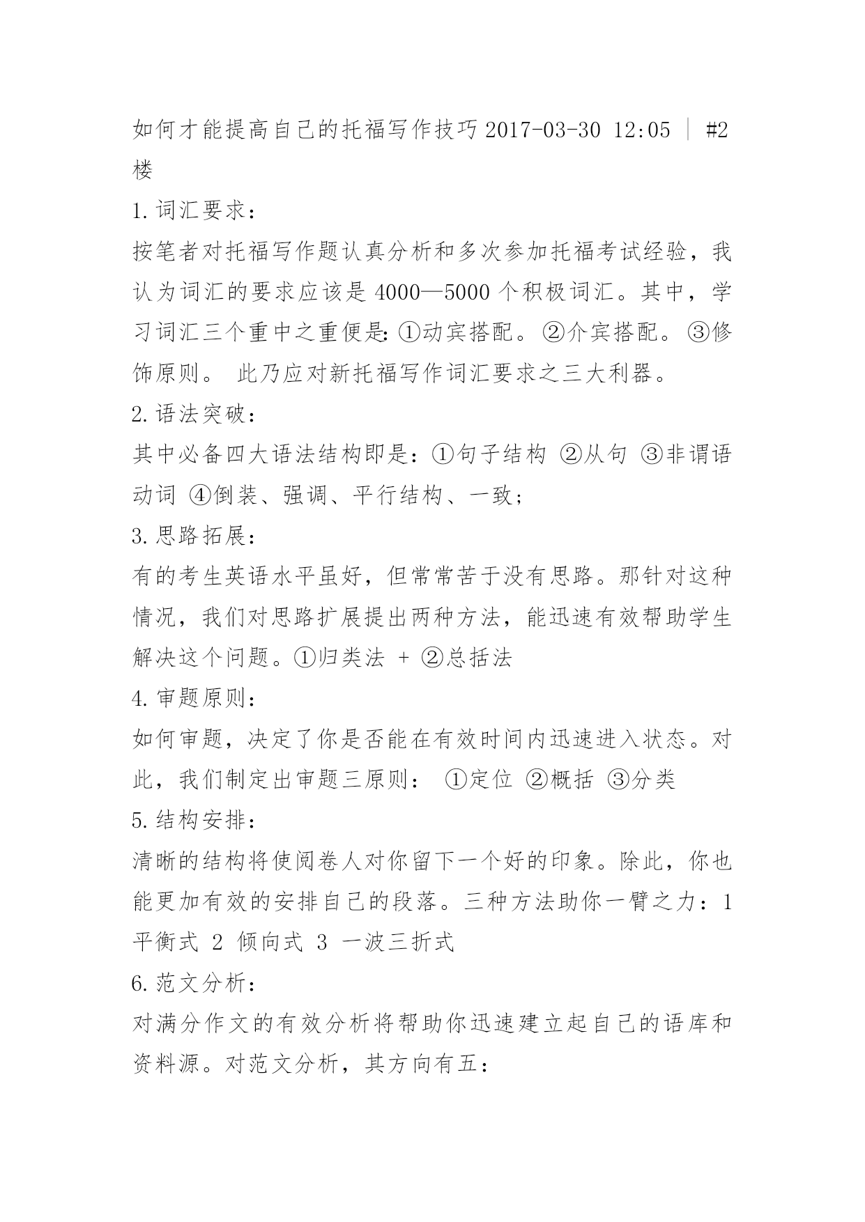 如何提高托福写作技巧 如何提高托福写作技巧大全你积累的英语词汇量的多少,影响着你在托福考试中取得的成绩。只有掌握足够多的词汇后,你才具备他警告阅读能力的最低标准。阅读大量英语文章,增加自己的知识面当一个人知道的东西多了后,在面临问题时,就会显得更有自信,解决问题也会有自己的路子。相信每一位考生在解答试题时,如果阅读到自己熟悉的文章后,解答试题时也会比较轻松和容易。答题的准确率自然而然的也就会有所上升。注意解题要领,无需阅读全篇文章阅读时要秉着做题去阅读,而不是为了阅读而去阅读。阅读时就会有着重点,针对性强,解答也比较容易,只要找到题干的大概范围,很轻松就可以选出想要的选项了。也减少了大量的阅读时间,为你的考试赢回不少时间,可以用这部分时间去解答其他较难的试题。“适合别人的不一定适合自己”。总之,关于托福考试阅读能力训练的相关方式,小编简单为考生整理如上。考生在训练时可以选择的参考,或许小编说的也有不对的地方,但是目的只是为了能够让大家更清楚托福写作技巧的相关方式,考生可以根据自己的实际需求去训练,尽快找到最佳适合自己的方式。如何才能提高自己的托福写作技巧2017-03-3012:05|#2楼1.词汇要求:按笔者对托福写作题认真分析和多次参加托福考试经验,我认为词汇的要求应该是4000—5000个积极词汇。其中,学习词汇三个重中之重便是:①动宾搭配。②介宾搭配。③修饰原则。此乃应对新托福写作词汇要求之三大利器。2.语法突破:其中必备四大语法结构即是:①句子结构②从句③非谓语动词④倒装、强调、平行结构、一致;3.思路拓展:有的考生英语水平虽好,但常常苦于没有思路。那针对这种情况,我们对思路扩展提出两种方法,能迅速有效帮助学生解决这个问题。①归类法+②总括法4.审题原则:如何审题,决定了你是否能在有效时间内迅速进入状态。对此,我们制定出审题三原则:①定位②概括③分类5.结构安排:清晰的结构将使阅卷人对你留下一个好的印象。除此,你也能更加有效的安排自己的段落。三种方法助你一臂之力:1平衡式2倾向式3一波三折式6.范文分析:对满分作文的有效分析将帮助你迅速建立起自己的语库和资料源。对范文分析,其方向有五:①词的使用②句的联系③段落安排④逻辑构造⑤整体一致7.模板使用:针对综合写作和独立写作,我们众多教师会分门别类帮助大家建立起自己模板库。这样,你不仅可在考场上节约大量时间,也可冲击高分。其中,模板共分三类:①通用模板②专用模板③分类模板8.练习讲评:英文有曰:thetasteofpuddingisineating.对写作,唯有通过大量练习,不断修改,我们才能体会其真正的奥秘。通过写作,修改,讲评三部曲,相信大家一定会达到从量变到质变的飞跃。以上就是对于从写作技巧着手提高托福考试写作成绩的说明。提升托福考试写作成绩方式有很多,比如说,注意对细节的把握,能否抓到考点等等相关信息。本文小编主要是针对写作技巧给大家做了说明。