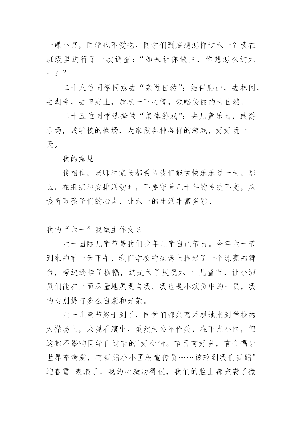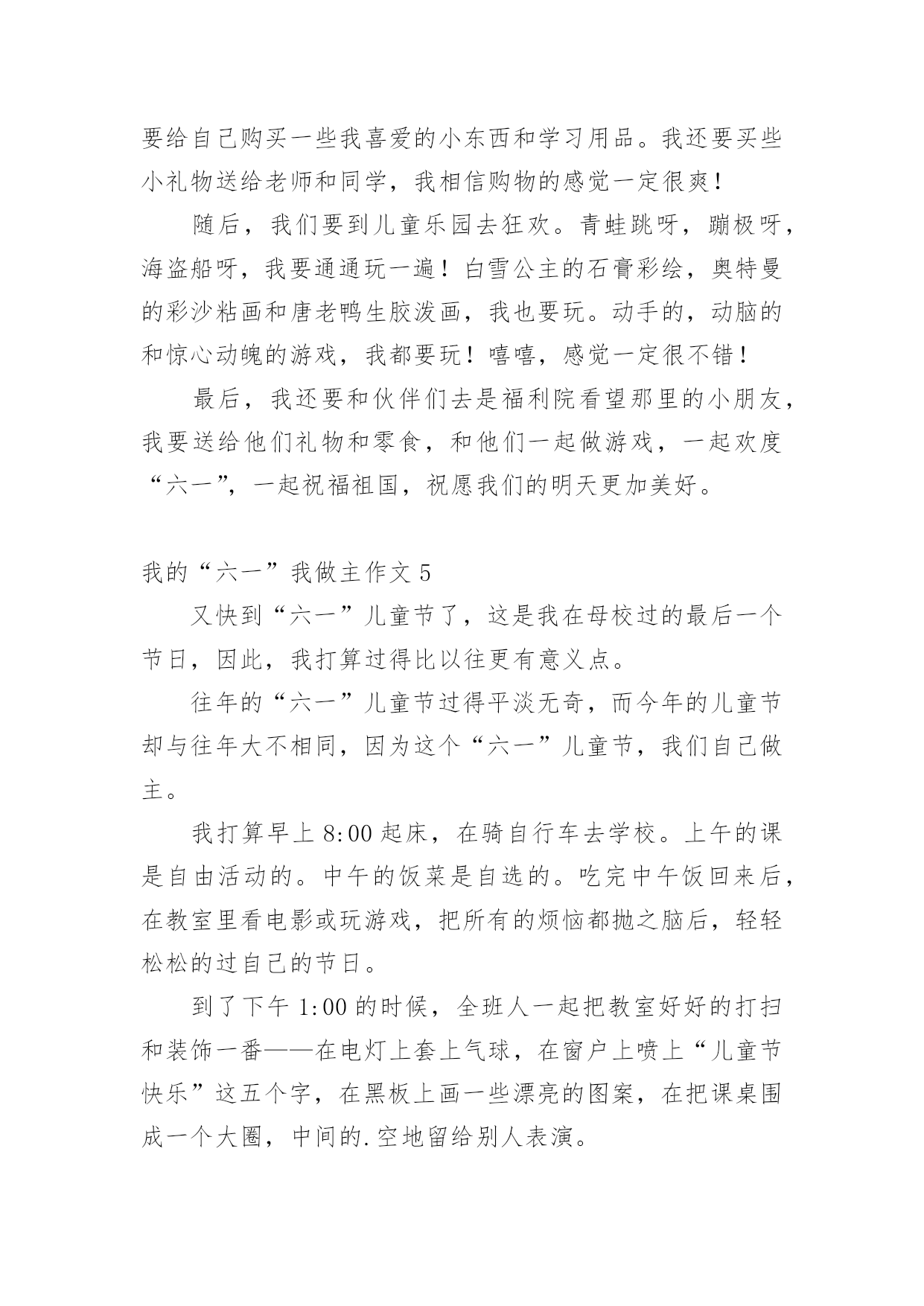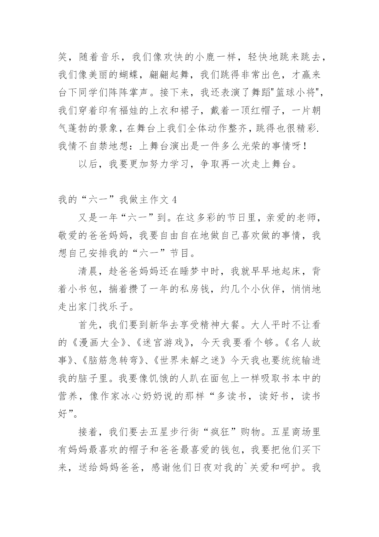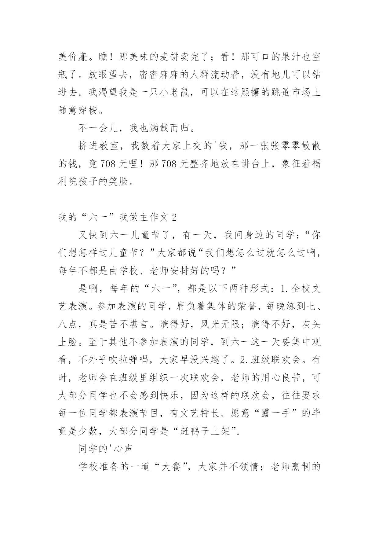 我的“六一”我做主作文 我的“六一”我做主作文在生活、工作和学习中,大家一定都接触过作文吧,作文根据体裁的不同可以分为记叙文、说明文、应用文、议论文。还是对作文一筹莫展吗?以下是小编精心整理的我的“六一”我做主作文,欢迎阅读与收藏。我的“六一”我做主作文1阳光踏入校园,犯着春困的风儿在角落徘徊,也想参加我们正在举行的“六一跳蚤市场义卖活动”呢!校园中,人声鼎沸,叫卖声,讨价声,拍掌声交集着,一浪高过一浪,真是热火朝天。我飞速赶往咱们班的店铺。阴凉的紫藤架下,我放下背包,拿出商品,摆放好,一个吆喝声又融入了人群中,不一会儿,我们的店铺就挤得水泄不通。顾客一拨接一波拨,我们忙虽忙,但心中不禁乐开了花。顾客目不暇接地盯着每一样商品,问道:“这个几块?那个几块。”“这个8块5。”我不慌不忙地回答着。他立刻回答道:“便宜!点7块。”“好吧,7块就7块!”我无奈地说着。这样,一单账单就完成了,“叮铃铃”硬币的声音在我耳中如溪水般清脆。就这样,我的老板之旅也即将结束。我拿起钱包,转悠着。黑笔、书、美食……琳琅满目的商品在我眼前晃动,海报、标语也是多姿多彩,样样都是物美价廉。瞧!那美味的麦饼卖完了;看!那可口的果汁也空瓶了。放眼望去,密密麻麻的人群流动着,没有地儿可以钻进去。我渴望我是一只小老鼠,可以在这熙攘的跳蚤市场上随意穿梭。不一会儿,我也满载而归。挤进教室,我数着大家上交的'钱,那一张张零零散散的钱,竟708元哩!那708元整齐地放在讲台上,象征着福利院孩子的笑脸。我的“六一”我做主作文2又快到六一儿童节了,有一天,我问身边的同学:“你们想怎样过儿童节?”大家都说“我们想怎么过就怎么过啊,每年不都是由学校、老师安排好的吗?”是啊,每年的“六一”,都是以下两种形式:1.全校文艺表演。参加表演的同学,肩负着集体的荣誉,每晚练到七、八点,真是苦不堪言。演得好,风光无限;演得不好,灰头土脸。至于其他不参加表演的同学,到六一这一天要集中观看,不外乎吹拉弹唱,大家早没兴趣了。2.班级联欢会。有时,老师会在班级里组织一次联欢会,老师的用心良苦,可大部分同学也不会感到快乐,因为这样的联欢会,往往要求每一位同学都表演节目,有文艺特长、愿意“露一手”的毕竟是少数,大部分同学是“赶鸭子上架”。同学的'心声学校准备的一道“大餐”,大家并不领情;老师烹制的一碟小菜,同学也不爱吃。同学们到底想怎样过六一?我在班级里进行了一次调查:“如果让你做主,你想怎么过六一?”二十八位同学同意去“亲近自然”:结伴爬山,去林间,去湖畔,去田野上,放松一下心情,领略美丽的大自然。二十五位同学选择做“集体游戏”:去儿童乐园,或游乐场,或学校的操场,大家做各种各样的游戏,好好玩上一天。我的意见我相信,老师和家长都希望我们能快快乐乐过一天,那么,在组织和安排活动时,不要守着几十年的传统不变,应该听取孩子们的心声,让六一的生活丰富多彩。我的“六一”我做主作文3六一国际儿童节是我们少年儿童自己节日。今年六一节到来的前一天下午,我们学校的操场上搭起了一个漂亮的舞台,旁边还挂了横幅,这是为了庆祝六一儿童节,让小演员们能在上面尽量地展现自我。我也是小演员中的一员,我的心别提有多么自豪和光荣。六一儿童节终于到了,同学们都兴高采烈地来到学校的大操场上,来观看演出。虽然天公不作美,在下点小雨,但这都不影响同学们过节的'好心情。节目有好多,有合唱让世界充满爱,有舞蹈小小国税宣传员……该轮到我们舞蹈"迎春雪"表演了,我的心激动得很,我们的脸上都充满了微笑,随着音乐,我们像欢快的小鹿一样,轻快地跳来跳去,我们像美丽的蝴蝶,翩翩起舞,我们跳得非常出色,才赢来台下同学们阵阵掌声。接下来,我还表演了舞蹈"篮球小将",我们穿着印有福娃的上衣和裙子,戴着一顶红帽子,一片朝气蓬勃的景象,在舞台上我们全体动作整齐,跳得也很精彩.我情不自禁地想:上舞台演出是一件多么光荣的事情呀!以后,我要更加努力学习,争取再一次走上舞台。我的“六一”我做主作文4又是一年“六一”到。在这多彩的节日里,亲爱的老师,敬爱的爸爸妈妈,我要自由自在地做自己喜欢做的事情,我想自己安排我的“六一”节目。清晨,趁爸爸妈妈还在睡梦中时,我就早早地起床,背着小书包,揣着攒了一年的私房钱,约几个小伙伴,悄悄地走出家门找乐子。首先,我们要到新华去享受精神大餐。大人平时不让看的《漫画大全》、《迷宫游戏》,今天我要看个够。《名人故事》、《脑筋急转弯》、《世界未解之迷》今天我也要统统输进我的脑子里。我要像饥饿的人趴在面包上一样吸取书本中的营养,像作家冰心奶奶说的那样“多读书,读好书,读书好”。接着,我们要去五星步行街“疯狂”购物。五星商场里有妈妈最喜欢的帽子和爸爸最喜爱的钱包,我要把他们买下来,送给妈妈爸爸,感谢他们日夜对我的`关爱和呵护。我要给自己购买一些我喜爱的小