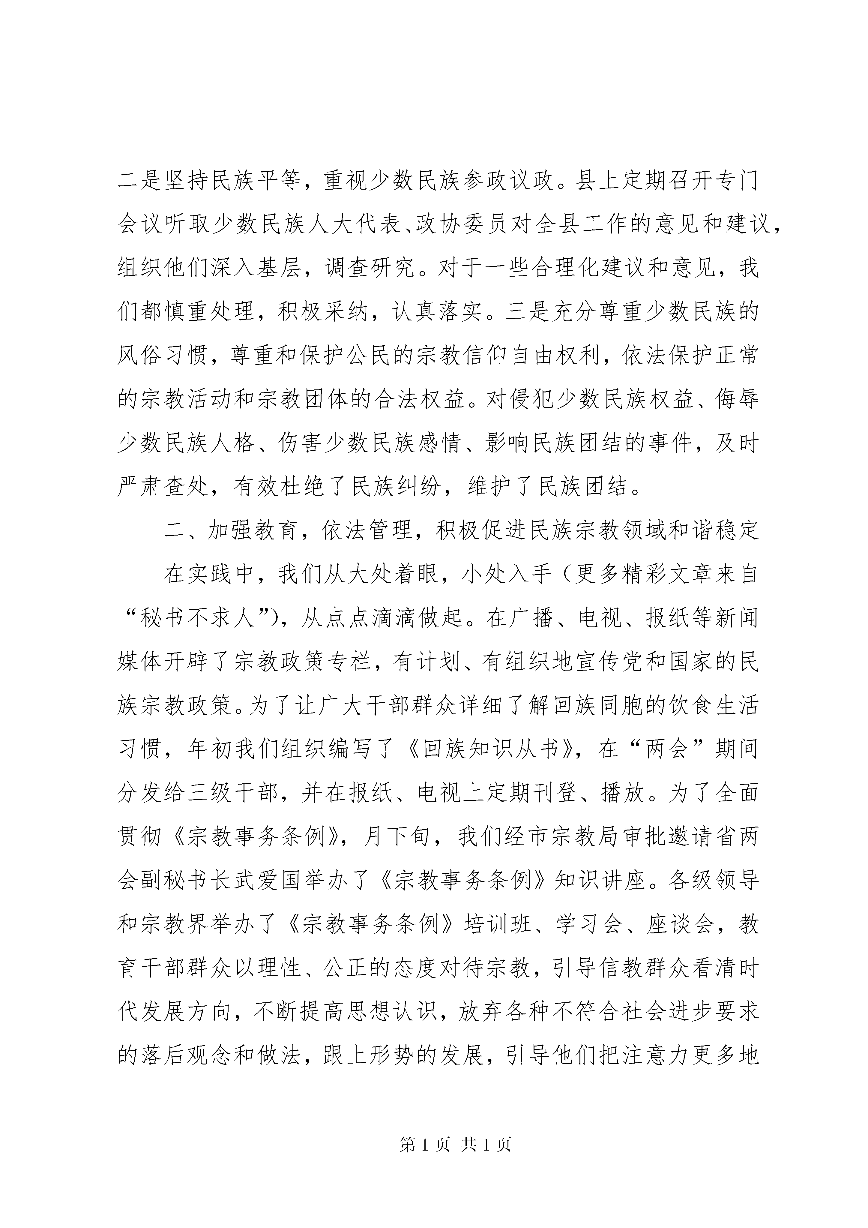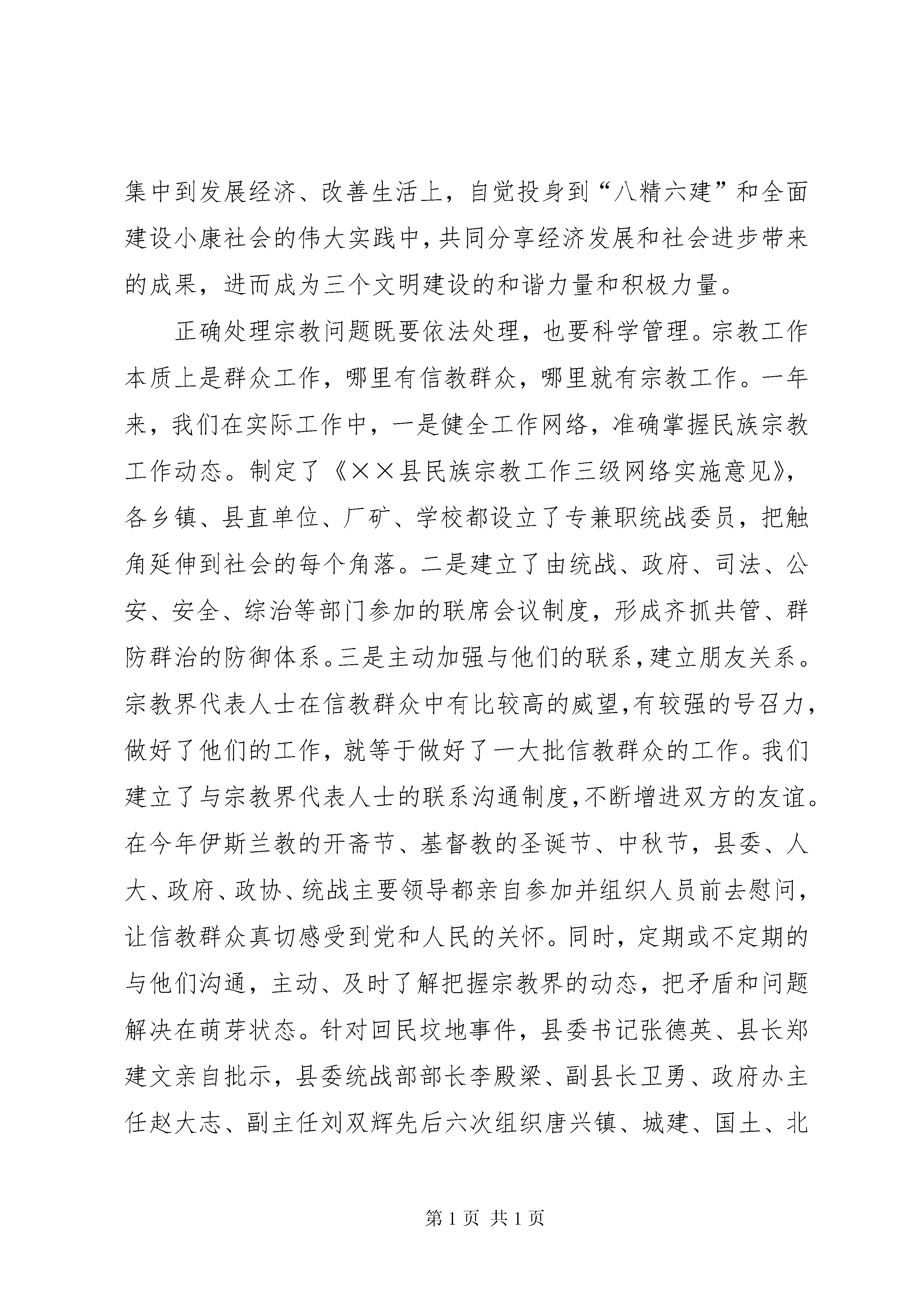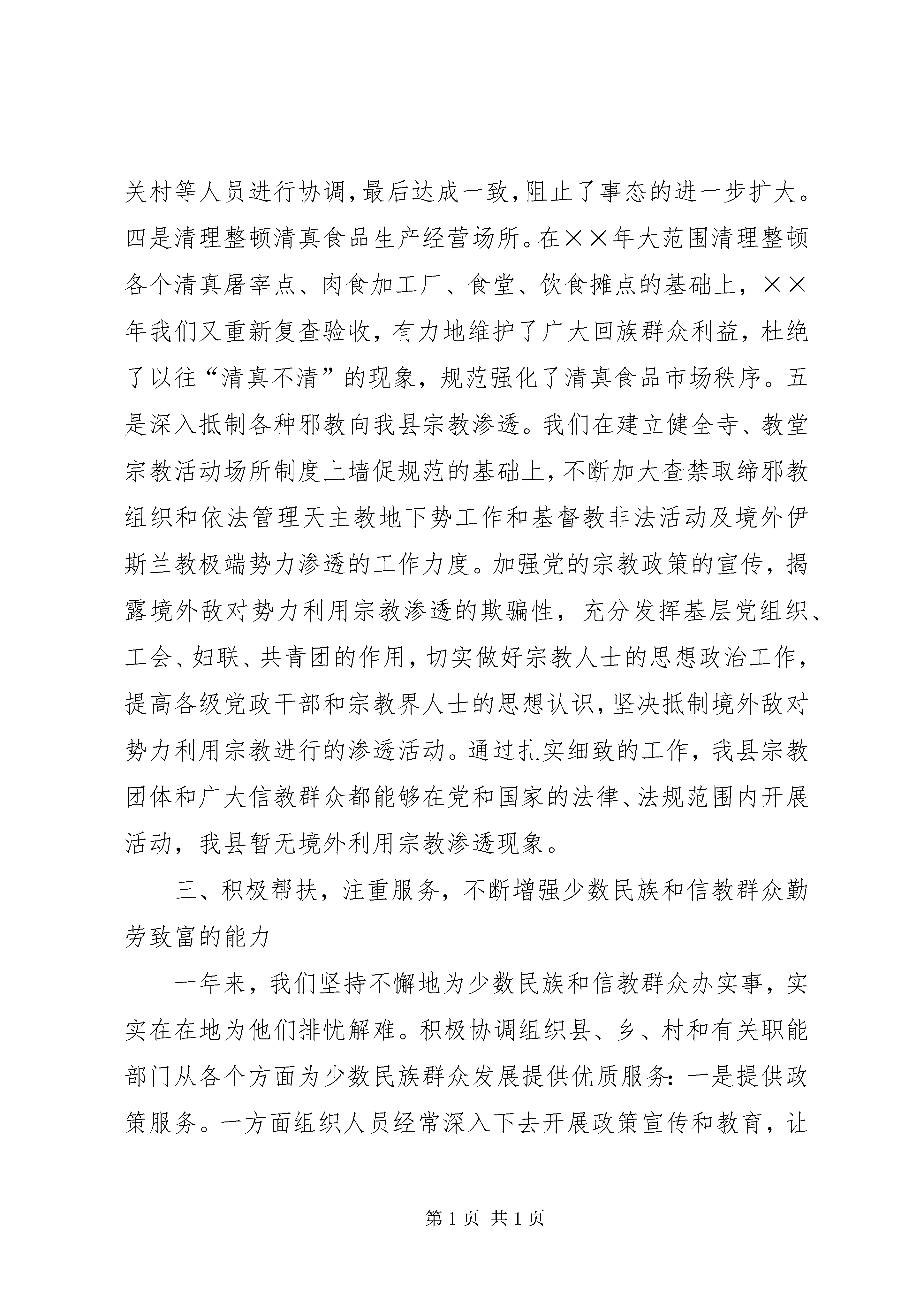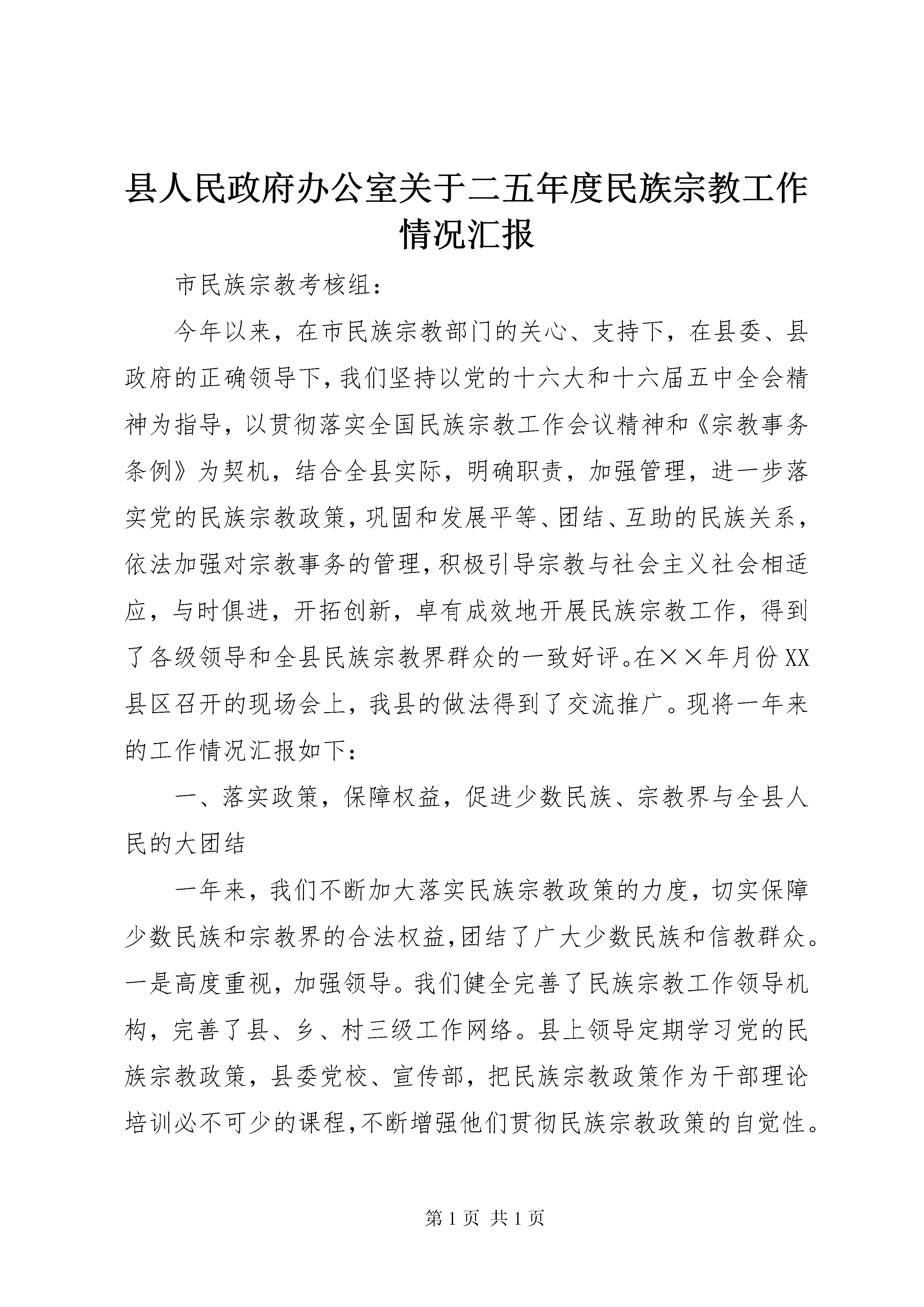 县人民政府办公室关于二五年度民族宗教工作情况汇报市民族宗教考核组:今年以来,在市民族宗教部门的关心、支持下,在县委、县政府的正确领导下,我们坚持以党的十六大和十六届五中全会精神为指导,以贯彻落实全国民族宗教工作会议精神和《宗教事务条例》为契机,结合全县实际,明确职责,加强管理,进一步落实党的民族宗教政策,巩固和发展平等、团结、互助的民族关系,依法加强对宗教事务的管理,积极引导宗教与社会主义社会相适应,与时俱进,开拓创新,卓有成效地开展民族宗教工作,得到了各级领导和全县民族宗教界群众的一致好评。在××年月份XX县区召开的现场会上,我县的做法得到了交流推广。现将一年来的工作情况汇报如下:一、落实政策,保障权益,促进少数民族、宗教界与全县人民的大团结一年来,我们不断加大落实民族宗教政策的力度,切实保障少数民族和宗教界的合法权益,团结了广大少数民族和信教群众。一是高度重视,加强领导。我们健全完善了民族宗教工作领导机构,完善了县、乡、村三级工作网络。县上领导定期学习党的民族宗教政策,县委党校、宣传部,把民族宗教政策作为干部理论培训必不可少的课程,不断增强他们贯彻民族宗教政策的自觉性。二是坚持民族平等,重视少数民族参政议政。县上定期召开专门会议听取少数民族人大代表、政协委员对全县工作的意见和建议,组织他们深入基层,调查研究。对于一些合理化建议和意见,我们都慎重处理,积极采纳,认真落实。三是充分尊重少数民族的风俗习惯,尊重和保护公民的宗教信仰自由权利,依法保护正常的宗教活动和宗教团体的合法权益。对侵犯少数民族权益、侮辱少数民族人格、伤害少数民族感情、影响民族团结的事件,及时严肃查处,有效杜绝了民族纠纷,维护了民族团结。二、加强教育,依法管理,积极促进民族宗教领域和谐稳定在实践中,我们从大处着眼,小处入手(更多精彩文章来自“秘书不求人”),从点点滴滴做起。在广播、电视、报纸等新闻媒体开辟了宗教政策专栏,有计划、有组织地宣传党和国家的民族宗教政策。为了让广大干部群众详细了解回族同胞的饮食生活习惯,年初我们组织编写了《回族知识从书》,在“两会”期间分发给三级干部,并在报纸、电视上定期刊登、播放。为了全面贯彻《宗教事务条例》,月下旬,我们经市宗教局审批邀请省两会副秘书长武爱国举办了《宗教事务条例》知识讲座。各级领导和宗教界举办了《宗教事务条例》培训班、学习会、座谈会,教育干部群众以理性、公正的态度对待宗教,引导信教群众看清时代发展方向,不断提高思想认识,放弃各种不符合社会进步要求的落后观念和做法,跟上形势的发展,引导他们把注意力更多地集中到发展经济、改善生活上,自觉投身到“八精六建”和全面建设小康社会的伟大实践中,共同分享经济发展和社会进步带来的成果,进而成为三个文明建设的和谐力量和积极力量。正确处理宗教问题既要依法处理,也要科学管理。宗教工作本质上是群众工作,哪里有信教群众,哪里就有宗教工作。一年来,我们在实际工作中,一是健全工作网络,准确掌握民族宗教工作动态。制定了《××县民族宗教工作三级网络实施意见》,各乡镇、县直单位、厂矿、学校都设立了专兼职统战委员,把触角延伸到社会的每个角落。二是建立了由统战、政府、司法、公安、安全、综治等部门参加的联席会议制度,形成齐抓共管、群防群治的防御体系。三是主动加强与他们的联系,建立朋友关系。宗教界代表人士在信教群众中有比较高的威望,有较强的号召力,做好了他们的工作,就等于做好了一大批信教群众的工作。我们建立了与宗教界代表人士的联系沟通制度,不断增进双方的友谊。在今年伊斯兰教的开斋节、基督教的圣诞节、中秋节,县委、人大、政府、政协、统战主要领导都亲自参加并组织人员前去慰问,让信教群众真切感受到党和人民的关怀。同时,定期或不定期的与他们沟通,主动、及时了解把握宗教界的动态,把矛盾和问题解决在萌芽状态。针对回民坟地事件,县委书记张德英、县长郑建文亲自批示,县委统战部部长李殿梁、副县长卫勇、政府办主任赵大志、副主任刘双辉先后六次组织唐兴镇、城建、国土、北关村等人员进行协调,最后达成一致,阻止了事态的进一步扩大。四是清理整顿清真食品生产经营场所。在××年大范围清理整顿各个清真屠宰点、肉食加工厂、食堂、饮食摊点的基础上,××年我们又重新复查验收,有力地维护了广大回族群众利益,杜绝了以往“清真不清”的现象,规范强化了清真食品市场秩序。五是深入抵制各种邪教向我县宗教渗透。我们在建立健全寺、教堂宗教活动场所制度上墙促规范的基础上,不断加大查禁取缔邪教组织和依法管理天主教地下势工作和基督教非法活动及境外伊斯兰教极端势力渗透的工作力度。加强党的宗教政策的宣传,揭露境外敌对势力利用宗教渗透的欺骗性,充分发挥基层党组织、工会、妇联、共青团的作用,切实做好宗教人士的思想政治工作,提高各级党政干部和宗教界人士的思