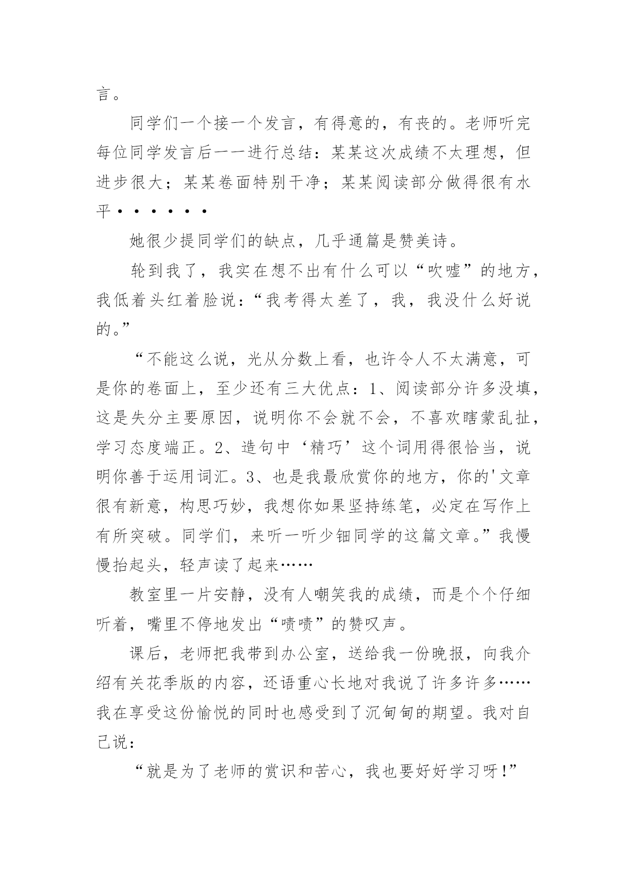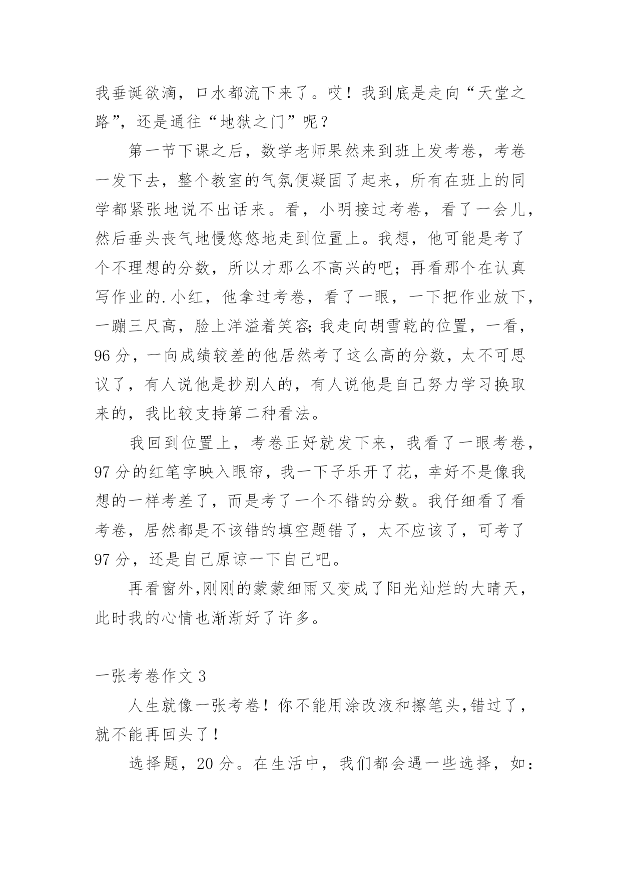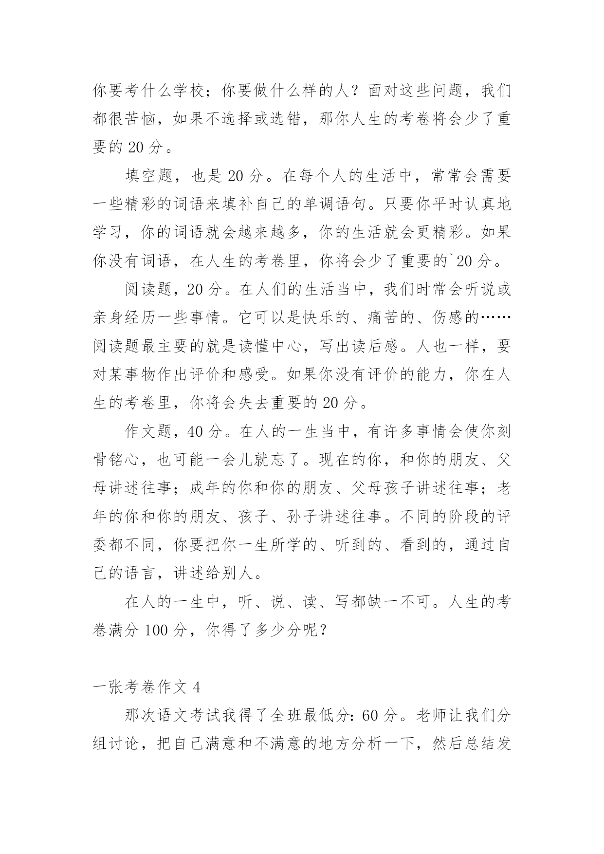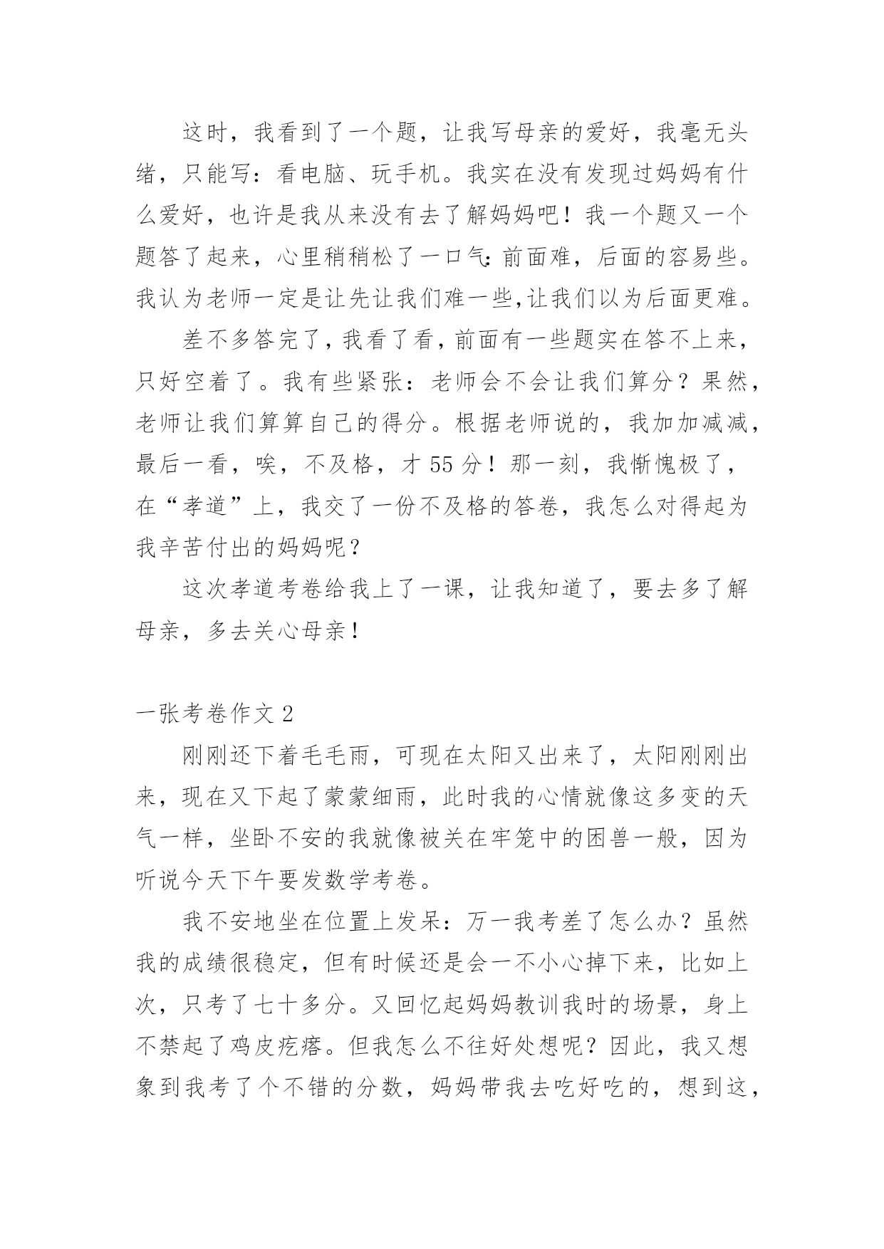 一张考卷作文 一张考卷作文在生活、工作和学习中,大家都有写作文的经历,对作文很是熟悉吧,作文根据写作时限的不同可以分为限时作文和非限时作文。相信很多朋友都对写作文感到非常苦恼吧,下面是小编为大家整理的一张考卷作文,欢迎大家分享。一张考卷作文1孝是一个爱心的拥抱,孝是一句安慰的话语,孝是一种付诸实践的行动……老师给了我们一张卷子,是“孝道考卷”。一听这一消息,我心想:哦,原来今天母亲节,怪不得老师让我们做这种卷子。想必这样的卷子,一定很难!老师一会儿工夫把卷子分好了,我一看,不好!是我不了解的题,这下完了,我肯定会给别人一个不孝的形象。我拿起卷子扫了一遍,就开始作答。可是第二题就有点把我难住了——母亲的'生日是什么时候。可我光知道妈妈的生日在12月,却忘了是几号,我只能空着了。继续往下,又是问妈妈身高,又是问体重,还让不让人填了!还有腰围,穿多大的鞋……我想:老师,你为什么出题出得这么难?还怎样让人写?接下来,我又有一两个题没写上,幸好,其他的写得很顺利,让我一想就能想到答案。这时,我看到了一个题,让我写母亲的爱好,我毫无头绪,只能写:看电脑、玩手机。我实在没有发现过妈妈有什么爱好,也许是我从来没有去了解妈妈吧!我一个题又一个题答了起来,心里稍稍松了一口气:前面难,后面的容易些。我认为老师一定是让先让我们难一些,让我们以为后面更难。差不多答完了,我看了看,前面有一些题实在答不上来,只好空着了。我有些紧张:老师会不会让我们算分?果然,老师让我们算算自己的得分。根据老师说的,我加加减减,最后一看,唉,不及格,才55分!那一刻,我惭愧极了,在“孝道”上,我交了一份不及格的答卷,我怎么对得起为我辛苦付出的妈妈呢?这次孝道考卷给我上了一课,让我知道了,要去多了解母亲,多去关心母亲!一张考卷作文2刚刚还下着毛毛雨,可现在太阳又出来了,太阳刚刚出来,现在又下起了蒙蒙细雨,此时我的心情就像这多变的天气一样,坐卧不安的我就像被关在牢笼中的困兽一般,因为听说今天下午要发数学考卷。我不安地坐在位置上发呆:万一我考差了怎么办?虽然我的成绩很稳定,但有时候还是会一不小心掉下来,比如上次,只考了七十多分。又回忆起妈妈教训我时的场景,身上不禁起了鸡皮疙瘩。但我怎么不往好处想呢?因此,我又想象到我考了个不错的分数,妈妈带我去吃好吃的,想到这,我垂诞欲滴,口水都流下来了。哎!我到底是走向“天堂之路”,还是通往“地狱之门”呢?第一节下课之后,数学老师果然来到班上发考卷,考卷一发下去,整个教室的气氛便凝固了起来,所有在班上的同学都紧张地说不出话来。看,小明接过考卷,看了一会儿,然后垂头丧气地慢悠悠地走到位置上。我想,他可能是考了个不理想的分数,所以才那么不高兴的吧;再看那个在认真写作业的.小红,他拿过考卷,看了一眼,一下把作业放下,一蹦三尺高,脸上洋溢着笑容;我走向胡雪乾的位置,一看,96分,一向成绩较差的他居然考了这么高的分数,太不可思议了,有人说他是抄别人的,有人说他是自己努力学习换取来的,我比较支持第二种看法。我回到位置上,考卷正好就发下来,我看了一眼考卷,97分的红笔字映入眼帘,我一下子乐开了花,幸好不是像我想的一样考差了,而是考了一个不错的分数。我仔细看了看考卷,居然都是不该错的填空题错了,太不应该了,可考了97分,还是自己原谅一下自己吧。再看窗外,刚刚的蒙蒙细雨又变成了阳光灿烂的大晴天,此时我的心情也渐渐好了许多。一张考卷作文3人生就像一张考卷!你不能用涂改液和擦笔头,错过了,就不能再回头了!选择题,20分。在生活中,我们都会遇一些选择,如:你要考什么学校;你要做什么样的人?面对这些问题,我们都很苦恼,如果不选择或选错,那你人生的考卷将会少了重要的20分。填空题,也是20分。在每个人的生活中,常常会需要一些精彩的词语来填补自己的单调语句。只要你平时认真地学习,你的词语就会越来越多,你的生活就会更精彩。如果你没有词语,在人生的考卷里,你将会少了重要的`20分。阅读题,20分。在人们的生活当中,我们时常会听说或亲身经历一些事情。它可以是快乐的、痛苦的、伤感的……阅读题最主要的就是读懂中心,写出读后感。人也一样,要对某事物作出评价和感受。如果你没有评价的能力,你在人生的考卷里,你将会失去重要的20分。作文题,40分。在人的一生当中,有许多事情会使你刻骨铭心,也可能一会儿就忘了。现在的你,和你的朋友、父母讲述往事;成年的你和你的朋友、父母孩子讲述往事;老年的你和你的朋友、孩子、孙子讲述往事。不同的阶段的评委都不同,你要把你一生所学的、听到的、看到的,通过自己的语言,讲述给别人。在人的一生中,听、说、读、写都缺一不可。人生的考卷满分100分,你得了多少分呢?一张考卷作文4那次语文考试我得了全班最低分:60分。老师让我们分组讨论,把自己满意和不满意的地方分析一下,