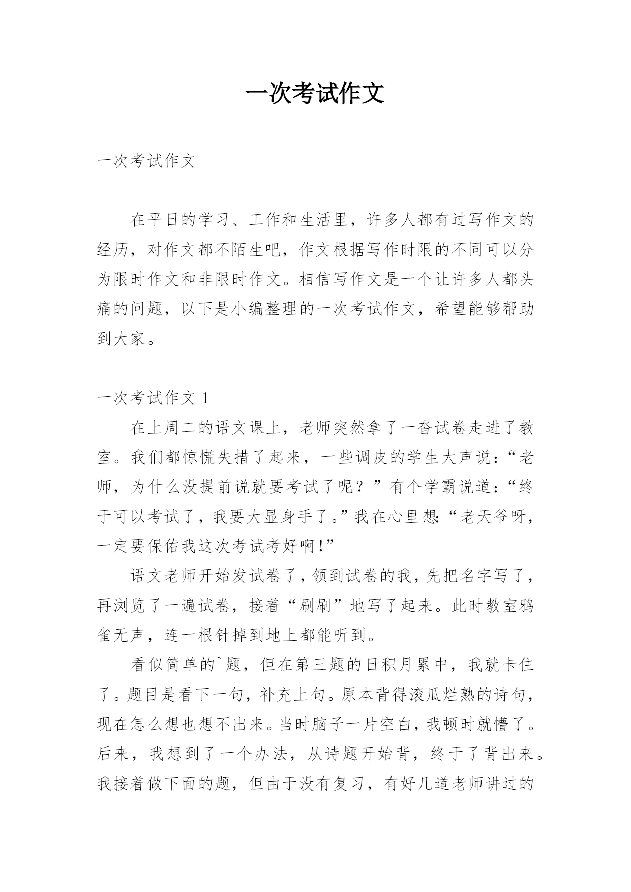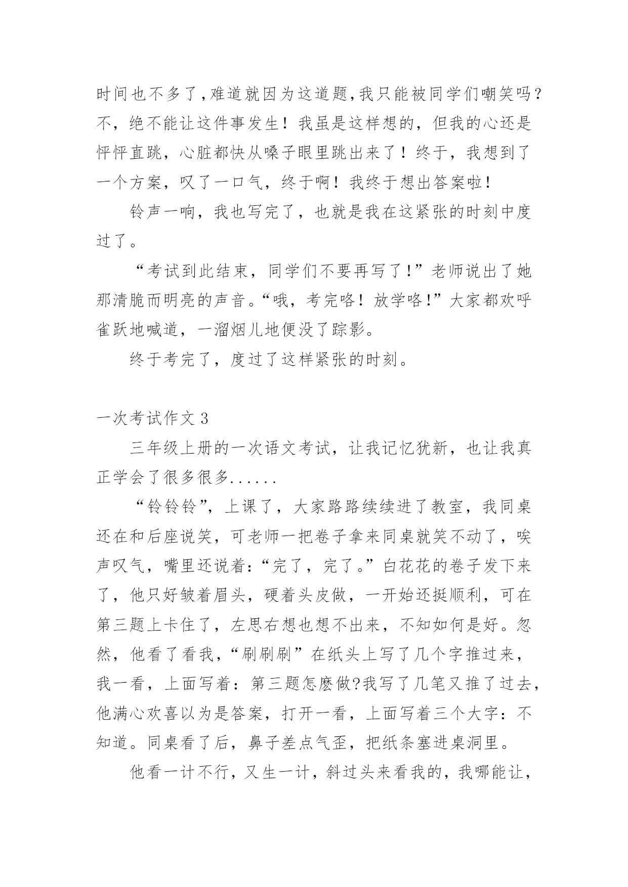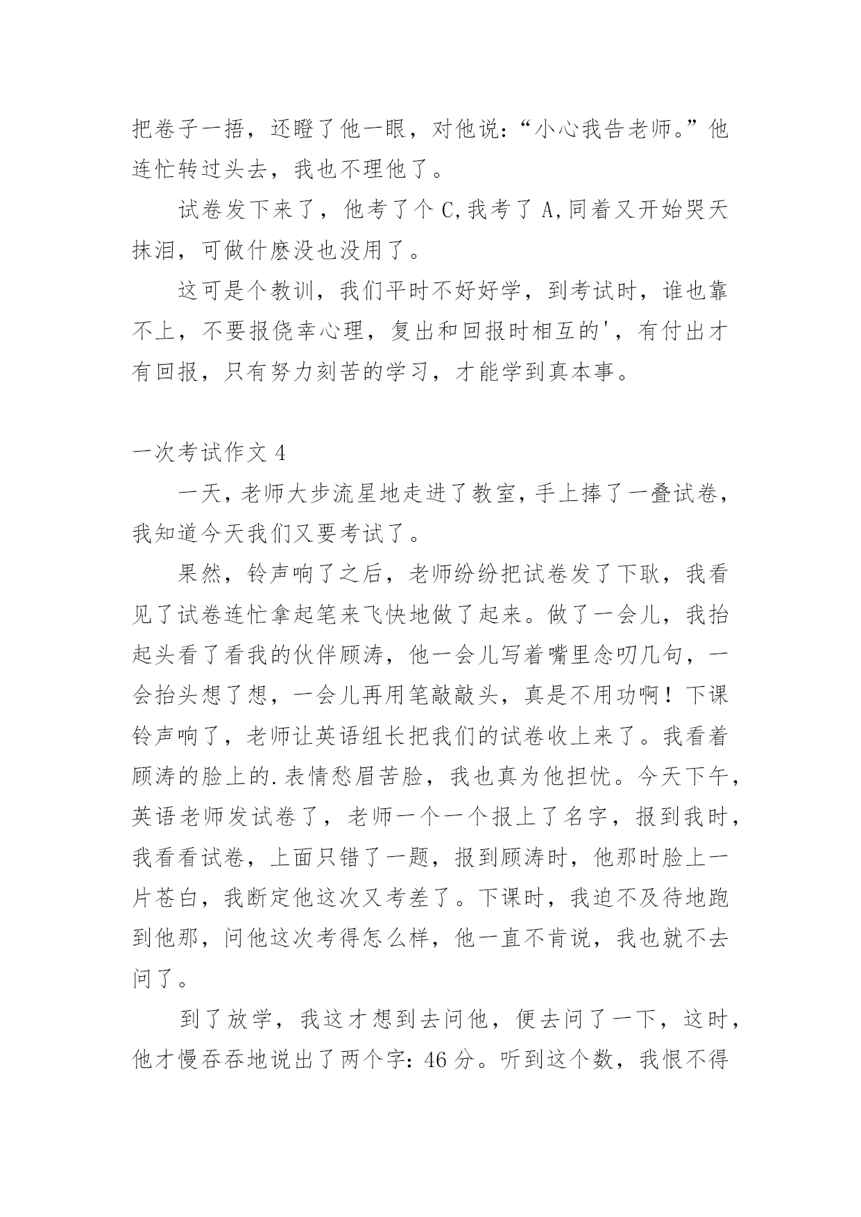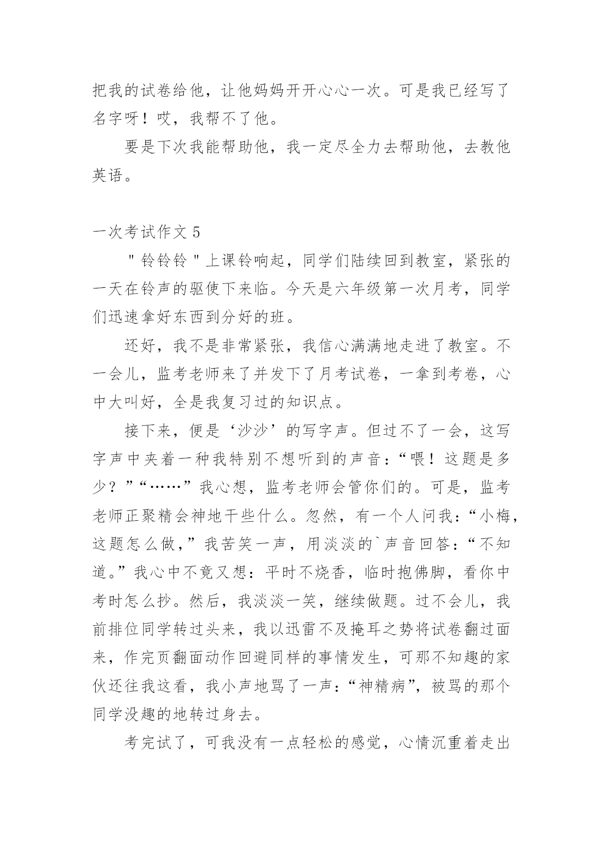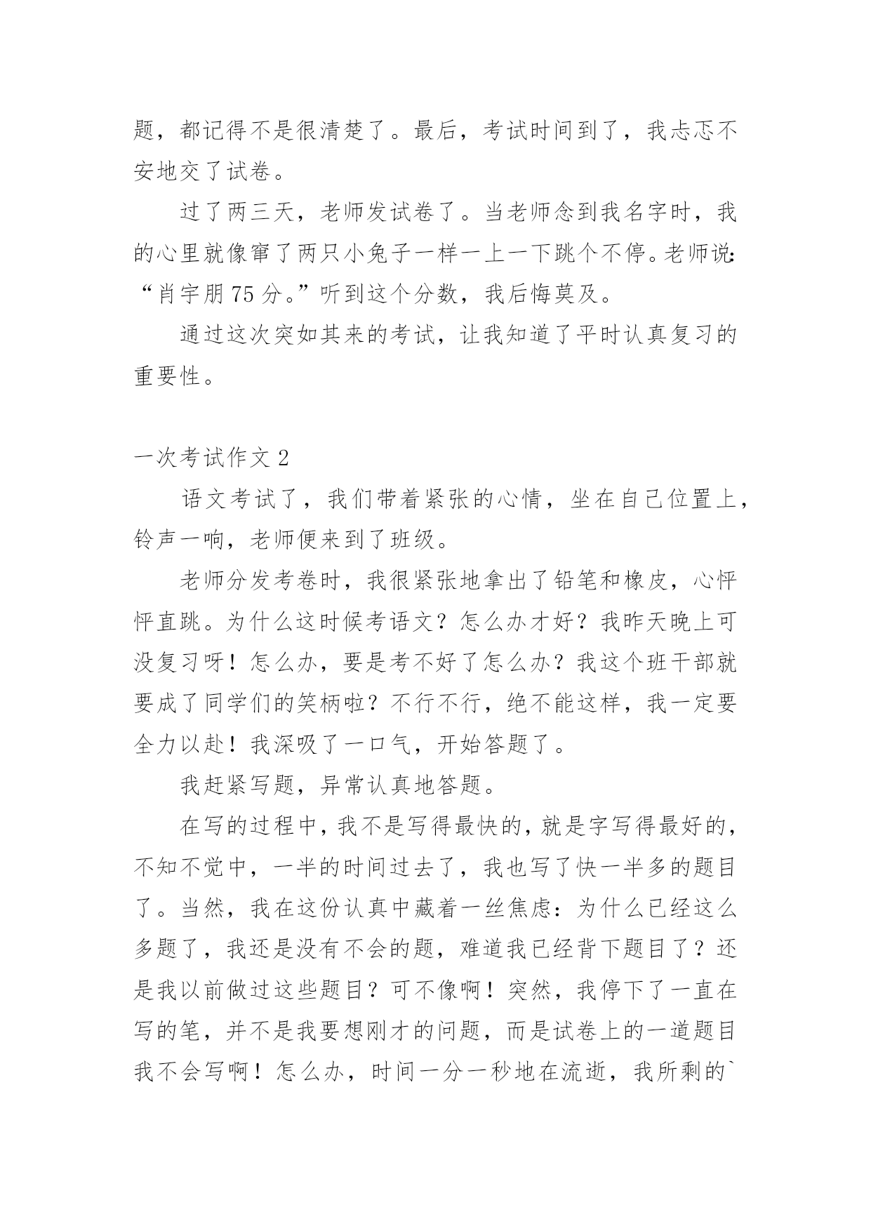 一次考试作文 一次考试作文在平日的学习、工作和生活里,许多人都有过写作文的经历,对作文都不陌生吧,作文根据写作时限的不同可以分为限时作文和非限时作文。相信写作文是一个让许多人都头痛的问题,以下是小编整理的一次考试作文,希望能够帮助到大家。一次考试作文1在上周二的语文课上,老师突然拿了一沓试卷走进了教室。我们都惊慌失措了起来,一些调皮的学生大声说:“老师,为什么没提前说就要考试了呢?”有个学霸说道:“终于可以考试了,我要大显身手了。”我在心里想:“老天爷呀,一定要保佑我这次考试考好啊!”语文老师开始发试卷了,领到试卷的我,先把名字写了,再浏览了一遍试卷,接着“刷刷”地写了起来。此时教室鸦雀无声,连一根针掉到地上都能听到。看似简单的`题,但在第三题的日积月累中,我就卡住了。题目是看下一句,补充上句。原本背得滚瓜烂熟的诗句,现在怎么想也想不出来。当时脑子一片空白,我顿时就懵了。后来,我想到了一个办法,从诗题开始背,终于了背出来。我接着做下面的题,但由于没有复习,有好几道老师讲过的题,都记得不是很清楚了。最后,考试时间到了,我忐忑不安地交了试卷。过了两三天,老师发试卷了。当老师念到我名字时,我的心里就像窜了两只小兔子一样一上一下跳个不停。老师说:“肖宇朋75分。”听到这个分数,我后悔莫及。通过这次突如其来的考试,让我知道了平时认真复习的重要性。一次考试作文2语文考试了,我们带着紧张的心情,坐在自己位置上,铃声一响,老师便来到了班级。老师分发考卷时,我很紧张地拿出了铅笔和橡皮,心怦怦直跳。为什么这时候考语文?怎么办才好?我昨天晚上可没复习呀!怎么办,要是考不好了怎么办?我这个班干部就要成了同学们的笑柄啦?不行不行,绝不能这样,我一定要全力以赴!我深吸了一口气,开始答题了。我赶紧写题,异常认真地答题。在写的过程中,我不是写得最快的,就是字写得最好的,不知不觉中,一半的时间过去了,我也写了快一半多的题目了。当然,我在这份认真中藏着一丝焦虑:为什么已经这么多题了,我还是没有不会的题,难道我已经背下题目了?还是我以前做过这些题目?可不像啊!突然,我停下了一直在写的笔,并不是我要想刚才的问题,而是试卷上的一道题目我不会写啊!怎么办,时间一分一秒地在流逝,我所剩的`时间也不多了,难道就因为这道题,我只能被同学们嘲笑吗?不,绝不能让这件事发生!我虽是这样想的,但我的心还是怦怦直跳,心脏都快从嗓子眼里跳出来了!终于,我想到了一个方案,叹了一口气,终于啊!我终于想出答案啦!铃声一响,我也写完了,也就是我在这紧张的时刻中度过了。“考试到此结束,同学们不要再写了!”老师说出了她那清脆而明亮的声音。“哦,考完咯!放学咯!”大家都欢呼雀跃地喊道,一溜烟儿地便没了踪影。终于考完了,度过了这样紧张的时刻。一次考试作文3三年级上册的一次语文考试,让我记忆犹新,也让我真正学会了很多很多......“铃铃铃”,上课了,大家路路续续进了教室,我同桌还在和后座说笑,可老师一把卷子拿来同桌就笑不动了,唉声叹气,嘴里还说着:“完了,完了。”白花花的卷子发下来了,他只好皱着眉头,硬着头皮做,一开始还挺顺利,可在第三题上卡住了,左思右想也想不出来,不知如何是好。忽然,他看了看我,“刷刷刷”在纸头上写了几个字推过来,我一看,上面写着:第三题怎麽做?我写了几笔又推了过去,他满心欢喜以为是答案,打开一看,上面写着三个大字:不知道。同桌看了后,鼻子差点气歪,把纸条塞进桌洞里。他看一计不行,又生一计,斜过头来看我的,我哪能让,把卷子一捂,还瞪了他一眼,对他说:“小心我告老师。”他连忙转过头去,我也不理他了。试卷发下来了,他考了个C,我考了A,同着又开始哭天抹泪,可做什麽没也没用了。这可是个教训,我们平时不好好学,到考试时,谁也靠不上,不要报侥幸心理,复出和回报时相互的',有付出才有回报,只有努力刻苦的学习,才能学到真本事。一次考试作文4一天,老师大步流星地走进了教室,手上捧了一叠试卷,我知道今天我们又要考试了。果然,铃声响了之后,老师纷纷把试卷发了下耿,我看见了试卷连忙拿起笔来飞快地做了起来。做了一会儿,我抬起头看了看我的伙伴顾涛,他一会儿写着嘴里念叨几句,一会抬头想了想,一会儿再用笔敲敲头,真是不用功啊!下课铃声响了,老师让英语组长把我们的试卷收上来了。我看着顾涛的脸上的.表情愁眉苦脸,我也真为他担忧。今天下午,英语老师发试卷了,老师一个一个报上了名字,报到我时,我看看试卷,上面只错了一题,报到顾涛时,他那时脸上一片苍白,我断定他这次又考差了。下课时,我迫不及待地跑到他那,问他这次考得怎么样,他一直不肯说,我也就不去问了。到了放学,我这才想到去问他,便去问了一下,这时,他才慢吞吞地说出了两个字:46分。听到这个数,我恨不得把我的试卷给他,让他妈妈开开心心一次。可是我已经写了名字呀!哎,我帮