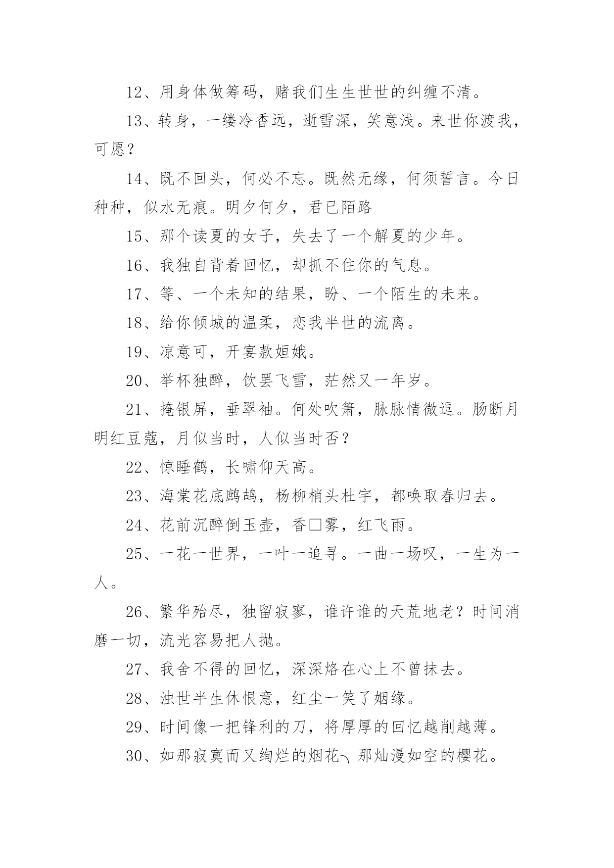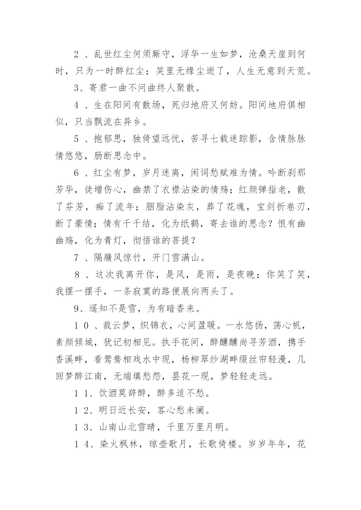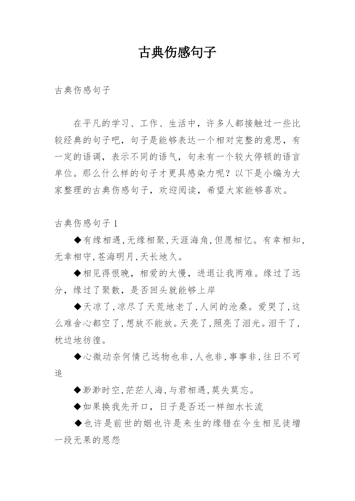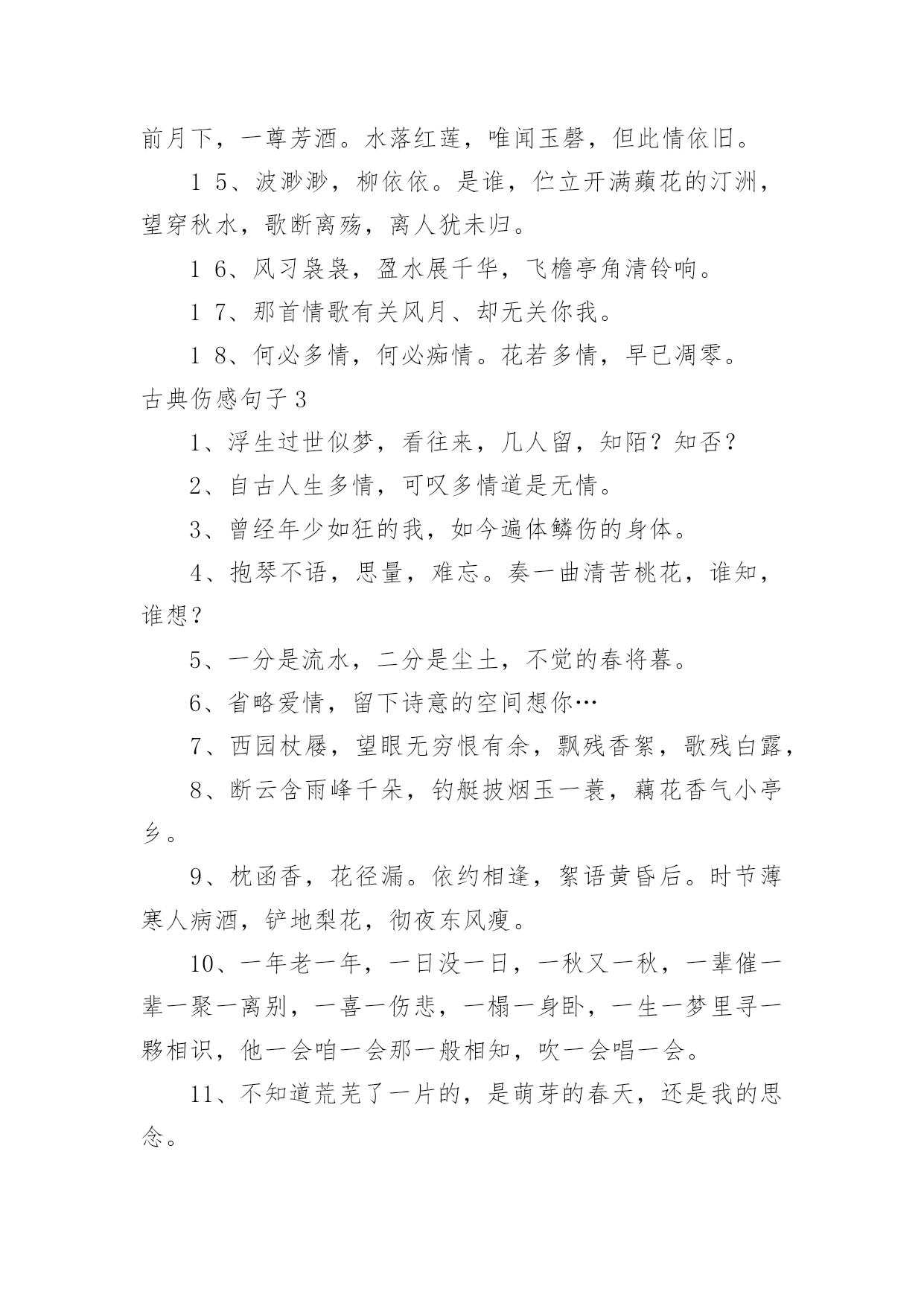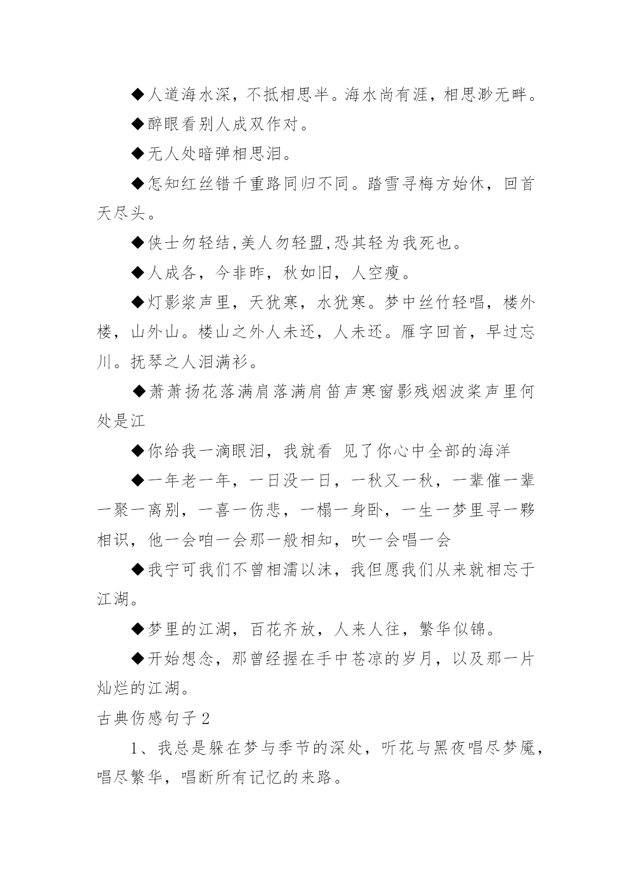 古典伤感句子 古典伤感句子在平凡的学习、工作、生活中,许多人都接触过一些比较经典的句子吧,句子是能够表达一个相对完整的意思,有一定的语调,表示不同的语气,句未有一个较大停顿的语言单位。那么什么样的句子才更具感染力呢?以下是小编为大家整理的古典伤感句子,欢迎阅读,希望大家能够喜欢。古典伤感句子1◆有缘相遇,无缘相聚,天涯海角,但愿相忆。有幸相知,无幸相守,苍海明月,天长地久。◆相见得恨晚,相爱的太慢,进退让我两难。缘过了远分,缘过了聚散,是否回头就能够上岸◆天凉了,凉尽了天荒地老了,人间的沧桑。爱哭了,这么难舍心都空了,想放不能放。天亮了,照亮了泪光。泪干了,枕边地彷徨。◆心微动奈何情己远物也非,人也非,事事非,往日不可追◆渺渺时空,茫茫人海,与君相遇,莫失莫忘。◆如果换我先开口,日子是否还一样细水长流◆也许是前世的姻也许是来生的缘错在今生相见徒增一段无果的恩怨◆人道海水深,不抵相思半。海水尚有涯,相思渺无畔。◆醉眼看别人成双作对。◆无人处暗弹相思泪。◆怎知红丝错千重路同归不同。踏雪寻梅方始休,回首天尽头。◆侠士勿轻结,美人勿轻盟,恐其轻为我死也。◆人成各,今非昨,秋如旧,人空瘦。◆灯影浆声里,天犹寒,水犹寒。梦中丝竹轻唱,楼外楼,山外山。楼山之外人未还,人未还。雁字回首,早过忘川。抚琴之人泪满衫。◆萧萧扬花落满肩落满肩笛声寒窗影残烟波桨声里何处是江◆你给我一滴眼泪,我就看见了你心中全部的海洋◆一年老一年,一日没一日,一秋又一秋,一辈催一辈一聚一离别,一喜一伤悲,一榻一身卧,一生一梦里寻一夥相识,他一会咱一会那一般相知,吹一会唱一会◆我宁可我们不曾相濡以沫,我但愿我们从来就相忘于江湖。◆梦里的江湖,百花齐放,人来人往,繁华似锦。◆开始想念,那曾经握在手中苍凉的岁月,以及那一片灿烂的江湖。古典伤感句子21、我总是躲在梦与季节的深处,听花与黑夜唱尽梦魇,唱尽繁华,唱断所有记忆的来路。2、乱世红尘何须厮守,浮华一生如梦,沧桑天崖到何时,只为一时醉红尘;笑里无缘尘逝了,人生无意到天荒。3、寄君一曲不问曲终人聚散。4、生在阳间有散场,死归地府又何妨。阳间地府俱相似,只当飘流在异乡。5、抱郁思,独倚望远忧,苦寻七载迷踪影,含情脉脉情悠悠,肠断思念中。6、红尘有梦,岁月迷离,闲词愁赋难为情。吟断刹那芳华,徒增伤心,幽禁了衣襟沾染的情殇;红颜弹指老,散了芬芳,痴了流年;胭脂沾染灰,葬了花魂,宝剑折卷刃,断了豪情;情有千千结,化为纸鹤,寄去谁的思念?恨有幽幽殇,化为青灯,彻悟谁的菩提?7、隔牖风惊竹,开门雪满山。8、这次我离开你,是风,是雨,是夜晚;你笑了笑,我摆一摆手,一条寂寞的路便展向两头了。9、遥知不是雪,为有暗香来。10、裁云梦,织锦衣,心间盈暖。一水悠扬,荡心帆,素颜倾城,犹记初相见。执手花间,醉醺醺尚寻芳酒,携手香溪畔,看鸳鸯相戏水中现,杨柳翠纱湖畔缀丝帘轻漫,几回梦醉江南,无端填愁怨,昙花一现,梦轻轻走远。11、饮酒莫辞醉,醉多适不愁。12、明日近长安,客心愁未阑。13、山南山北雪晴,千里万里月明。14、染火枫林,琼壶歌月,长歌倚楼。岁岁年年,花前月下,一尊芳酒。水落红莲,唯闻玉磬,但此情依旧。15、波渺渺,柳依依。是谁,伫立开满蘋花的汀洲,望穿秋水,歌断离殇,离人犹未归。16、风习袅袅,盈水展千华,飞檐亭角清铃响。17、那首情歌有关风月、却无关你我。18、何必多情,何必痴情。花若多情,早已凋零。古典伤感句子31、浮生过世似梦,看往来,几人留,知陌?知否?2、自古人生多情,可叹多情道是无情。3、曾经年少如狂的我,如今遍体鳞伤的身体。4、抱琴不语,思量,难忘。奏一曲清苦桃花,谁知,谁想?5、一分是流水,二分是尘土,不觉的春将暮。6、省略爱情,留下诗意的空间想你…7、西园杖屦,望眼无穷恨有余,飘残香絮,歌残白露,8、断云含雨峰千朵,钓艇披烟玉一蓑,藕花香气小亭乡。9、枕函香,花径漏。依约相逢,絮语黄昏后。时节薄寒人病酒,铲地梨花,彻夜东风瘦。10、一年老一年,一日没一日,一秋又一秋,一辈催一辈一聚一离别,一喜一伤悲,一榻一身卧,一生一梦里寻一夥相识,他一会咱一会那一般相知,吹一会唱一会。11、不知道荒芜了一片的,是萌芽的春天,还是我的思念。12、用身体做筹码,赌我们生生世世的纠缠不清。13、转身,一缕冷香远,逝雪深,笑意浅。来世你渡我,可愿?14、既不回头,何必不忘。既然无缘,何须誓言。今日种种,似水无痕。明夕何夕,君已陌路15、那个读夏的女子,失去了一个解夏的少年。16、我独自背着回忆,却抓不住你的气息。17、等、一个未知的结果,盼、一个陌生的未来。18、给你倾城的温柔,恋我半世的流离。19、凉意可,开宴款姮娥。20、举杯独醉,饮罢飞雪,茫然又一年岁。21、掩银屏,垂翠袖。何处吹箫,脉脉情微逗。肠断月明红豆蔻,月似当时,人似当时否?