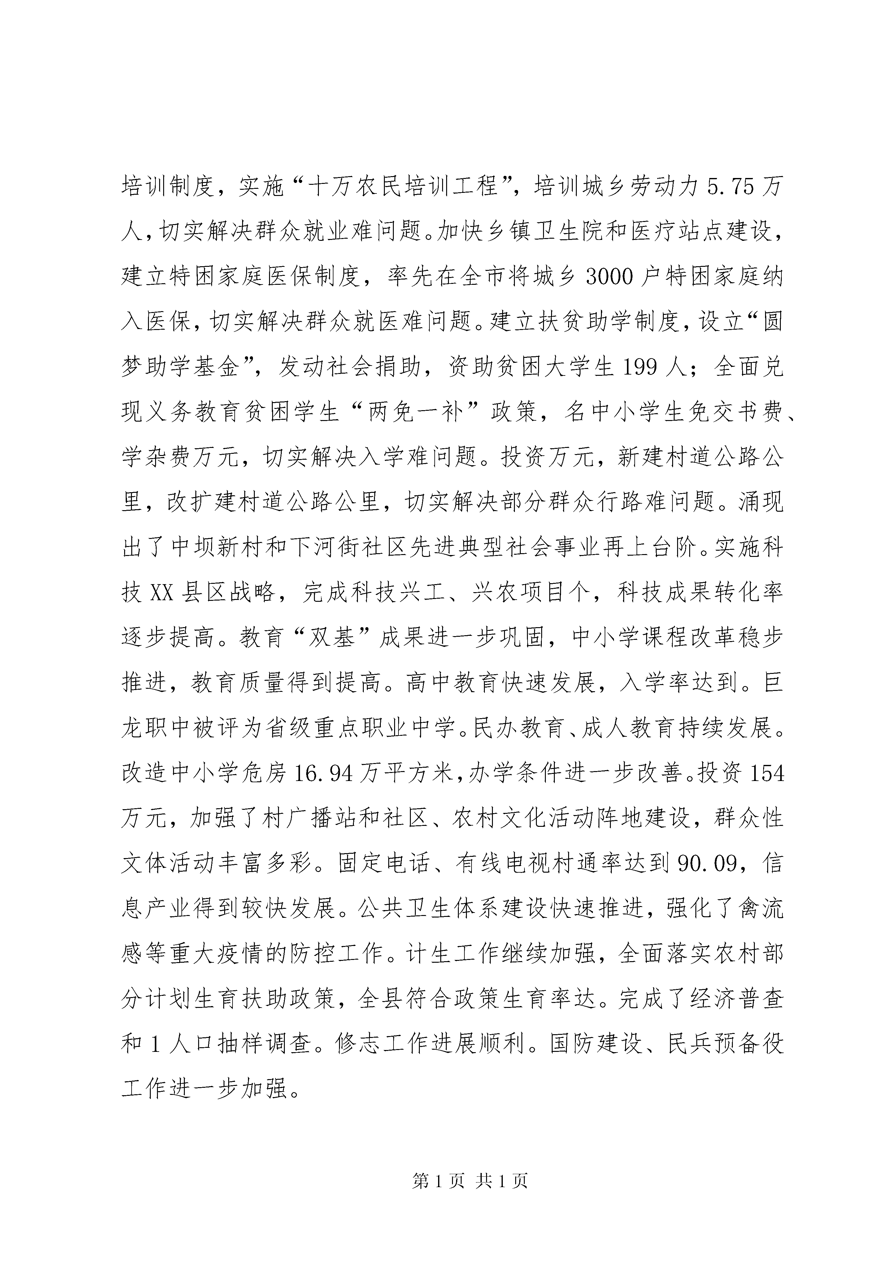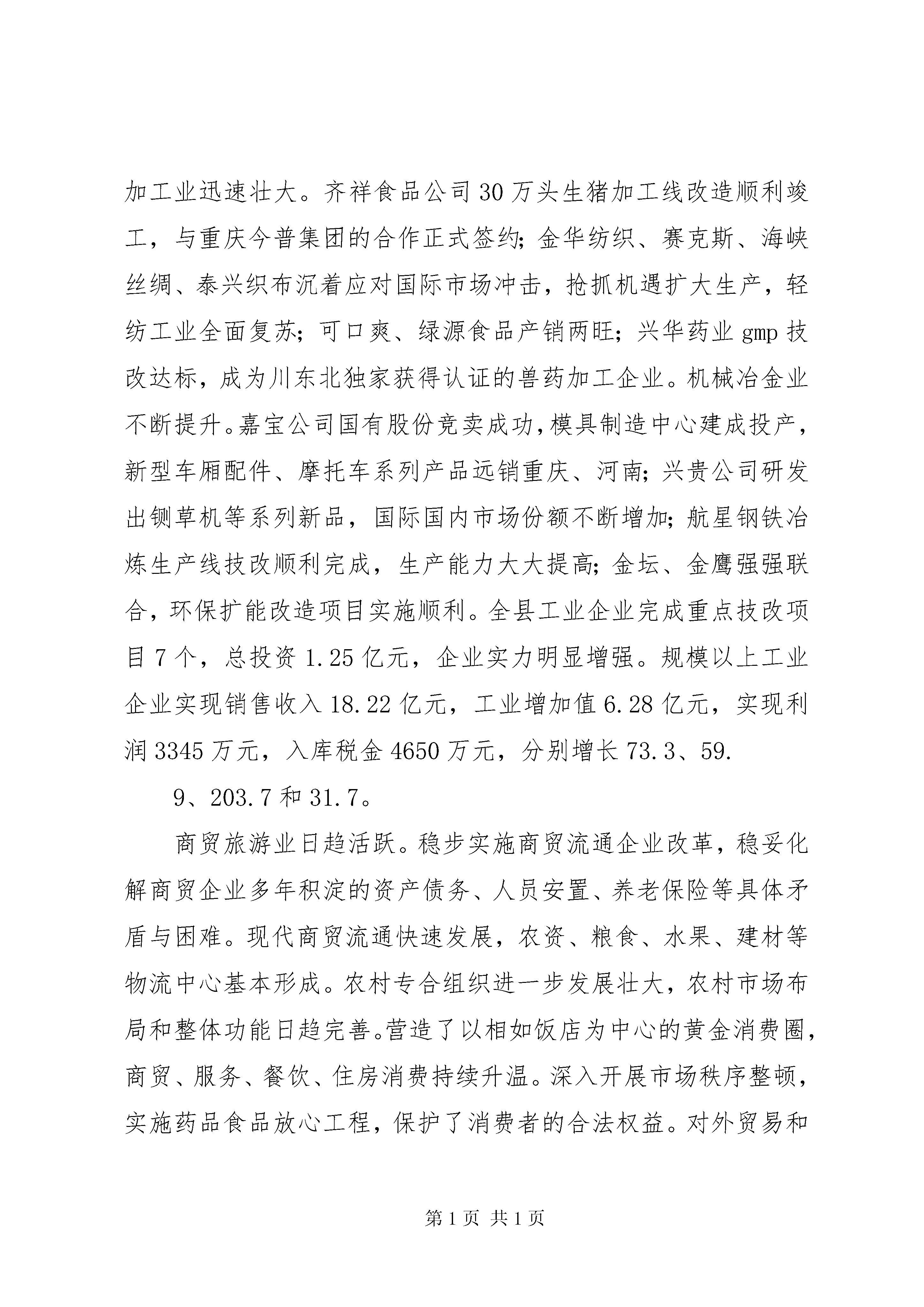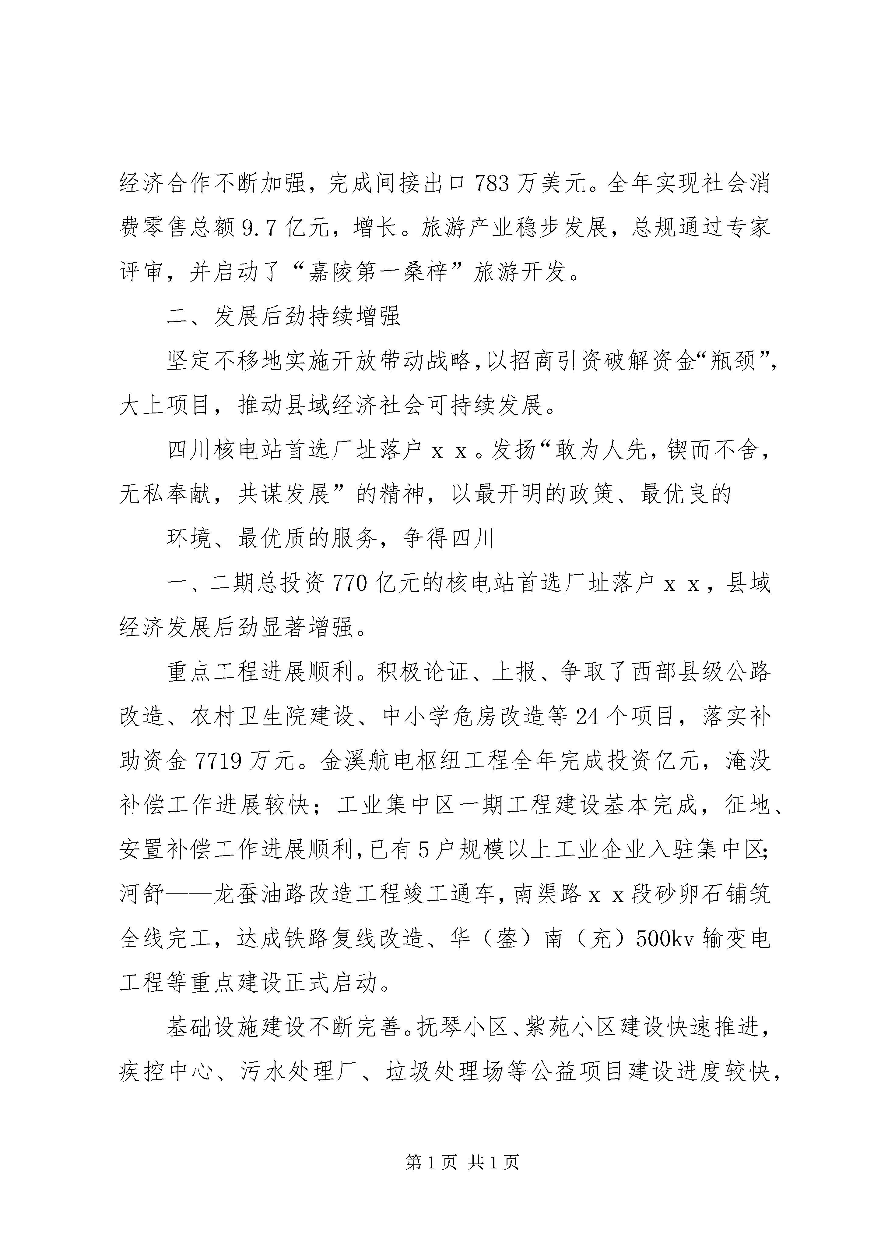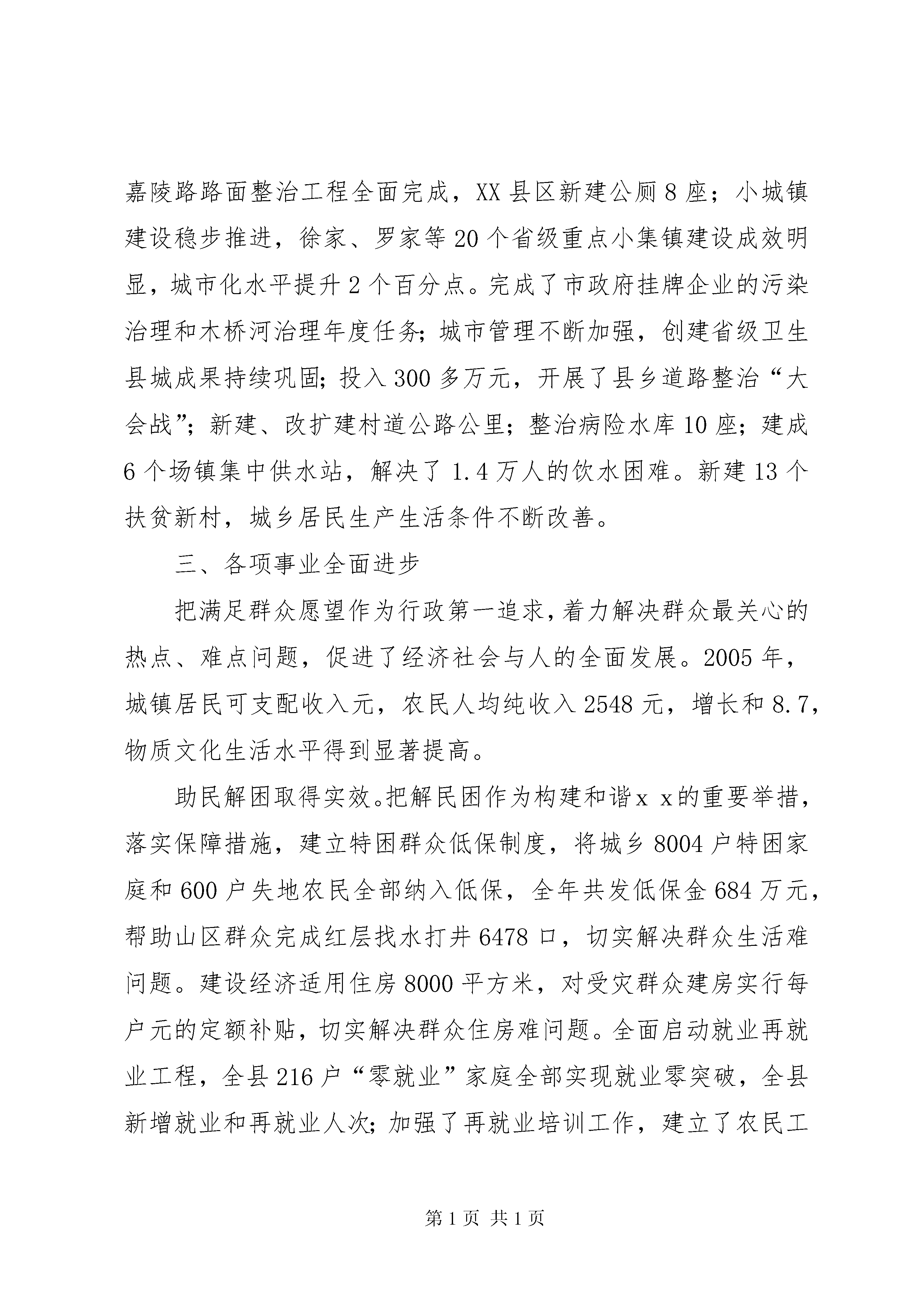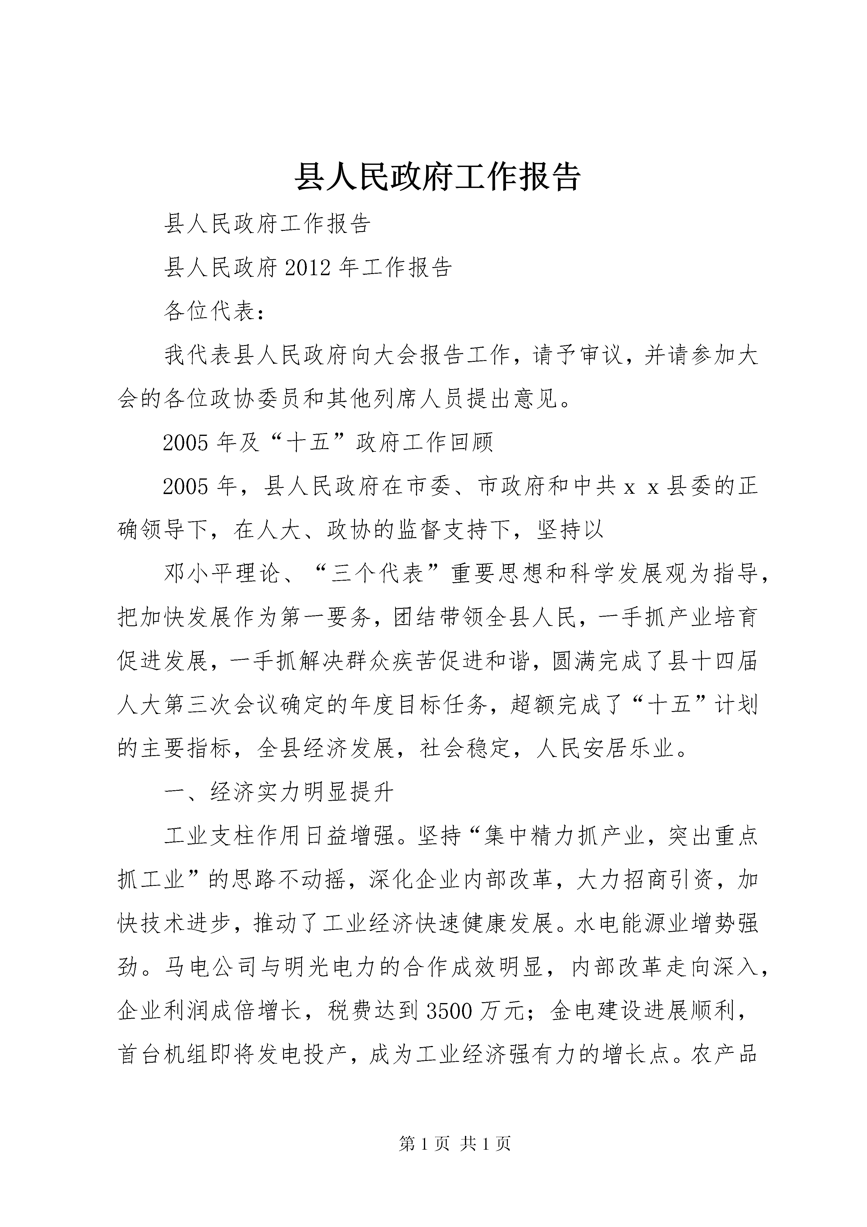 县人民政府工作报告县人民政府工作报告县人民政府2012年工作报告各位代表:我代表县人民政府向大会报告工作,请予审议,并请参加大会的各位政协委员和其他列席人员提出意见。2005年及“十五”政府工作回顾2005年,县人民政府在市委、市政府和中共xx县委的正确领导下,在人大、政协的监督支持下,坚持以邓小平理论、“三个代表”重要思想和科学发展观为指导,把加快发展作为第一要务,团结带领全县人民,一手抓产业培育促进发展,一手抓解决群众疾苦促进和谐,圆满完成了县十四届人大第三次会议确定的年度目标任务,超额完成了“十五”计划的主要指标,全县经济发展,社会稳定,人民安居乐业。一、经济实力明显提升工业支柱作用日益增强。坚持“集中精力抓产业,突出重点抓工业”的思路不动摇,深化企业内部改革,大力招商引资,加快技术进步,推动了工业经济快速健康发展。水电能源业增势强劲。马电公司与明光电力的合作成效明显,内部改革走向深入,企业利润成倍增长,税费达到3500万元;金电建设进展顺利,首台机组即将发电投产,成为工业经济强有力的增长点。农产品加工业迅速壮大。齐祥食品公司30万头生猪加工线改造顺利竣工,与重庆今普集团的合作正式签约;金华纺织、赛克斯、海峡丝绸、泰兴织布沉着应对国际市场冲击,抢抓机遇扩大生产,轻纺工业全面复苏;可口爽、绿源食品产销两旺;兴华药业gmp技改达标,成为川东北独家获得认证的兽药加工企业。机械冶金业不断提升。嘉宝公司国有股份竞卖成功,模具制造中心建成投产,新型车厢配件、摩托车系列产品远销重庆、河南;兴贵公司研发出铡草机等系列新品,国际国内市场份额不断增加;航星钢铁冶炼生产线技改顺利完成,生产能力大大提高;金坛、金鹰强强联合,环保扩能改造项目实施顺利。全县工业企业完成重点技改项目7个,总投资1.25亿元,企业实力明显增强。规模以上工业企业实现销售收入18.22亿元,工业增加值6.28亿元,实现利润3345万元,入库税金4650万元,分别增长73.3、59.9、203.7和31.7。商贸旅游业日趋活跃。稳步实施商贸流通企业改革,稳妥化解商贸企业多年积淀的资产债务、人员安置、养老保险等具体矛盾与困难。现代商贸流通快速发展,农资、粮食、水果、建材等物流中心基本形成。农村专合组织进一步发展壮大,农村市场布局和整体功能日趋完善。营造了以相如饭店为中心的黄金消费圈,商贸、服务、餐饮、住房消费持续升温。深入开展市场秩序整顿,实施药品食品放心工程,保护了消费者的合法权益。对外贸易和经济合作不断加强,完成间接出口783万美元。全年实现社会消费零售总额9.7亿元,增长。旅游产业稳步发展,总规通过专家评审,并启动了“嘉陵第一桑梓”旅游开发。二、发展后劲持续增强坚定不移地实施开放带动战略,以招商引资破解资金“瓶颈”,大上项目,推动县域经济社会可持续发展。四川核电站首选厂址落户xx。发扬“敢为人先,锲而不舍,无私奉献,共谋发展”的精神,以最开明的政策、最优良的环境、最优质的服务,争得四川一、二期总投资770亿元的核电站首选厂址落户xx,县域经济发展后劲显著增强。重点工程进展顺利。积极论证、上报、争取了西部县级公路改造、农村卫生院建设、中小学危房改造等24个项目,落实补助资金7719万元。金溪航电枢纽工程全年完成投资亿元,淹没补偿工作进展较快;工业集中区一期工程建设基本完成,征地、安置补偿工作进展顺利,已有5户规模以上工业企业入驻集中区;河舒——龙蚕油路改造工程竣工通车,南渠路xx段砂卵石铺筑全线完工,达成铁路复线改造、华(蓥)南(充)500kv输变电工程等重点建设正式启动。基础设施建设不断完善。抚琴小区、紫苑小区建设快速推进,疾控中心、污水处理厂、垃圾处理场等公益项目建设进度较快,嘉陵路路面整治工程全面完成,XX县区新建公厕8座;小城镇建设稳步推进,徐家、罗家等20个省级重点小集镇建设成效明显,城市化水平提升2个百分点。完成了市政府挂牌企业的污染治理和木桥河治理年度任务;城市管理不断加强,创建省级卫生县城成果持续巩固;投入300多万元,开展了县乡道路整治“大会战”;新建、改扩建村道公路公里;整治病险水库10座;建成6个场镇集中供水站,解决了1.4万人的饮水困难。新建13个扶贫新村,城乡居民生产生活条件不断改善。三、各项事业全面进步把满足群众愿望作为行政第一追求,着力解决群众最关心的热点、难点问题,促进了经济社会与人的全面发展。2005年,城镇居民可支配收入元,农民人均纯收入2548元,增长和8.7,物质文化生活水平得到显著提高。助民解困取得实效。把解民困作为构建和谐xx的重要举措,落实保障措施,建立特困群众低保制度,将城乡8004户特困家庭和600户失地农民全部纳入低保,全年共发低保金684万元,帮助山区群众完成红层找水打井6478口,切实解决群