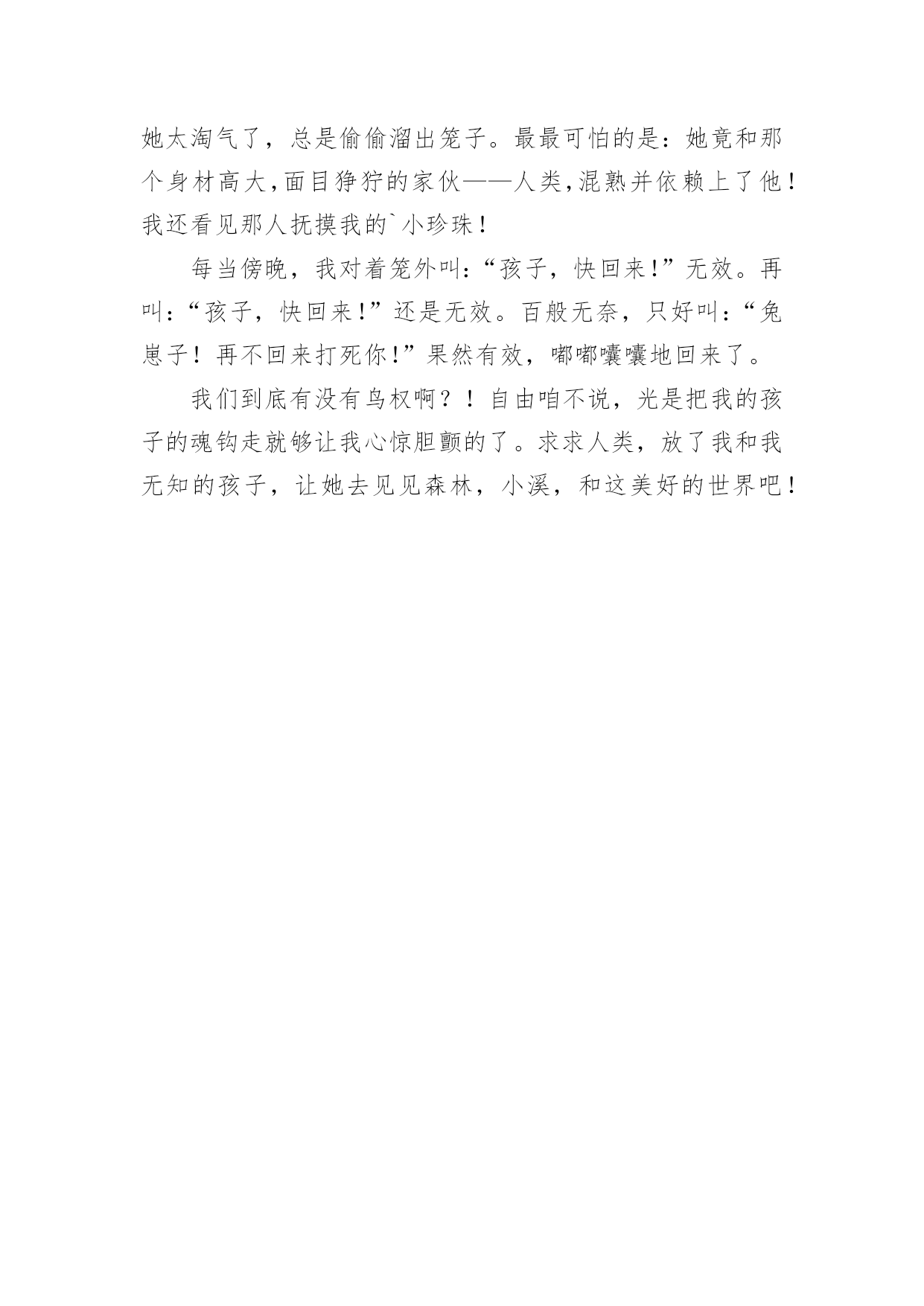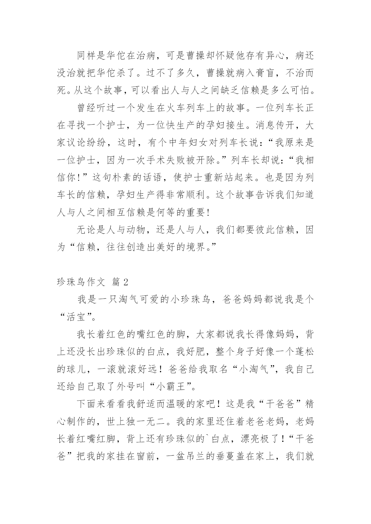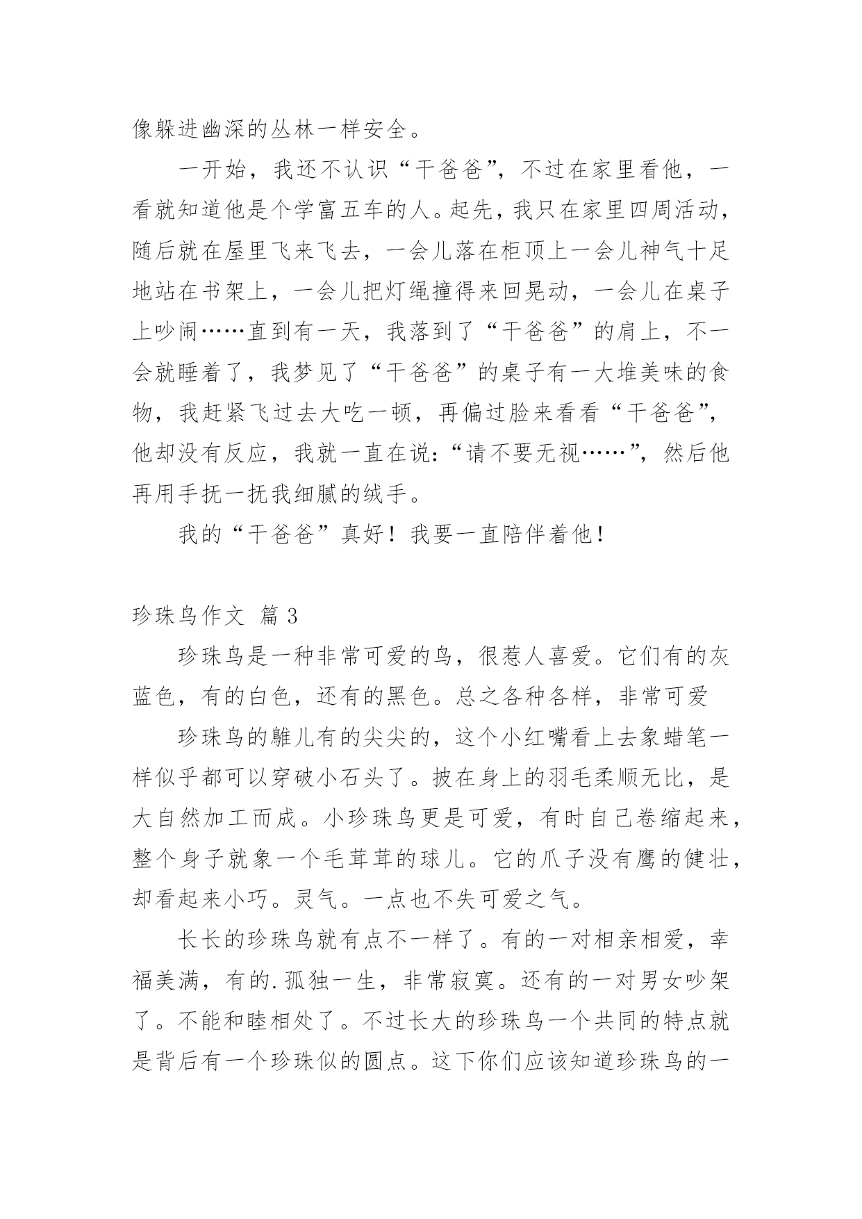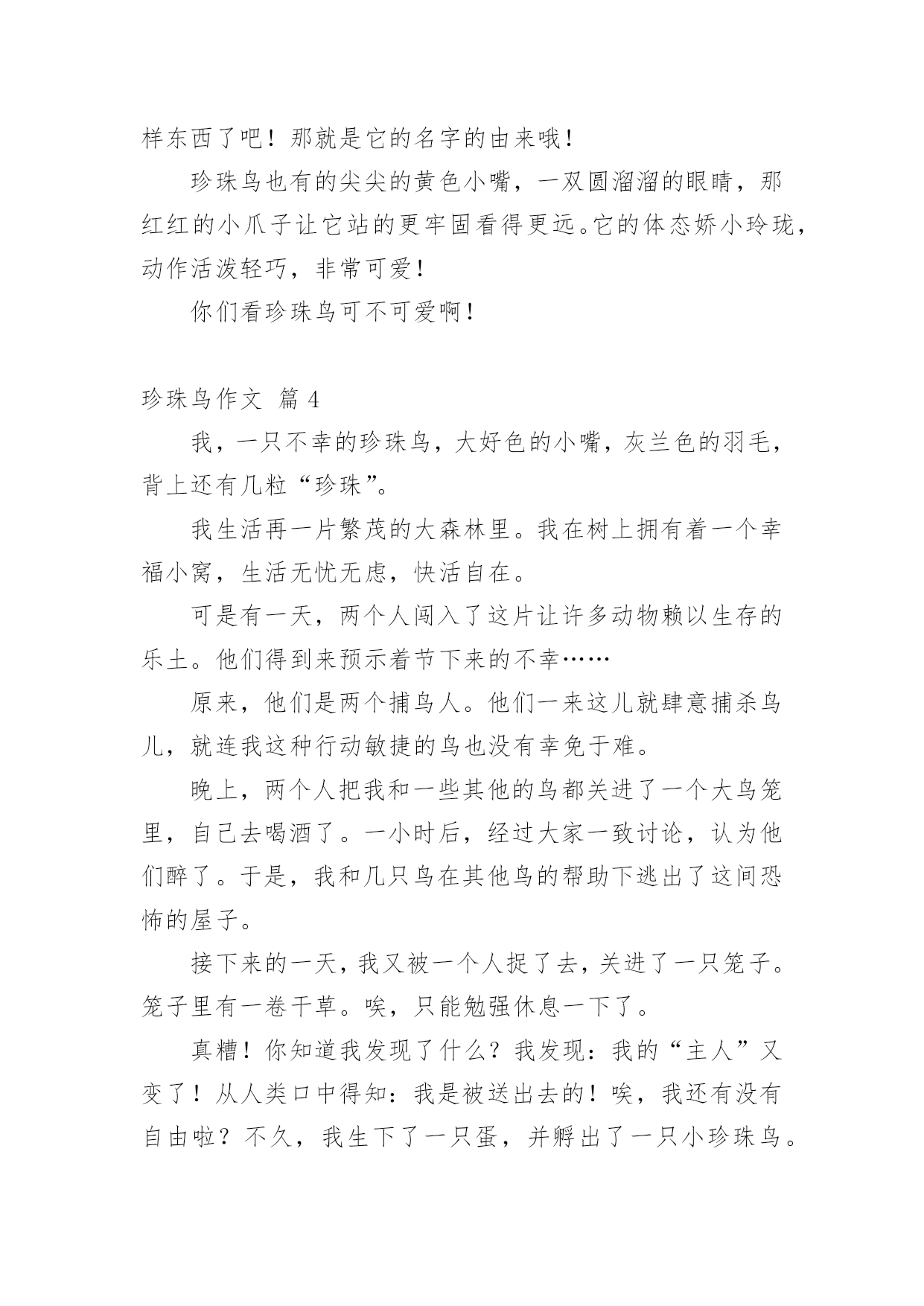 珍珠鸟作文 【精选】珍珠鸟作文四篇在日复一日的学习、工作或生活中,大家都经常接触到作文吧,作文要求篇章结构完整,一定要避免无结尾作文的出现。你知道作文怎样才能写的好吗?下面是小编为大家收集的珍珠鸟作文4篇,欢迎大家分享。珍珠鸟作文篇1“信赖,往往创造出美好的境界。”这句话,是我国著名的作家冯骥才在《珍珠鸟》这篇文章中所写的。原本,珍珠鸟是一种害怕人的鸟,因为珍珠鸟信赖它的主人,主人也同样信赖他的珍珠鸟,彼此之间相互信赖,使一种害怕人的鸟变成一种大胆与人接触的鸟。这不就是一种美好的`境界嘛?既然,人能与动物都能彼此之间相互信赖,创造出美好的境界。那么人与人相互信赖,结果又会怎么样呢?大家应该读过《三国演义》吧,小说里面有这一位主人公,他是蜀国的一将——关羽。在一次战斗中,被敌人的毒箭射中毒很快在他的身上蔓延开来,如不立即动手术,就会有生命危险。关羽信赖神医华佗,请华佗为他医治,华佗一到。关羽就毫不犹豫地让华佗为他做手术,因为关羽的信赖,自己的命保住了。同样是华佗在治病,可是曹操却怀疑他存有异心,病还没治就把华佗杀了。过不了多久,曹操就病入膏盲,不治而死。从这个故事,可以看出人与人之间缺乏信赖是多么可怕。曾经听过一个发生在火车列车上的故事。一位列车长正在寻找一个护士,为一位快生产的孕妇接生。消息传开,大家议论纷纷,这时,有个中年妇女对列车长说:“我原来是一位护士,因为一次手术失败被开除。”列车长却说:“我相信你!”这句朴素的话语,使护士重新站起来。也是因为列车长的信赖,孕妇生产得非常顺利。这个故事告诉我们知道人与人之间相互信赖是何等的重要!无论是人与动物,还是人与人,我们都要彼此信赖,因为“信赖,往往创造出美好的境界。”珍珠鸟作文篇2我是一只淘气可爱的小珍珠鸟,爸爸妈妈都说我是个“活宝”。我长着红色的嘴红色的脚,大家都说我长得像妈妈,背上还没长出珍珠似的白点,我好肥,整个身子好像一个蓬松的球儿,一滚就滚好远!爸爸给我取名“小淘气”,我自己还给自己取了外号叫“小霸王”。下面来看看我舒适而温暖的家吧!这是我“干爸爸”精心制作的,世上独一无二。我的家里还住着老爸老妈,老妈长着红嘴红脚,背上还有珍珠似的`白点,漂亮极了!“干爸爸”把我的家挂在窗前,一盆吊兰的垂蔓盖在家上,我们就像躲进幽深的丛林一样安全。一开始,我还不认识“干爸爸”,不过在家里看他,一看就知道他是个学富五车的人。起先,我只在家里四周活动,随后就在屋里飞来飞去,一会儿落在柜顶上一会儿神气十足地站在书架上,一会儿把灯绳撞得来回晃动,一会儿在桌子上吵闹……直到有一天,我落到了“干爸爸”的肩上,不一会就睡着了,我梦见了“干爸爸”的桌子有一大堆美味的食物,我赶紧飞过去大吃一顿,再偏过脸来看看“干爸爸”,他却没有反应,我就一直在说:“请不要无视……”,然后他再用手抚一抚我细腻的绒手。我的“干爸爸”真好!我要一直陪伴着他!珍珠鸟作文篇3珍珠鸟是一种非常可爱的鸟,很惹人喜爱。它们有的灰蓝色,有的白色,还有的黑色。总之各种各样,非常可爱珍珠鸟的鵻儿有的尖尖的,这个小红嘴看上去象蜡笔一样似乎都可以穿破小石头了。披在身上的羽毛柔顺无比,是大自然加工而成。小珍珠鸟更是可爱,有时自己卷缩起来,整个身子就象一个毛茸茸的球儿。它的爪子没有鹰的健壮,却看起来小巧。灵气。一点也不失可爱之气。长长的珍珠鸟就有点不一样了。有的一对相亲相爱,幸福美满,有的.孤独一生,非常寂寞。还有的一对男女吵架了。不能和睦相处了。不过长大的珍珠鸟一个共同的特点就是背后有一个珍珠似的圆点。这下你们应该知道珍珠鸟的一样东西了吧!那就是它的名字的由来哦!珍珠鸟也有的尖尖的黄色小嘴,一双圆溜溜的眼睛,那红红的小爪子让它站的更牢固看得更远。它的体态娇小玲珑,动作活泼轻巧,非常可爱!你们看珍珠鸟可不可爱啊!珍珠鸟作文篇4我,一只不幸的珍珠鸟,大好色的小嘴,灰兰色的羽毛,背上还有几粒“珍珠”。我生活再一片繁茂的大森林里。我在树上拥有着一个幸福小窝,生活无忧无虑,快活自在。可是有一天,两个人闯入了这片让许多动物赖以生存的乐土。他们得到来预示着节下来的不幸……原来,他们是两个捕鸟人。他们一来这儿就肆意捕杀鸟儿,就连我这种行动敏捷的鸟也没有幸免于难。晚上,两个人把我和一些其他的鸟都关进了一个大鸟笼里,自己去喝酒了。一小时后,经过大家一致讨论,认为他们醉了。于是,我和几只鸟在其他鸟的帮助下逃出了这间恐怖的屋子。接下来的一天,我又被一个人捉了去,关进了一只笼子。笼子里有一卷干草。唉,只能勉强休息一下了。真糟!你知道我发现了什么?我发现:我的“主人”又变了!从人类口中得知:我是被送出去的!唉,我还有没有自由啦?不久,我生下了一只蛋,并孵出了一只小珍珠鸟。她太淘气了,总是偷偷溜出笼子。最最可怕的是:她竟和那个身材高大,面目狰狞的家伙——人类,混熟并依赖上