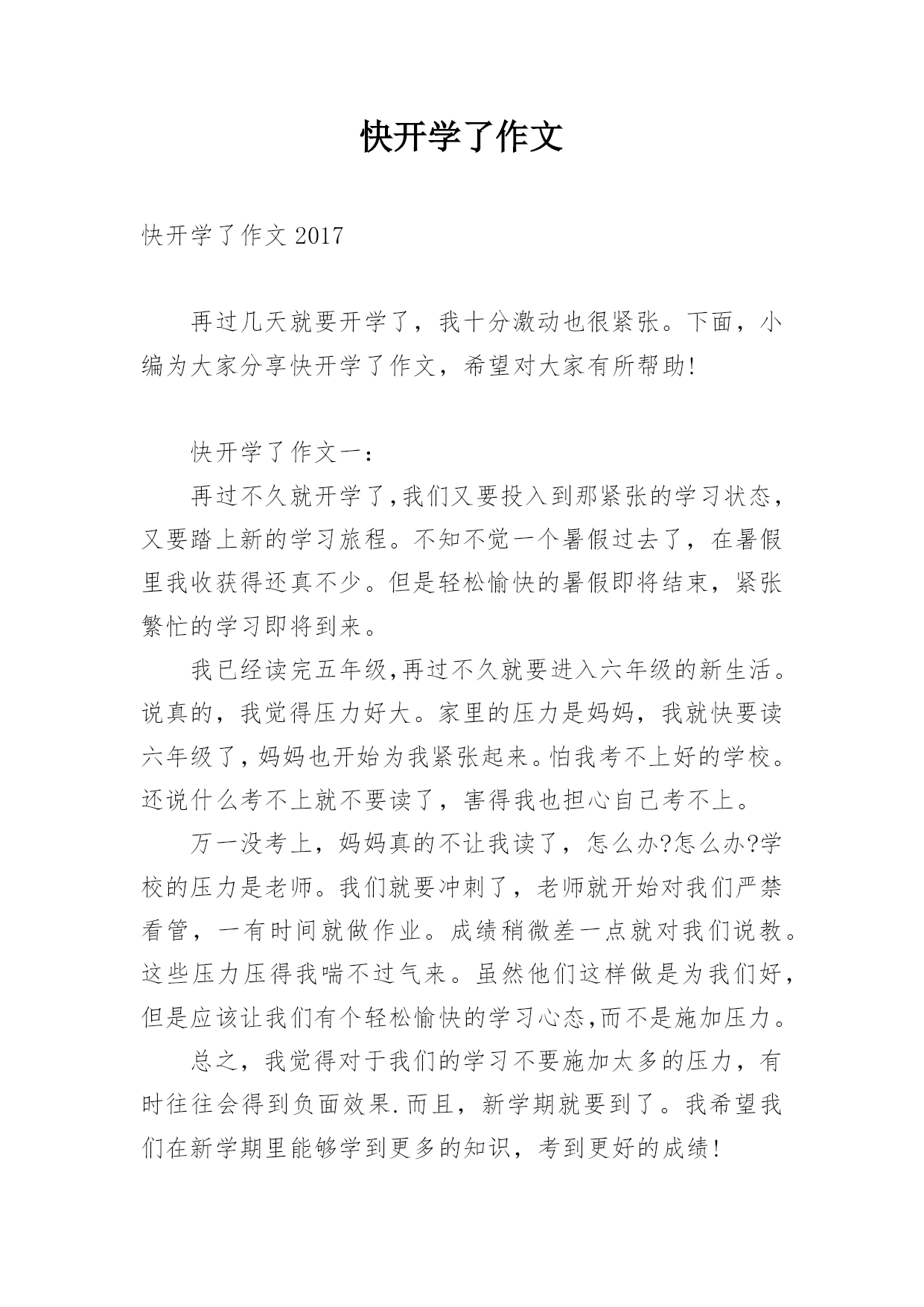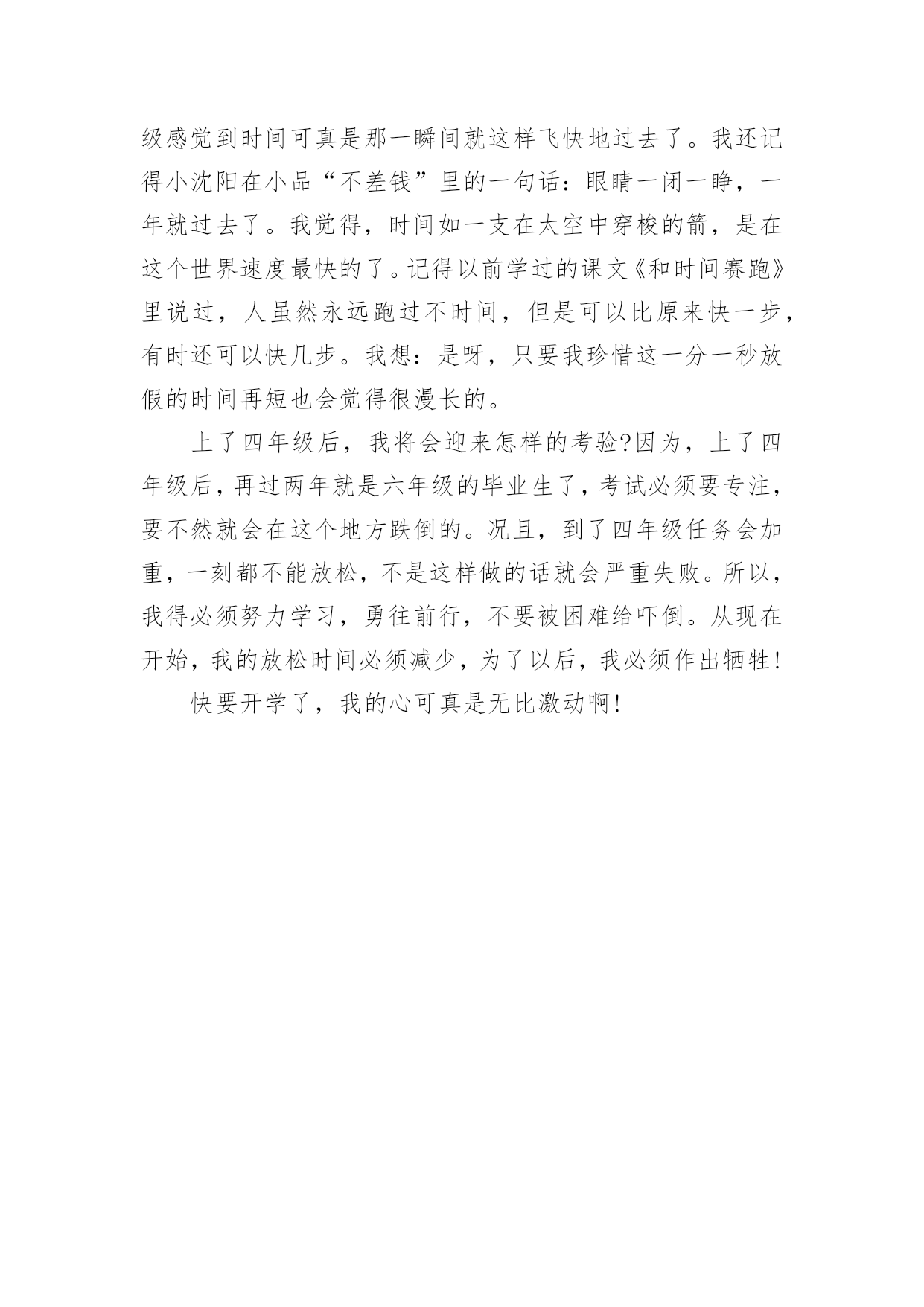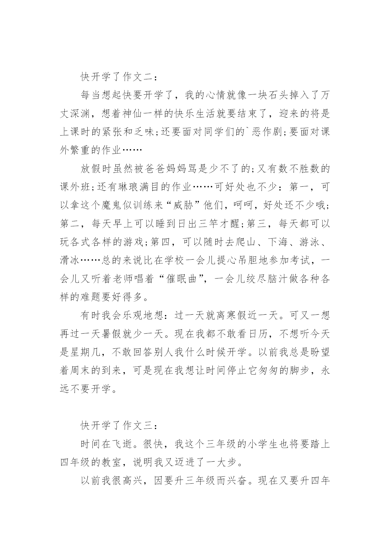 快开学了作文 快开学了作文2017再过几天就要开学了,我十分激动也很紧张。下面,小编为大家分享快开学了作文,希望对大家有所帮助!快开学了作文一:再过不久就开学了,我们又要投入到那紧张的学习状态,又要踏上新的学习旅程。不知不觉一个暑假过去了,在暑假里我收获得还真不少。但是轻松愉快的暑假即将结束,紧张繁忙的学习即将到来。我已经读完五年级,再过不久就要进入六年级的新生活。说真的,我觉得压力好大。家里的压力是妈妈,我就快要读六年级了,妈妈也开始为我紧张起来。怕我考不上好的学校。还说什么考不上就不要读了,害得我也担心自己考不上。万一没考上,妈妈真的不让我读了,怎么办?怎么办?学校的压力是老师。我们就要冲刺了,老师就开始对我们严禁看管,一有时间就做作业。成绩稍微差一点就对我们说教。这些压力压得我喘不过气来。虽然他们这样做是为我们好,但是应该让我们有个轻松愉快的学习心态,而不是施加压力。总之,我觉得对于我们的学习不要施加太多的压力,有时往往会得到负面效果.而且,新学期就要到了。我希望我们在新学期里能够学到更多的知识,考到更好的成绩!快开学了作文二:每当想起快要开学了,我的心情就像一块石头掉入了万丈深渊,想着神仙一样的快乐生活就要结束了,迎来的将是上课时的紧张和乏味;还要面对同学们的`恶作剧;要面对课外繁重的作业……放假时虽然被爸爸妈妈骂是少不了的;又有数不胜数的课外班;还有琳琅满目的作业……可好处也不少:第一,可以拿这个魔鬼似训练来“威胁”他们,呵呵,好处还不少哦;第二,每天早上可以睡到日出三竿才醒;第三,每天都可以玩各式各样的游戏;第四,可以随时去爬山、下海、游泳、滑冰……总的来说比在学校一会儿提心吊胆地参加考试,一会儿又听着老师唱着“催眠曲”,一会儿绞尽脑汁做各种各样的难题要好得多。有时我会乐观地想:过一天就离寒假近一天。可又一想再过一天暑假就少一天。现在我都不敢看日历,不想听今天是星期几,不敢回答别人我什么时候开学。以前我总是盼望着周末的到来,可是现在我想让时间停止它匆匆的脚步,永远不要开学。快开学了作文三:时间在飞逝。很快,我这个三年级的小学生也将要踏上四年级的教室,说明我又迈进了一大步。以前我很高兴,因要升三年级而兴奋。现在又要升四年级感觉到时间可真是那一瞬间就这样飞快地过去了。我还记得小沈阳在小品“不差钱”里的一句话:眼睛一闭一睁,一年就过去了。我觉得,时间如一支在太空中穿梭的箭,是在这个世界速度最快的了。记得以前学过的课文《和时间赛跑》里说过,人虽然永远跑过不时间,但是可以比原来快一步,有时还可以快几步。我想:是呀,只要我珍惜这一分一秒放假的时间再短也会觉得很漫长的。上了四年级后,我将会迎来怎样的考验?因为,上了四年级后,再过两年就是六年级的毕业生了,考试必须要专注,要不然就会在这个地方跌倒的。况且,到了四年级任务会加重,一刻都不能放松,不是这样做的话就会严重失败。所以,我得必须努力学习,勇往前行,不要被困难给吓倒。从现在开始,我的放松时间必须减少,为了以后,我必须作出牺牲!快要开学了,我的心可真是无比激动啊!