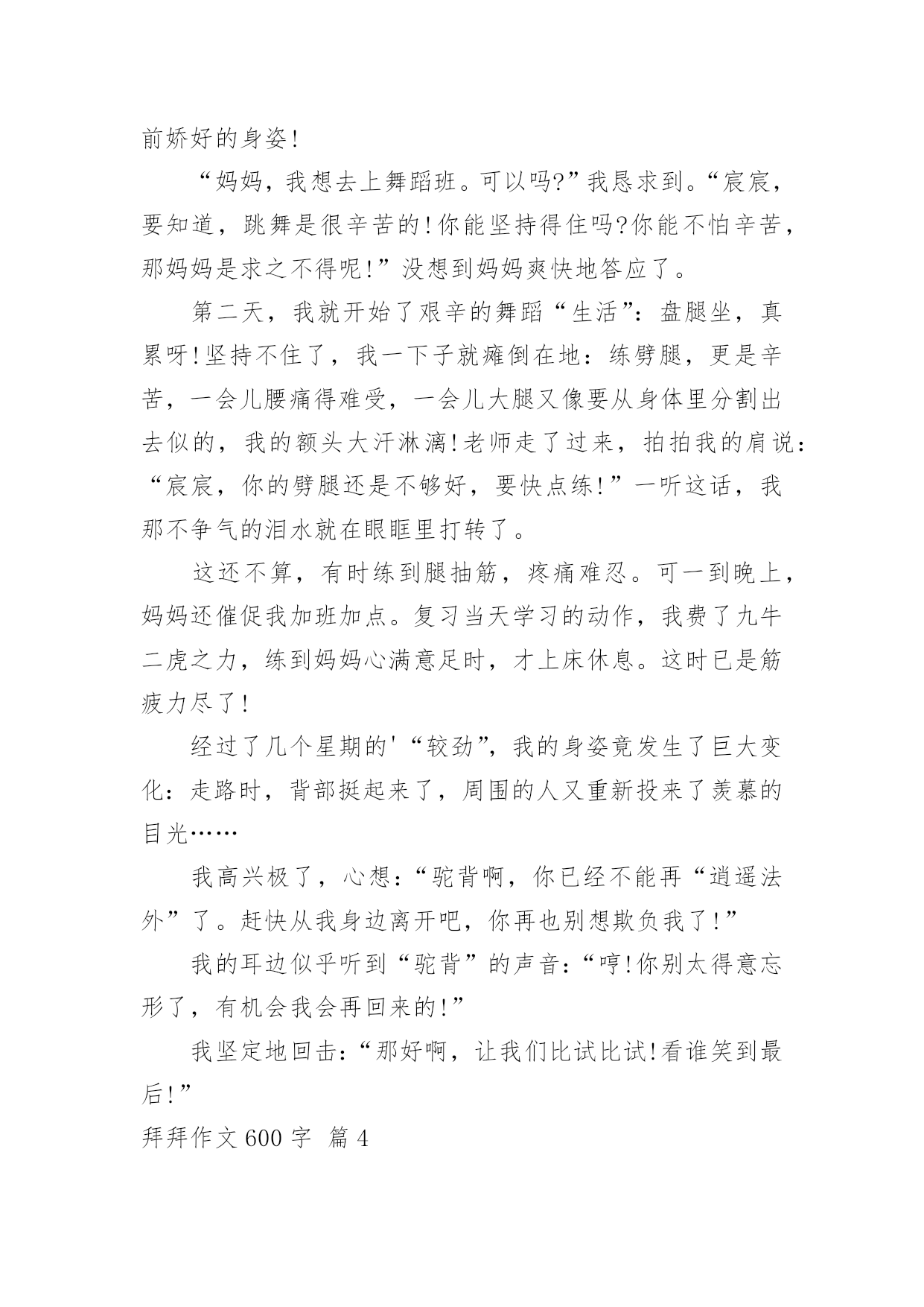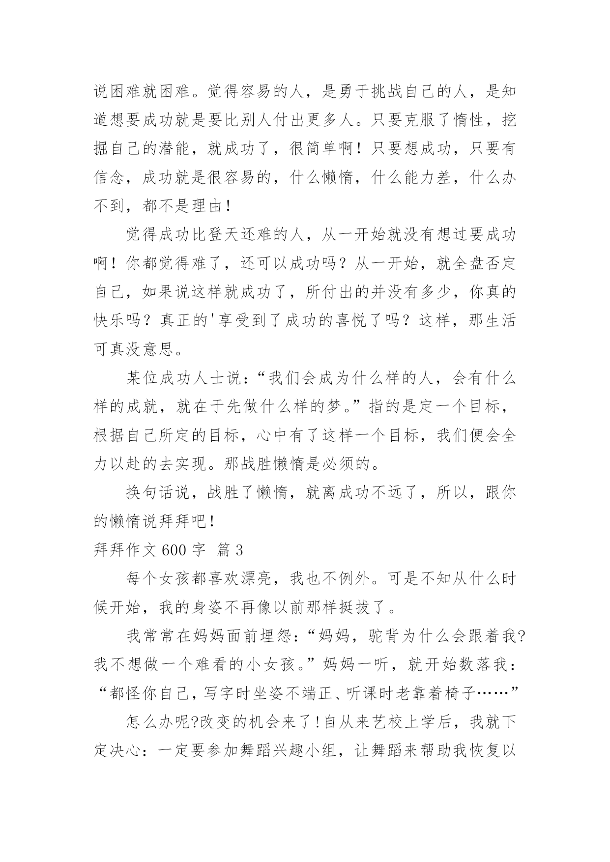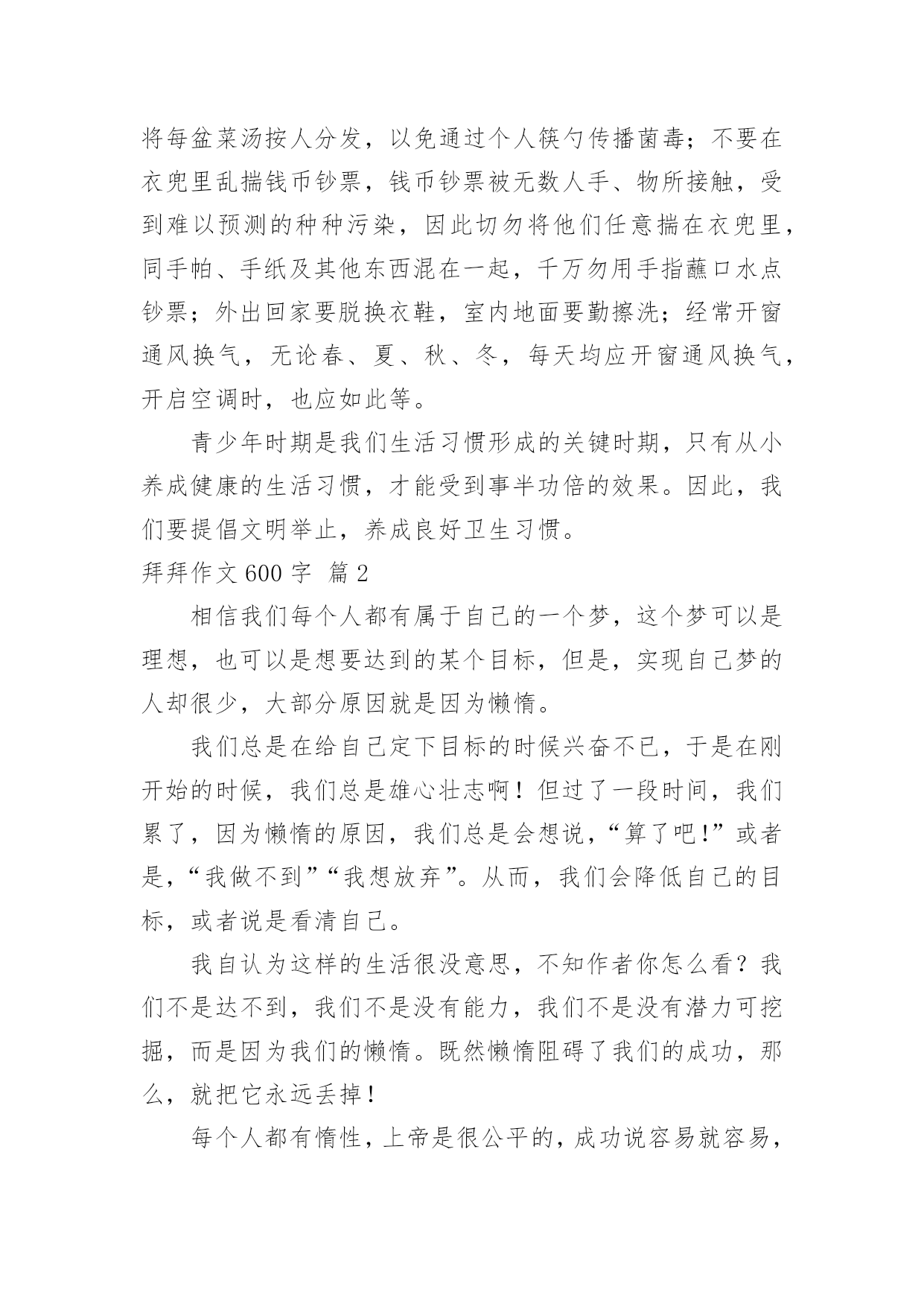 拜拜作文600字 拜拜作文600字在生活、工作和学习中,大家总免不了要接触或使用作文吧,作文根据体裁的不同可以分为记叙文、说明文、应用文、议论文。怎么写作文才能避免踩雷呢?以下是小编整理的拜拜作文600字7篇,欢迎阅读与收藏。拜拜作文600字篇1传染病是威胁人类健康的第一杀手,面对这一无形的杀手,我们该采取怎样的措施呢?读了《青少年健康读本》以后,使我知道它的扩散其实可以受环境和条件的制约,并非无所不在,无孔不入。它的传播是人为对象,也是以人的行为为媒介,我们的一举一动都与它的传播有关。从而改正平时的不良习惯是我们现在最有效的武器。就从我们身边最小的做起。改正随地吐痰的.习惯,因为痰液中含有上千种菌,在日常环境里可存活几天至几十天,有的伴随空气四处飘散,引起各种疾病的传播;打喷嚏、咳嗽应用手帕或纸巾捂住口鼻,否则会将飞沫、唾液溅到别人身上从而传播病菌;脏物、垃圾含有各种细菌、病毒,我们更不能乱扔;每次外出都有可能因接触门把、扶手、柜台、电话等以及与他人握手而污染了自己手指掌,因此要注意洗手以消除隐患;每次用餐进食前,更应用肥皂和流动水认真洗手,养成良好习惯;与他人同桌用餐时,最好采用分食制,将每盆菜汤按人分发,以免通过个人筷勺传播菌毒;不要在衣兜里乱揣钱币钞票,钱币钞票被无数人手、物所接触,受到难以预测的种种污染,因此切勿将他们任意揣在衣兜里,同手帕、手纸及其他东西混在一起,千万勿用手指蘸口水点钞票;外出回家要脱换衣鞋,室内地面要勤擦洗;经常开窗通风换气,无论春、夏、秋、冬,每天均应开窗通风换气,开启空调时,也应如此等。青少年时期是我们生活习惯形成的关键时期,只有从小养成健康的生活习惯,才能受到事半功倍的效果。因此,我们要提倡文明举止,养成良好卫生习惯。拜拜作文600字篇2相信我们每个人都有属于自己的一个梦,这个梦可以是理想,也可以是想要达到的某个目标,但是,实现自己梦的人却很少,大部分原因就是因为懒惰。我们总是在给自己定下目标的时候兴奋不已,于是在刚开始的时候,我们总是雄心壮志啊!但过了一段时间,我们累了,因为懒惰的原因,我们总是会想说,“算了吧!”或者是,“我做不到”“我想放弃”。从而,我们会降低自己的目标,或者说是看清自己。我自认为这样的生活很没意思,不知作者你怎么看?我们不是达不到,我们不是没有能力,我们不是没有潜力可挖掘,而是因为我们的懒惰。既然懒惰阻碍了我们的成功,那么,就把它永远丢掉!每个人都有惰性,上帝是很公平的,成功说容易就容易,说困难就困难。觉得容易的人,是勇于挑战自己的人,是知道想要成功就是要比别人付出更多人。只要克服了惰性,挖掘自己的潜能,就成功了,很简单啊!只要想成功,只要有信念,成功就是很容易的,什么懒惰,什么能力差,什么办不到,都不是理由!觉得成功比登天还难的人,从一开始就没有想过要成功啊!你都觉得难了,还可以成功吗?从一开始,就全盘否定自己,如果说这样就成功了,所付出的并没有多少,你真的快乐吗?真正的'享受到了成功的喜悦了吗?这样,那生活可真没意思。某位成功人士说:“我们会成为什么样的人,会有什么样的成就,就在于先做什么样的梦。”指的是定一个目标,根据自己所定的目标,心中有了这样一个目标,我们便会全力以赴的去实现。那战胜懒惰是必须的。换句话说,战胜了懒惰,就离成功不远了,所以,跟你的懒惰说拜拜吧!拜拜作文600字篇3每个女孩都喜欢漂亮,我也不例外。可是不知从什么时候开始,我的身姿不再像以前那样挺拔了。我常常在妈妈面前埋怨:“妈妈,驼背为什么会跟着我?我不想做一个难看的小女孩。”妈妈一听,就开始数落我:“都怪你自己,写字时坐姿不端正、听课时老靠着椅子……”怎么办呢?改变的机会来了!自从来艺校上学后,我就下定决心:一定要参加舞蹈兴趣小组,让舞蹈来帮助我恢复以前娇好的身姿!“妈妈,我想去上舞蹈班。可以吗?”我恳求到。“宸宸,要知道,跳舞是很辛苦的!你能坚持得住吗?你能不怕辛苦,那妈妈是求之不得呢!”没想到妈妈爽快地答应了。第二天,我就开始了艰辛的舞蹈“生活”:盘腿坐,真累呀!坚持不住了,我一下子就瘫倒在地:练劈腿,更是辛苦,一会儿腰痛得难受,一会儿大腿又像要从身体里分割出去似的,我的额头大汗淋漓!老师走了过来,拍拍我的肩说:“宸宸,你的劈腿还是不够好,要快点练!”一听这话,我那不争气的泪水就在眼眶里打转了。这还不算,有时练到腿抽筋,疼痛难忍。可一到晚上,妈妈还催促我加班加点。复习当天学习的动作,我费了九牛二虎之力,练到妈妈心满意足时,才上床休息。这时已是筋疲力尽了!经过了几个星期的'“较劲”,我的身姿竟发生了巨大变化:走路时,背部挺起来了,周围的人又重新投来了羡慕的目光……我高兴极了,心想:“驼背啊,你已经不能再“逍遥法外”了。赶快从我身边离开吧,你再也别想欺负我了!”我的耳边似乎听到“驼背”的声音