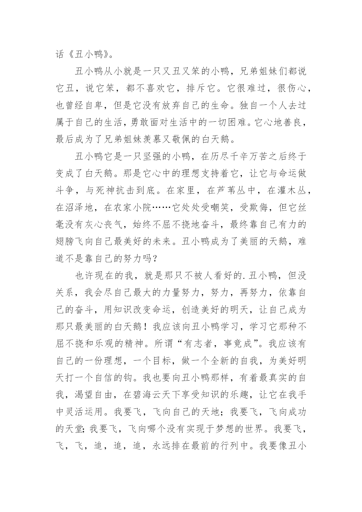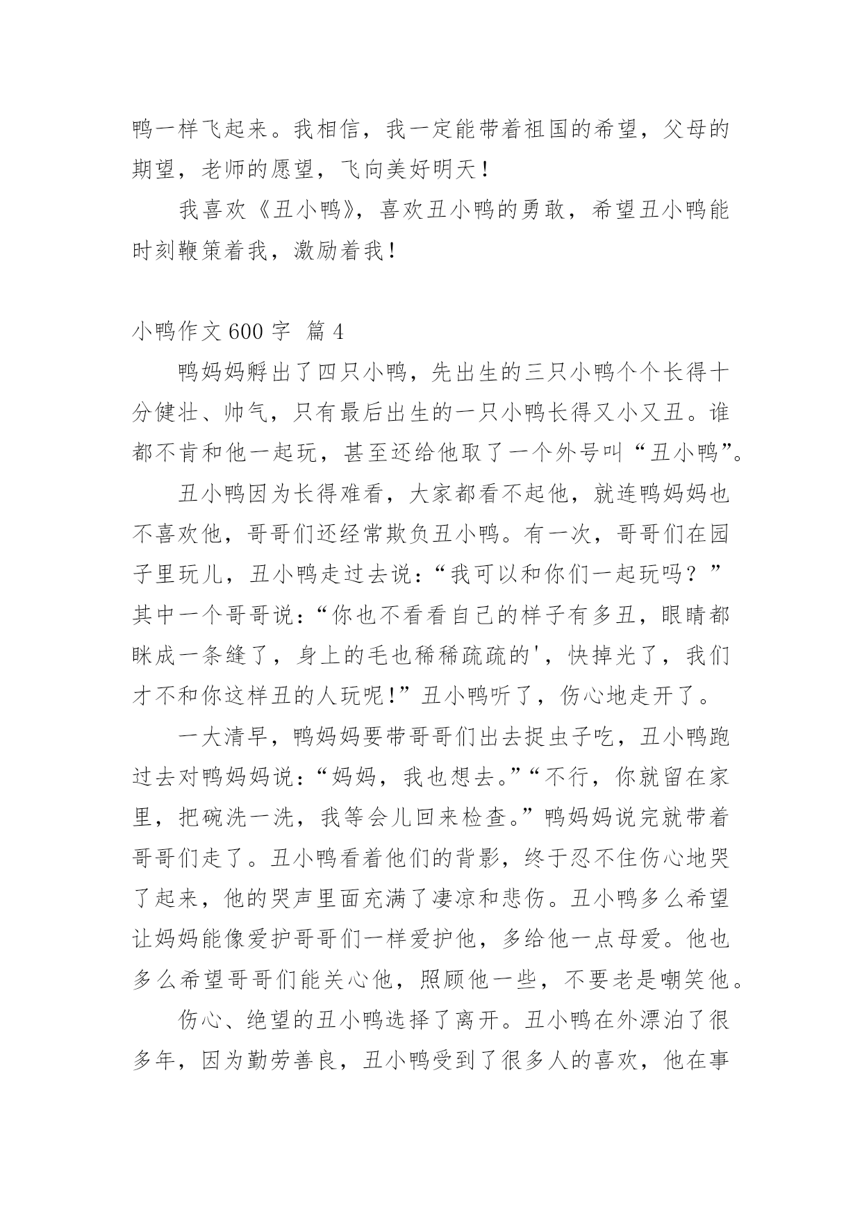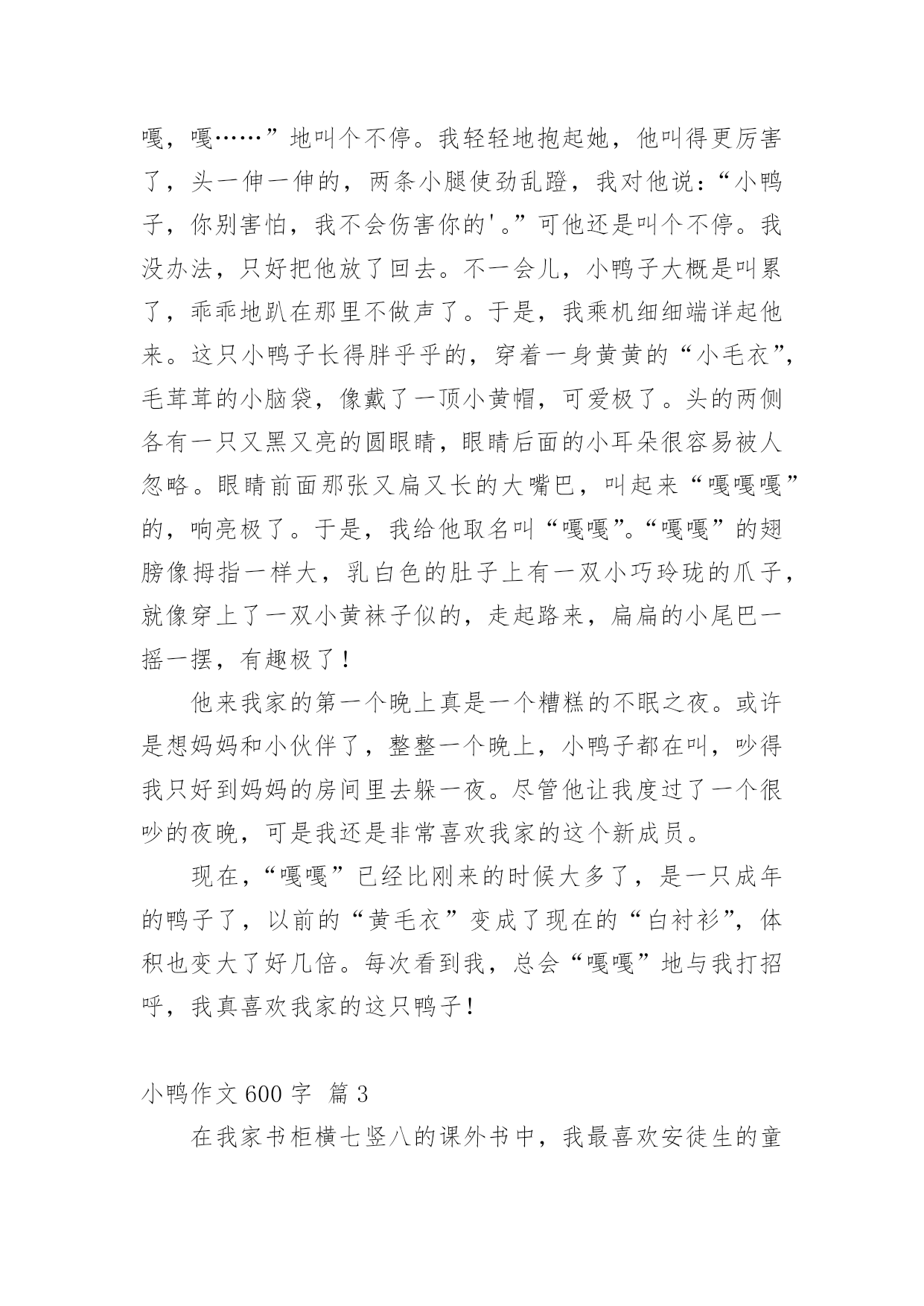 小鸭作文600字 有关小鸭作文600字9篇在日常学习、工作抑或是生活中,大家对作文都再熟悉不过了吧,借助作文可以宣泄心中的情感,调节自己的心情。如何写一篇有思想、有文采的作文呢?以下是小编帮大家整理的小鸭作文600字9篇,仅供参考,欢迎大家阅读。小鸭作文600字篇1丑小鸭生下来的时候就长得特别丑,因此,父母都很讨厌它,兄弟姐妹也常常嘲笑它,鸭子和鸡见它就会冲过来啄它。丑小鸭十分孤独,感到很自卑,有一天,它悄悄地离开了这里。可是,丑小鸭在外面也一样受尽了苦头,别的动物都排挤它、嘲笑它。在寒冷的冬天,北风呼啸,可是它却连一个栖身之所都没有。于是,丑小鸭只好在冰天雪地里跳来跳去,不让自己被冻僵,它就这样度过了整个冬天。当温暖的春天到来时,丑小鸭竟然变成了一只美丽的白天鹅!这是它做梦也没有想到的,于是它高兴地展翅一飞,飞上了蔚蓝的天空。看完这个故事后,我情不自禁地对丑小鸭升起了敬佩之情:丑小鸭虽然很丑,但它被别的动物欺负,被家人嘲笑时,它选择了离开这个家庭。在寒冷的冬天里,它迎着凛冽的`北风,在雪地里一步步地跳着,没有向死亡低头。最后,丑小鸭实现了自己的梦想——变成了一只美丽的白天鹅!想想丑小鸭,再看看我自己,不免落差太大了。丑小鸭有着那么大的毅力,能一步步地朝着自己的梦想前进。而我呢?我却没有,想想看,真是惭愧。每次遇到困难,都会一筹莫展,又不会动动脑筋想想办法,总是等到别人来解决问题,就拿学习来说吧!在作业里,难免会有几道难一点的题,可我总不爱动脑筋,每次都要等到爸爸来辅导我。为此,爸爸经常教育我:“你呀!要是能动脑筋解决问题,那太阳就从西边出来喽!”我听到这句话,不好意思的挠挠头。“记住。”爸爸像京剧里的演员一样,转眼就变了脸,“你遇到困难时,一定要沉着冷静地思考,想办法,不要知难而退,要不然,你以后可是要吃大亏的!”看着爸爸那一脸的严肃,我似懂非懂的点了点头。我一定要像丑小鸭一样,心中存着梦想,只要坚持不懈,勇敢地向梦想前进,就一定能成为梦想中的白天鹅!小鸭作文600字篇2前年秋天的一个傍晚,妈妈带我去市场买菜,她看见卖白菜的,就转身去买了。我闲着无聊正东张西望呢,突然,在嘈杂的说话声中传来了稚嫩的鸭子叫声。我忍不住拉着妈妈的手跑过去,抱起小鸭子不肯放手。妈妈见我这么喜欢,就给我买了一只最活泼可爱的小公鸭。小鸭子到我家后,我先用纸箱子给他做了个小小的“家”,让他安顿下来。可是一进“家门”,他就在里面“嘎,嘎,嘎……”地叫个不停。我轻轻地抱起她,他叫得更厉害了,头一伸一伸的,两条小腿使劲乱蹬,我对他说:“小鸭子,你别害怕,我不会伤害你的'。”可他还是叫个不停。我没办法,只好把他放了回去。不一会儿,小鸭子大概是叫累了,乖乖地趴在那里不做声了。于是,我乘机细细端详起他来。这只小鸭子长得胖乎乎的,穿着一身黄黄的“小毛衣”,毛茸茸的小脑袋,像戴了一顶小黄帽,可爱极了。头的两侧各有一只又黑又亮的圆眼睛,眼睛后面的小耳朵很容易被人忽略。眼睛前面那张又扁又长的大嘴巴,叫起来“嘎嘎嘎”的,响亮极了。于是,我给他取名叫“嘎嘎”。“嘎嘎”的翅膀像拇指一样大,乳白色的肚子上有一双小巧玲珑的爪子,就像穿上了一双小黄袜子似的,走起路来,扁扁的小尾巴一摇一摆,有趣极了!他来我家的第一个晚上真是一个糟糕的不眠之夜。或许是想妈妈和小伙伴了,整整一个晚上,小鸭子都在叫,吵得我只好到妈妈的房间里去躲一夜。尽管他让我度过了一个很吵的夜晚,可是我还是非常喜欢我家的这个新成员。现在,“嘎嘎”已经比刚来的时候大多了,是一只成年的鸭子了,以前的“黄毛衣”变成了现在的“白衬衫”,体积也变大了好几倍。每次看到我,总会“嘎嘎”地与我打招呼,我真喜欢我家的这只鸭子!小鸭作文600字篇3在我家书柜横七竖八的课外书中,我最喜欢安徒生的童话《丑小鸭》。丑小鸭从小就是一只又丑又笨的小鸭,兄弟姐妹们都说它丑,说它笨,都不喜欢它,排斥它。它很难过,很伤心,也曾经自卑,但是它没有放弃自己的生命。独自一个人去过属于自己的生活,勇敢面对生活中的一切困难。它心地善良,最后成为了兄弟姐妹羡慕又敬佩的白天鹅。丑小鸭它是一只坚强的小鸭,在历尽千辛万苦之后终于变成了白天鹅。那是它心中的理想支持着它,让它与命运做斗争,与死神抗击到底。在家里,在芦苇丛中,在灌木丛,在沼泽地,在农家小院……它处处受嘲笑,受欺侮,但它丝毫没有灰心丧气,始终不屈不挠地奋斗,最终靠自己有力的翅膀飞向自己最美好的未来。丑小鸭成为了美丽的天鹅,难道不是靠自己的努力吗?也许现在的我,就是那只不被人看好的.丑小鸭,但没关系,我会尽自己最大的力量努力,努力,再努力,依靠自己的奋斗,用知识改变命运,创造美好的明天,让自己成为那只最美丽的白天鹅!我应该向丑小鸭学习,学习它那种不屈不挠和乐观的精神。所谓“有志者,事竟成”。我应该有自己的一份理想,一个