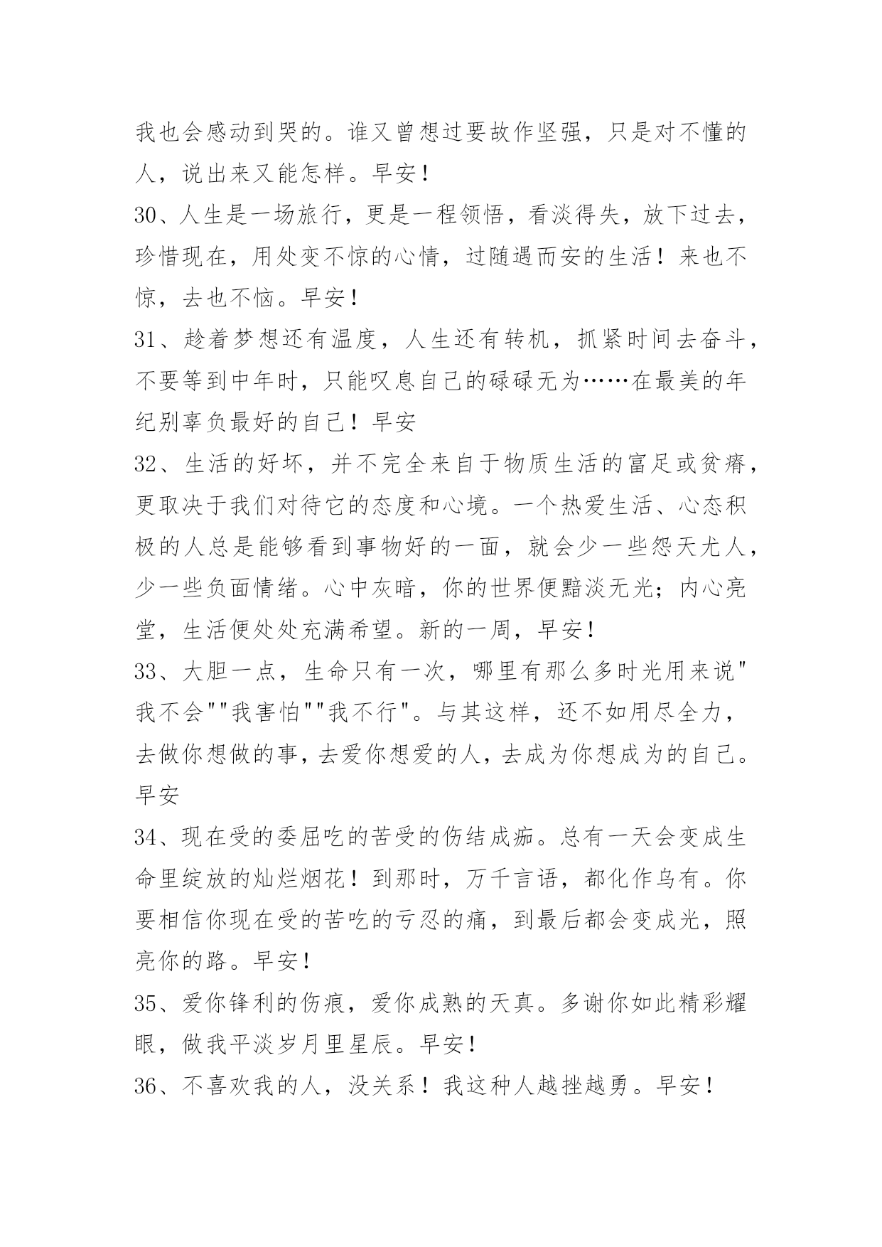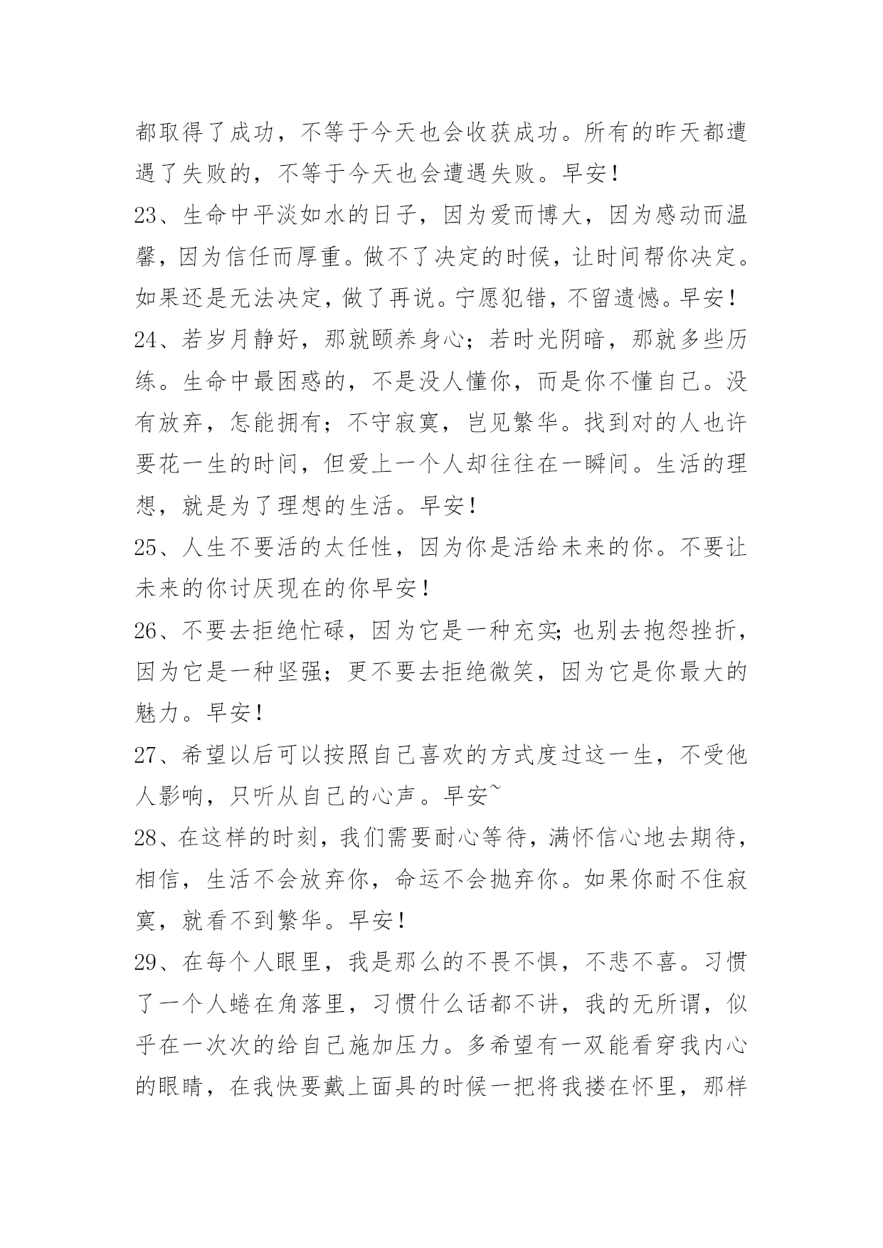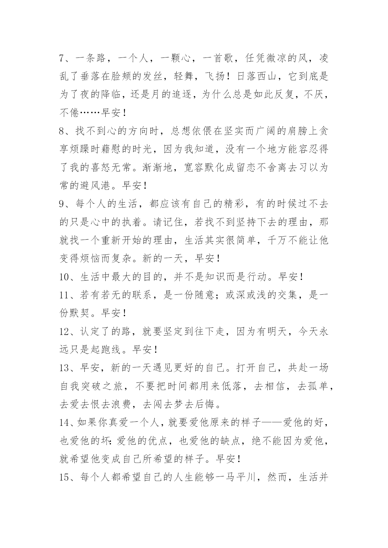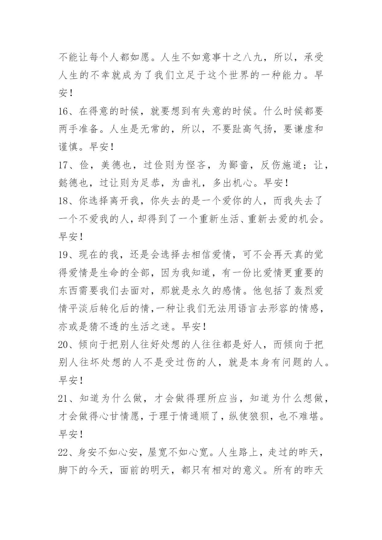 新版早安问候语短信44条 精选新版早安问候语短信44条暴风雨过后,一定会见到彩虹。早安!下面是小编给各位读者分享的新版早安问候语44条,一起来欣赏吧。1、繁花似锦,光阴于指缝间绵软。仿若昨日刚走过那银碗盛雪般清宁的季节,一睁眼,又听见花开的声音。闲踏清风,一个人轻依在鸟语花香的世间里,醉遇花开,让那零零散散的心事,与花香共舞。早安!2、人生,无需繁华,生活的安乐在于平淡。一路走来,免不了会携带岁月的尘埃,生活总会给我们留下许多感慨,经过的事,路过的人,都给我们留下很多故事,偶尔翻阅起来,还会是一种感动。早安!3、如果剪掉一段回忆,能像剪短头发那样干净利落就好了。早安!4、慢慢觉得,所谓坚定不移,其实就是两个人都能在彼此犹豫的时候拉对方一把,路就走下去了。人生那么长,未知的东西那么多,我等皆凡人,总会遇到各种问题。我们不能保证一个美好积极的未来,但我至少能保证,给你我的心。早安!5、人在健康时,应多做善事、利益人群,多造善因福果,为自己铺好人生健康之道。否则一旦病障现前,身心不得自在时,子媳再孝顺也只能尽人事。早安!6、只有做好人,才能做好事。早安!7、一条路,一个人,一颗心,一首歌,任凭微凉的风,凌乱了垂落在脸颊的发丝,轻舞,飞扬!日落西山,它到底是为了夜的降临,还是月的追逐,为什么总是如此反复,不厌,不倦……早安!8、找不到心的方向时,总想依偎在坚实而广阔的肩膀上贪享烦躁时藉慰的时光,因为我知道,没有一个地方能容忍得了我的喜怒无常。渐渐地,宽容默化成留恋不舍离去习以为常的避风港。早安!9、每个人的生活,都应该有自己的精彩,有的时候过不去的只是心中的执着。请记住,若找不到坚持下去的理由,那就找一个重新开始的理由,生活其实很简单,千万不能让他变得烦恼而复杂。新的一天,早安!10、生活中最大的目的,并不是知识而是行动。早安!11、若有若无的联系,是一份随意;或深或浅的交集,是一份默契。早安!12、认定了的路,就要坚定到往下走,因为有明天,今天永远只是起跑线。早安!13、早安,新的一天遇见更好的自己。打开自己,共赴一场自我突破之旅,不要把时间都用来低落,去相信,去孤单,去爱去恨去浪费,去闯去梦去后悔。14、如果你真爱一个人,就要爱他原来的样子——爱他的好,也爱他的坏:爱他的优点,也爱他的缺点,绝不能因为爱他,就希望他变成自己所希望的样子。早安!15、每个人都希望自己的人生能够一马平川,然而,生活并不能让每个人都如愿。人生不如意事十之八九,所以,承受人生的不幸就成为了我们立足于这个世界的一种能力。早安!16、在得意的时候,就要想到有失意的时候。什么时候都要两手准备。人生是无常的,所以,不要趾高气扬,要谦虚和谨慎。早安!17、俭,美德也,过俭则为悭吝,为鄙啬,反伤施道;让,懿德也,过让则为足恭,为曲礼,多出机心。早安!18、你选择离开我,你失去的是一个爱你的人,而我失去了一个不爱我的人,却得到了一个重新生活、重新去爱的机会。早安!19、现在的我,还是会选择去相信爱情,可不会再天真的觉得爱情是生命的全部,因为我知道,有一份比爱情更重要的东西需要我们去面对,那就是永久的感情。他包括了轰烈爱情平淡后转化后的情,一种让我们无法用语言去形容的情感,亦或是猜不透的生活之迷。早安!20、倾向于把别人往好处想的人往往都是好人,而倾向于把别人往坏处想的人不是受过伤的人,就是本身有问题的人。早安!21、知道为什么做,才会做得理所应当,知道为什么想做,才会做得心甘情愿,于理于情通顺了,纵使狼狈,也不难堪。早安!22、身安不如心安,屋宽不如心宽。人生路上,走过的昨天,脚下的今天,面前的明天,都只有相对的意义。所有的昨天都取得了成功,不等于今天也会收获成功。所有的昨天都遭遇了失败的,不等于今天也会遭遇失败。早安!23、生命中平淡如水的日子,因为爱而博大,因为感动而温馨,因为信任而厚重。做不了决定的时候,让时间帮你决定。如果还是无法决定,做了再说。宁愿犯错,不留遗憾。早安!24、若岁月静好,那就颐养身心;若时光阴暗,那就多些历练。生命中最困惑的,不是没人懂你,而是你不懂自己。没有放弃,怎能拥有;不守寂寞,岂见繁华。找到对的人也许要花一生的时间,但爱上一个人却往往在一瞬间。生活的理想,就是为了理想的生活。早安!25、人生不要活的太任性,因为你是活给未来的你。不要让未来的你讨厌现在的你早安!26、不要去拒绝忙碌,因为它是一种充实;也别去抱怨挫折,因为它是一种坚强;更不要去拒绝微笑,因为它是你最大的魅力。早安!27、希望以后可以按照自己喜欢的方式度过这一生,不受他人影响,只听从自己的心声。早安~28、在这样的时刻,我们需要耐心等待,满怀信心地去期待,相信,生活不会放弃你,命运不会抛弃你。如果你耐不住寂寞,就看不到繁华。早安!29、在每个人眼里,我是那么的不畏不惧,不悲