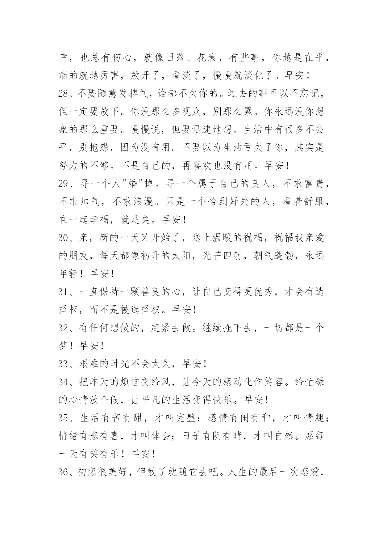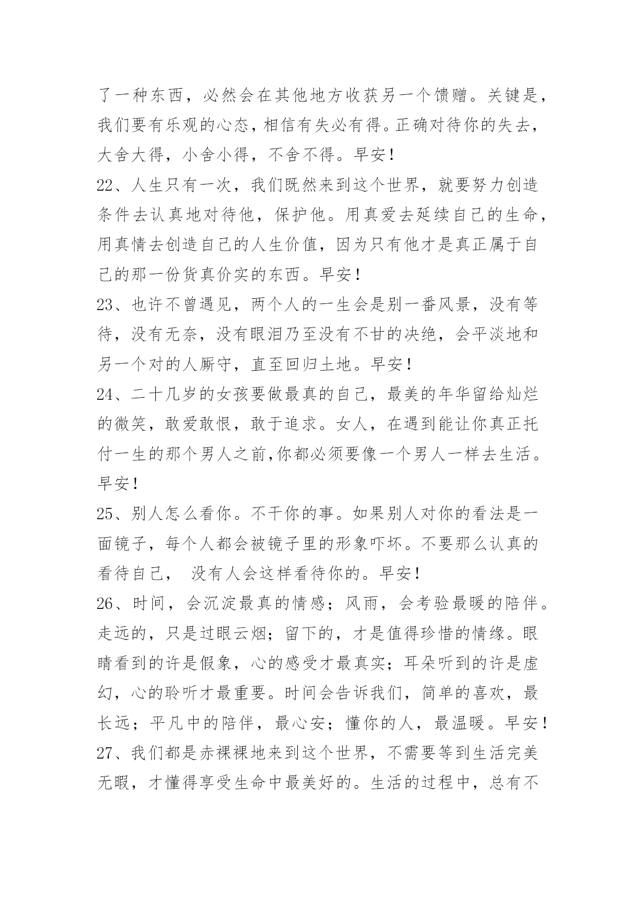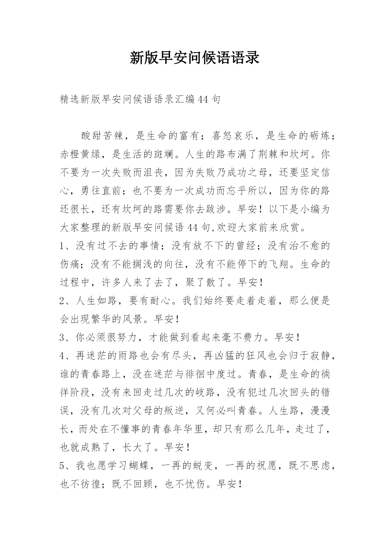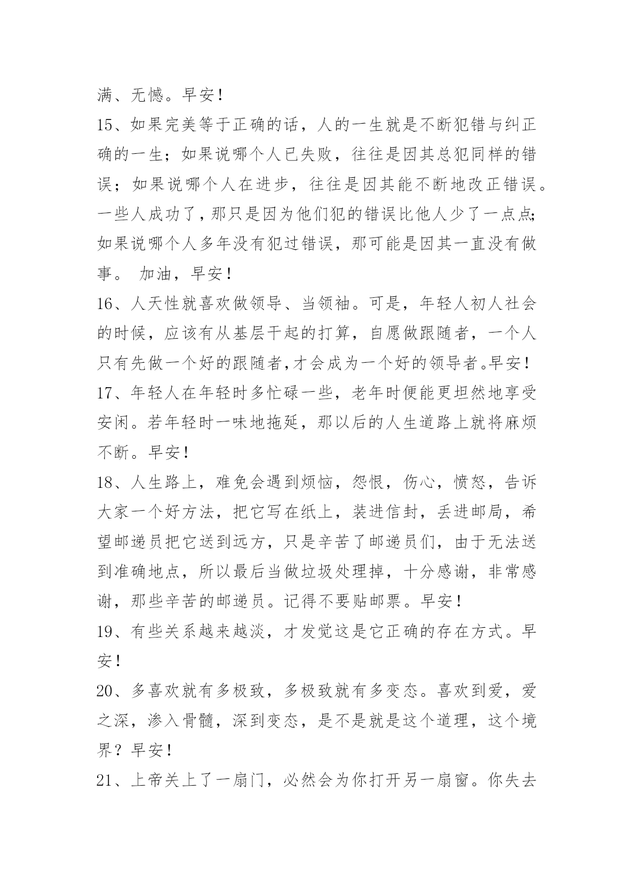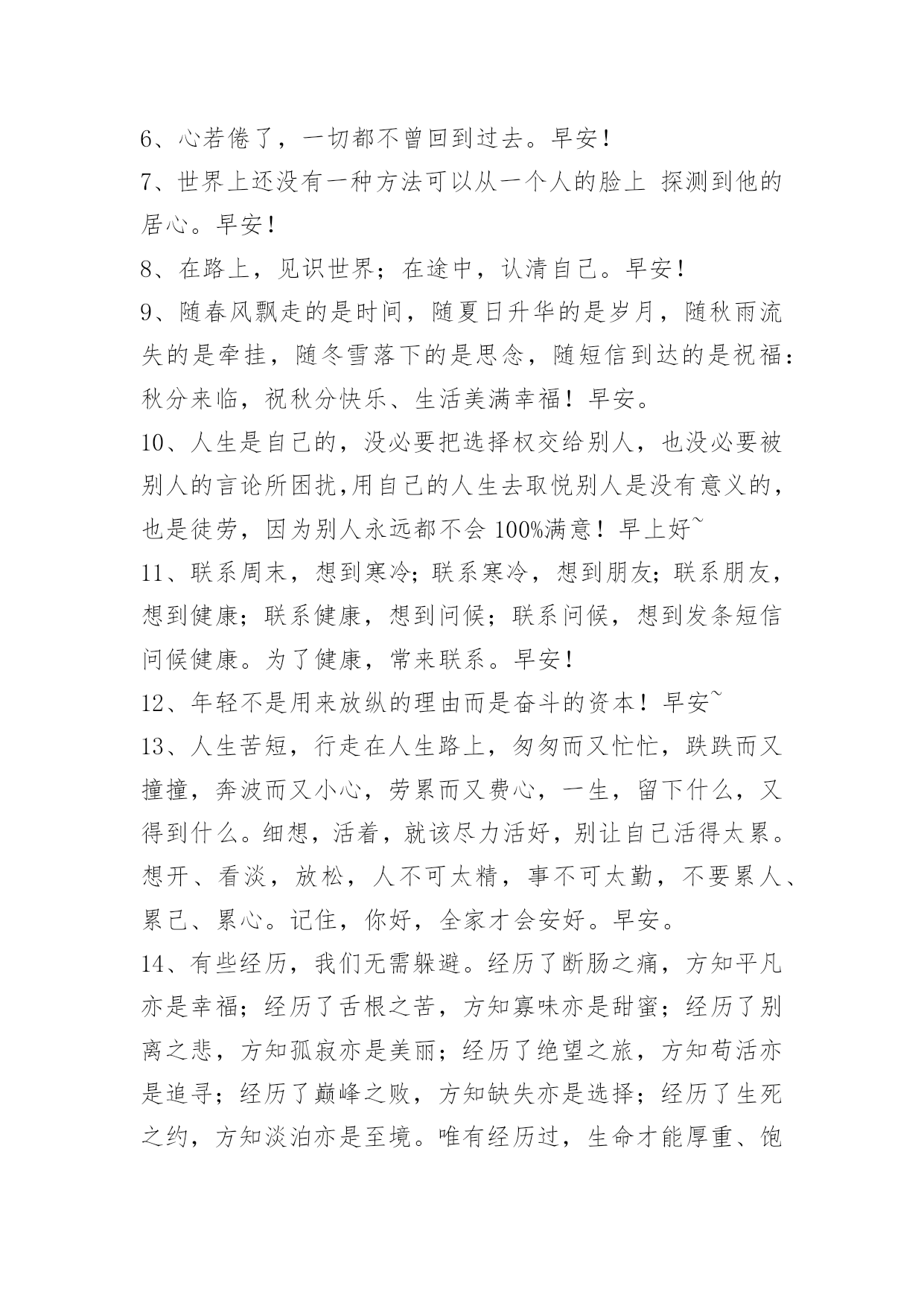 新版早安问候语语录 精选新版早安问候语语录汇编44句酸甜苦辣,是生命的富有;喜怒哀乐,是生命的砺炼;赤橙黄绿,是生活的斑斓。人生的路布满了荆棘和坎坷。你不要为一次失败而沮丧,因为失败乃成功之母,还要坚定信心,勇往直前;也不要为一次成功而忘乎所以,因为你的路还很长,还有坎坷的路需要你去跋涉。早安!以下是小编为大家整理的新版早安问候语44句,欢迎大家前来欣赏。1、没有过不去的事情;没有放不下的曾经;没有治不愈的伤痛;没有不能搁浅的向往,没有不能停下的飞翔。生命的过程中,许多人来了去了,聚了散了。早安!2、人生如路,要有耐心。我们始终要走着走着,那么便是会出现繁华的风景。早安!3、你必须很努力,才能做到看起来毫不费力。早安!4、再迷茫的雨路也会有尽头,再凶猛的狂风也会归于寂静,谁的青春路上,没在迷茫与徘徊中度过。青春,是生命的徜徉阶段,没有来回走过几次的岐路,没有犯过几次回头的错误,没有几次对父母的叛逆,又何必叫青春。人生路,漫漫长,而处在不懂事的青春年华里,却只有那么几年,走过了,也就成熟了,长大了。早安!5、我也愿学习蝴蝶,一再的蜕变,一再的祝愿,既不思虑,也不彷徨;既不回顾,也不忧伤。早安!6、心若倦了,一切都不曾回到过去。早安!7、世界上还没有一种方法可以从一个人的脸上探测到他的居心。早安!8、在路上,见识世界;在途中,认清自己。早安!9、随春风飘走的是时间,随夏日升华的是岁月,随秋雨流失的是牵挂,随冬雪落下的是思念,随短信到达的是祝福:秋分来临,祝秋分快乐、生活美满幸福!早安。10、人生是自己的,没必要把选择权交给别人,也没必要被别人的言论所困扰,用自己的人生去取悦别人是没有意义的,也是徒劳,因为别人永远都不会100%满意!早上好~11、联系周末,想到寒冷;联系寒冷,想到朋友;联系朋友,想到健康;联系健康,想到问候;联系问候,想到发条短信问候健康。为了健康,常来联系。早安!12、年轻不是用来放纵的理由而是奋斗的资本!早安~13、人生苦短,行走在人生路上,匆匆而又忙忙,跌跌而又撞撞,奔波而又小心,劳累而又费心,一生,留下什么,又得到什么。细想,活着,就该尽力活好,别让自己活得太累。想开、看淡,放松,人不可太精,事不可太勤,不要累人、累己、累心。记住,你好,全家才会安好。早安。14、有些经历,我们无需躲避。经历了断肠之痛,方知平凡亦是幸福;经历了舌根之苦,方知寡味亦是甜蜜;经历了别离之悲,方知孤寂亦是美丽;经历了绝望之旅,方知苟活亦是追寻;经历了巅峰之败,方知缺失亦是选择;经历了生死之约,方知淡泊亦是至境。唯有经历过,生命才能厚重、饱满、无憾。早安!15、如果完美等于正确的话,人的一生就是不断犯错与纠正确的一生;如果说哪个人已失败,往往是因其总犯同样的错误;如果说哪个人在进步,往往是因其能不断地改正错误。一些人成功了,那只是因为他们犯的错误比他人少了一点点;如果说哪个人多年没有犯过错误,那可能是因其一直没有做事。加油,早安!16、人天性就喜欢做领导、当领袖。可是,年轻人初人社会的时候,应该有从基层干起的打算,自愿做跟随者,一个人只有先做一个好的跟随者,才会成为一个好的领导者。早安!17、年轻人在年轻时多忙碌一些,老年时便能更坦然地享受安闲。若年轻时一味地拖延,那以后的人生道路上就将麻烦不断。早安!18、人生路上,难免会遇到烦恼,怨恨,伤心,愤怒,告诉大家一个好方法,把它写在纸上,装进信封,丢进邮局,希望邮递员把它送到远方,只是辛苦了邮递员们,由于无法送到准确地点,所以最后当做垃圾处理掉,十分感谢,非常感谢,那些辛苦的邮递员。记得不要贴邮票。早安!19、有些关系越来越淡,才发觉这是它正确的存在方式。早安!20、多喜欢就有多极致,多极致就有多变态。喜欢到爱,爱之深,渗入骨髓,深到变态,是不是就是这个道理,这个境界?早安!21、上帝关上了一扇门,必然会为你打开另一扇窗。你失去了一种东西,必然会在其他地方收获另一个馈赠。关键是,我们要有乐观的心态,相信有失必有得。正确对待你的失去,大舍大得,小舍小得,不舍不得。早安!22、人生只有一次,我们既然来到这个世界,就要努力创造条件去认真地对待他,保护他。用真爱去延续自己的生命,用真情去创造自己的人生价值,因为只有他才是真正属于自己的那一份货真价实的东西。早安!23、也许不曾遇见,两个人的一生会是别一番风景,没有等待,没有无奈,没有眼泪乃至没有不甘的决绝,会平淡地和另一个对的人厮守,直至回归土地。早安!24、二十几岁的女孩要做最真的自己,最美的年华留给灿烂的微笑,敢爱敢恨,敢于追求。女人,在遇到能让你真正托付一生的那个男人之前,你都必须要像一个男人一样去生活。早安!25、别人怎么看你。不干你的事。如果别人对你的看法是一面镜子,每个人都会被镜子里的形象吓坏。不要那么认真的看待自己,没有人会这样