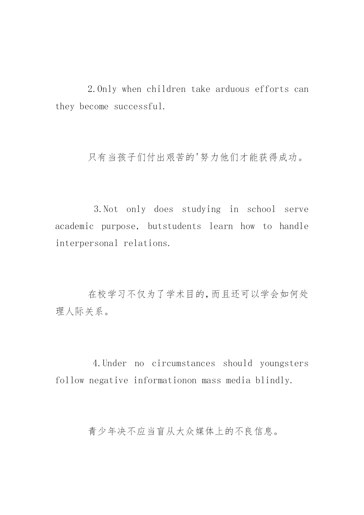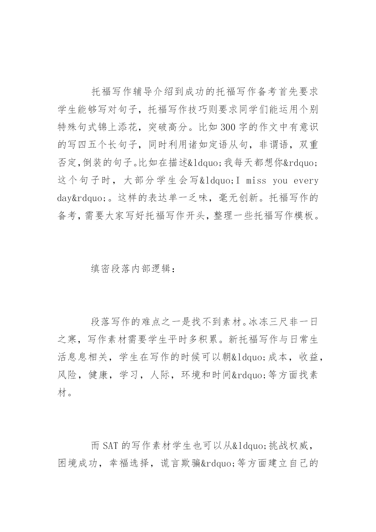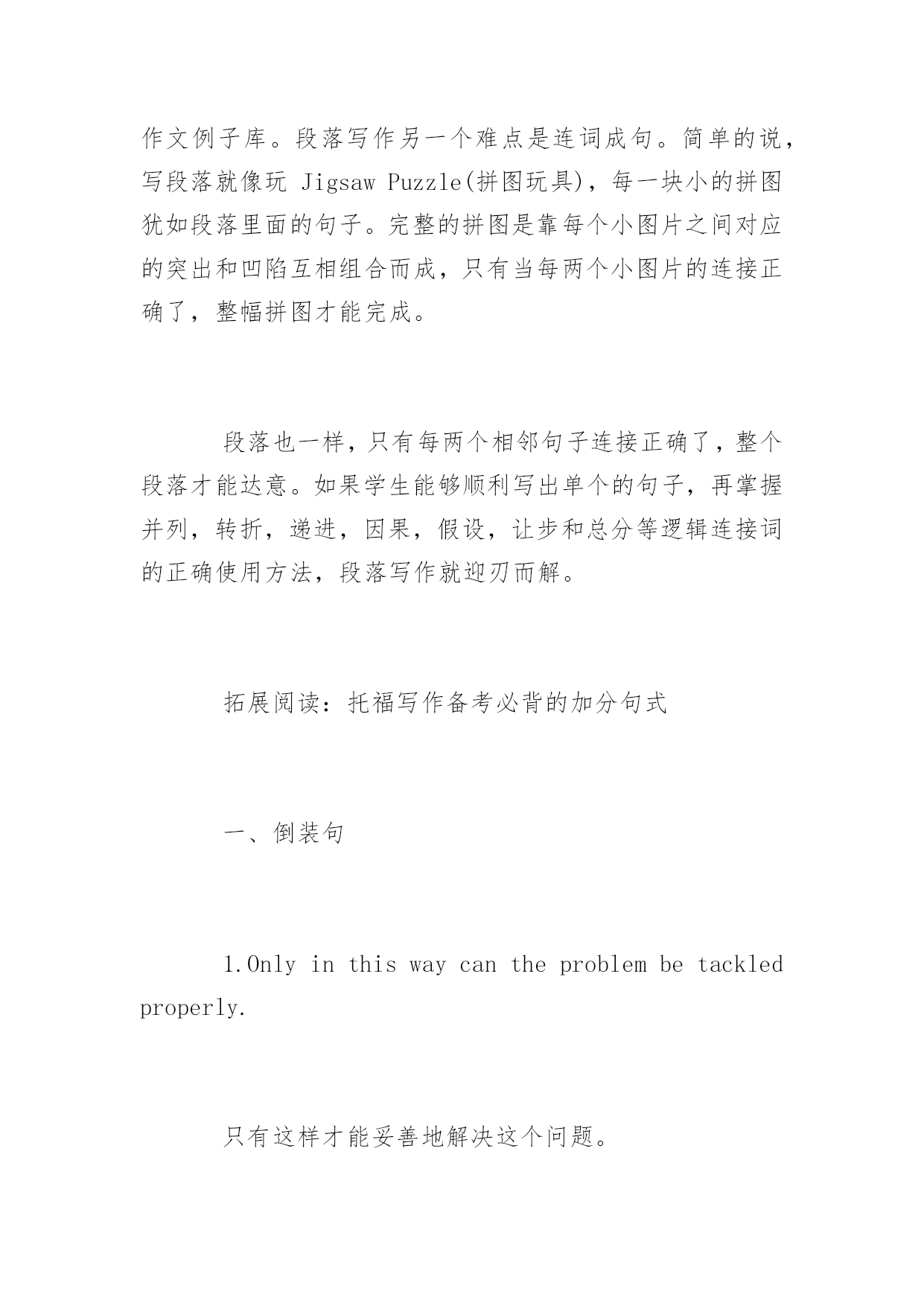 托福作文高分技巧 2016托福作文高分技巧 时常会有考生抱怨已经很努力了,可是托福写作的分数总是提高不了,却找不到缘由所在。下面是yjbys网小编提供给大家关于托福作文高分技巧,希望对大家的作文有所帮助。 要有一个良好的第一印象 Youneverhaveasecondchancetoleavethefirstimpression。中国学生在托福作文中暴露的一个问题就是习惯于利用一些陈词滥调(cliché),这样的用词往往会给读者带来负面的第一印象。比如在表达“破坏”这一概念时,大部分中国学生想到的单词是“break”,很少有学生能利用更地道和更形象的“undermine”,“devastate”和“jeopardize”。 特殊句式标新立异: 托福写作辅导介绍到成功的托福写作备考首先要求学生能够写对句子,托福写作技巧则要求同学们能运用个别特殊句式锦上添花,突破高分。比如300字的作文中有意识的写四五个长句子,同时利用诸如定语从句,非谓语,双重否定,倒装的句子。比如在描述“我每天都想你”这个句子时,大部分学生会写“Imissyoueveryday”。这样的表达单一乏味,毫无创新。托福写作的备考,需要大家写好托福写作开头,整理一些托福写作模板。 缜密段落内部逻辑: 段落写作的难点之一是找不到素材。冰冻三尺非一日之寒,写作素材需要学生平时多积累。新托福写作与日常生活息息相关,学生在写作的时候可以朝“成本,收益,风险,健康,学习,人际,环境和时间”等方面找素材。 而SAT的写作素材学生也可以从“挑战权威,困境成功,幸福选择,谎言欺骗”等方面建立自己的作文例子库。段落写作另一个难点是连词成句。简单的说,写段落就像玩JigsawPuzzle(拼图玩具),每一块小的拼图犹如段落里面的句子。完整的拼图是靠每个小图片之间对应的突出和凹陷互相组合而成,只有当每两个小图片的连接正确了,整幅拼图才能完成。 段落也一样,只有每两个相邻句子连接正确了,整个段落才能达意。如果学生能够顺利写出单个的句子,再掌握并列,转折,递进,因果,假设,让步和总分等逻辑连接词的正确使用方法,段落写作就迎刃而解。 拓展阅读:托福写作备考必背的加分句式 一、倒装句 1.Onlyinthiswaycantheproblembetackledproperly. 只有这样才能妥善地解决这个问题。 2.Onlywhenchildrentakearduouseffortscantheybecomesuccessful. 只有当孩子们付出艰苦的'努力他们才能获得成功。 3.Notonlydoesstudyinginschoolserveacademicpurpose,butstudentslearnhowtohandleinterpersonalrelations. 在校学习不仅为了学术目的,而且还可以学会如何处理人际关系。 4.Undernocircumstancesshouldyoungstersfollownegativeinformationonmassmediablindly. 青少年决不应当盲从大众媒体上的不良信息。 5.Sovaluableiswaterthatwecannotaffordtowasteit. 时间是如此珍贵,我们经不起浪费它。 6.Nowadays,mostdangerousforyoungstersisthetendencytoindulgeinplayingPCgames. 如今对青少年最为危险的事情是倾向于过多地玩电脑游戏。 二、强调句 1.Itisforthebenefitofmaintainingtheecologicalbalancethathumanbeingsoughttoprotecttheendangeredanimalspecies. 正是为了维持生态平衡,人类才应该保护地球上濒危的动物物种。 2.ItisnotuntilpeoplesufferfromsomefataldiseasessuchasSARSandAIDSthattheyarebecomingawareofhowsignificantitisforthegovernmenttoinvestmoremoneyinmedicalcare. 直到人们患了像非典和爱滋病这样致命的疾病时,才意识到政府把更多的钱投入到医疗上的重要性。 三、比较句 1.Studiesshowthatjuveniledelinquencyratesaretwiceashig