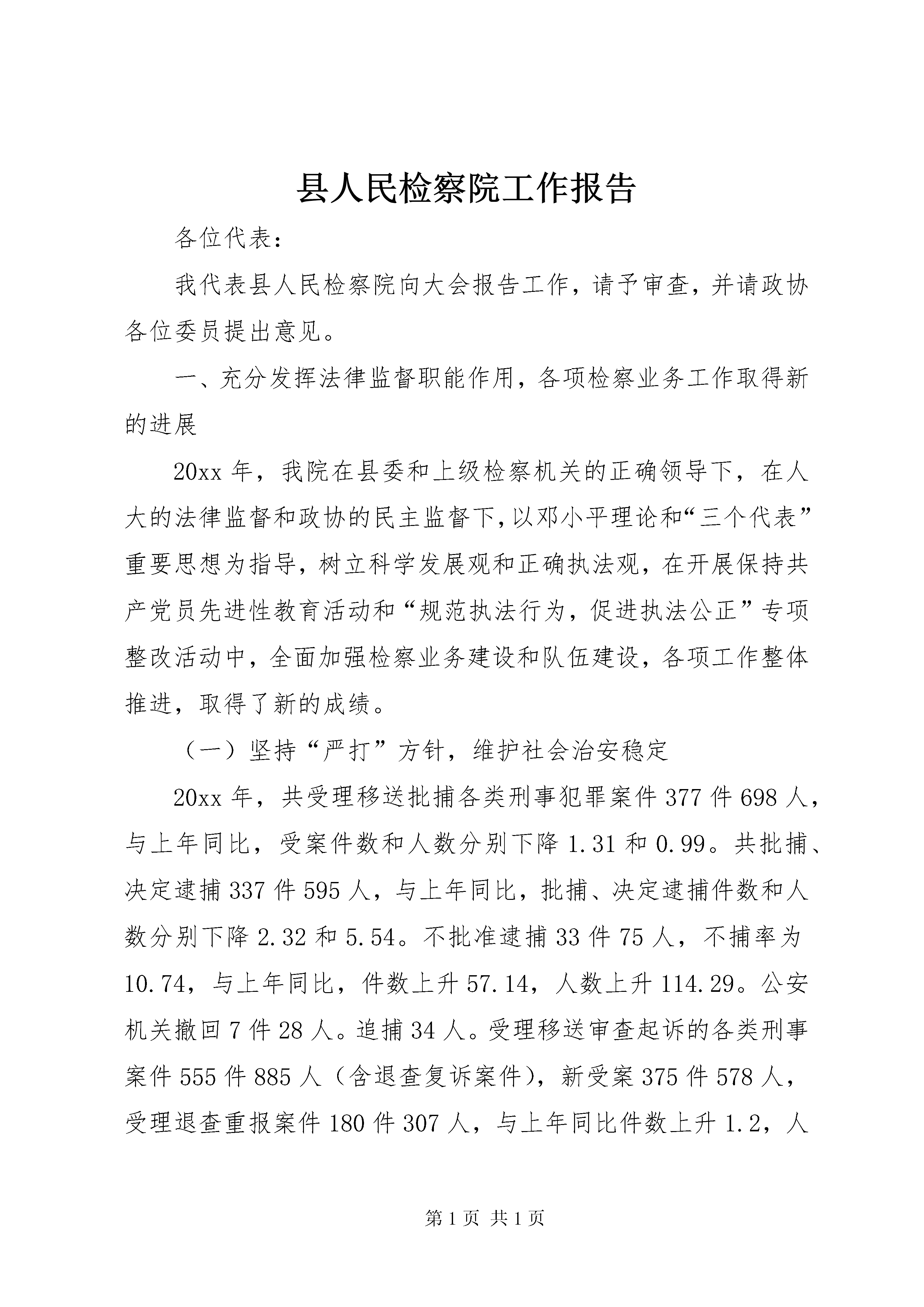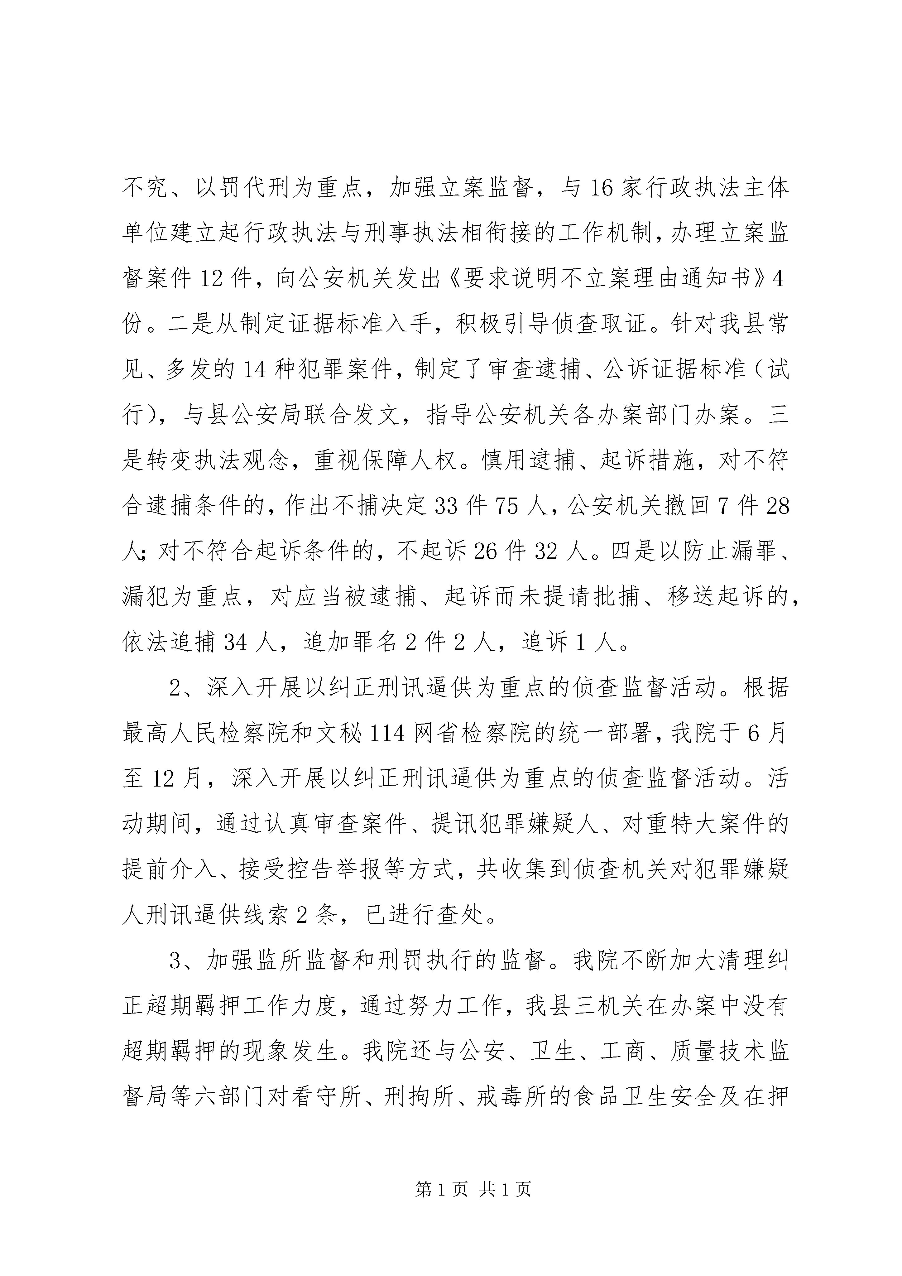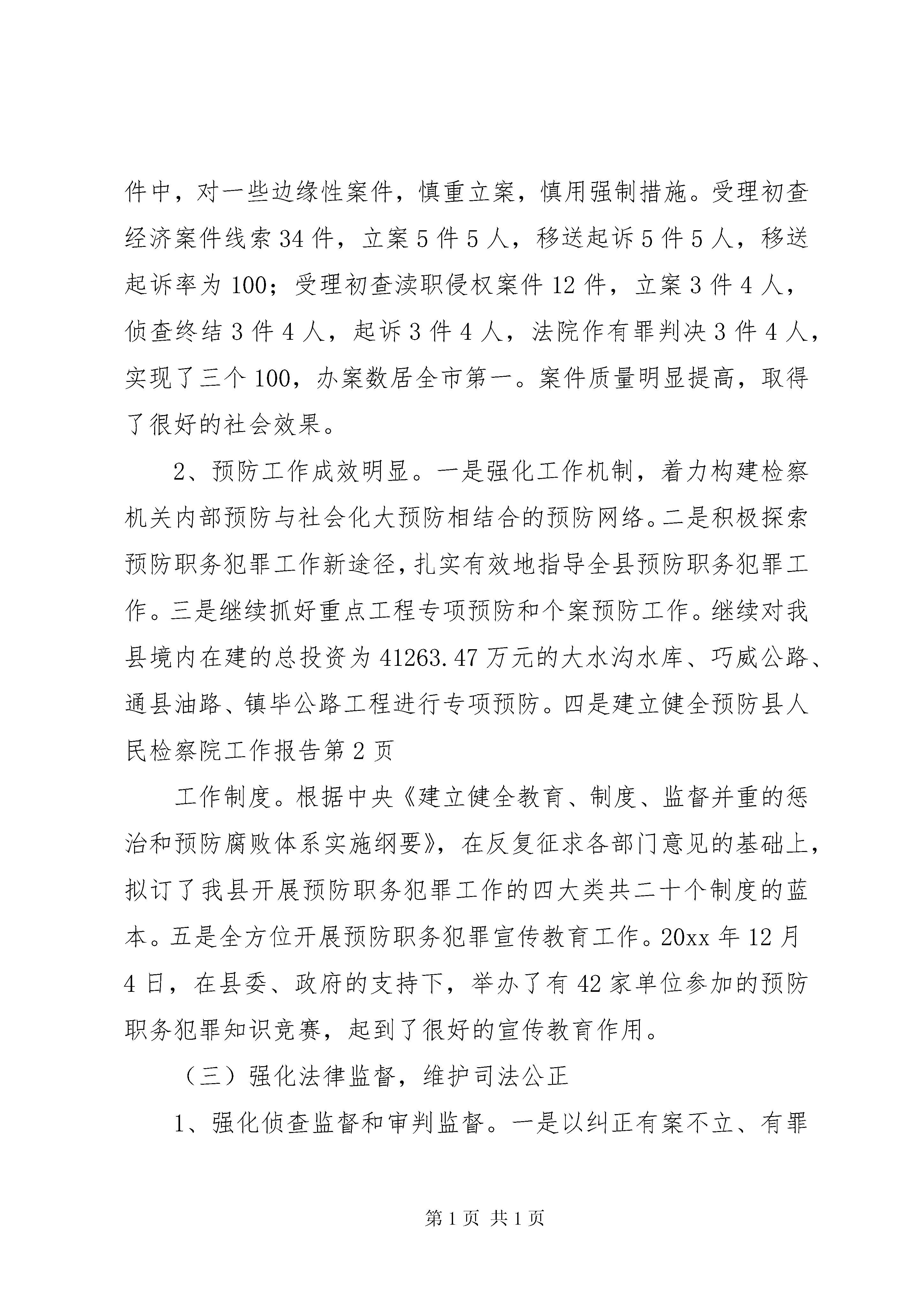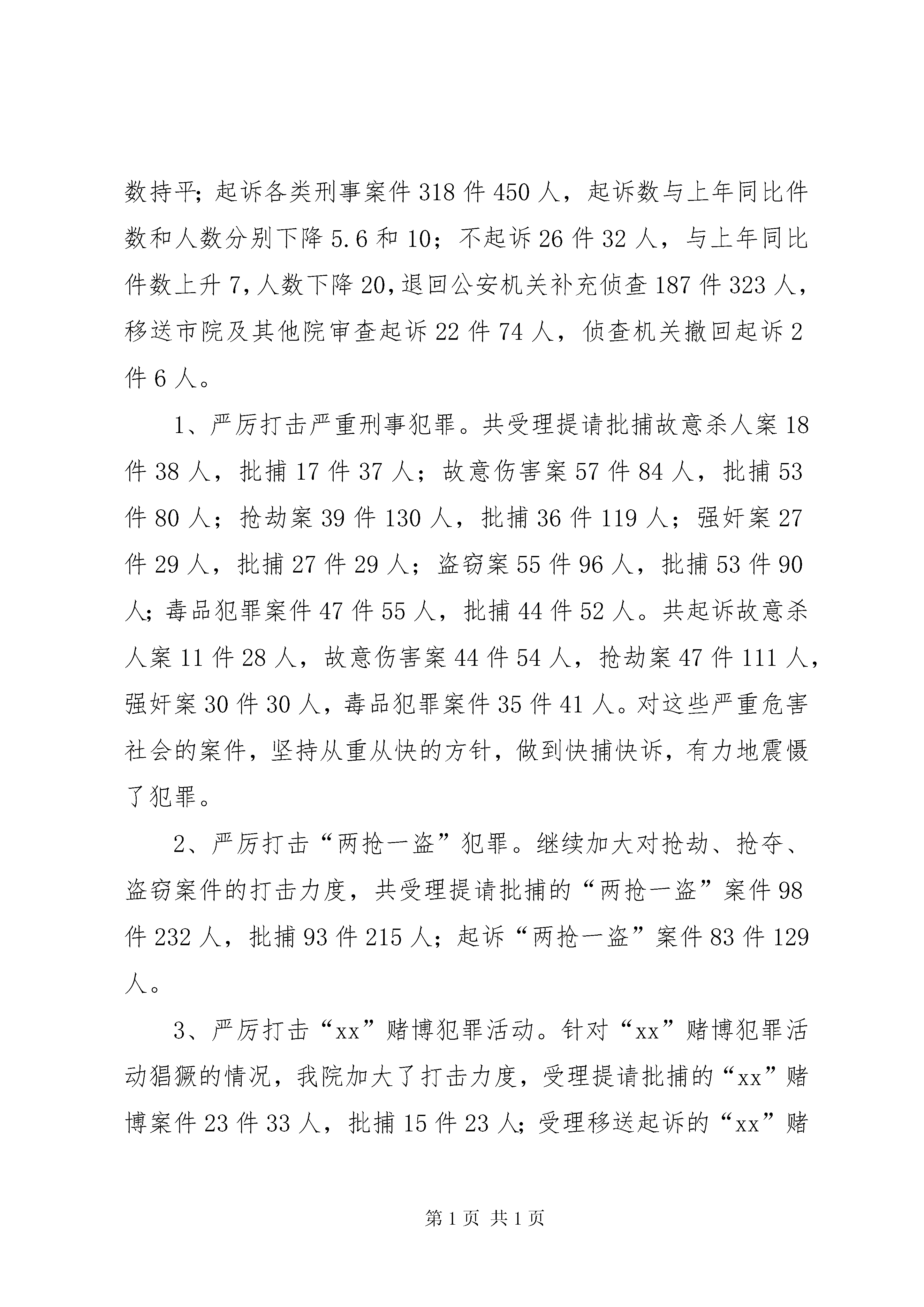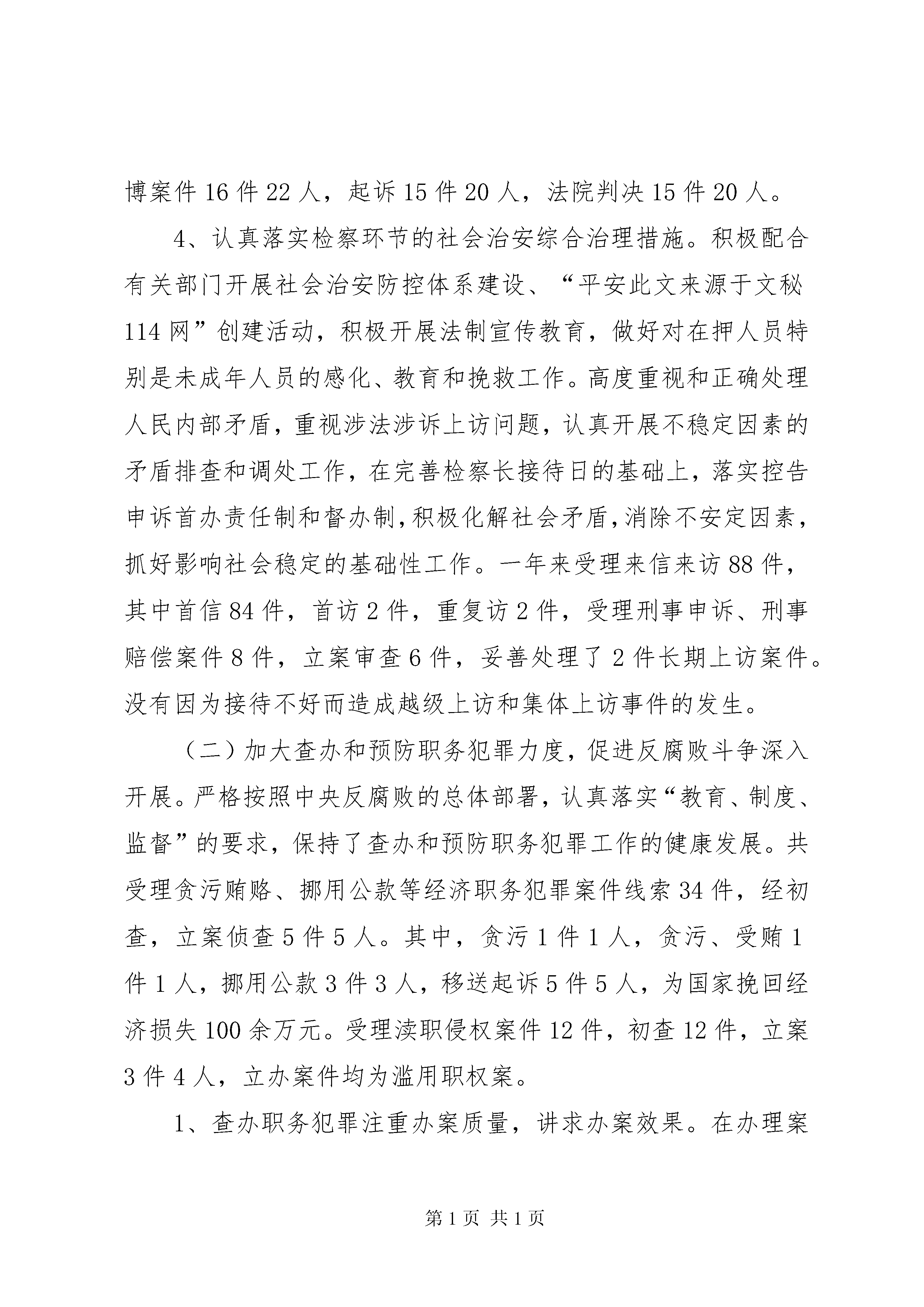 县人民检察院工作报告各位代表:我代表县人民检察院向大会报告工作,请予审查,并请政协各位委员提出意见。一、充分发挥法律监督职能作用,各项检察业务工作取得新的进展20xx年,我院在县委和上级检察机关的正确领导下,在人大的法律监督和政协的民主监督下,以邓小平理论和“三个代表”重要思想为指导,树立科学发展观和正确执法观,在开展保持共产党员先进性教育活动和“规范执法行为,促进执法公正”专项整改活动中,全面加强检察业务建设和队伍建设,各项工作整体推进,取得了新的成绩。(一)坚持“严打”方针,维护社会治安稳定20xx年,共受理移送批捕各类刑事犯罪案件377件698人,与上年同比,受案件数和人数分别下降1.31和0.99。共批捕、决定逮捕337件595人,与上年同比,批捕、决定逮捕件数和人数分别下降2.32和5.54。不批准逮捕33件75人,不捕率为10.74,与上年同比,件数上升57.14,人数上升114.29。公安机关撤回7件28人。追捕34人。受理移送审查起诉的各类刑事案件555件885人(含退查复诉案件),新受案375件578人,受理退查重报案件180件307人,与上年同比件数上升1.2,人数持平;起诉各类刑事案件318件450人,起诉数与上年同比件数和人数分别下降5.6和10;不起诉26件32人,与上年同比件数上升7,人数下降20,退回公安机关补充侦查187件323人,移送市院及其他院审查起诉22件74人,侦查机关撤回起诉2件6人。1、严厉打击严重刑事犯罪。共受理提请批捕故意杀人案18件38人,批捕17件37人;故意伤害案57件84人,批捕53件80人;抢劫案39件130人,批捕36件119人;强奸案27件29人,批捕27件29人;盗窃案55件96人,批捕53件90人;毒品犯罪案件47件55人,批捕44件52人。共起诉故意杀人案11件28人,故意伤害案44件54人,抢劫案47件111人,强奸案30件30人,毒品犯罪案件35件41人。对这些严重危害社会的案件,坚持从重从快的方针,做到快捕快诉,有力地震慑了犯罪。2、严厉打击“两抢一盗”犯罪。继续加大对抢劫、抢夺、盗窃案件的打击力度,共受理提请批捕的“两抢一盗”案件98件232人,批捕93件215人;起诉“两抢一盗”案件83件129人。3、严厉打击“xx”赌博犯罪活动。针对“xx”赌博犯罪活动猖獗的情况,我院加大了打击力度,受理提请批捕的“xx”赌博案件23件33人,批捕15件23人;受理移送起诉的“xx”赌博案件16件22人,起诉15件20人,法院判决15件20人。4、认真落实检察环节的社会治安综合治理措施。积极配合有关部门开展社会治安防控体系建设、“平安此文来源于文秘114网”创建活动,积极开展法制宣传教育,做好对在押人员特别是未成年人员的感化、教育和挽救工作。高度重视和正确处理人民内部矛盾,重视涉法涉诉上访问题,认真开展不稳定因素的矛盾排查和调处工作,在完善检察长接待日的基础上,落实控告申诉首办责任制和督办制,积极化解社会矛盾,消除不安定因素,抓好影响社会稳定的基础性工作。一年来受理来信来访88件,其中首信84件,首访2件,重复访2件,受理刑事申诉、刑事赔偿案件8件,立案审查6件,妥善处理了2件长期上访案件。没有因为接待不好而造成越级上访和集体上访事件的发生。(二)加大查办和预防职务犯罪力度,促进反腐败斗争深入开展。严格按照中央反腐败的总体部署,认真落实“教育、制度、监督”的要求,保持了查办和预防职务犯罪工作的健康发展。共受理贪污贿赂、挪用公款等经济职务犯罪案件线索34件,经初查,立案侦查5件5人。其中,贪污1件1人,贪污、受贿1件1人,挪用公款3件3人,移送起诉5件5人,为国家挽回经济损失100余万元。受理渎职侵权案件12件,初查12件,立案3件4人,立办案件均为滥用职权案。1、查办职务犯罪注重办案质量,讲求办案效果。在办理案件中,对一些边缘性案件,慎重立案,慎用强制措施。受理初查经济案件线索34件,立案5件5人,移送起诉5件5人,移送起诉率为100;受理初查渎职侵权案件12件,立案3件4人,侦查终结3件4人,起诉3件4人,法院作有罪判决3件4人,实现了三个100,办案数居全市第一。案件质量明显提高,取得了很好的社会效果。2、预防工作成效明显。一是强化工作机制,着力构建检察机关内部预防与社会化大预防相结合的预防网络。二是积极探索预防职务犯罪工作新途径,扎实有效地指导全县预防职务犯罪工作。三是继续抓好重点工程专项预防和个案预防工作。继续对我县境内在建的总投资为41263.47万元的大水沟水库、巧威公路、通县油路、镇毕公路工程进行专项预防。四是建立健全预防县人民检察院工作报告工作制度。根据中央《建立健全教育、制度、监督并重的惩治和预防腐败体系实施纲要》