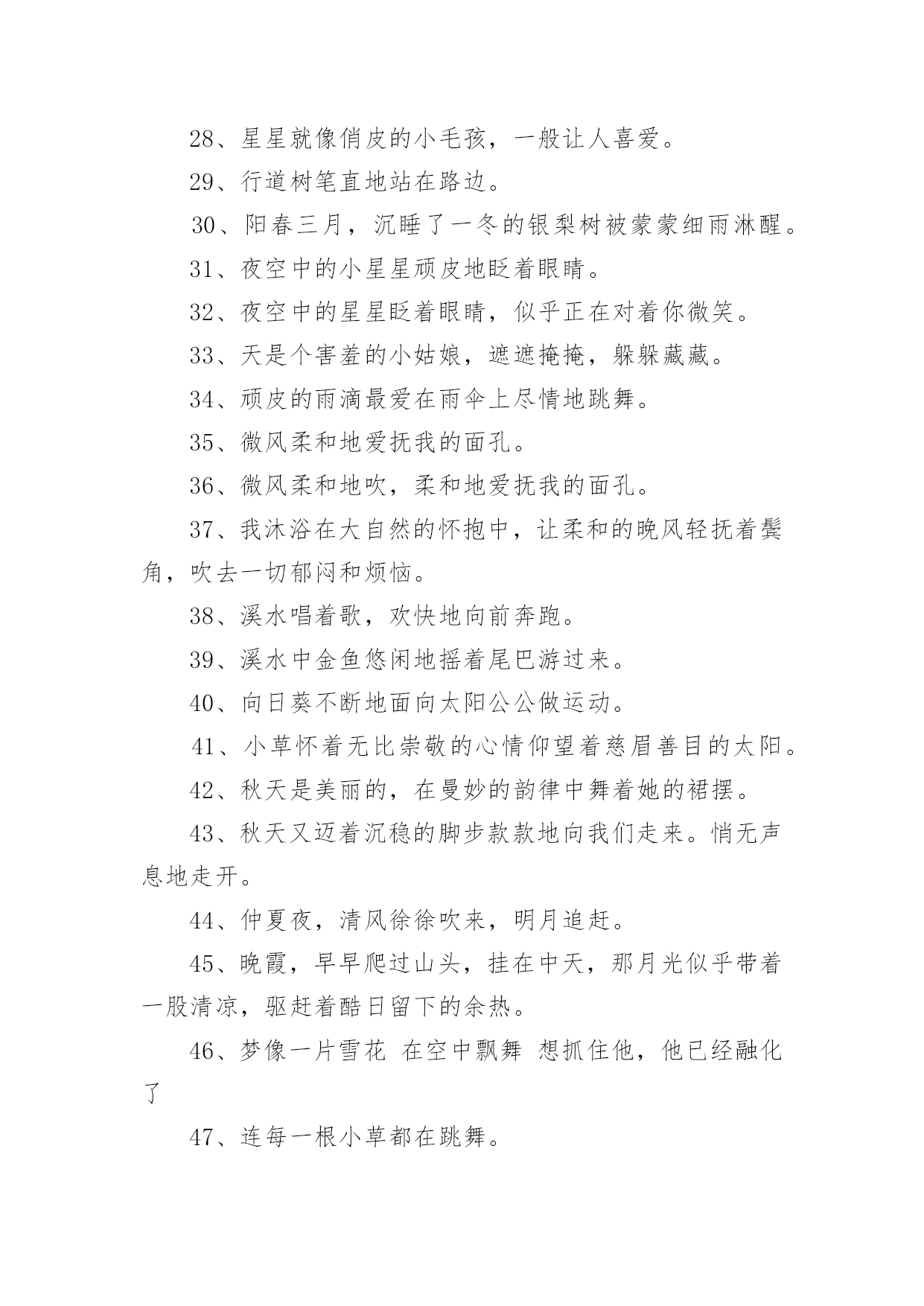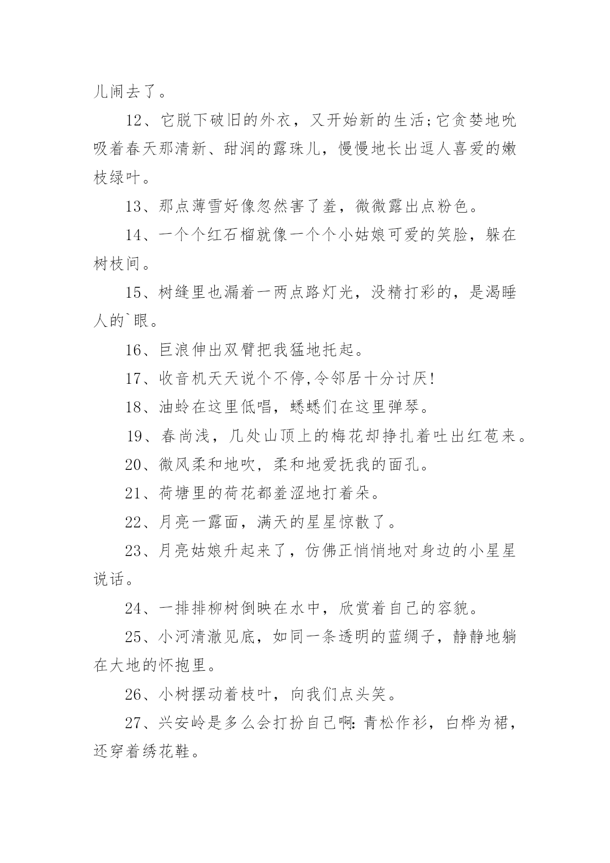 经典拟人句 经典拟人句大全拟人句就是把事物人格化,将本来不具备人动作和感情的事物变成和人一样具有动作和感情的样子。下面是小编分享给大家的经典拟人句大全,希望对大家有帮助。经典拟人句大全1、风儿清唱著歌,唤醒了沉睡中的大地。2、顽皮的雨滴最爱在雨伞上尽情的跳舞。3、船头飞溅起的浪花,吟唱著欢乐的歌儿。4、秋便以翩跹之姿踏碎了夏天的流言。5、秋天到了,树上金红的果子露出了笑脸,她在向着我们点头微笑。6、秋天迈着沉稳的脚步,缓缓地向我们走来,又悄无声息地走开。7、小狗伸了一个懒腰。8、一个个红石榴小姑娘绽放出可爱的笑脸,躲在树枝间。9、落叶随着风高低起舞。10、海棠果摇动着它那圆圆的小脸,冲着你点头微笑。11、水是野的,索溪像是一个从深山中蹦跳而出的野孩子,一会儿缠绕着山奔跑,一会儿撅着屁股,赌着气又自个儿闹去了。12、它脱下破旧的外衣,又开始新的生活;它贪婪地吮吸着春天那清新、甜润的露珠儿,慢慢地长出逗人喜爱的嫩枝绿叶。13、那点薄雪好像忽然害了羞,微微露出点粉色。14、一个个红石榴就像一个个小姑娘可爱的笑脸,躲在树枝间。15、树缝里也漏着一两点路灯光,没精打彩的,是渴睡人的`眼。16、巨浪伸出双臂把我猛地托起。17、收音机天天说个不停,令邻居十分讨厌!18、油蛉在这里低唱,蟋蟋们在这里弹琴。19、春尚浅,几处山顶上的梅花却挣扎着吐出红苞来。20、微风柔和地吹,柔和地爱抚我的面孔。21、荷塘里的荷花都羞涩地打着朵。22、月亮一露面,满天的星星惊散了。23、月亮姑娘升起来了,仿佛正悄悄地对身边的小星星说话。24、一排排柳树倒映在水中,欣赏着自己的容貌。25、小河清澈见底,如同一条透明的蓝绸子,静静地躺在大地的怀抱里。26、小树摆动着枝叶,向我们点头笑。27、兴安岭是多么会打扮自己啊:青松作衫,白桦为裙,还穿着绣花鞋。28、星星就像俏皮的小毛孩,一般让人喜爱。29、行道树笔直地站在路边。30、阳春三月,沉睡了一冬的银梨树被蒙蒙细雨淋醒。31、夜空中的小星星顽皮地眨着眼睛。32、夜空中的星星眨着眼睛,似乎正在对着你微笑。33、天是个害羞的小姑娘,遮遮掩掩,躲躲藏藏。34、顽皮的雨滴最爱在雨伞上尽情地跳舞。35、微风柔和地爱抚我的面孔。36、微风柔和地吹,柔和地爱抚我的面孔。37、我沐浴在大自然的怀抱中,让柔和的晚风轻抚着鬓角,吹去一切郁闷和烦恼。38、溪水唱着歌,欢快地向前奔跑。39、溪水中金鱼悠闲地摇着尾巴游过来。40、向日葵不断地面向太阳公公做运动。41、小草怀着无比崇敬的心情仰望着慈眉善目的太阳。42、秋天是美丽的,在曼妙的韵律中舞着她的裙摆。43、秋天又迈着沉稳的脚步款款地向我们走来。悄无声息地走开。44、仲夏夜,清风徐徐吹来,明月追赶。45、晚霞,早早爬过山头,挂在中天,那月光似乎带着一股清凉,驱赶着酷日留下的余热。46、梦像一片雪花在空中飘舞想抓住他,他已经融化了47、连每一根小草都在跳舞。48、蜡烛上的火光欢快地舞蹈着。49、海棠果摇动着它那圆圆的小脸,冲着你点头微笑。50、蝴蝶在花丛中翩翩起舞。