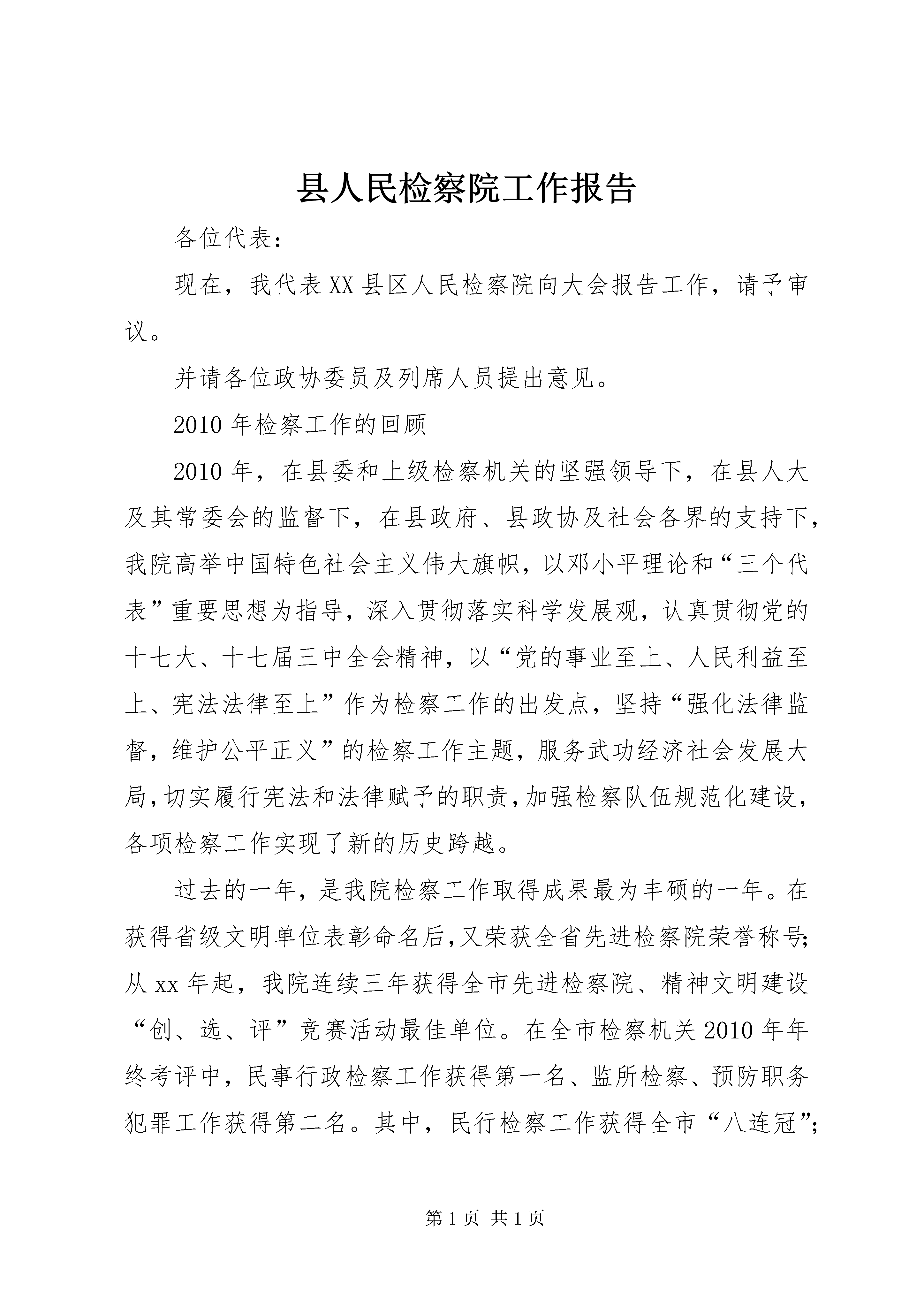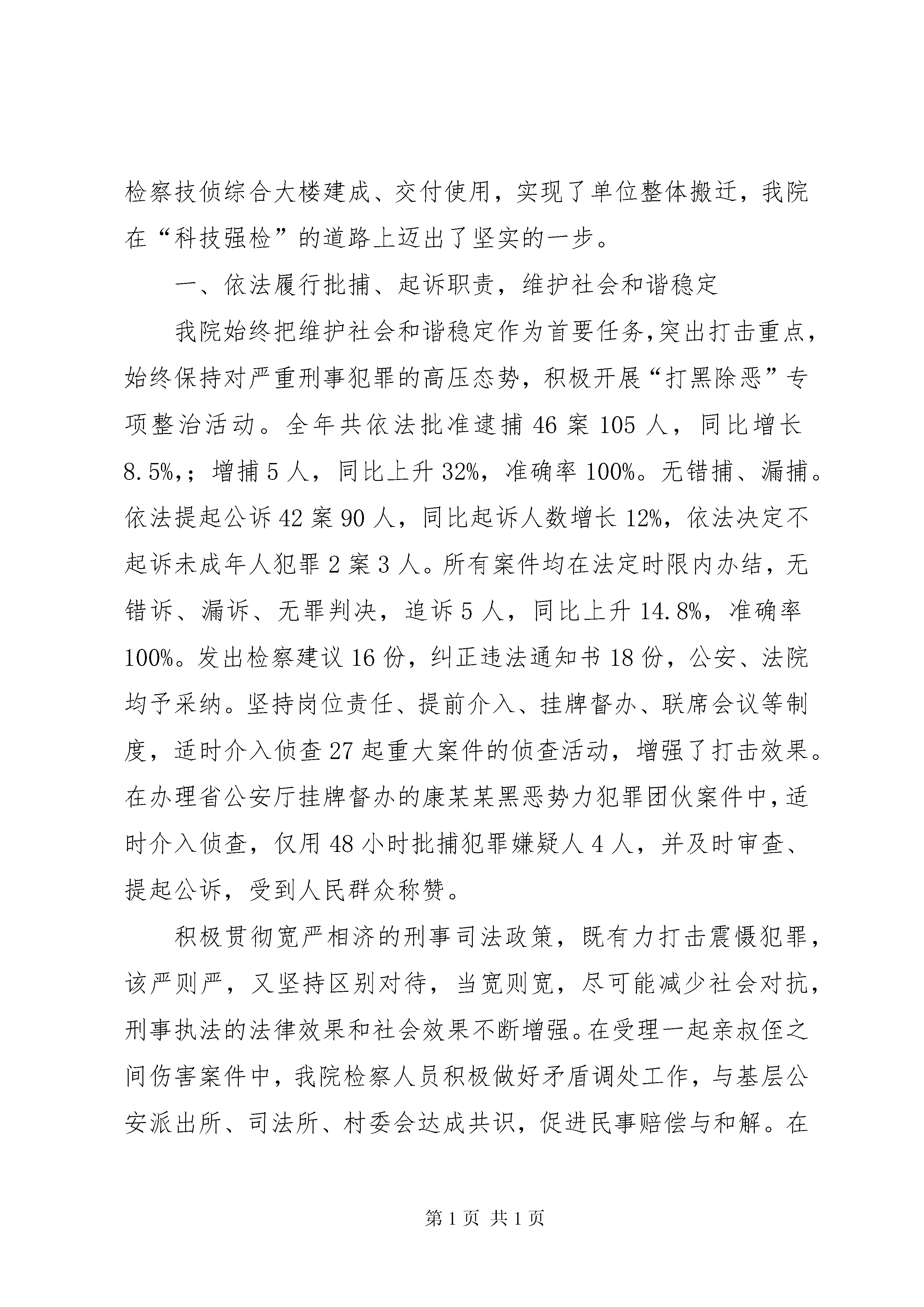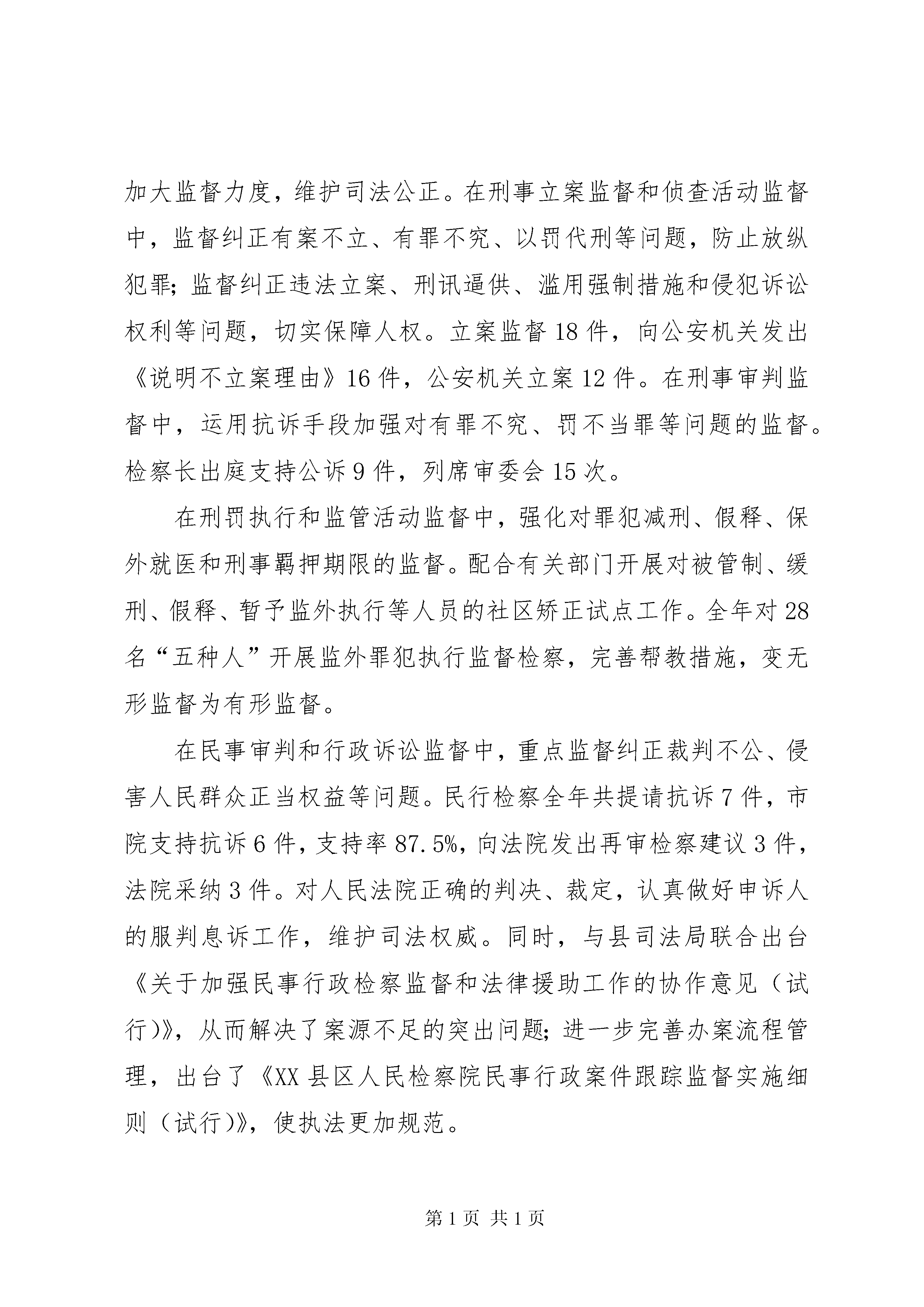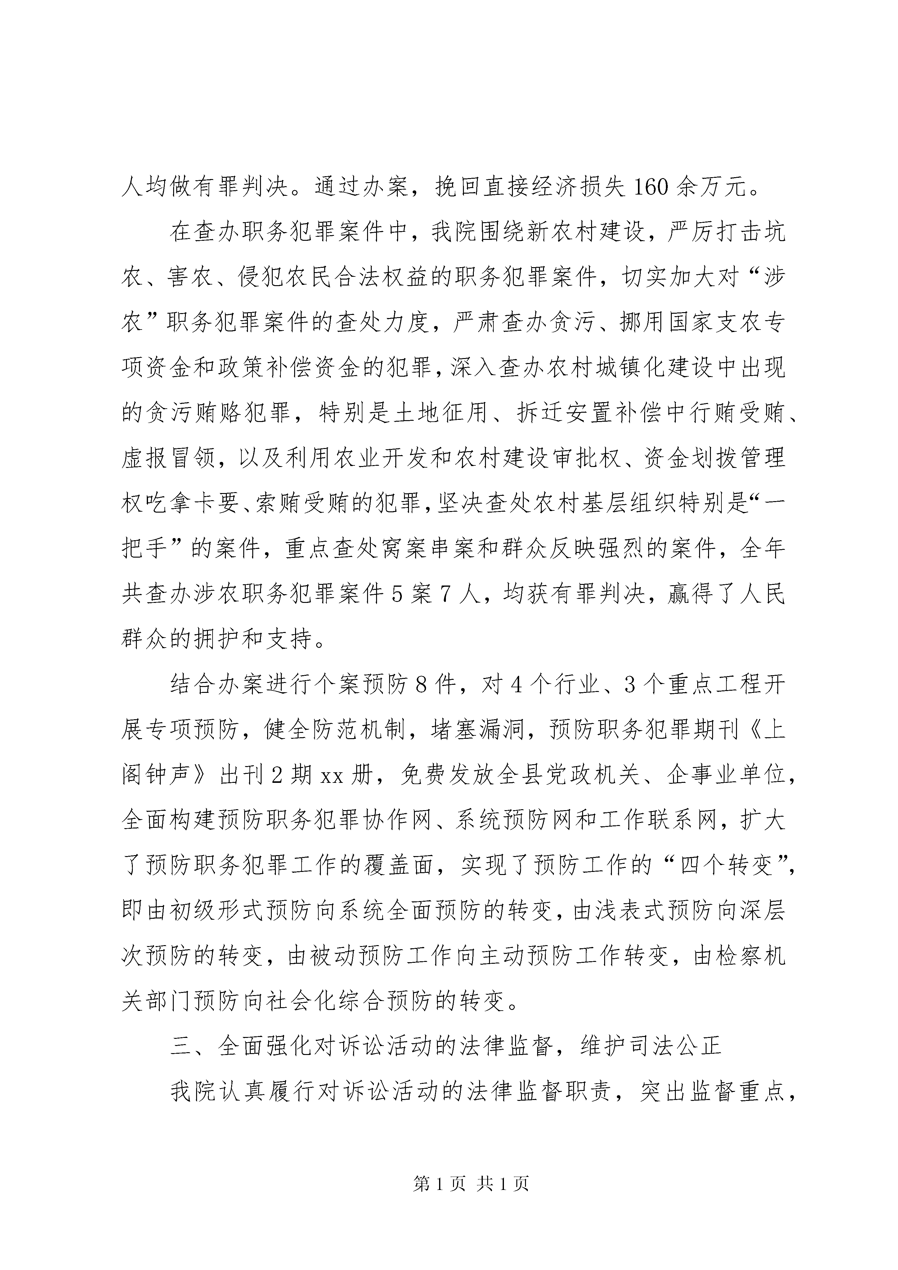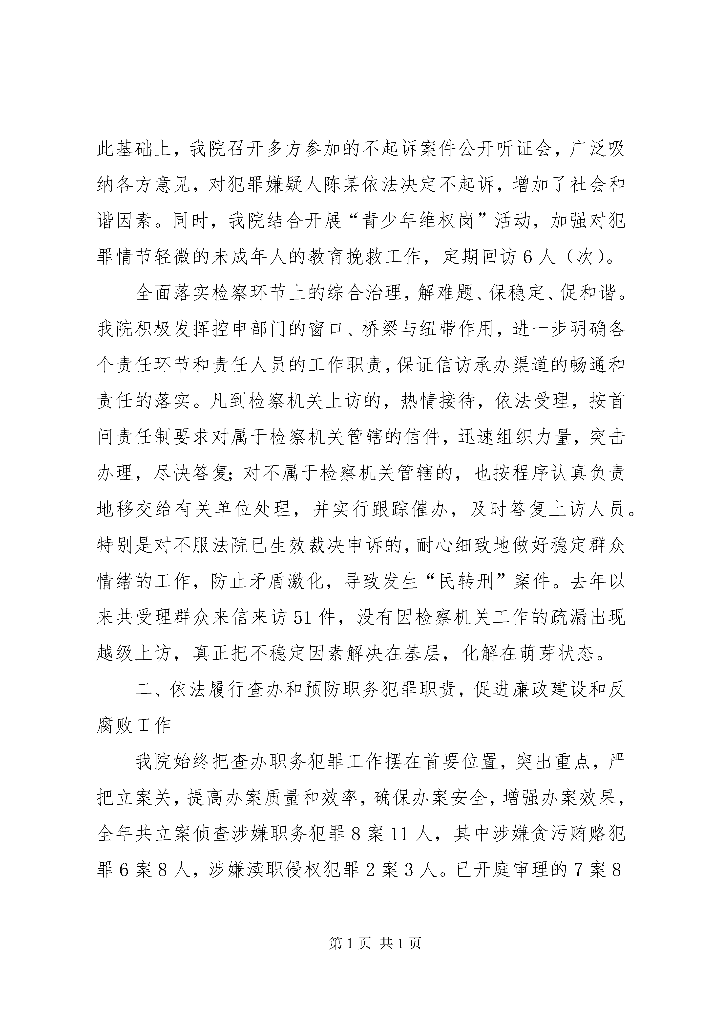 县人民检察院工作报告各位代表:现在,我代表XX县区人民检察院向大会报告工作,请予审议。并请各位政协委员及列席人员提出意见。2010年检察工作的回顾2010年,在县委和上级检察机关的坚强领导下,在县人大及其常委会的监督下,在县政府、县政协及社会各界的支持下,我院高举中国特色社会主义伟大旗帜,以邓小平理论和“三个代表”重要思想为指导,深入贯彻落实科学发展观,认真贯彻党的十七大、十七届三中全会精神,以“党的事业至上、人民利益至上、宪法法律至上”作为检察工作的出发点,坚持“强化法律监督,维护公平正义”的检察工作主题,服务武功经济社会发展大局,切实履行宪法和法律赋予的职责,加强检察队伍规范化建设,各项检察工作实现了新的历史跨越。过去的一年,是我院检察工作取得成果最为丰硕的一年。在获得省级文明单位表彰命名后,又荣获全省先进检察院荣誉称号;从xx年起,我院连续三年获得全市先进检察院、精神文明建设“创、选、评”竞赛活动最佳单位。在全市检察机关2010年年终考评中,民事行政检察工作获得第一名、监所检察、预防职务犯罪工作获得第二名。其中,民行检察工作获得全市“八连冠”;检察技侦综合大楼建成、交付使用,实现了单位整体搬迁,我院在“科技强检”的道路上迈出了坚实的一步。一、依法履行批捕、起诉职责,维护社会和谐稳定我院始终把维护社会和谐稳定作为首要任务,突出打击重点,始终保持对严重刑事犯罪的高压态势,积极开展“打黑除恶”专项整治活动。全年共依法批准逮捕46案105人,同比增长8.5%,;增捕5人,同比上升32%,准确率100%。无错捕、漏捕。依法提起公诉42案90人,同比起诉人数增长12%,依法决定不起诉未成年人犯罪2案3人。所有案件均在法定时限内办结,无错诉、漏诉、无罪判决,追诉5人,同比上升14.8%,准确率100%。发出检察建议16份,纠正违法通知书18份,公安、法院均予采纳。坚持岗位责任、提前介入、挂牌督办、联席会议等制度,适时介入侦查27起重大案件的侦查活动,增强了打击效果。在办理省公安厅挂牌督办的康某某黑恶势力犯罪团伙案件中,适时介入侦查,仅用48小时批捕犯罪嫌疑人4人,并及时审查、提起公诉,受到人民群众称赞。积极贯彻宽严相济的刑事司法政策,既有力打击震慑犯罪,该严则严,又坚持区别对待,当宽则宽,尽可能减少社会对抗,刑事执法的法律效果和社会效果不断增强。在受理一起亲叔侄之间伤害案件中,我院检察人员积极做好矛盾调处工作,与基层公安派出所、司法所、村委会达成共识,促进民事赔偿与和解。在此基础上,我院召开多方参加的不起诉案件公开听证会,广泛吸纳各方意见,对犯罪嫌疑人陈某依法决定不起诉,增加了社会和谐因素。同时,我院结合开展“青少年维权岗”活动,加强对犯罪情节轻微的未成年人的教育挽救工作,定期回访6人(次)。全面落实检察环节上的综合治理,解难题、保稳定、促和谐。我院积极发挥控申部门的窗口、桥梁与纽带作用,进一步明确各个责任环节和责任人员的工作职责,保证信访承办渠道的畅通和责任的落实。凡到检察机关上访的,热情接待,依法受理,按首问责任制要求对属于检察机关管辖的信件,迅速组织力量,突击办理,尽快答复;对不属于检察机关管辖的,也按程序认真负责地移交给有关单位处理,并实行跟踪催办,及时答复上访人员。特别是对不服法院已生效裁决申诉的,耐心细致地做好稳定群众情绪的工作,防止矛盾激化,导致发生“民转刑”案件。去年以来共受理群众来信来访51件,没有因检察机关工作的疏漏出现越级上访,真正把不稳定因素解决在基层,化解在萌芽状态。二、依法履行查办和预防职务犯罪职责,促进廉政建设和反腐败工作我院始终把查办职务犯罪工作摆在首要位置,突出重点,严把立案关,提高办案质量和效率,确保办案安全,增强办案效果,全年共立案侦查涉嫌职务犯罪8案11人,其中涉嫌贪污贿赂犯罪6案8人,涉嫌渎职侵权犯罪2案3人。已开庭审理的7案8人均做有罪判决。通过办案,挽回直接经济损失160余万元。在查办职务犯罪案件中,我院围绕新农村建设,严厉打击坑农、害农、侵犯农民合法权益的职务犯罪案件,切实加大对“涉农”职务犯罪案件的查处力度,严肃查办贪污、挪用国家支农专项资金和政策补偿资金的犯罪,深入查办农村城镇化建设中出现的贪污贿赂犯罪,特别是土地征用、拆迁安置补偿中行贿受贿、虚报冒领,以及利用农业开发和农村建设审批权、资金划拨管理权吃拿卡要、索贿受贿的犯罪,坚决查处农村基层组织特别是“一把手”的案件,重点查处窝案串案和群众反映强烈的案件,全年共查办涉农职务犯罪案件5案7人,均获有罪判决,赢得了人民群众的拥护和支持。结合办案进行个案预防8件,对4个行业、3个重点工程开展专项预防,健全防范机制,堵塞漏洞,预防职务犯罪期刊《上阁钟声》出刊2期xx册,免费发放全县党政机关、企事业单位,全面构建预防