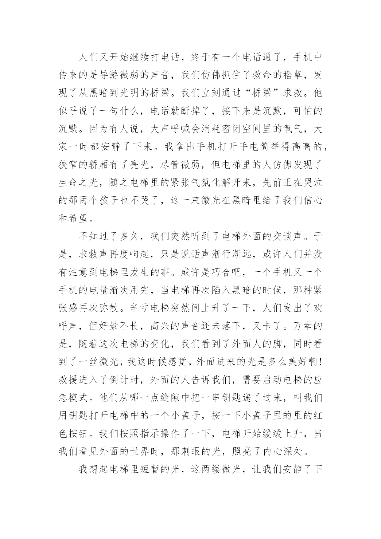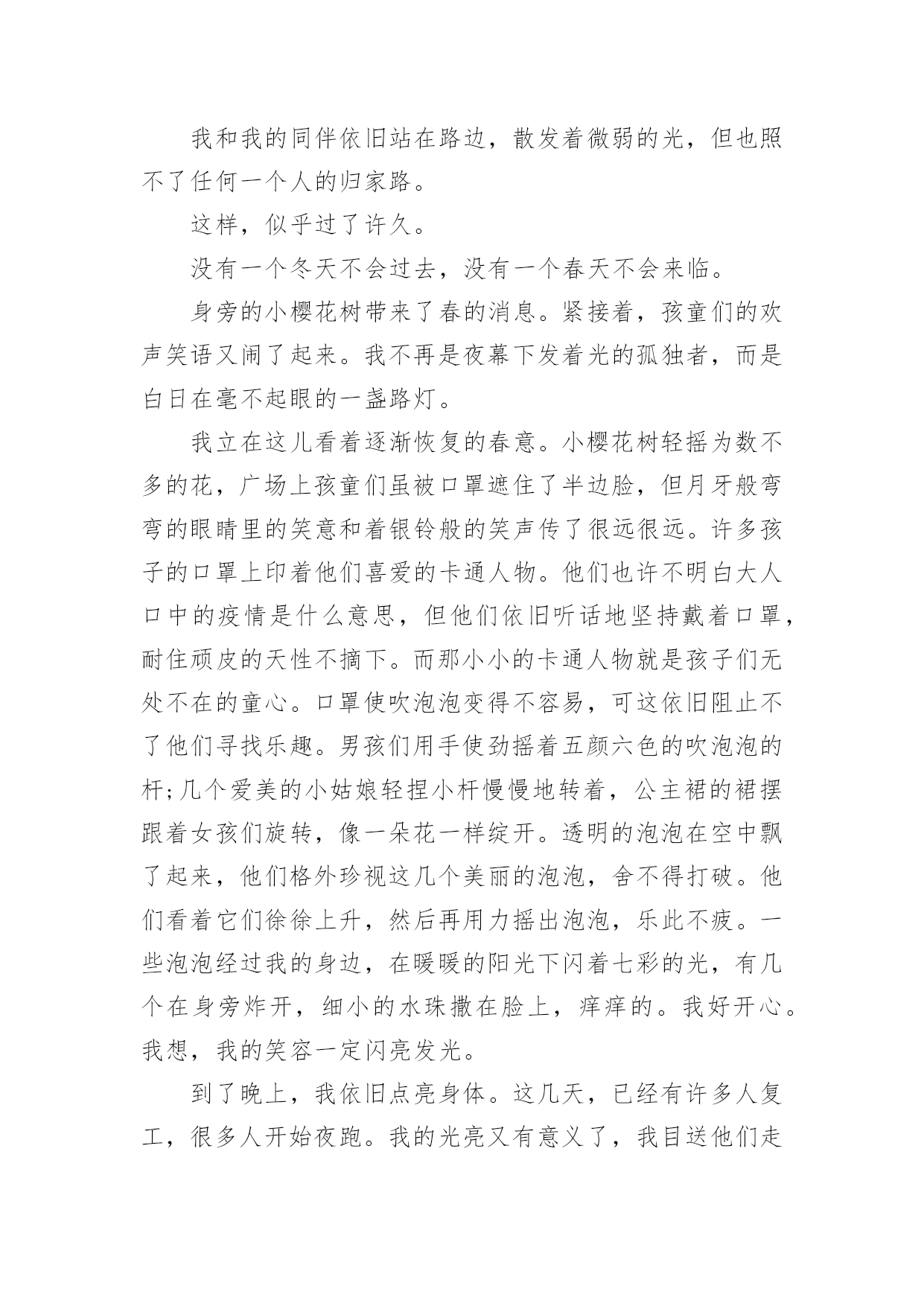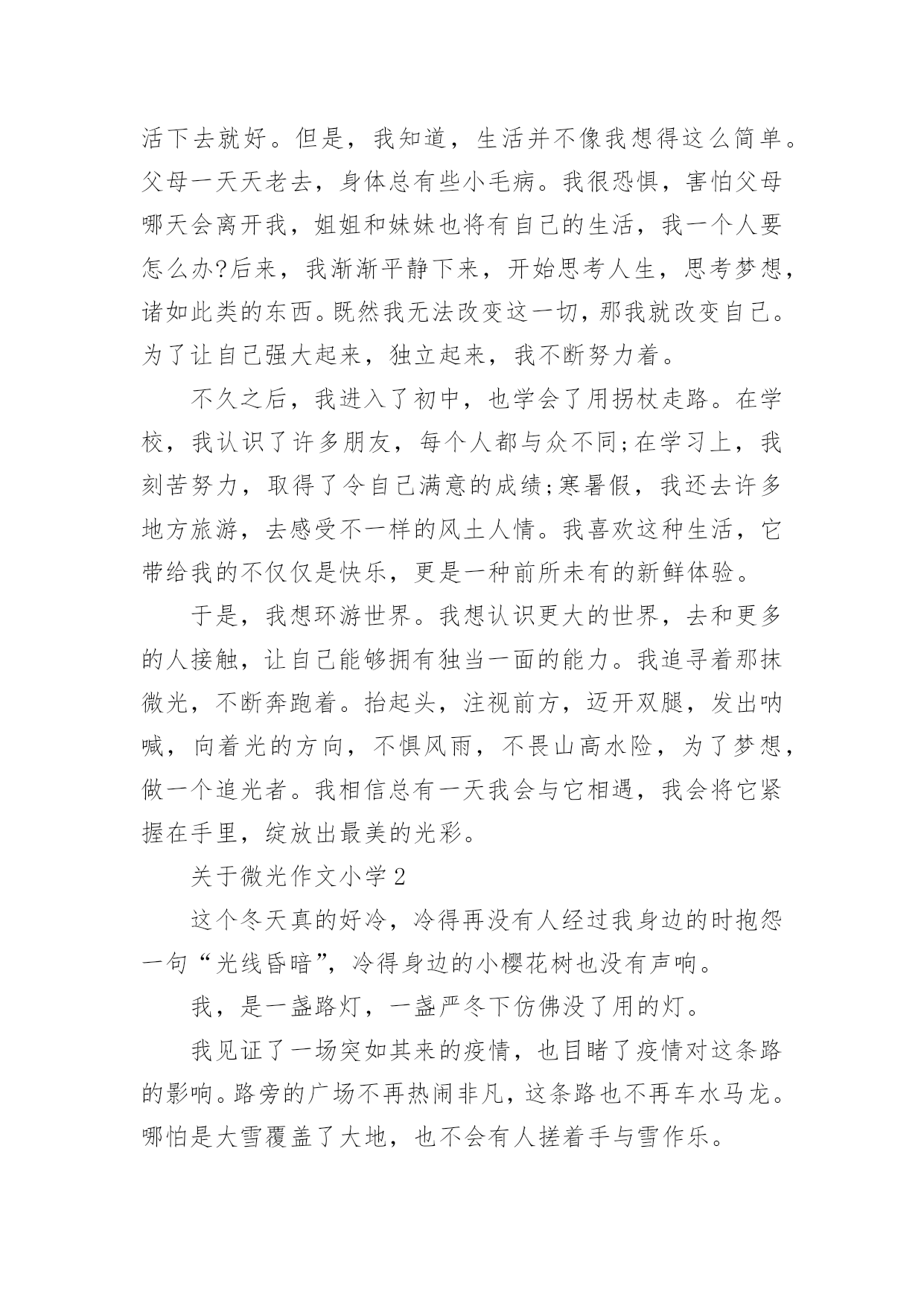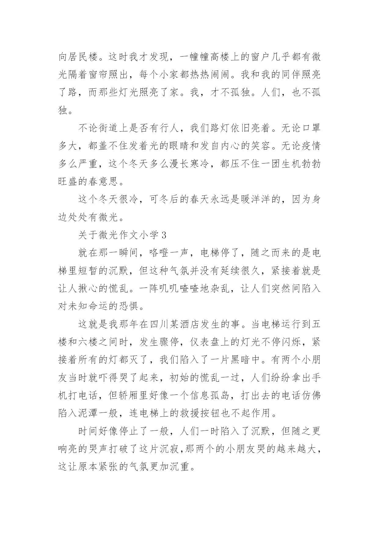 关于微光作文小学5篇 梦的光亮,出现在每个人的世界里。无论是将它紧握手中,还是无奈之下将其舍弃,又或者是从未停止过追寻。它总是来之不易,又难以捕捉。它会突然出现在我们的生活某个瞬间,改变我们的人生轨迹。小时候,身体特殊的我整天沉浸在自己的世界里,得过且过。电视是我每天的伴侣,看累了就趴在窗边,看着来来往往的人群,数着经过的小车,却不知道生活忙碌的意义。那时,我的胆子特别小。身边必须要有家人在,我才能安心。如果只留我一人在家,我会陷入恐慌,然后哭成泪人。后来,我做了几次手术,开始慢慢锻炼,可以依靠学步车走路了。虽然这样与年龄不相符,但是我已经很知足。因为我可以自己做很多事情,不再需要别人的帮助。我可以自己倒水喝、自己去上厕所,自由行走在各个房间……那种感觉是一种说不出来的快乐,好像觉得自己进入了一个崭新的世界。后来,我们搬家了,住进了县城的一个小区,我很喜欢小区的环境。与此同时,我也正式开始了我的学习生涯。虽然每天要学的知识很多,但是我获得了前所未有的快乐感和成就感。突然有一天,我的脑海中有个声音,它问我,我的梦想是什么?我的大脑一片空白,说真的,我从未想过这个问题。因为在以前,生活自理对我来说都是一种奢侈,更别谈梦想这种遥不可及的东西了。而且,我觉得就这样简单生活下去就好。但是,我知道,生活并不像我想得这么简单。父母一天天老去,身体总有些小毛病。我很恐惧,害怕父母哪天会离开我,姐姐和妹妹也将有自己的生活,我一个人要怎么办?后来,我渐渐平静下来,开始思考人生,思考梦想,诸如此类的东西。既然我无法改变这一切,那我就改变自己。为了让自己强大起来,独立起来,我不断努力着。不久之后,我进入了初中,也学会了用拐杖走路。在学校,我认识了许多朋友,每个人都与众不同;在学习上,我刻苦努力,取得了令自己满意的成绩;寒暑假,我还去许多地方旅游,去感受不一样的风土人情。我喜欢这种生活,它带给我的不仅仅是快乐,更是一种前所未有的新鲜体验。于是,我想环游世界。我想认识更大的世界,去和更多的人接触,让自己能够拥有独当一面的能力。我追寻着那抹微光,不断奔跑着。抬起头,注视前方,迈开双腿,发出呐喊,向着光的方向,不惧风雨,不畏山高水险,为了梦想,做一个追光者。我相信总有一天我会与它相遇,我会将它紧握在手里,绽放出最美的光彩。关于微光作文小学2这个冬天真的好冷,冷得再没有人经过我身边的时抱怨一句“光线昏暗”,冷得身边的小樱花树也没有声响。我,是一盏路灯,一盏严冬下仿佛没了用的灯。我见证了一场突如其来的疫情,也目睹了疫情对这条路的影响。路旁的广场不再热闹非凡,这条路也不再车水马龙。哪怕是大雪覆盖了大地,也不会有人搓着手与雪作乐。我和我的同伴依旧站在路边,散发着微弱的光,但也照不了任何一个人的归家路。这样,似乎过了许久。没有一个冬天不会过去,没有一个春天不会来临。身旁的小樱花树带来了春的消息。紧接着,孩童们的欢声笑语又闹了起来。我不再是夜幕下发着光的孤独者,而是白日在毫不起眼的一盏路灯。我立在这儿看着逐渐恢复的春意。小樱花树轻摇为数不多的花,广场上孩童们虽被口罩遮住了半边脸,但月牙般弯弯的眼睛里的笑意和着银铃般的笑声传了很远很远。许多孩子的口罩上印着他们喜爱的卡通人物。他们也许不明白大人口中的疫情是什么意思,但他们依旧听话地坚持戴着口罩,耐住顽皮的天性不摘下。而那小小的卡通人物就是孩子们无处不在的童心。口罩使吹泡泡变得不容易,可这依旧阻止不了他们寻找乐趣。男孩们用手使劲摇着五颜六色的吹泡泡的杆;几个爱美的小姑娘轻捏小杆慢慢地转着,公主裙的裙摆跟着女孩们旋转,像一朵花一样绽开。透明的泡泡在空中飘了起来,他们格外珍视这几个美丽的泡泡,舍不得打破。他们看着它们徐徐上升,然后再用力摇出泡泡,乐此不疲。一些泡泡经过我的身边,在暖暖的阳光下闪着七彩的光,有几个在身旁炸开,细小的水珠撒在脸上,痒痒的。我好开心。我想,我的笑容一定闪亮发光。到了晚上,我依旧点亮身体。这几天,已经有许多人复工,很多人开始夜跑。我的光亮又有意义了,我目送他们走向居民楼。这时我才发现,一幢幢高楼上的窗户几乎都有微光隔着窗帘照出,每个小家都热热闹闹。我和我的同伴照亮了路,而那些灯光照亮了家。我,才不孤独。人们,也不孤独。不论街道上是否有行人,我们路灯依旧亮着。无论口罩多大,都盖不住发着光的眼睛和发自内心的笑容。无论疫情多么严重,这个冬天多么漫长寒冷,都压不住一团生机勃勃旺盛的春意思。这个冬天很冷,可冬后的春天永远是暖洋洋的,因为身边处处有微光。关于微光作文小学3就在那一瞬间,咯噔一声,电梯停了,随之而来的是电梯里短暂的沉默,但这种气氛并没有延续很久,紧接着就是让人揪心的慌乱。一阵叽叽喳喳地杂乱,让人们突然间陷入对未知命运的恐惧。这就是我那年在四川某酒店发生的事。当电梯运行到五楼和六楼之间时,发生骤停,仪表