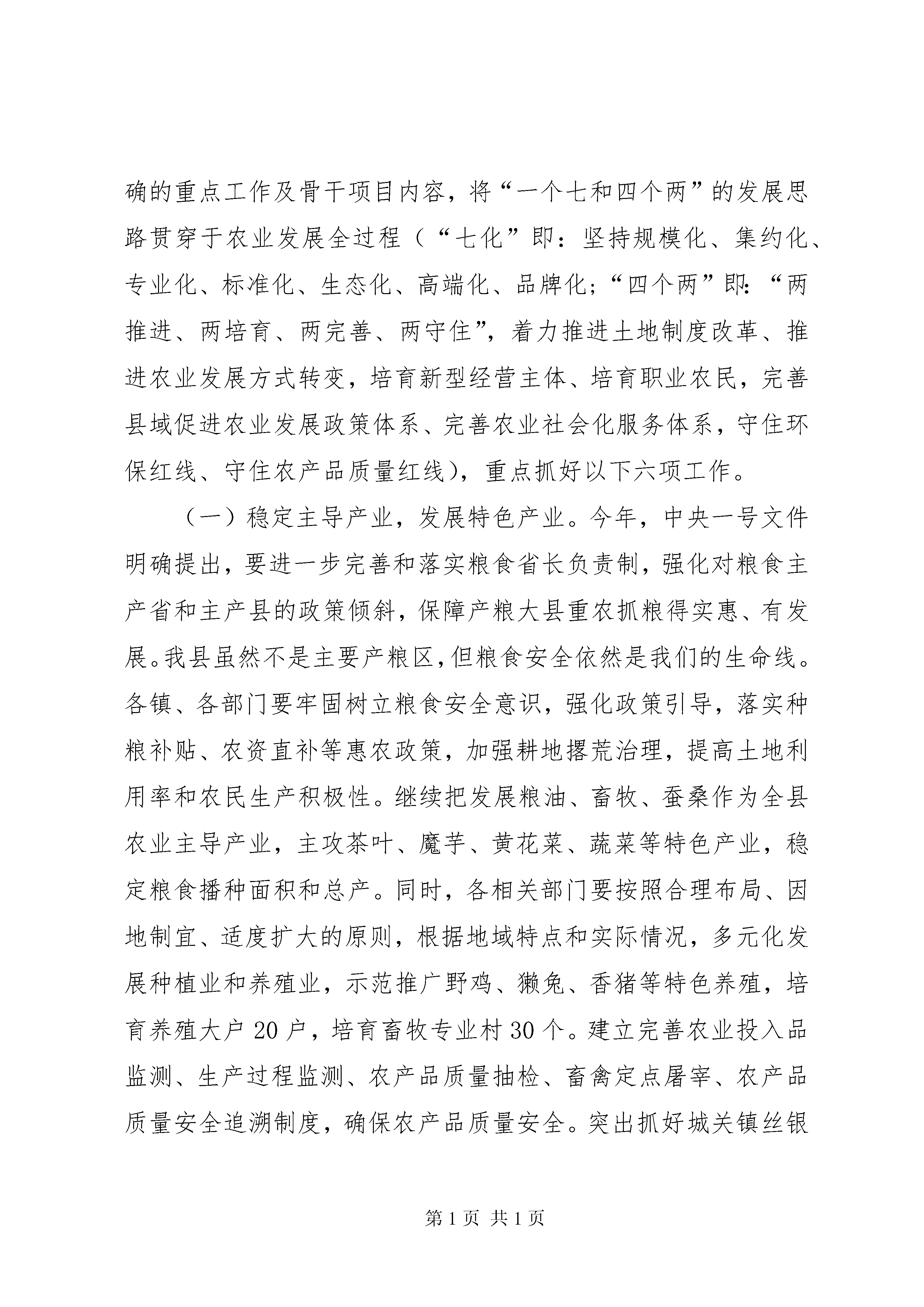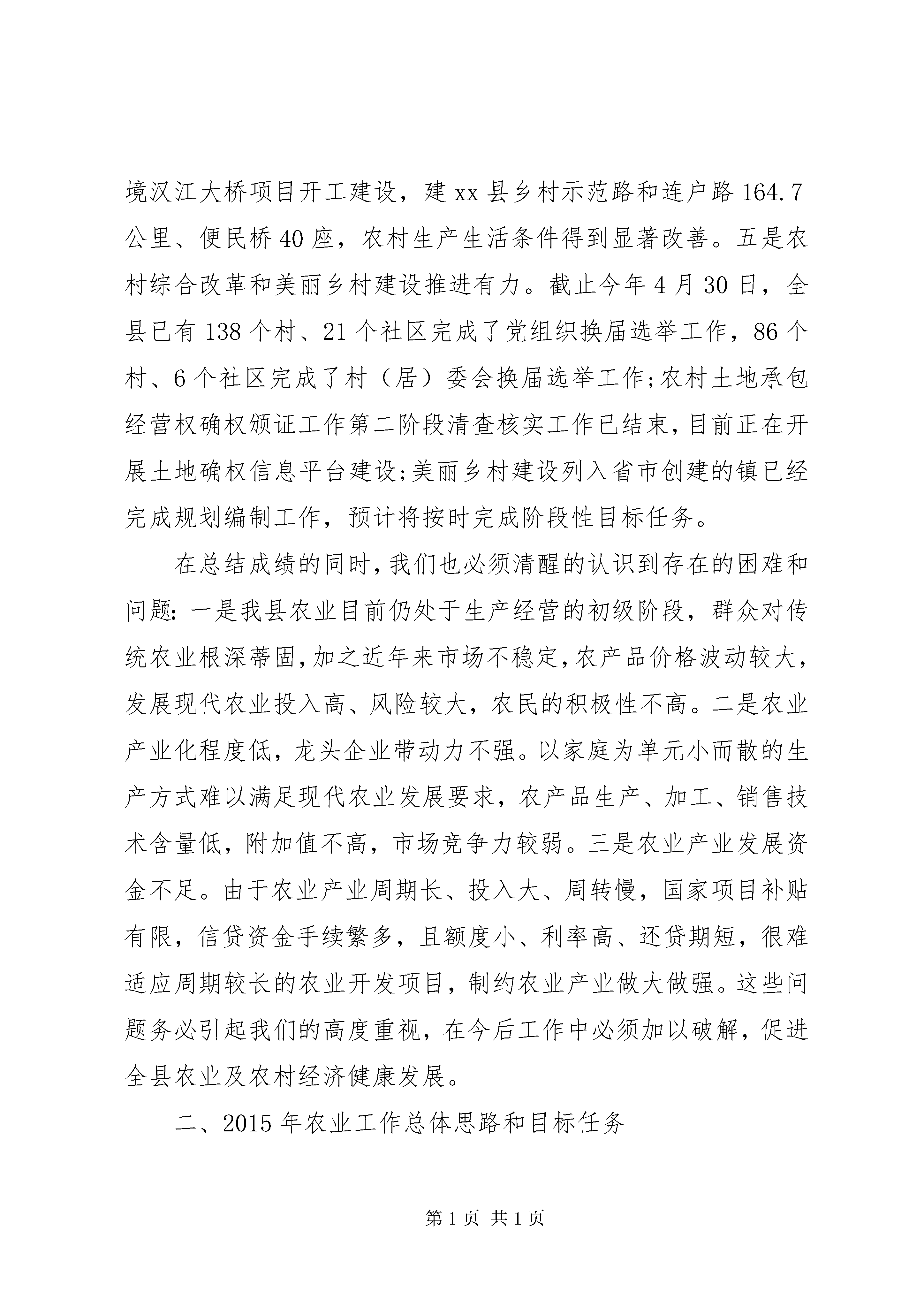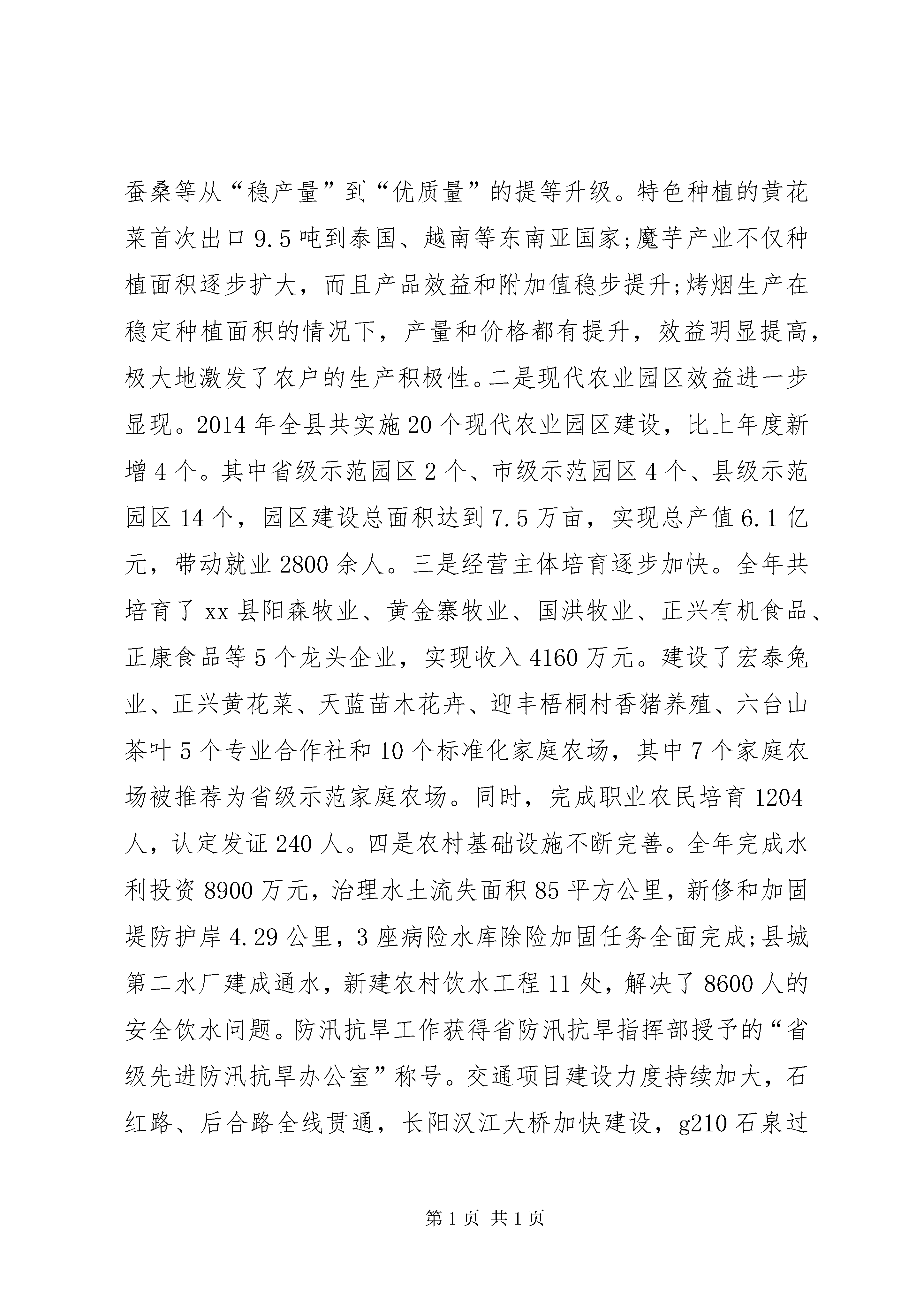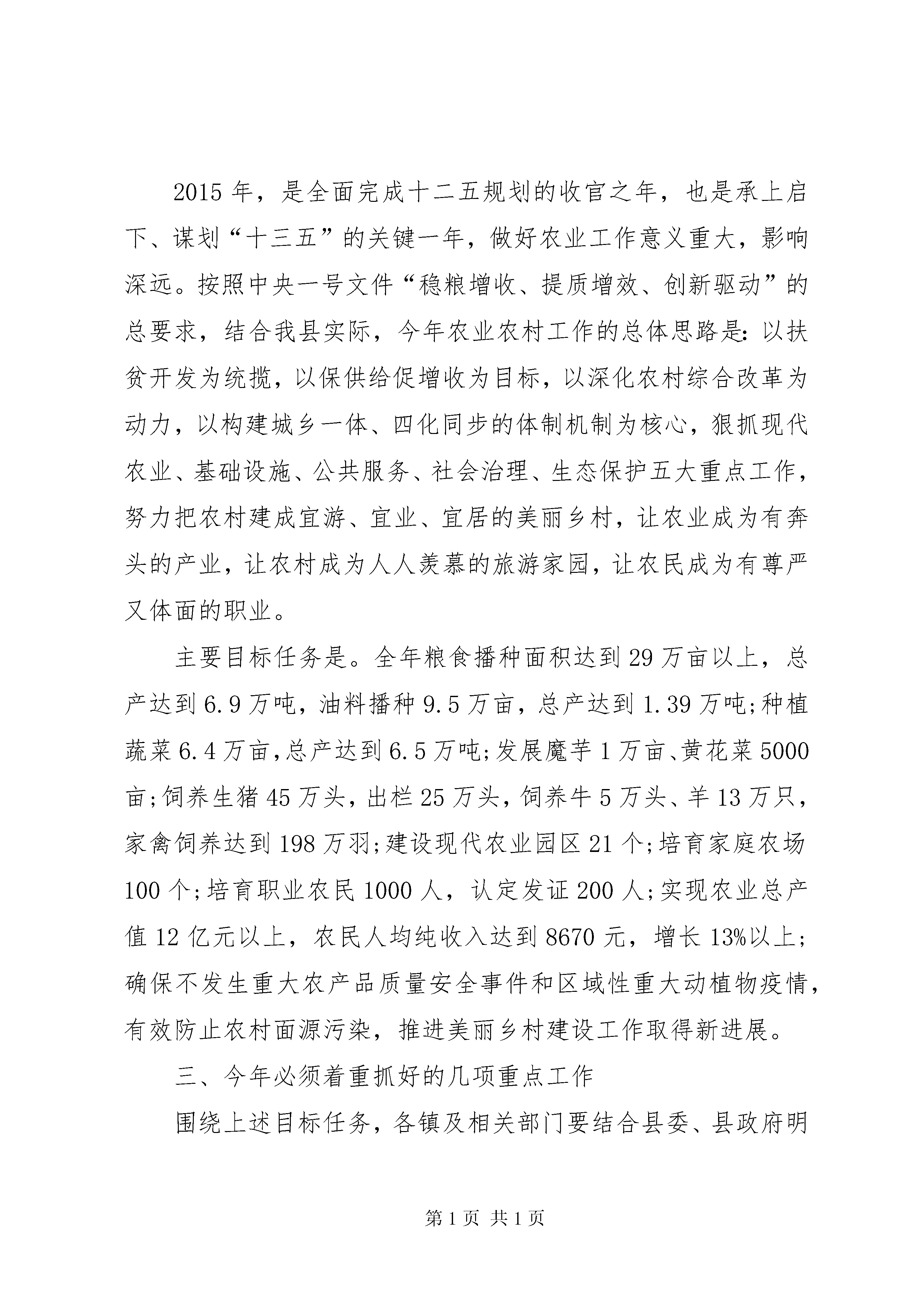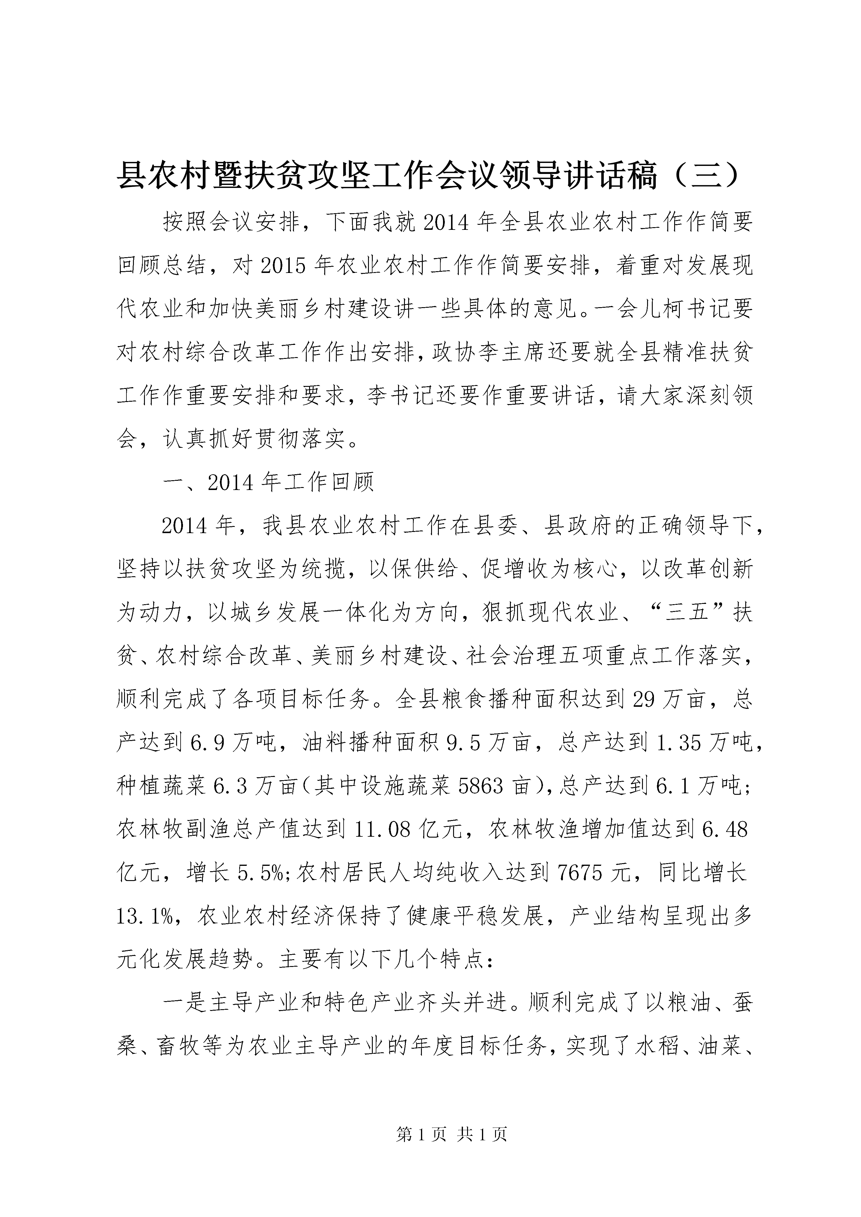 县农村暨扶贫攻坚工作会议领导讲话稿(三)按照会议安排,下面我就2014年全县农业农村工作作简要回顾总结,对2015年农业农村工作作简要安排,着重对发展现代农业和加快美丽乡村建设讲一些具体的意见。一会儿柯书记要对农村综合改革工作作出安排,政协李主席还要就全县精准扶贫工作作重要安排和要求,李书记还要作重要讲话,请大家深刻领会,认真抓好贯彻落实。一、2014年工作回顾2014年,我县农业农村工作在县委、县政府的正确领导下,坚持以扶贫攻坚为统揽,以保供给、促增收为核心,以改革创新为动力,以城乡发展一体化为方向,狠抓现代农业、“三五”扶贫、农村综合改革、美丽乡村建设、社会治理五项重点工作落实,顺利完成了各项目标任务。全县粮食播种面积达到29万亩,总产达到6.9万吨,油料播种面积9.5万亩,总产达到1.35万吨,种植蔬菜6.3万亩(其中设施蔬菜5863亩),总产达到6.1万吨;农林牧副渔总产值达到11.08亿元,农林牧渔增加值达到6.48亿元,增长5.5%;农村居民人均纯收入达到7675元,同比增长13.1%,农业农村经济保持了健康平稳发展,产业结构呈现出多元化发展趋势。主要有以下几个特点:一是主导产业和特色产业齐头并进。顺利完成了以粮油、蚕桑、畜牧等为农业主导产业的年度目标任务,实现了水稻、油菜、蚕桑等从“稳产量”到“优质量”的提等升级。特色种植的黄花菜首次出口9.5吨到泰国、越南等东南亚国家;魔芋产业不仅种植面积逐步扩大,而且产品效益和附加值稳步提升;烤烟生产在稳定种植面积的情况下,产量和价格都有提升,效益明显提高,极大地激发了农户的生产积极性。二是现代农业园区效益进一步显现。2014年全县共实施20个现代农业园区建设,比上年度新增4个。其中省级示范园区2个、市级示范园区4个、县级示范园区14个,园区建设总面积达到7.5万亩,实现总产值6.1亿元,带动就业2800余人。三是经营主体培育逐步加快。全年共培育了xx县阳森牧业、黄金寨牧业、国洪牧业、正兴有机食品、正康食品等5个龙头企业,实现收入4160万元。建设了宏泰兔业、正兴黄花菜、天蓝苗木花卉、迎丰梧桐村香猪养殖、六台山茶叶5个专业合作社和10个标准化家庭农场,其中7个家庭农场被推荐为省级示范家庭农场。同时,完成职业农民培育1204人,认定发证240人。四是农村基础设施不断完善。全年完成水利投资8900万元,治理水土流失面积85平方公里,新修和加固堤防护岸4.29公里,3座病险水库除险加固任务全面完成;县城第二水厂建成通水,新建农村饮水工程11处,解决了8600人的安全饮水问题。防汛抗旱工作获得省防汛抗旱指挥部授予的“省级先进防汛抗旱办公室”称号。交通项目建设力度持续加大,石红路、后合路全线贯通,长阳汉江大桥加快建设,g210石泉过境汉江大桥项目开工建设,建xx县乡村示范路和连户路164.7公里、便民桥40座,农村生产生活条件得到显著改善。五是农村综合改革和美丽乡村建设推进有力。截止今年4月30日,全县已有138个村、21个社区完成了党组织换届选举工作,86个村、6个社区完成了村(居)委会换届选举工作;农村土地承包经营权确权颁证工作第二阶段清查核实工作已结束,目前正在开展土地确权信息平台建设;美丽乡村建设列入省市创建的镇已经完成规划编制工作,预计将按时完成阶段性目标任务。在总结成绩的同时,我们也必须清醒的认识到存在的困难和问题:一是我县农业目前仍处于生产经营的初级阶段,群众对传统农业根深蒂固,加之近年来市场不稳定,农产品价格波动较大,发展现代农业投入高、风险较大,农民的积极性不高。二是农业产业化程度低,龙头企业带动力不强。以家庭为单元小而散的生产方式难以满足现代农业发展要求,农产品生产、加工、销售技术含量低,附加值不高,市场竞争力较弱。三是农业产业发展资金不足。由于农业产业周期长、投入大、周转慢,国家项目补贴有限,信贷资金手续繁多,且额度小、利率高、还贷期短,很难适应周期较长的农业开发项目,制约农业产业做大做强。这些问题务必引起我们的高度重视,在今后工作中必须加以破解,促进全县农业及农村经济健康发展。二、2015年农业工作总体思路和目标任务2015年,是全面完成十二五规划的收官之年,也是承上启下、谋划“十三五”的关键一年,做好农业工作意义重大,影响深远。按照中央一号文件“稳粮增收、提质增效、创新驱动”的总要求,结合我县实际,今年农业农村工作的总体思路是:以扶贫开发为统揽,以保供给促增收为目标,以深化农村综合改革为动力,以构建城乡一体、四化同步的体制机制为核心,狠抓现代农业、基础设施、公共服务、社会治理、生态保护五大重点工作,努力把农村建成宜游、宜业、宜居的美丽乡村,让农业成为有奔头的产业,让农村成为人人羡慕的旅游家园,让农民成为有尊严又体面的职业。主要目标任务