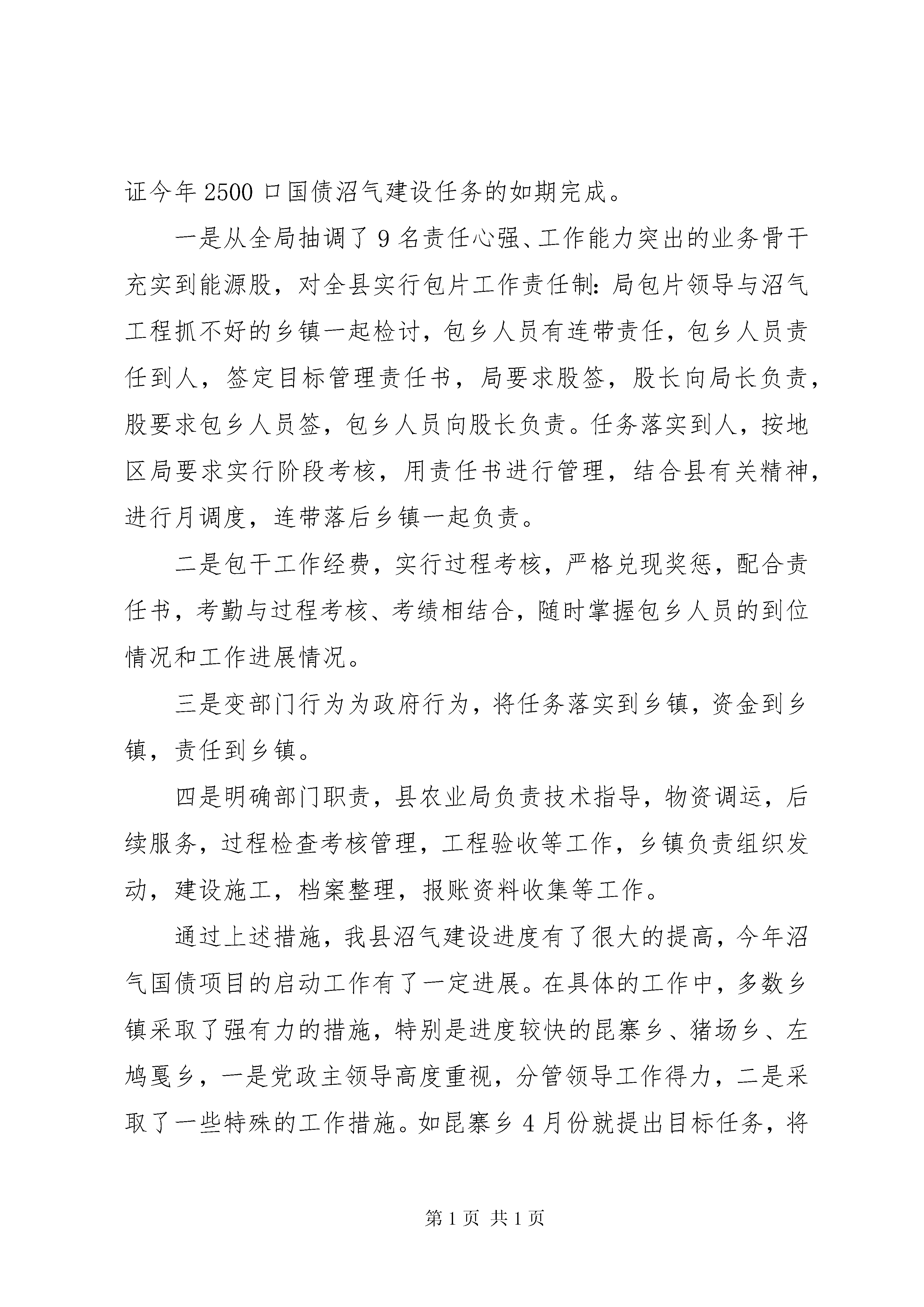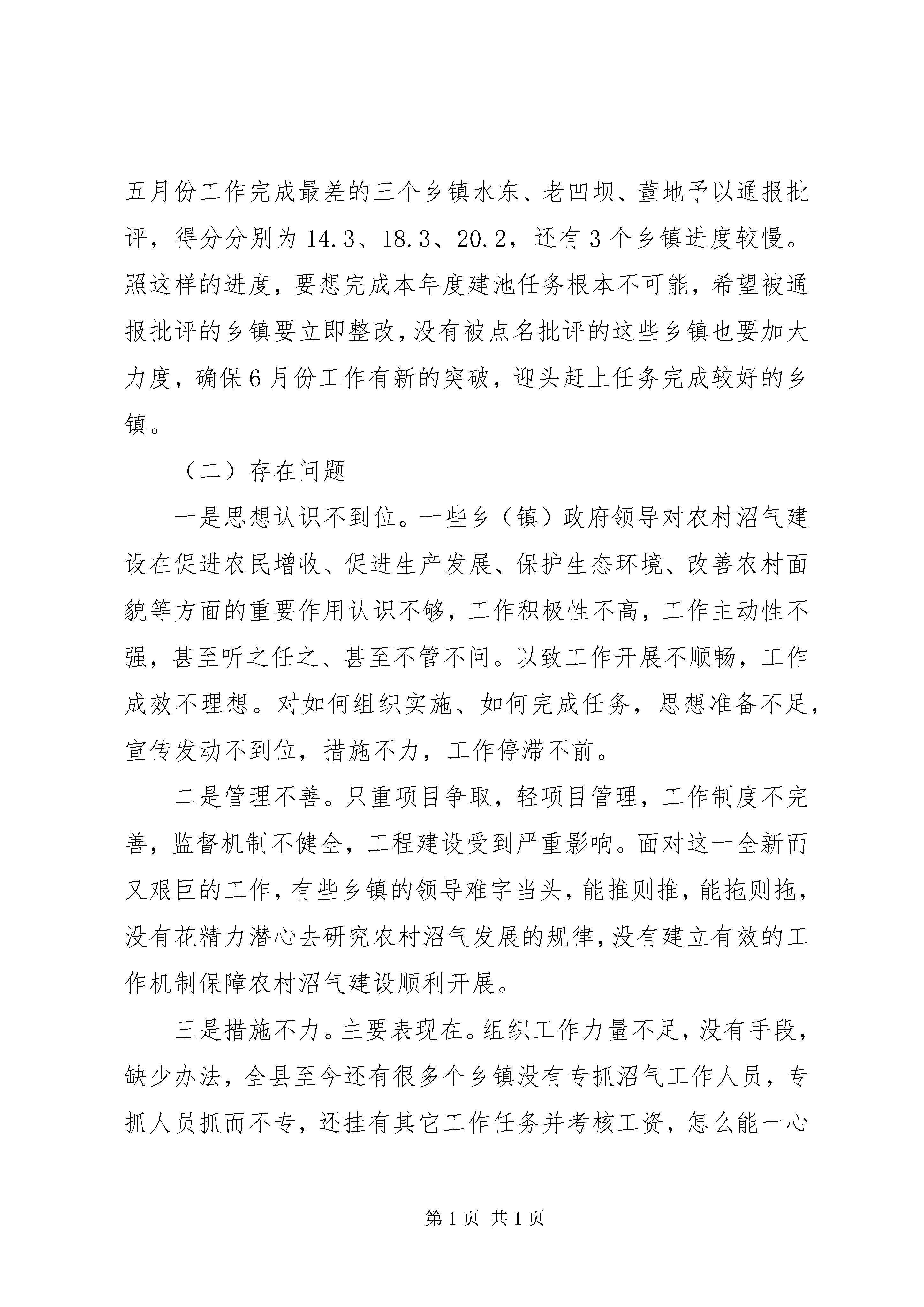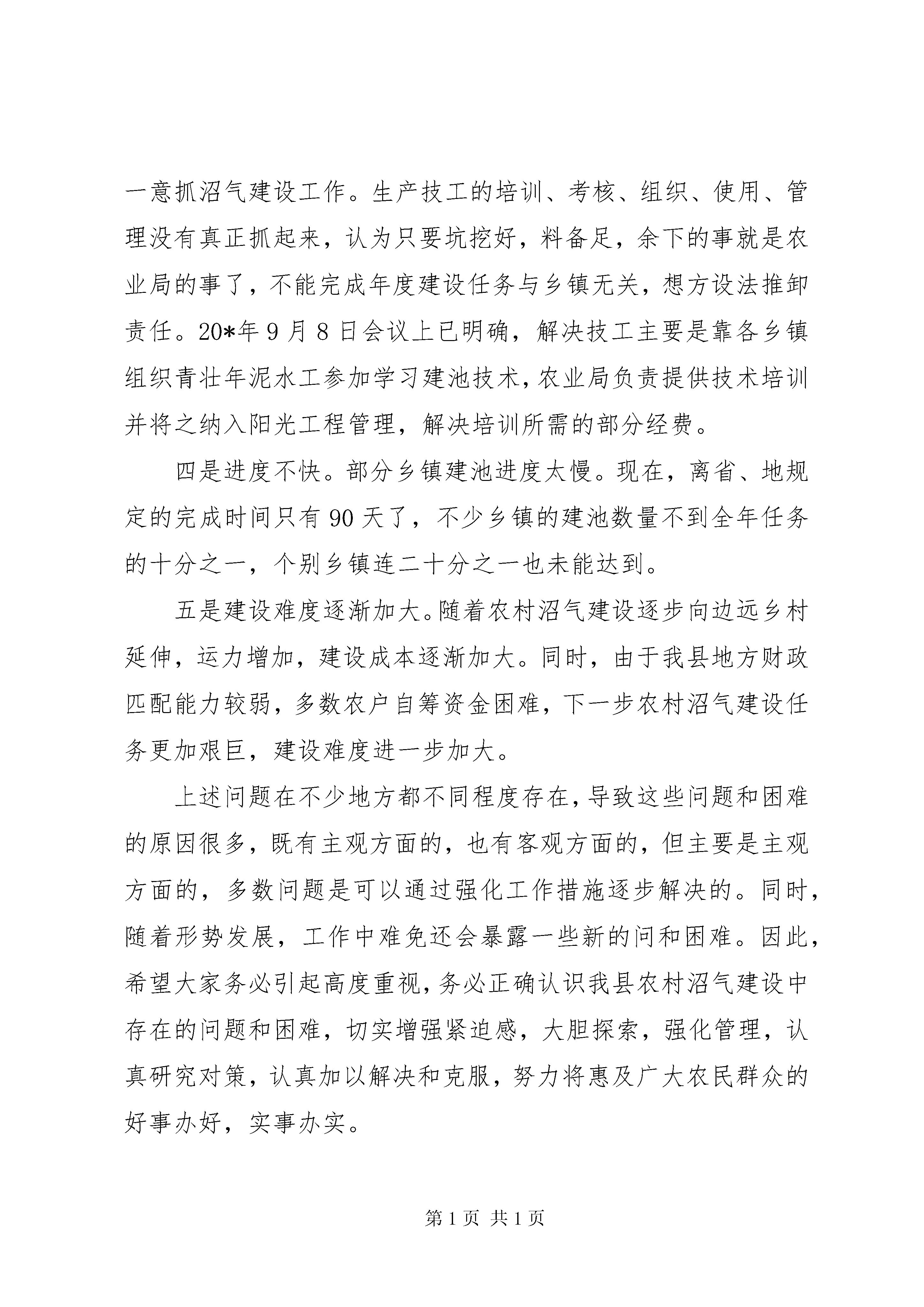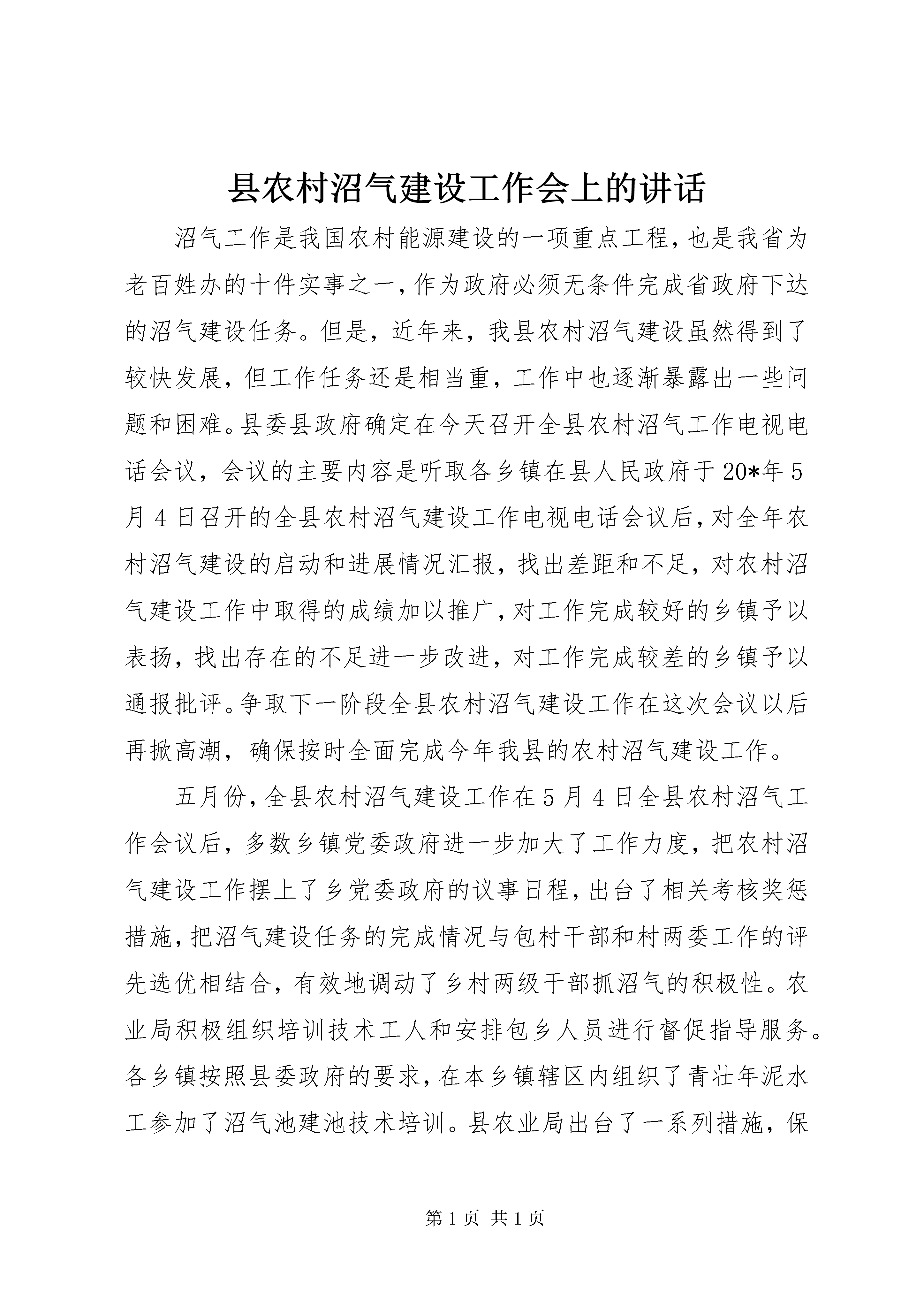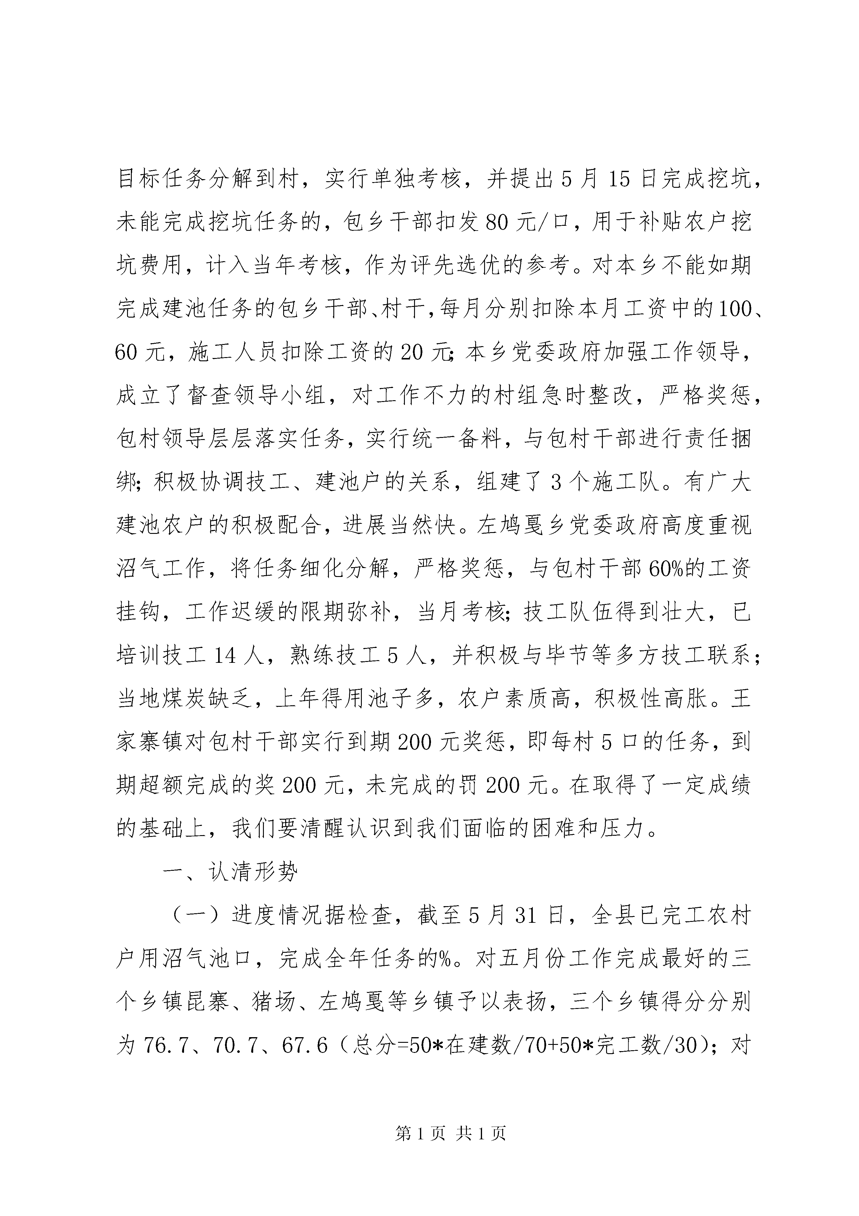 县农村沼气建设工作会上的讲话沼气工作是我国农村能源建设的一项重点工程,也是我省为老百姓办的十件实事之一,作为政府必须无条件完成省政府下达的沼气建设任务。但是,近年来,我县农村沼气建设虽然得到了较快发展,但工作任务还是相当重,工作中也逐渐暴露出一些问题和困难。县委县政府确定在今天召开全县农村沼气工作电视电话会议,会议的主要内容是听取各乡镇在县人民政府于20*年5月4日召开的全县农村沼气建设工作电视电话会议后,对全年农村沼气建设的启动和进展情况汇报,找出差距和不足,对农村沼气建设工作中取得的成绩加以推广,对工作完成较好的乡镇予以表扬,找出存在的不足进一步改进,对工作完成较差的乡镇予以通报批评。争取下一阶段全县农村沼气建设工作在这次会议以后再掀高潮,确保按时全面完成今年我县的农村沼气建设工作。五月份,全县农村沼气建设工作在5月4日全县农村沼气工作会议后,多数乡镇党委政府进一步加大了工作力度,把农村沼气建设工作摆上了乡党委政府的议事日程,出台了相关考核奖惩措施,把沼气建设任务的完成情况与包村干部和村两委工作的评先选优相结合,有效地调动了乡村两级干部抓沼气的积极性。农业局积极组织培训技术工人和安排包乡人员进行督促指导服务。各乡镇按照县委政府的要求,在本乡镇辖区内组织了青壮年泥水工参加了沼气池建池技术培训。县农业局出台了一系列措施,保证今年2500口国债沼气建设任务的如期完成。一是从全局抽调了9名责任心强、工作能力突出的业务骨干充实到能源股,对全县实行包片工作责任制:局包片领导与沼气工程抓不好的乡镇一起检讨,包乡人员有连带责任,包乡人员责任到人,签定目标管理责任书,局要求股签,股长向局长负责,股要求包乡人员签,包乡人员向股长负责。任务落实到人,按地区局要求实行阶段考核,用责任书进行管理,结合县有关精神,进行月调度,连带落后乡镇一起负责。二是包干工作经费,实行过程考核,严格兑现奖惩,配合责任书,考勤与过程考核、考绩相结合,随时掌握包乡人员的到位情况和工作进展情况。三是变部门行为为政府行为,将任务落实到乡镇,资金到乡镇,责任到乡镇。四是明确部门职责,县农业局负责技术指导,物资调运,后续服务,过程检查考核管理,工程验收等工作,乡镇负责组织发动,建设施工,档案整理,报账资料收集等工作。通过上述措施,我县沼气建设进度有了很大的提高,今年沼气国债项目的启动工作有了一定进展。在具体的工作中,多数乡镇采取了强有力的措施,特别是进度较快的昆寨乡、猪场乡、左鸠戛乡,一是党政主领导高度重视,分管领导工作得力,二是采取了一些特殊的工作措施。如昆寨乡4月份就提出目标任务,将目标任务分解到村,实行单独考核,并提出5月15日完成挖坑,未能完成挖坑任务的,包乡干部扣发80元/口,用于补贴农户挖坑费用,计入当年考核,作为评先选优的参考。对本乡不能如期完成建池任务的包乡干部、村干,每月分别扣除本月工资中的100、60元,施工人员扣除工资的20元;本乡党委政府加强工作领导,成立了督查领导小组,对工作不力的村组急时整改,严格奖惩,包村领导层层落实任务,实行统一备料,与包村干部进行责任捆绑;积极协调技工、建池户的关系,组建了3个施工队。有广大建池农户的积极配合,进展当然快。左鸠戛乡党委政府高度重视沼气工作,将任务细化分解,严格奖惩,与包村干部60%的工资挂钩,工作迟缓的限期弥补,当月考核;技工队伍得到壮大,已培训技工14人,熟练技工5人,并积极与毕节等多方技工联系;当地煤炭缺乏,上年得用池子多,农户素质高,积极性高胀。王家寨镇对包村干部实行到期200元奖惩,即每村5口的任务,到期超额完成的奖200元,未完成的罚200元。在取得了一定成绩的基础上,我们要清醒认识到我们面临的困难和压力。一、认清形势(一)进度情况据检查,截至5月31日,全县已完工农村户用沼气池口,完成全年任务的%。对五月份工作完成最好的三个乡镇昆寨、猪场、左鸠戛等乡镇予以表扬,三个乡镇得分分别为76.7、70.7、67.6(总分=50*在建数/70+50*完工数/30);对五月份工作完成最差的三个乡镇水东、老凹坝、董地予以通报批评,得分分别为14.3、18.3、20.2,还有3个乡镇进度较慢。照这样的进度,要想完成本年度建池任务根本不可能,希望被通报批评的乡镇要立即整改,没有被点名批评的这些乡镇也要加大力度,确保6月份工作有新的突破,迎头赶上任务完成较好的乡镇。(二)存在问题一是思想认识不到位。一些乡(镇)政府领导对农村沼气建设在促进农民增收、促进生产发展、保护生态环境、改善农村面貌等方面的重要作用认识不够,工作积极性不高,工作主动性不强,甚至听之任之、甚至不管不问。以致工作开展不顺畅,工作成效不理想。对如何组织实施、如何完成任务,思想准备不足,宣传发动不到位,措施不力,工作停滞不前。二是管