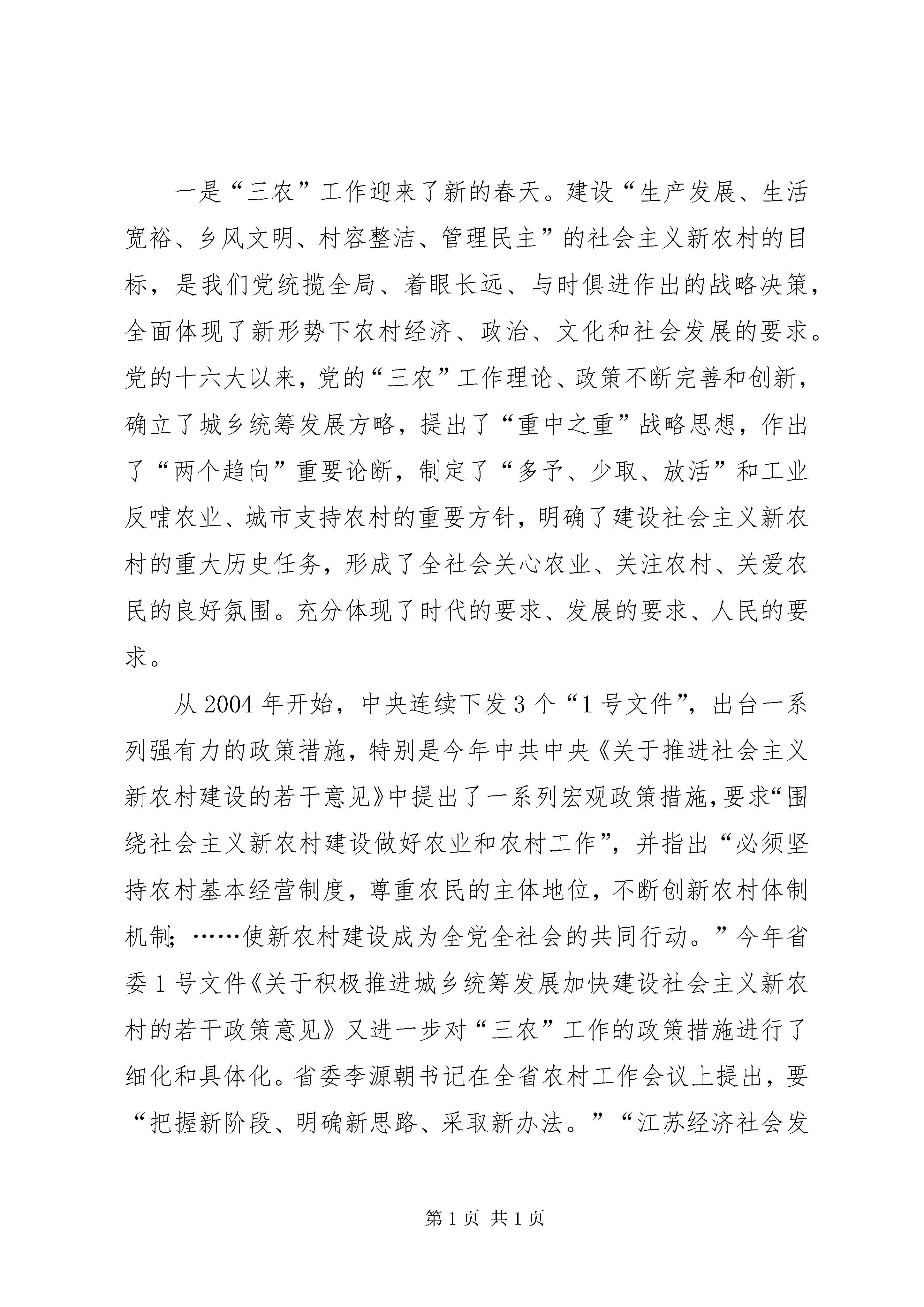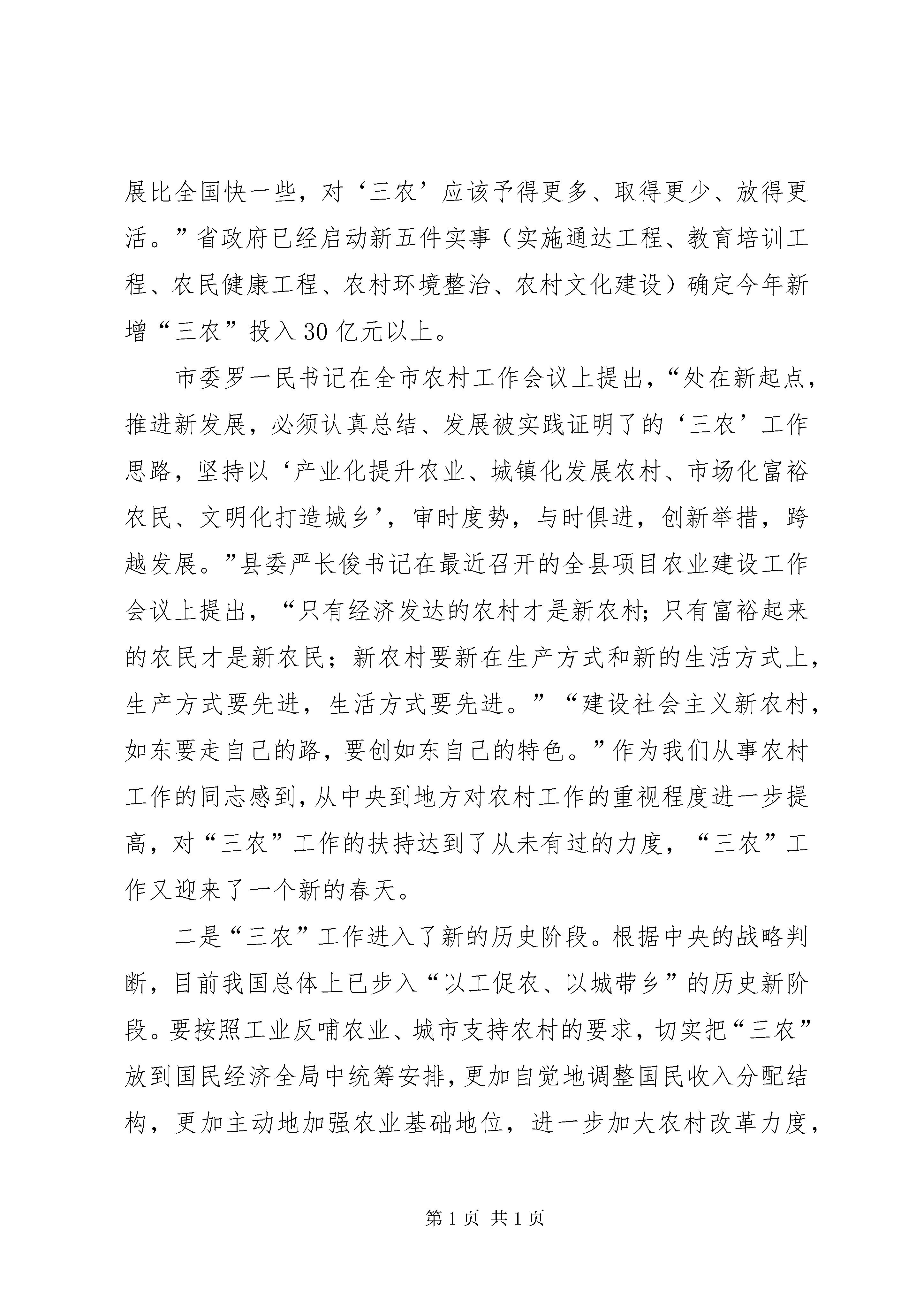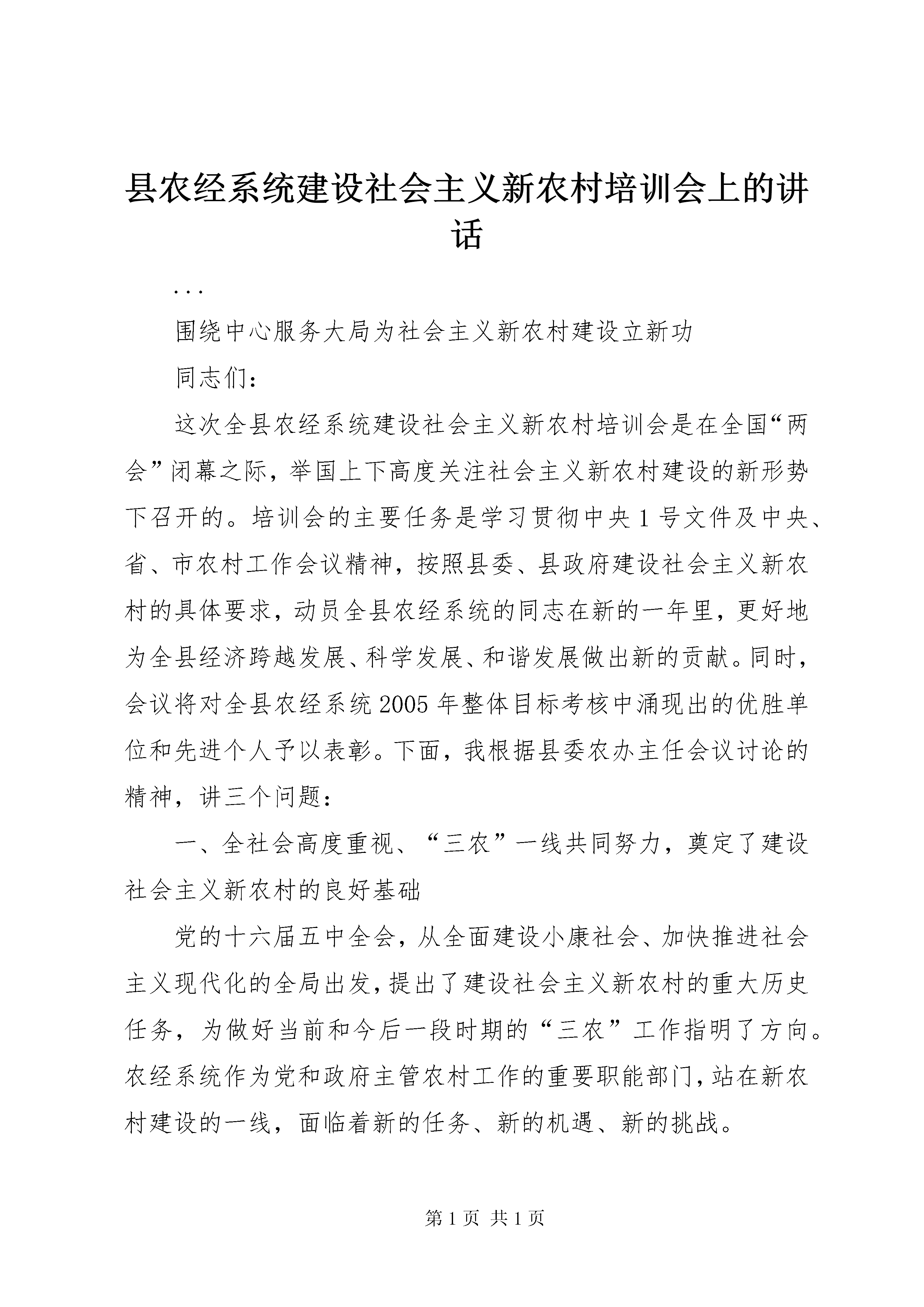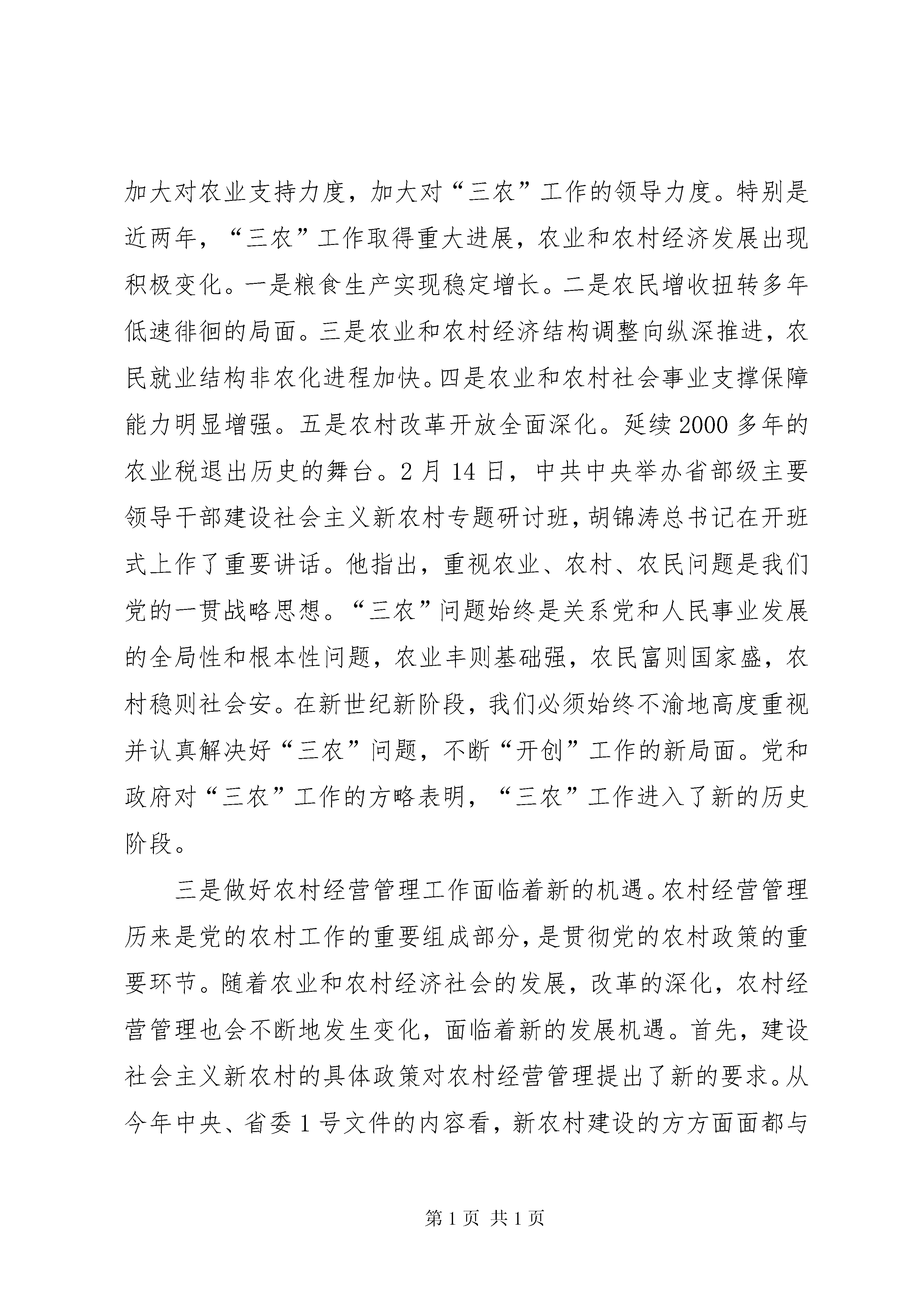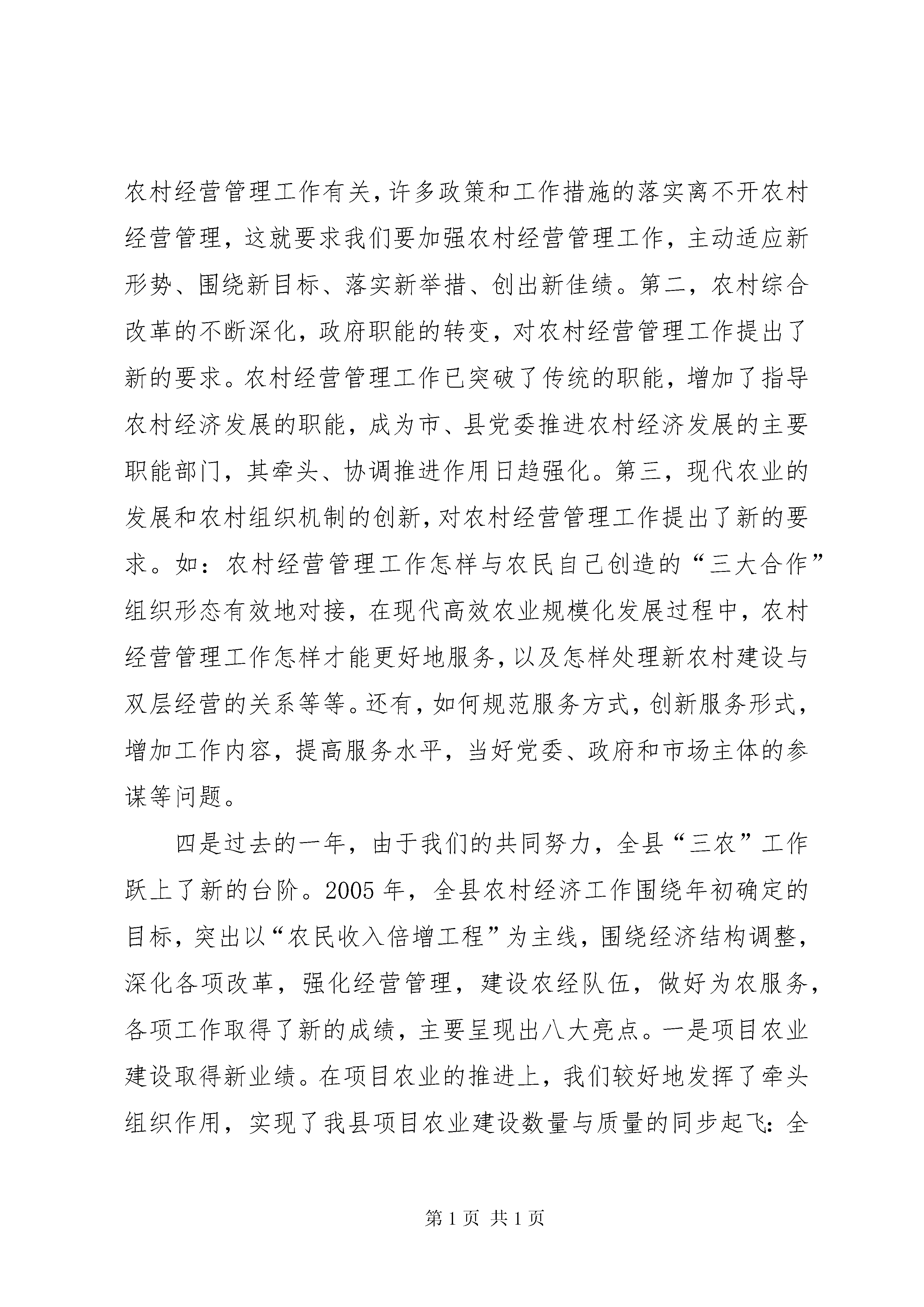 县农经系统建设社会主义新农村培训会上的讲话...围绕中心服务大局为社会主义新农村建设立新功同志们:这次全县农经系统建设社会主义新农村培训会是在全国“两会”闭幕之际,举国上下高度关注社会主义新农村建设的新形势下召开的。培训会的主要任务是学习贯彻中央1号文件及中央、省、市农村工作会议精神,按照县委、县政府建设社会主义新农村的具体要求,动员全县农经系统的同志在新的一年里,更好地为全县经济跨越发展、科学发展、和谐发展做出新的贡献。同时,会议将对全县农经系统2005年整体目标考核中涌现出的优胜单位和先进个人予以表彰。下面,我根据县委农办主任会议讨论的精神,讲三个问题:一、全社会高度重视、“三农”一线共同努力,奠定了建设社会主义新农村的良好基础党的十六届五中全会,从全面建设小康社会、加快推进社会主义现代化的全局出发,提出了建设社会主义新农村的重大历史任务,为做好当前和今后一段时期的“三农”工作指明了方向。农经系统作为党和政府主管农村工作的重要职能部门,站在新农村建设的一线,面临着新的任务、新的机遇、新的挑战。一是“三农”工作迎来了新的春天。建设“生产发展、生活宽裕、乡风文明、村容整洁、管理民主”的社会主义新农村的目标,是我们党统揽全局、着眼长远、与时俱进作出的战略决策,全面体现了新形势下农村经济、政治、文化和社会发展的要求。党的十六大以来,党的“三农”工作理论、政策不断完善和创新,确立了城乡统筹发展方略,提出了“重中之重”战略思想,作出了“两个趋向”重要论断,制定了“多予、少取、放活”和工业反哺农业、城市支持农村的重要方针,明确了建设社会主义新农村的重大历史任务,形成了全社会关心农业、关注农村、关爱农民的良好氛围。充分体现了时代的要求、发展的要求、人民的要求。从2004年开始,中央连续下发3个“1号文件”,出台一系列强有力的政策措施,特别是今年中共中央《关于推进社会主义新农村建设的若干意见》中提出了一系列宏观政策措施,要求“围绕社会主义新农村建设做好农业和农村工作”,并指出“必须坚持农村基本经营制度,尊重农民的主体地位,不断创新农村体制机制;……使新农村建设成为全党全社会的共同行动。”今年省委1号文件《关于积极推进城乡统筹发展加快建设社会主义新农村的若干政策意见》又进一步对“三农”工作的政策措施进行了细化和具体化。省委李源朝书记在全省农村工作会议上提出,要“把握新阶段、明确新思路、采取新办法。”“江苏经济社会发展比全国快一些,对‘三农’应该予得更多、取得更少、放得更活。”省政府已经启动新五件实事(实施通达工程、教育培训工程、农民健康工程、农村环境整治、农村文化建设)确定今年新增“三农”投入30亿元以上。市委罗一民书记在全市农村工作会议上提出,“处在新起点,推进新发展,必须认真总结、发展被实践证明了的‘三农’工作思路,坚持以‘产业化提升农业、城镇化发展农村、市场化富裕农民、文明化打造城乡’,审时度势,与时俱进,创新举措,跨越发展。”县委严长俊书记在最近召开的全县项目农业建设工作会议上提出,“只有经济发达的农村才是新农村;只有富裕起来的农民才是新农民;新农村要新在生产方式和新的生活方式上,生产方式要先进,生活方式要先进。”“建设社会主义新农村,如东要走自己的路,要创如东自己的特色。”作为我们从事农村工作的同志感到,从中央到地方对农村工作的重视程度进一步提高,对“三农”工作的扶持达到了从未有过的力度,“三农”工作又迎来了一个新的春天。二是“三农”工作进入了新的历史阶段。根据中央的战略判断,目前我国总体上已步入“以工促农、以城带乡”的历史新阶段。要按照工业反哺农业、城市支持农村的要求,切实把“三农”放到国民经济全局中统筹安排,更加自觉地调整国民收入分配结构,更加主动地加强农业基础地位,进一步加大农村改革力度,加大对农业支持力度,加大对“三农”工作的领导力度。特别是近两年,“三农”工作取得重大进展,农业和农村经济发展出现积极变化。一是粮食生产实现稳定增长。二是农民增收扭转多年低速徘徊的局面。三是农业和农村经济结构调整向纵深推进,农民就业结构非农化进程加快。四是农业和农村社会事业支撑保障能力明显增强。五是农村改革开放全面深化。延续2000多年的农业税退出历史的舞台。2月14日,中共中央举办省部级主要领导干部建设社会主义新农村专题研讨班,胡锦涛总书记在开班式上作了重要讲话。他指出,重视农业、农村、农民问题是我们党的一贯战略思想。“三农”问题始终是关系党和人民事业发展的全局性和根本性问题,农业丰则基础强,农民富则国家盛,农村稳则社会安。在新世纪新阶段,我们必须始终不渝地高度重视并认真解决好“三农”问题,不断“开创”工作的新局面。党和政府对“三农”工作的方略表明,“三农”工作进入了新的历史阶段。三是做好农村经营管理工作面临着新的机
