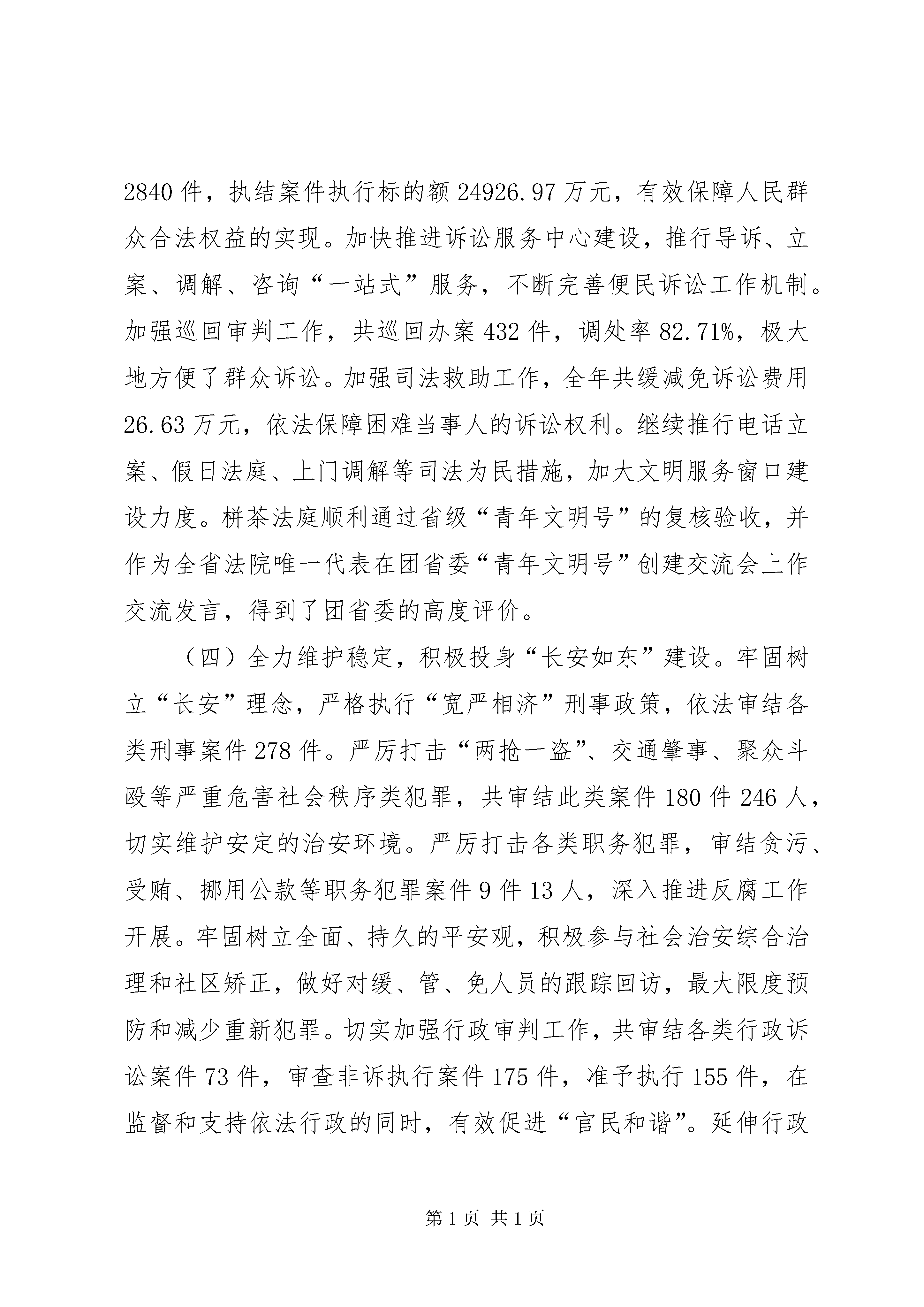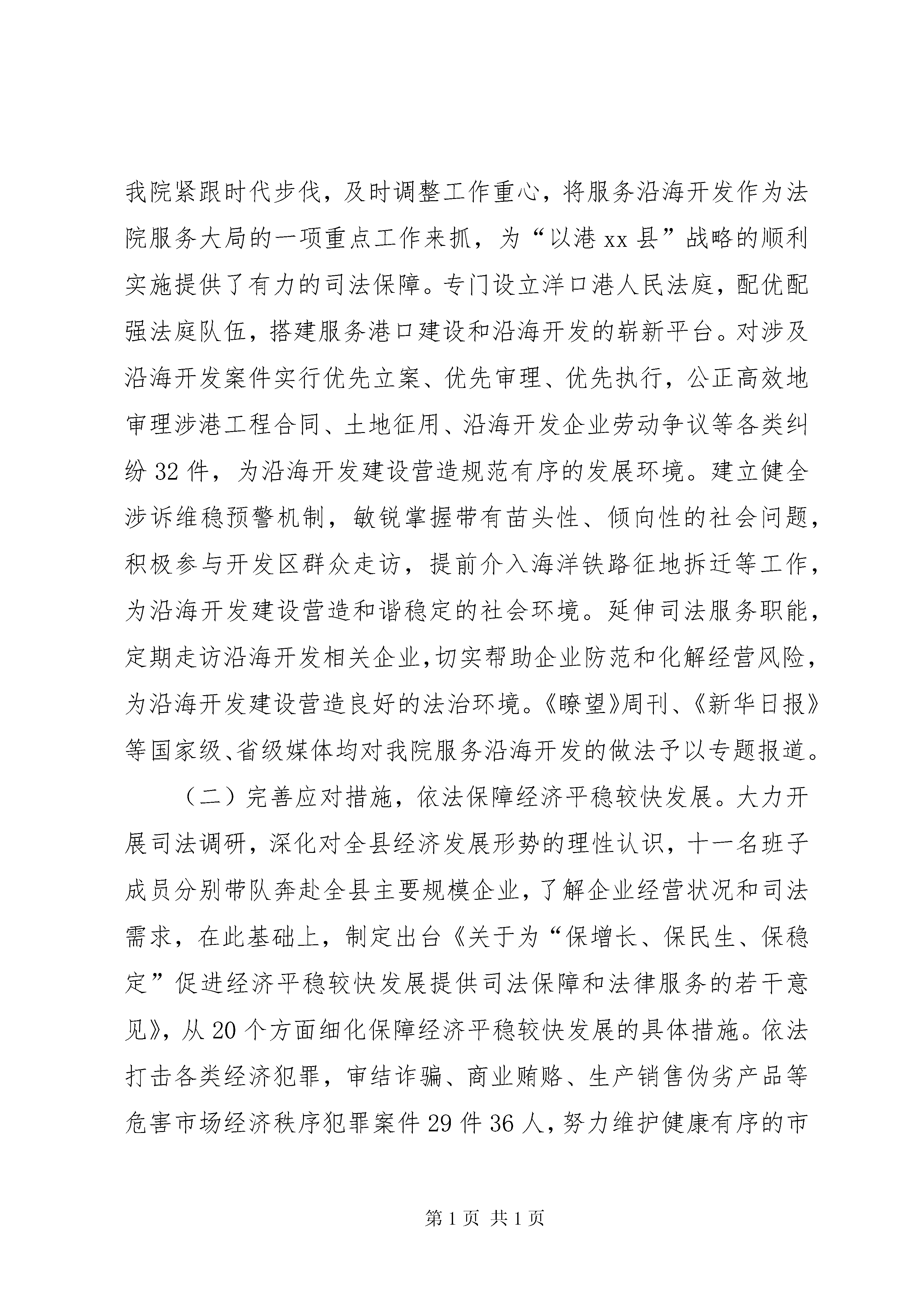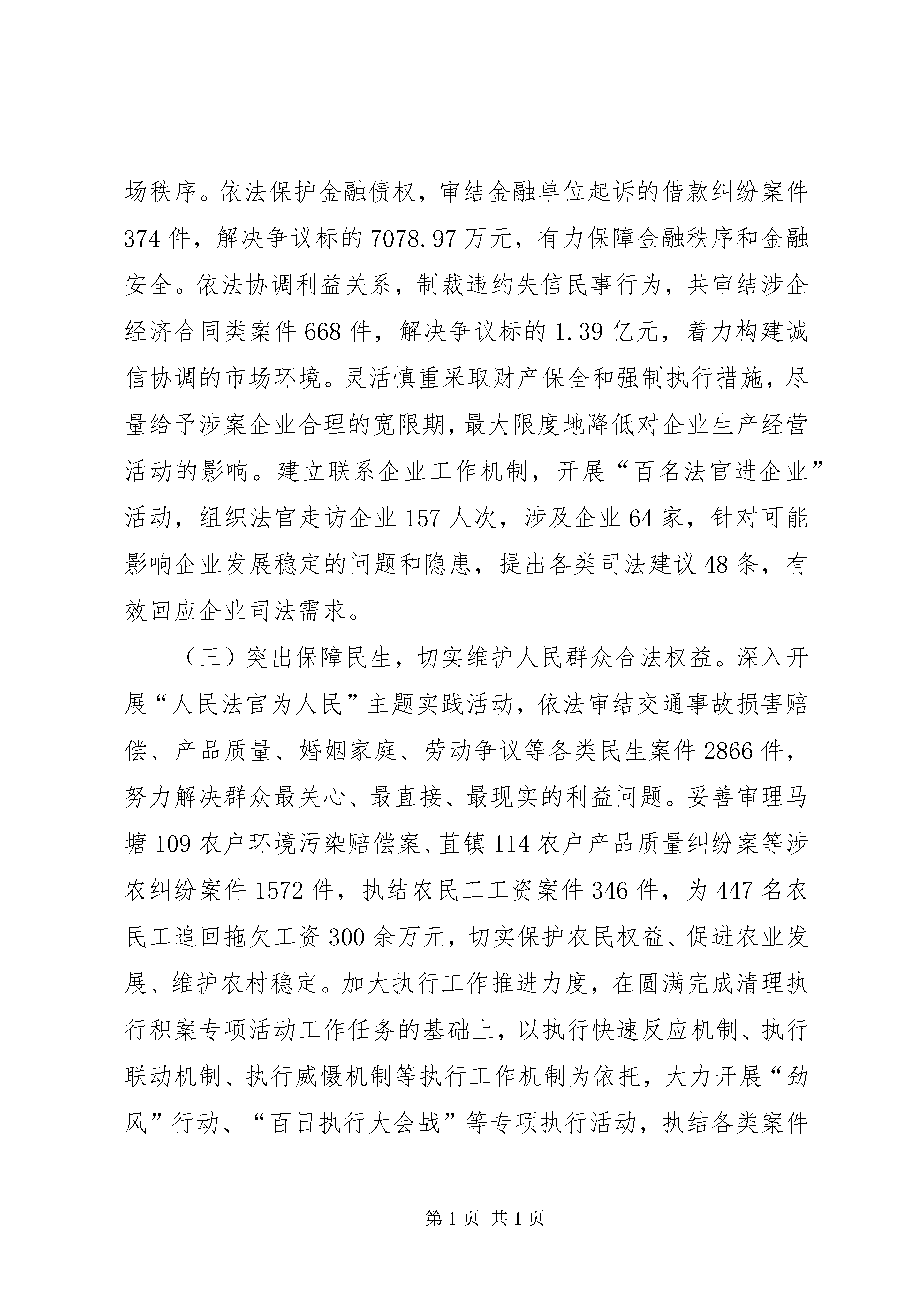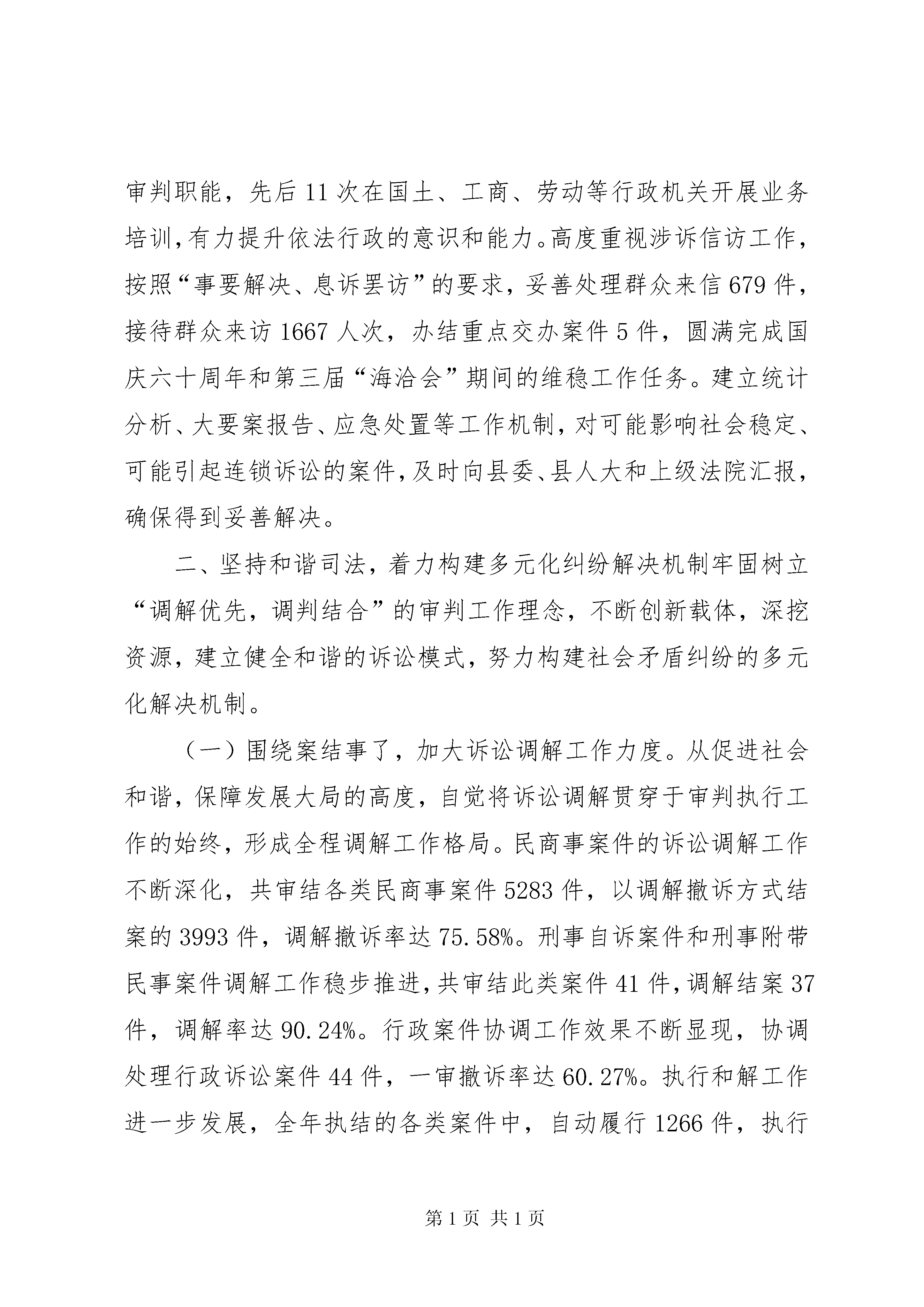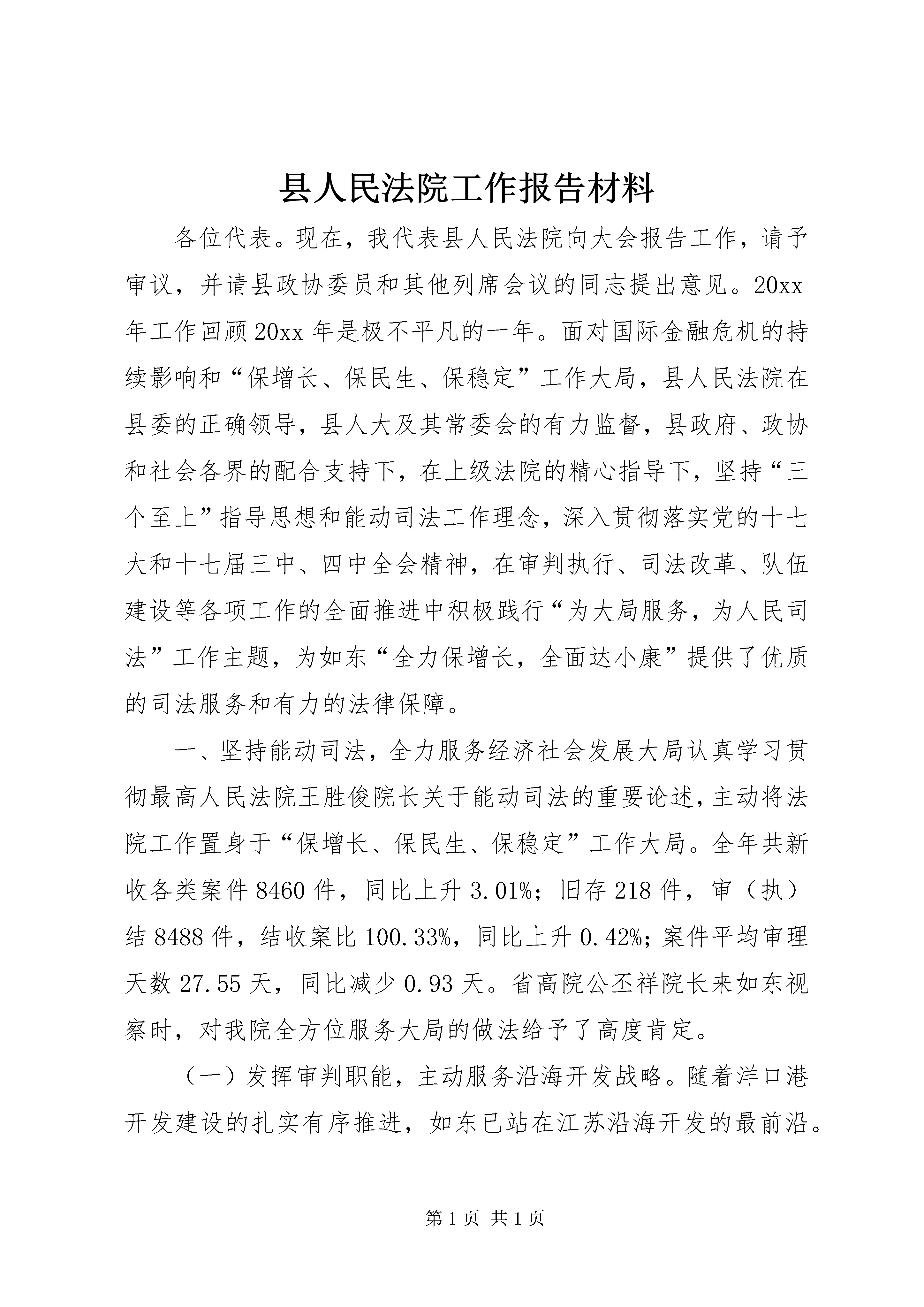 县人民法院工作报告材料各位代表。现在,我代表县人民法院向大会报告工作,请予审议,并请县政协委员和其他列席会议的同志提出意见。20xx年工作回顾20xx年是极不平凡的一年。面对国际金融危机的持续影响和“保增长、保民生、保稳定”工作大局,县人民法院在县委的正确领导,县人大及其常委会的有力监督,县政府、政协和社会各界的配合支持下,在上级法院的精心指导下,坚持“三个至上”指导思想和能动司法工作理念,深入贯彻落实党的十七大和十七届三中、四中全会精神,在审判执行、司法改革、队伍建设等各项工作的全面推进中积极践行“为大局服务,为人民司法”工作主题,为如东“全力保增长,全面达小康”提供了优质的司法服务和有力的法律保障。一、坚持能动司法,全力服务经济社会发展大局认真学习贯彻最高人民法院王胜俊院长关于能动司法的重要论述,主动将法院工作置身于“保增长、保民生、保稳定”工作大局。全年共新收各类案件8460件,同比上升3.01%;旧存218件,审(执)结8488件,结收案比100.33%,同比上升0.42%;案件平均审理天数27.55天,同比减少0.93天。省高院公丕祥院长来如东视察时,对我院全方位服务大局的做法给予了高度肯定。(一)发挥审判职能,主动服务沿海开发战略。随着洋口港开发建设的扎实有序推进,如东已站在江苏沿海开发的最前沿。我院紧跟时代步伐,及时调整工作重心,将服务沿海开发作为法院服务大局的一项重点工作来抓,为“以港xx县”战略的顺利实施提供了有力的司法保障。专门设立洋口港人民法庭,配优配强法庭队伍,搭建服务港口建设和沿海开发的崭新平台。对涉及沿海开发案件实行优先立案、优先审理、优先执行,公正高效地审理涉港工程合同、土地征用、沿海开发企业劳动争议等各类纠纷32件,为沿海开发建设营造规范有序的发展环境。建立健全涉诉维稳预警机制,敏锐掌握带有苗头性、倾向性的社会问题,积极参与开发区群众走访,提前介入海洋铁路征地拆迁等工作,为沿海开发建设营造和谐稳定的社会环境。延伸司法服务职能,定期走访沿海开发相关企业,切实帮助企业防范和化解经营风险,为沿海开发建设营造良好的法治环境。《瞭望》周刊、《新华日报》等国家级、省级媒体均对我院服务沿海开发的做法予以专题报道。(二)完善应对措施,依法保障经济平稳较快发展。大力开展司法调研,深化对全县经济发展形势的理性认识,十一名班子成员分别带队奔赴全县主要规模企业,了解企业经营状况和司法需求,在此基础上,制定出台《关于为“保增长、保民生、保稳定”促进经济平稳较快发展提供司法保障和法律服务的若干意见》,从20个方面细化保障经济平稳较快发展的具体措施。依法打击各类经济犯罪,审结诈骗、商业贿赂、生产销售伪劣产品等危害市场经济秩序犯罪案件29件36人,努力维护健康有序的市场秩序。依法保护金融债权,审结金融单位起诉的借款纠纷案件374件,解决争议标的7078.97万元,有力保障金融秩序和金融安全。依法协调利益关系,制裁违约失信民事行为,共审结涉企经济合同类案件668件,解决争议标的1.39亿元,着力构建诚信协调的市场环境。灵活慎重采取财产保全和强制执行措施,尽量给予涉案企业合理的宽限期,最大限度地降低对企业生产经营活动的影响。建立联系企业工作机制,开展“百名法官进企业”活动,组织法官走访企业157人次,涉及企业64家,针对可能影响企业发展稳定的问题和隐患,提出各类司法建议48条,有效回应企业司法需求。(三)突出保障民生,切实维护人民群众合法权益。深入开展“人民法官为人民”主题实践活动,依法审结交通事故损害赔偿、产品质量、婚姻家庭、劳动争议等各类民生案件2866件,努力解决群众最关心、最直接、最现实的利益问题。妥善审理马塘109农户环境污染赔偿案、苴镇114农户产品质量纠纷案等涉农纠纷案件1572件,执结农民工工资案件346件,为447名农民工追回拖欠工资300余万元,切实保护农民权益、促进农业发展、维护农村稳定。加大执行工作推进力度,在圆满完成清理执行积案专项活动工作任务的基础上,以执行快速反应机制、执行联动机制、执行威慑机制等执行工作机制为依托,大力开展“劲风”行动、“百日执行大会战”等专项执行活动,执结各类案件2840件,执结案件执行标的额24926.97万元,有效保障人民群众合法权益的实现。加快推进诉讼服务中心建设,推行导诉、立案、调解、咨询“一站式”服务,不断完善便民诉讼工作机制。加强巡回审判工作,共巡回办案432件,调处率82.71%,极大地方便了群众诉讼。加强司法救助工作,全年共缓减免诉讼费用26.63万元,依法保障困难当事人的诉讼权利。继续推行电话立案、假日法庭、上门调解等司法为民措施,加大文明服务窗口建设力度。栟茶法庭顺利通过省级“青年文明号”的复核验收,并作为全省法院唯一代表在团省委“青年